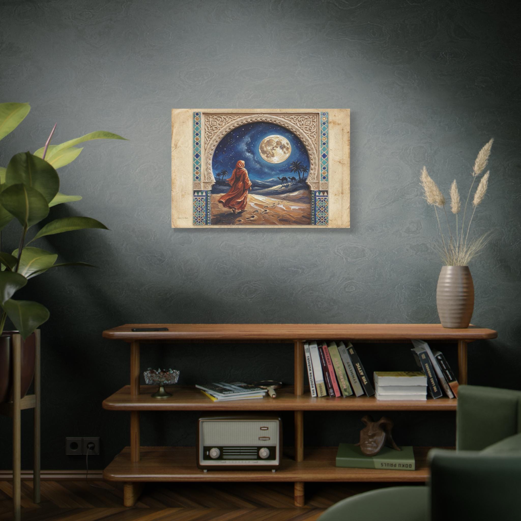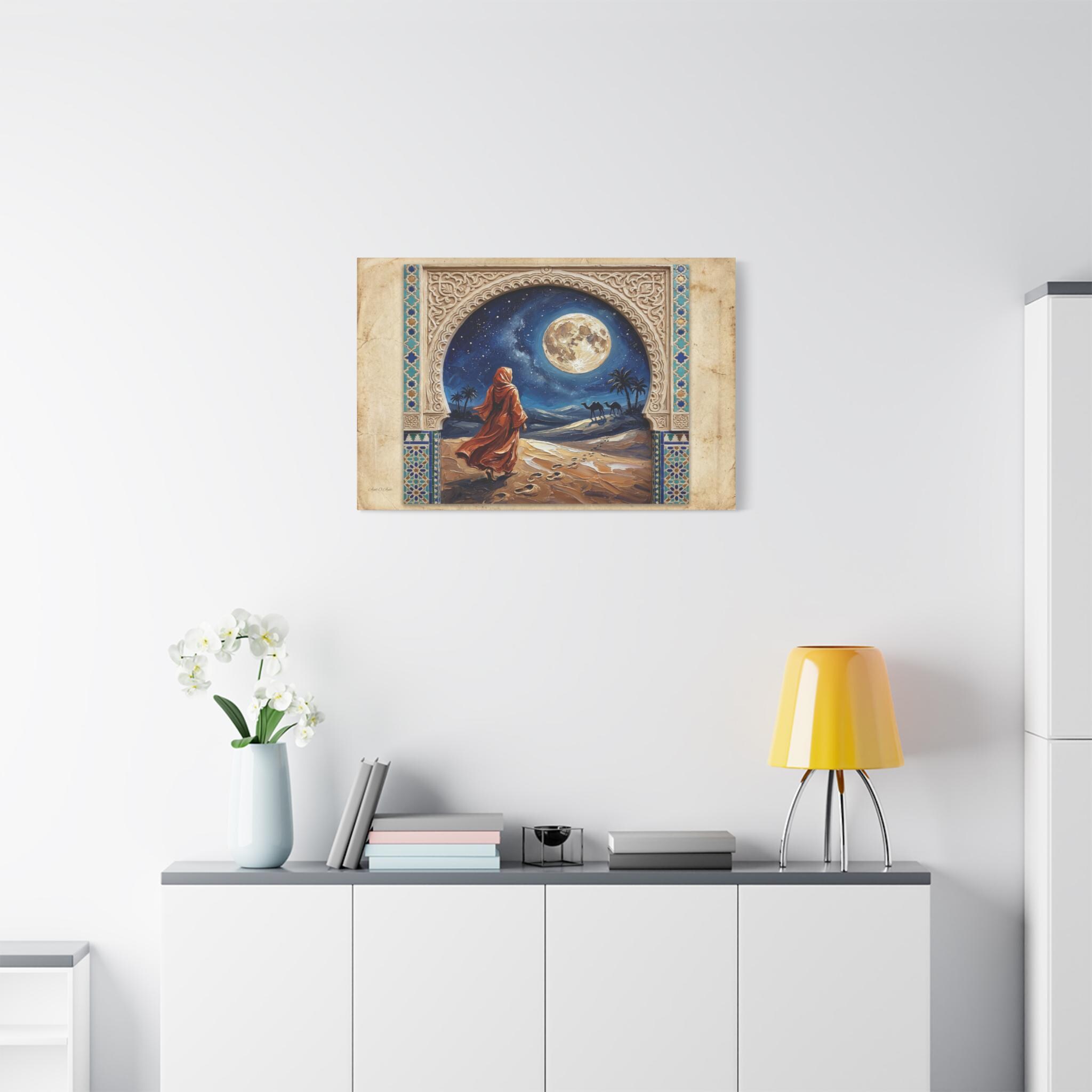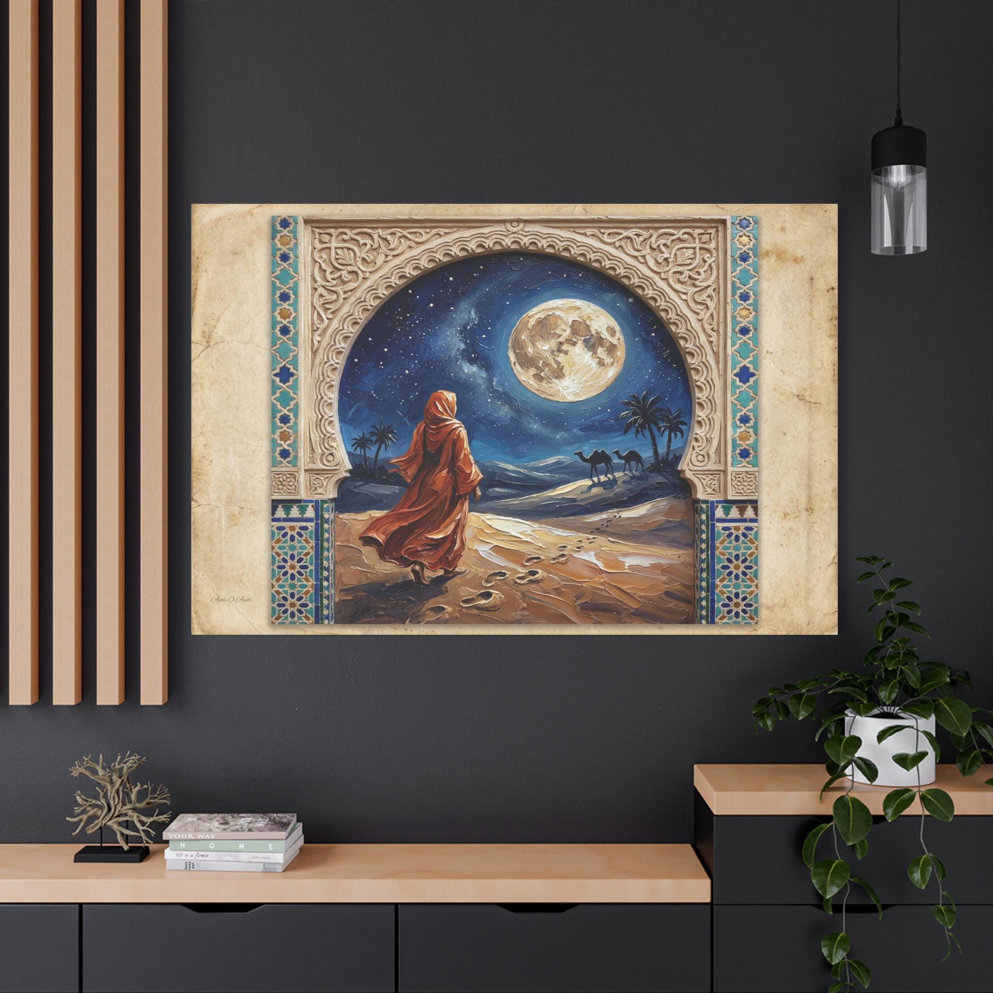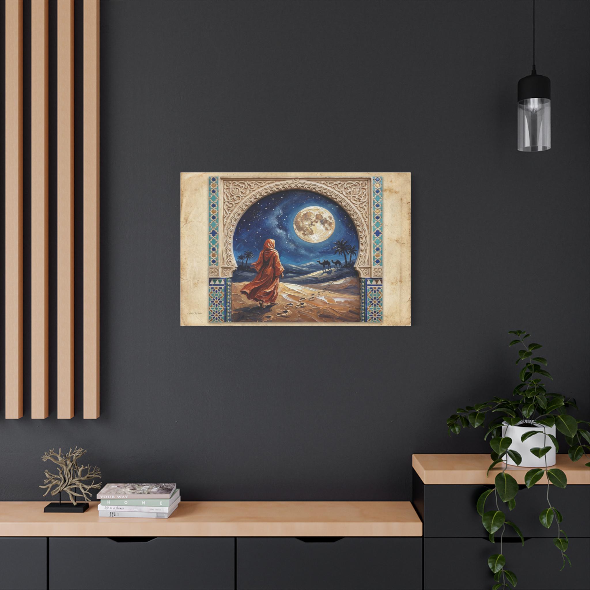 The Art & Technique: The central painting is rendered in an intensely rich Impasto technique, where thick, swirling paint brings the enormous, luminous full moon, the flowing, fiery-orange robes, and the textured desert dunes to life. The high-quality print faithfully reproduces the contrasting textures: the smooth, clean lines of the stylized frame and the dynamic, three-dimensional energy of the central artwork. This creates a mesmerizing effect of looking into a vivid, moonlit dream through an antique window.