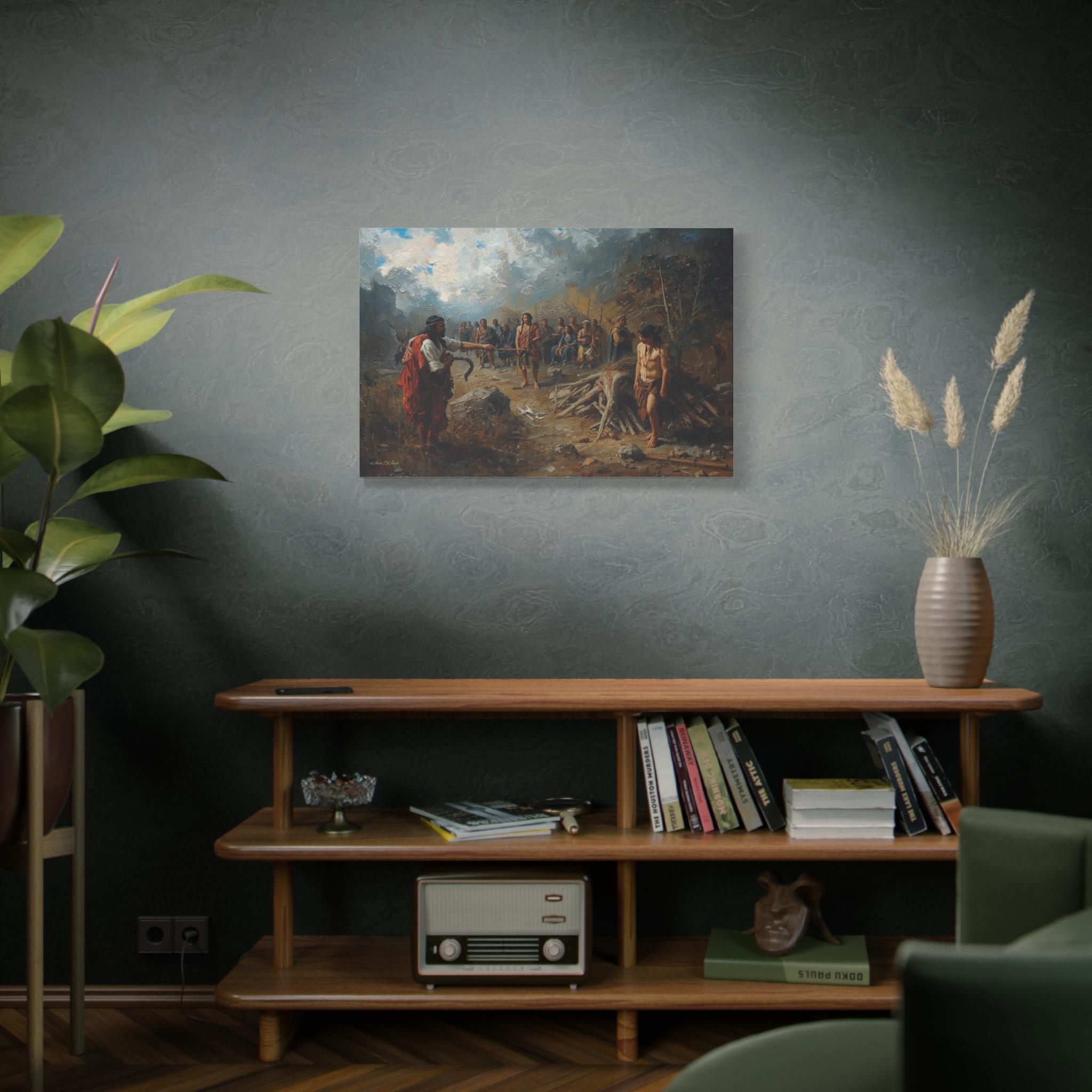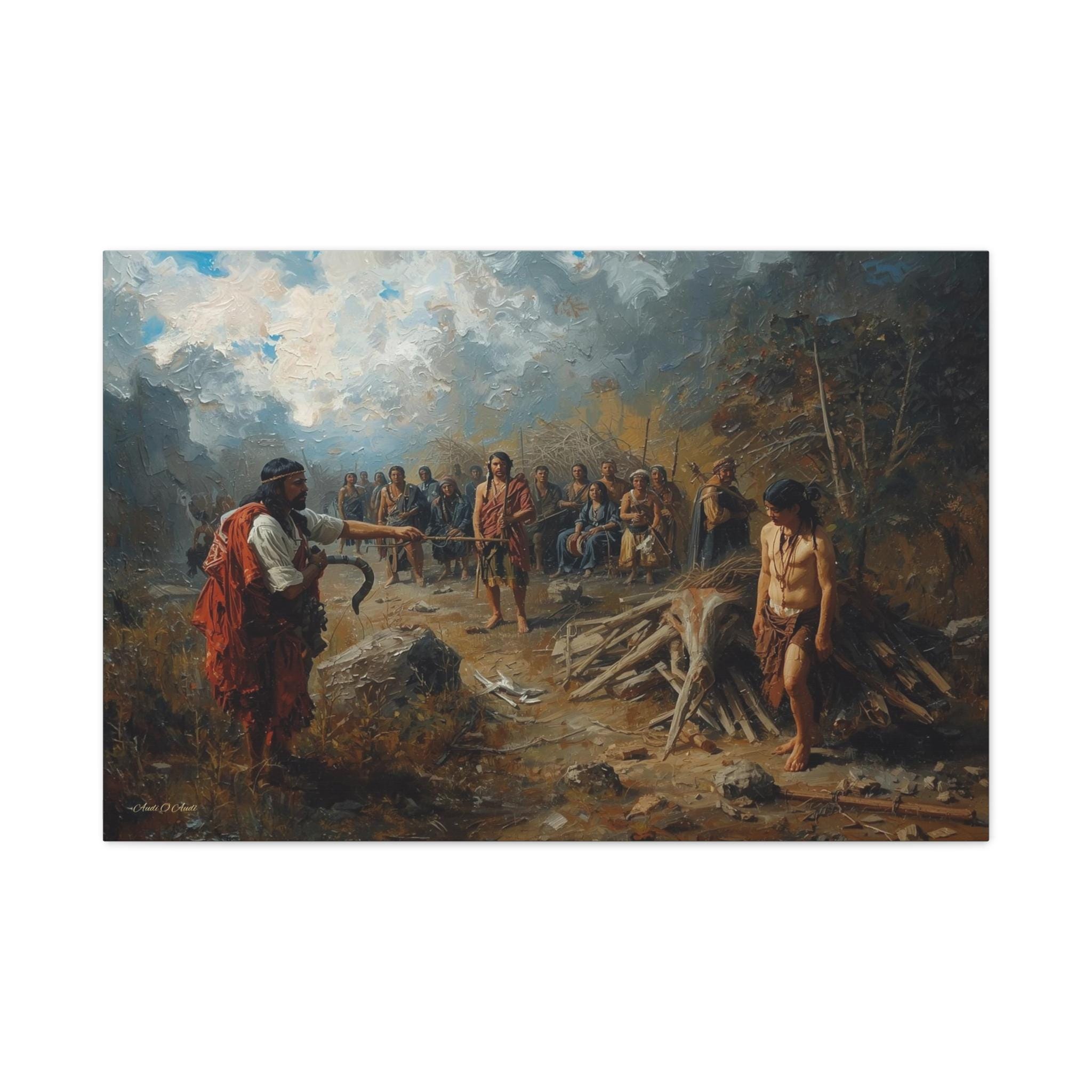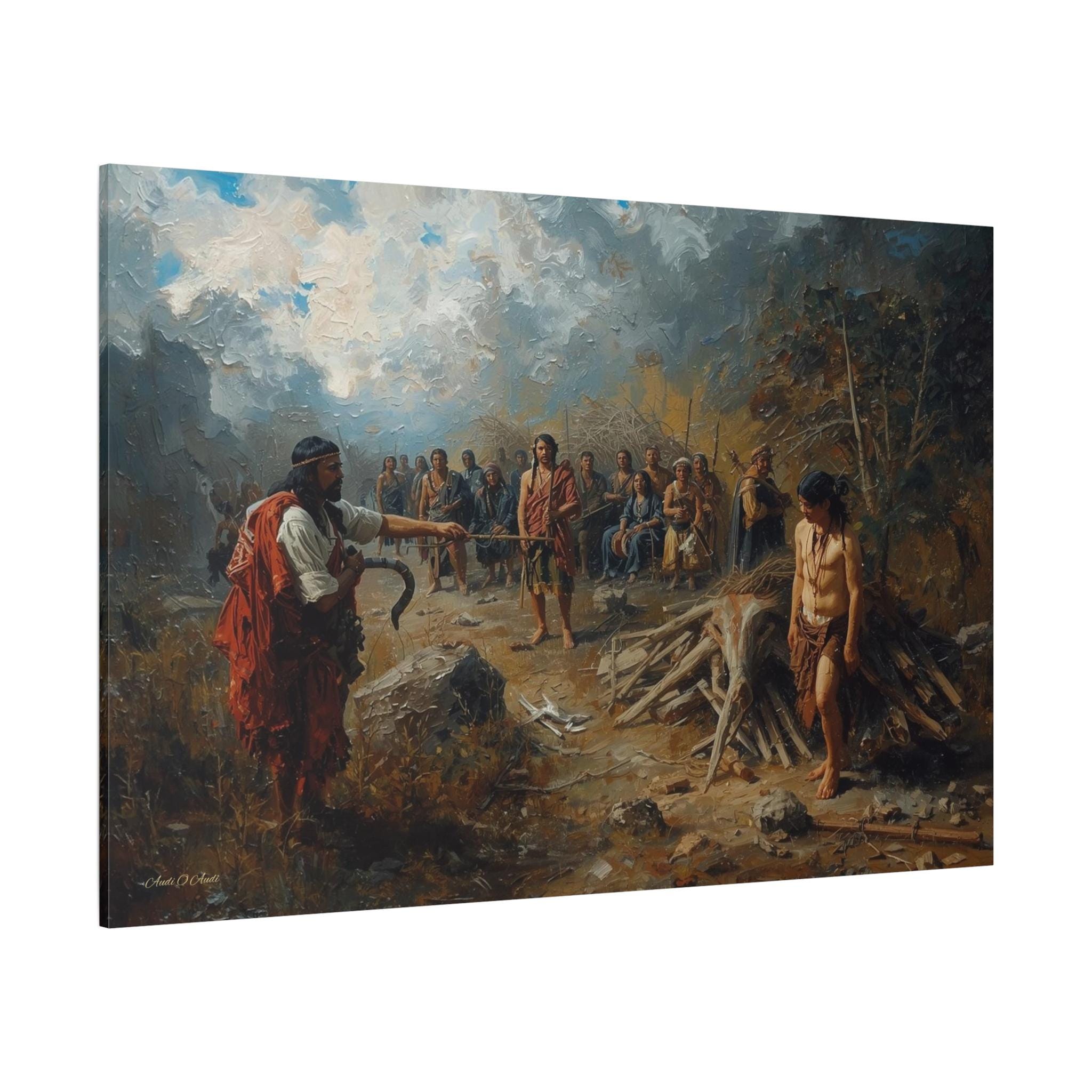 Engage with a profound historical narrative through this powerful canvas print. The Exchange: Price of the Land depicts a stark confrontation during the period of colonization, capturing the devastating human cost of land seizure and resource exploitation. The scene is one of unequal power, where the colonizer stands defiant against the marginalized and grieving indigenous community, symbolized by the somber, watching figures in the background.