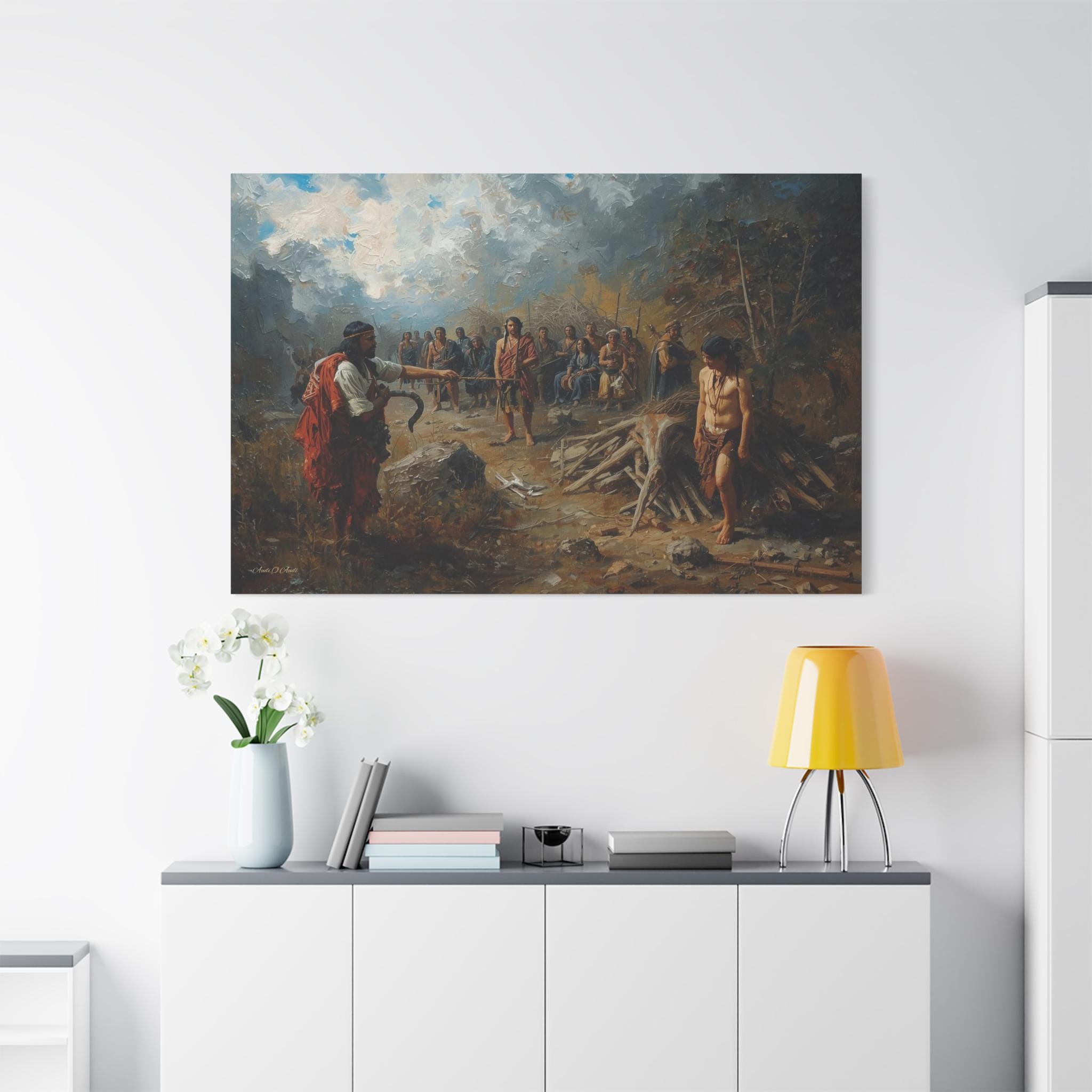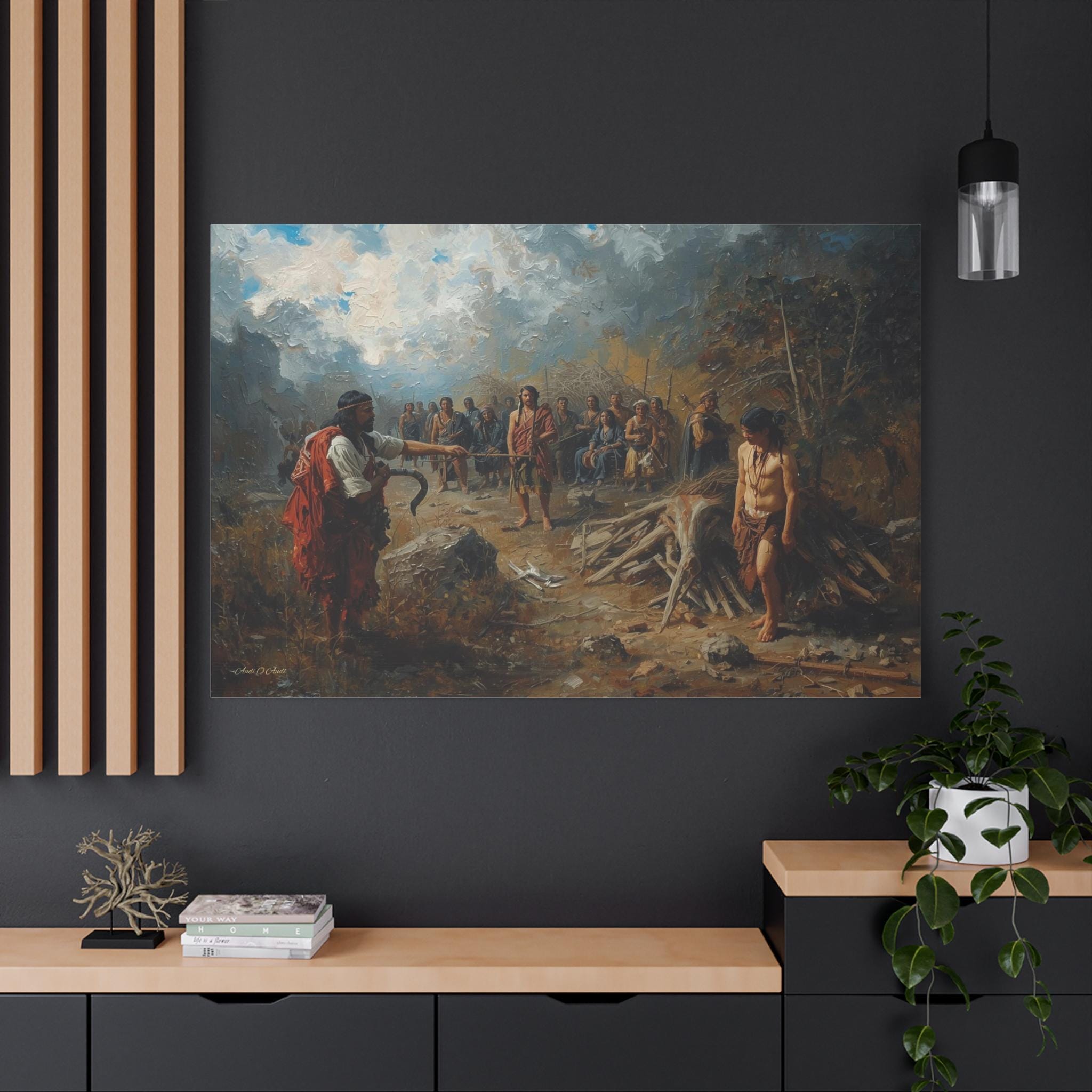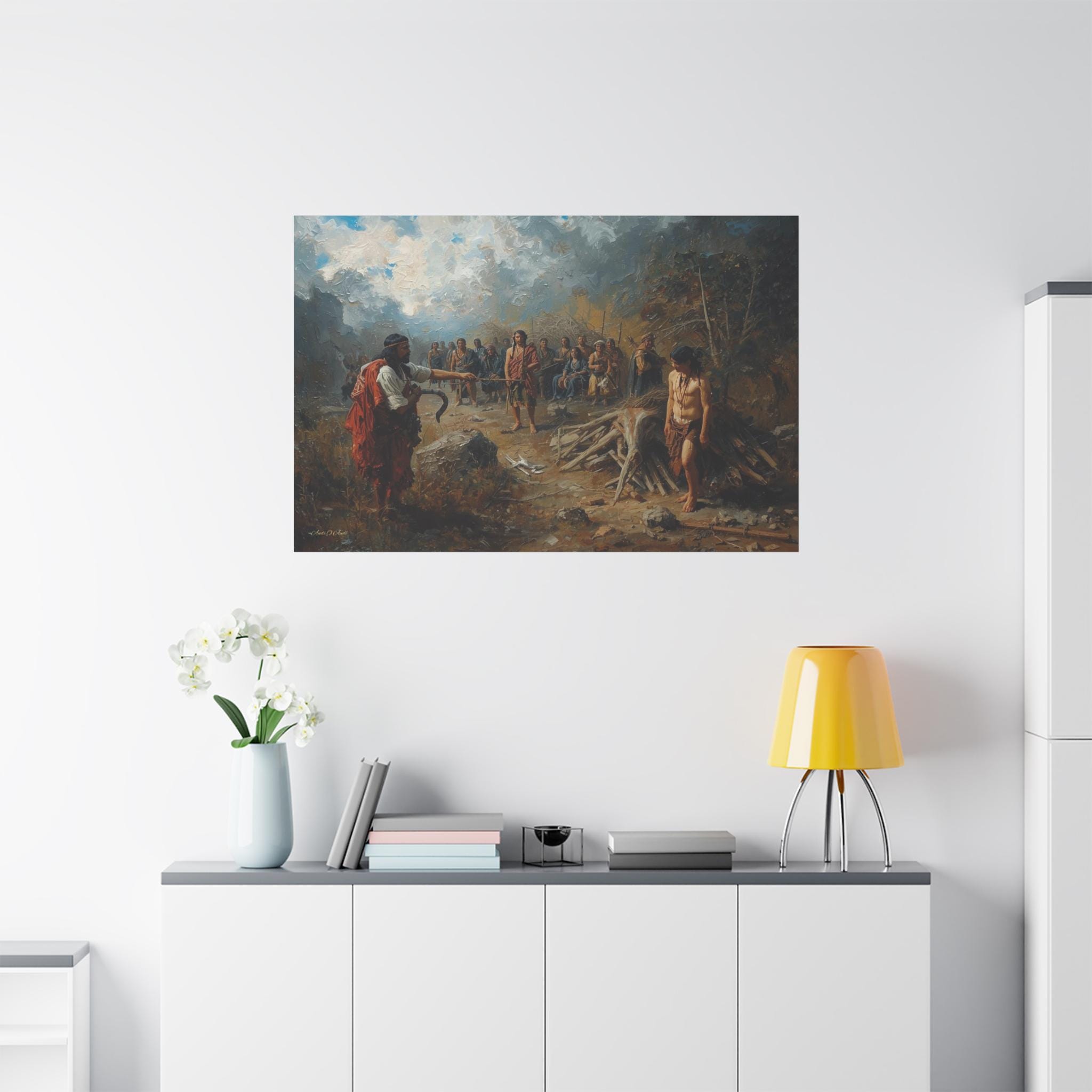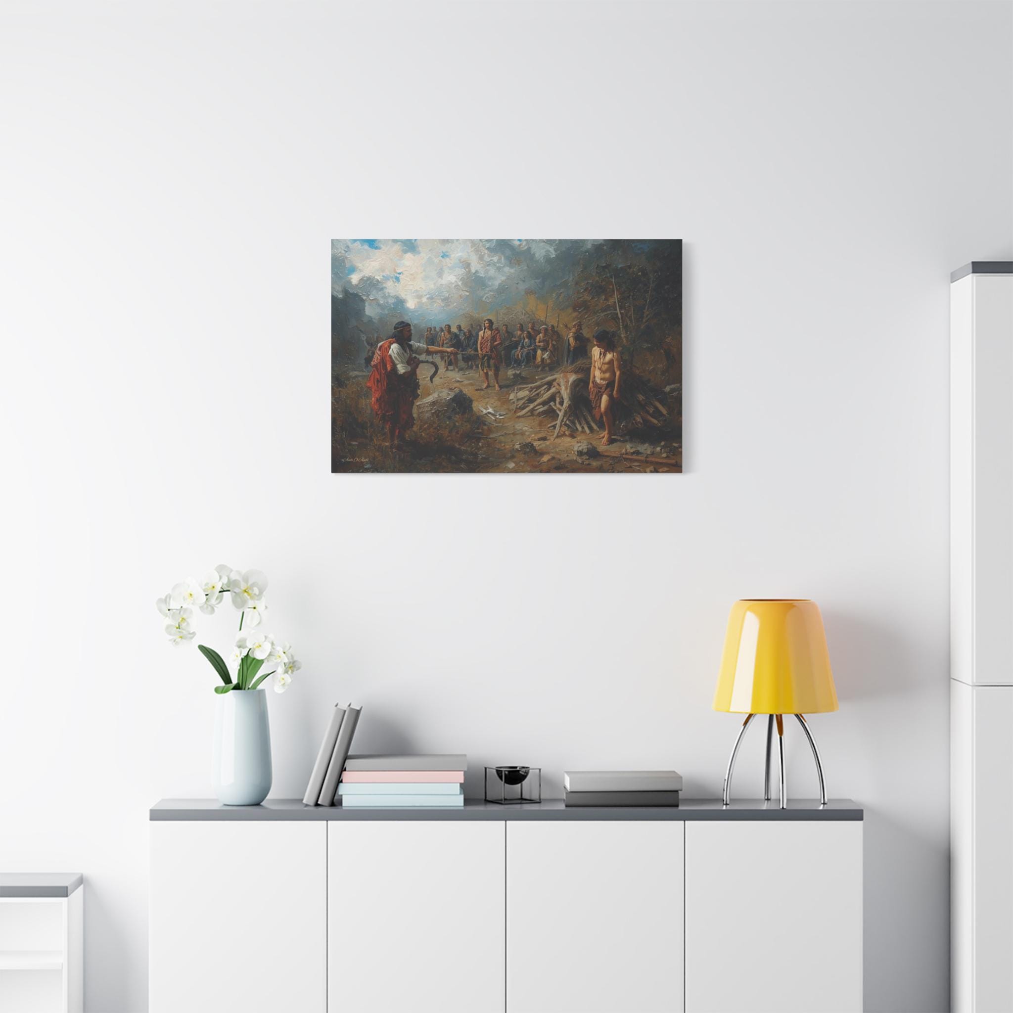 Engage with a profound historical narrative through this powerful canvas print. The Exchange: Price of the Land depicts a stark confrontation during the period of colonization, capturing the devastating human cost of land seizure and resource exploitation. The scene is one of unequal power, where the colonizer stands defiant against the marginalized and grieving indigenous community, symbolized by the somber, watching figures in the background.