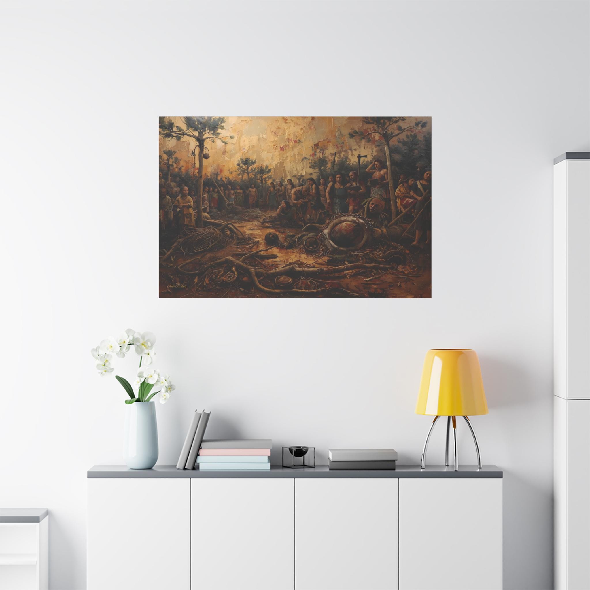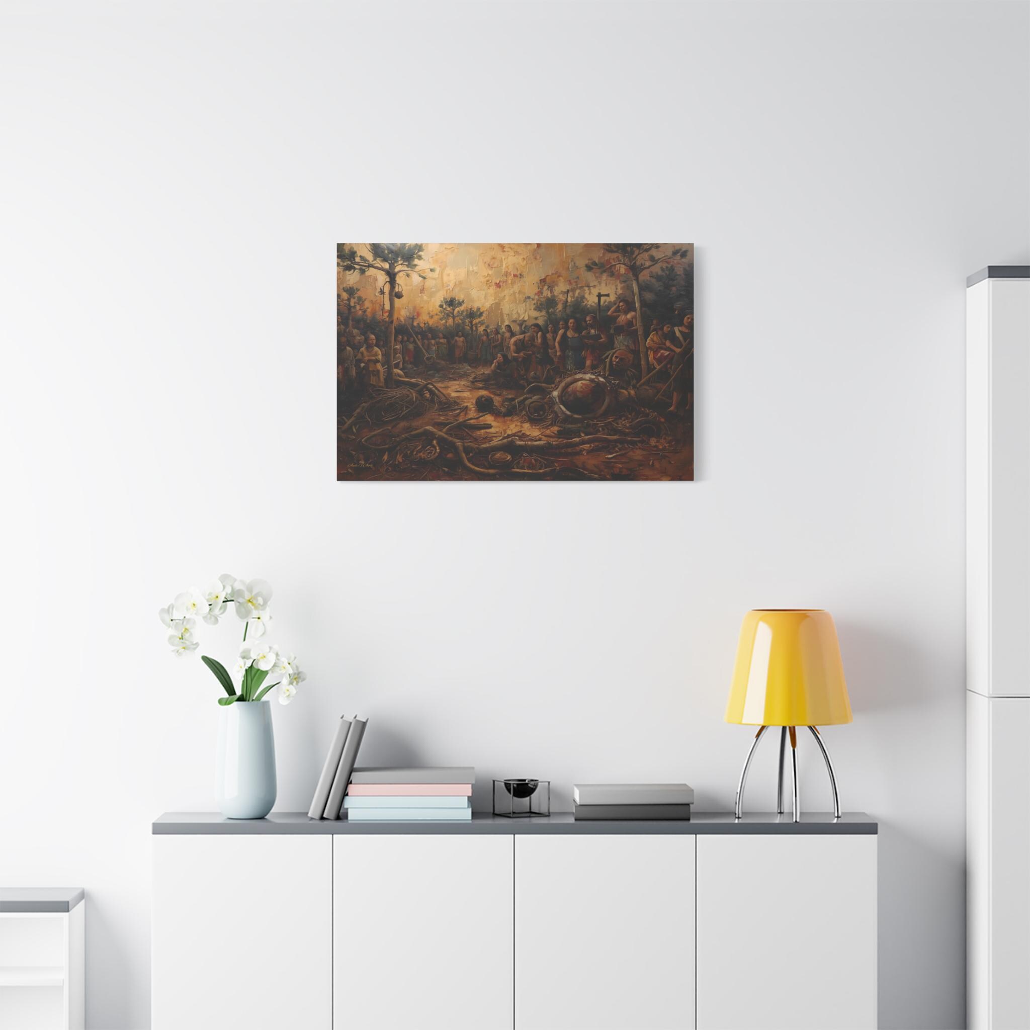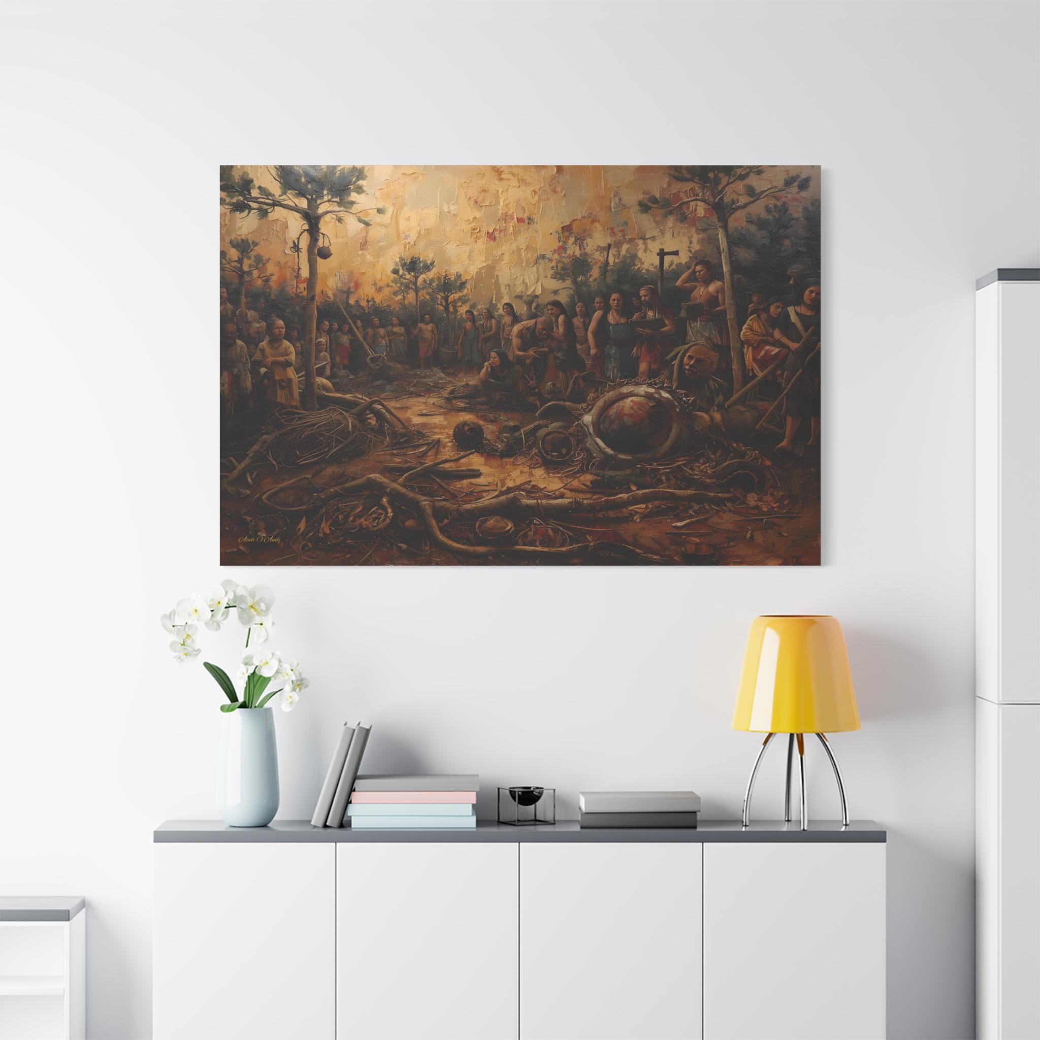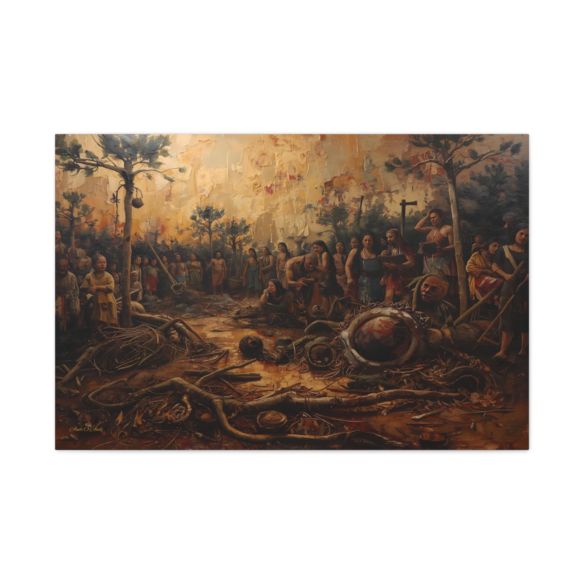 The Ash and the Remnants is a museum-quality canvas print that offers an unflinching look into the heartbreaking aftermath of conflict, colonization, and the destruction of a people's heritage. The painting captures a scene of deep sorrow where a community stands amidst the devastation of their land and the ruin of their artifacts.