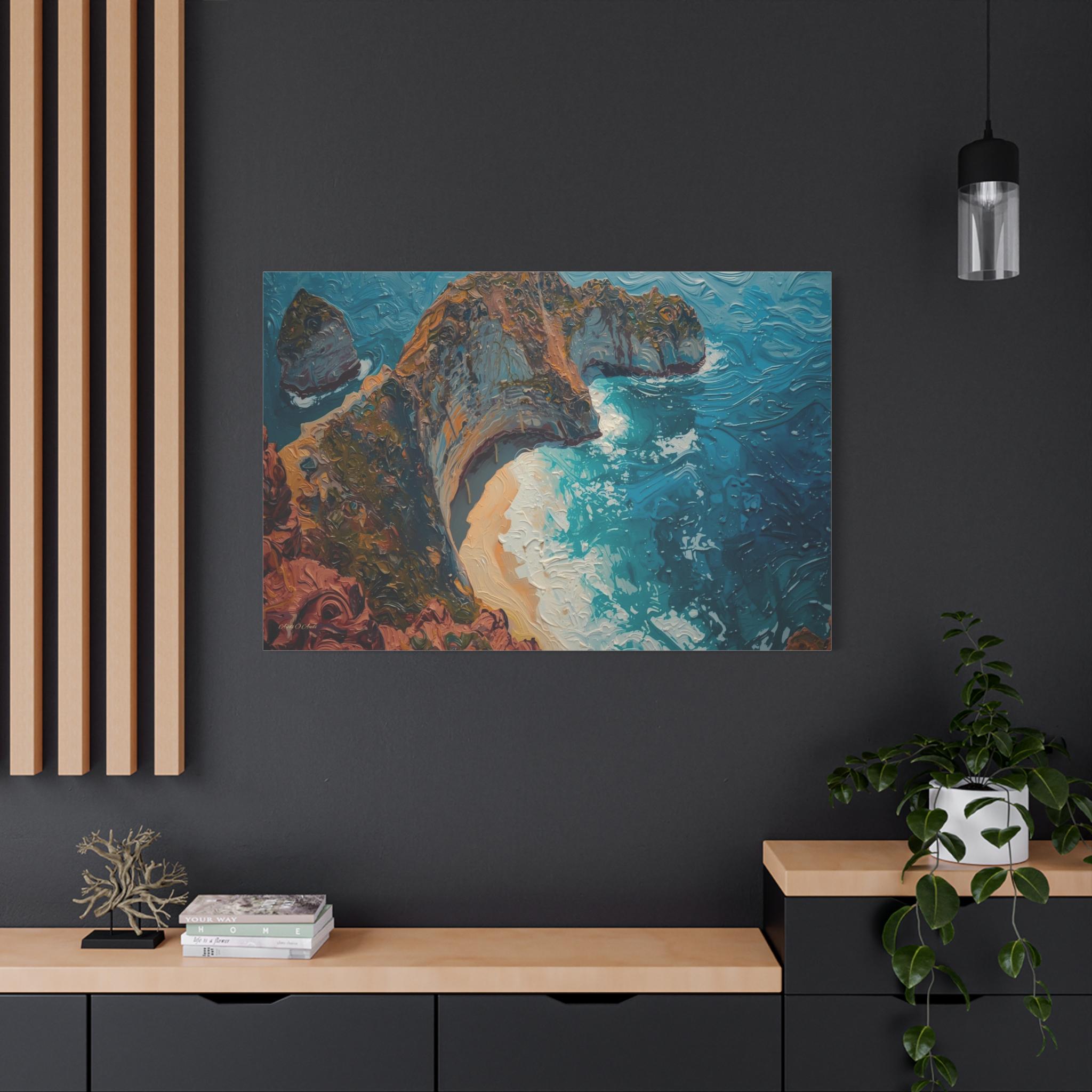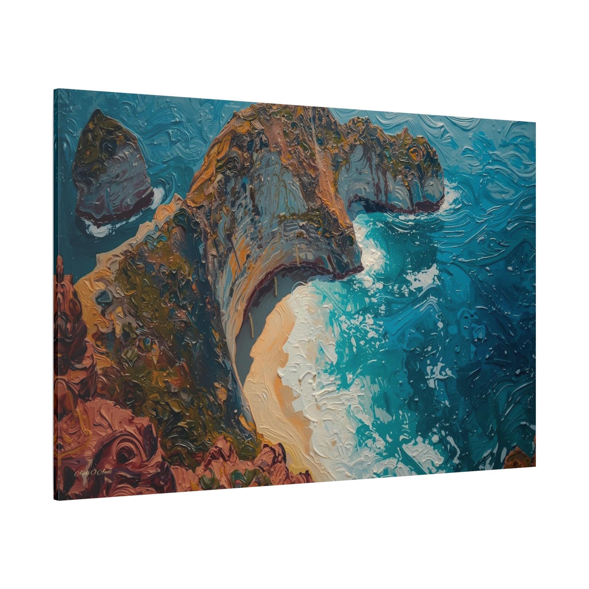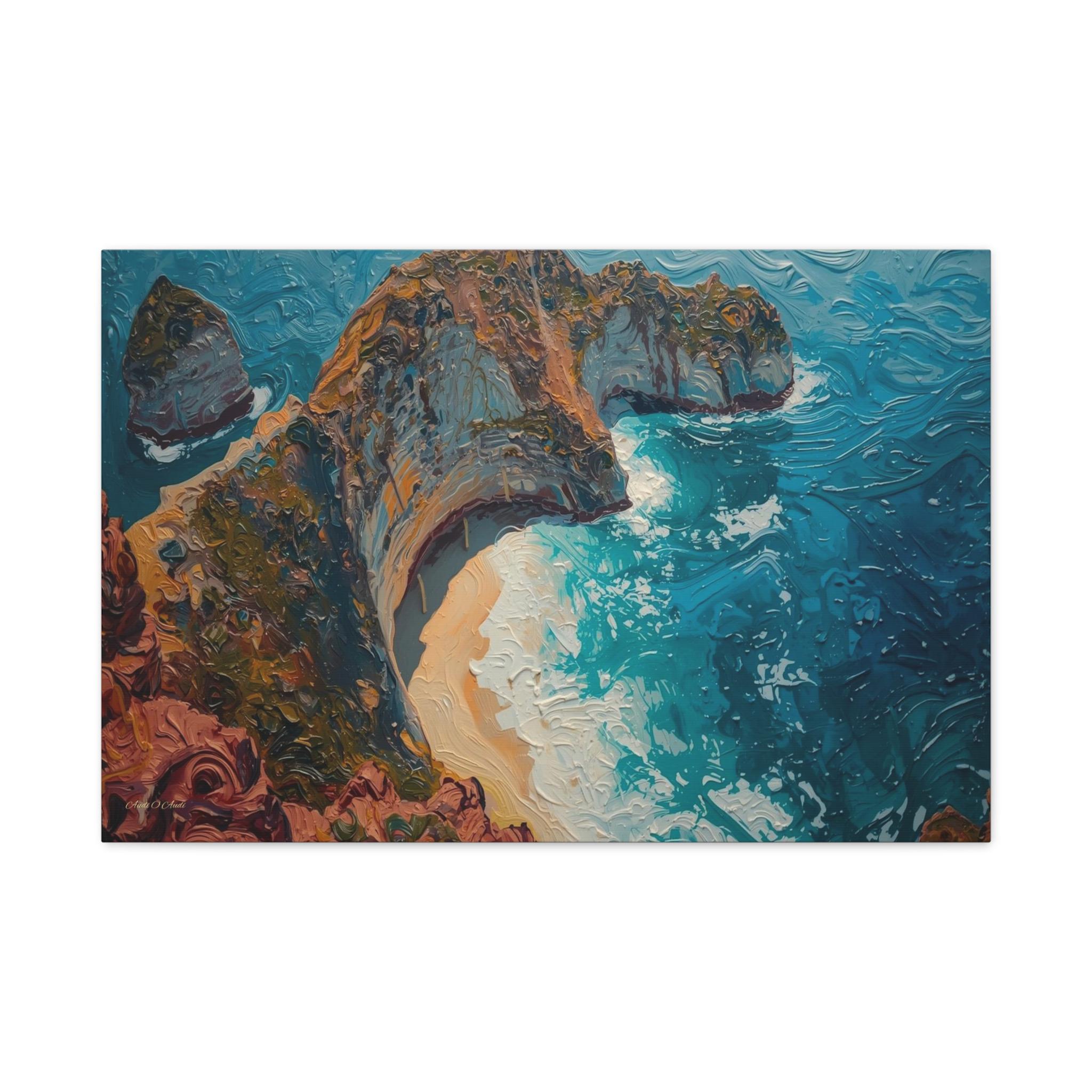 The Art & Technique: Rendered in a stunning, pure Impasto technique, this high-quality print is a feast for the eyes, reproducing the dramatic, three-dimensional surface of the original oil painting. Notice how the paint itself sculpts the scene: the thick, crusty layers define the ancient, mineral-rich cliff face, while the long, powerful, swirling strokes of bright blue capture the chaotic, frothing energy of the breaking waves and the pristine curve of the beach.