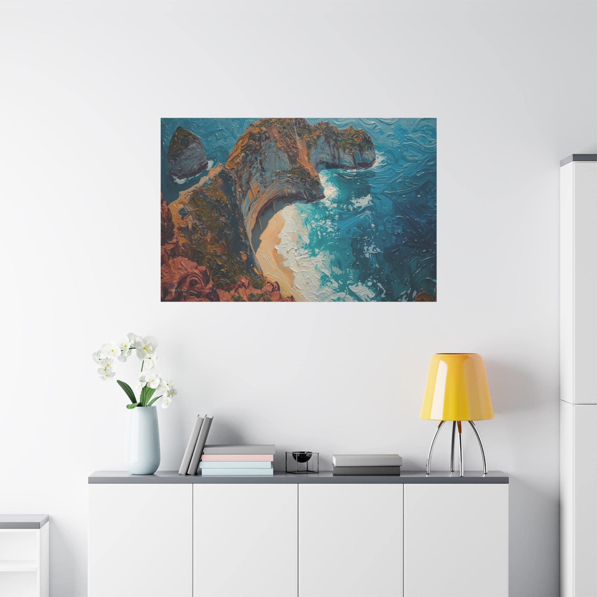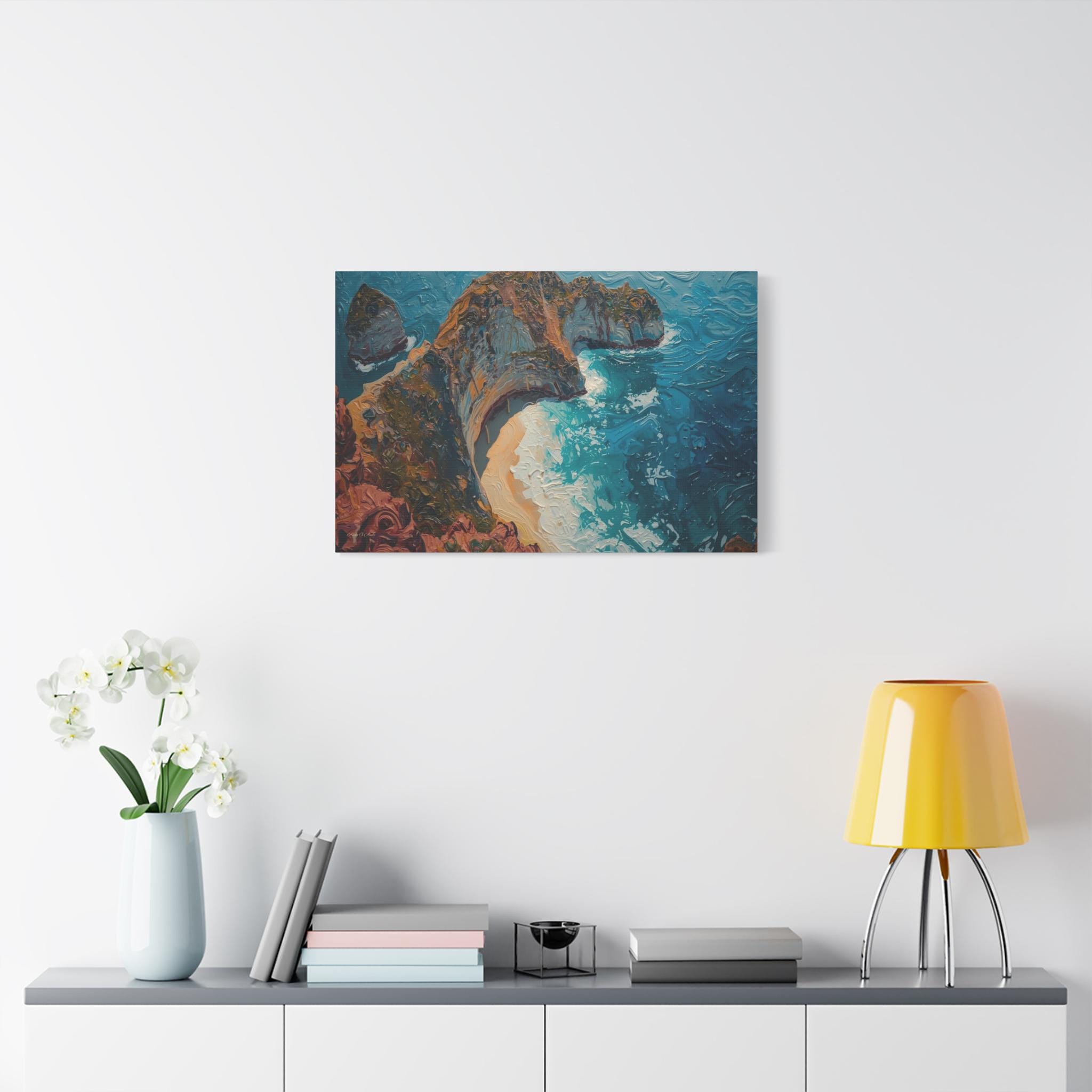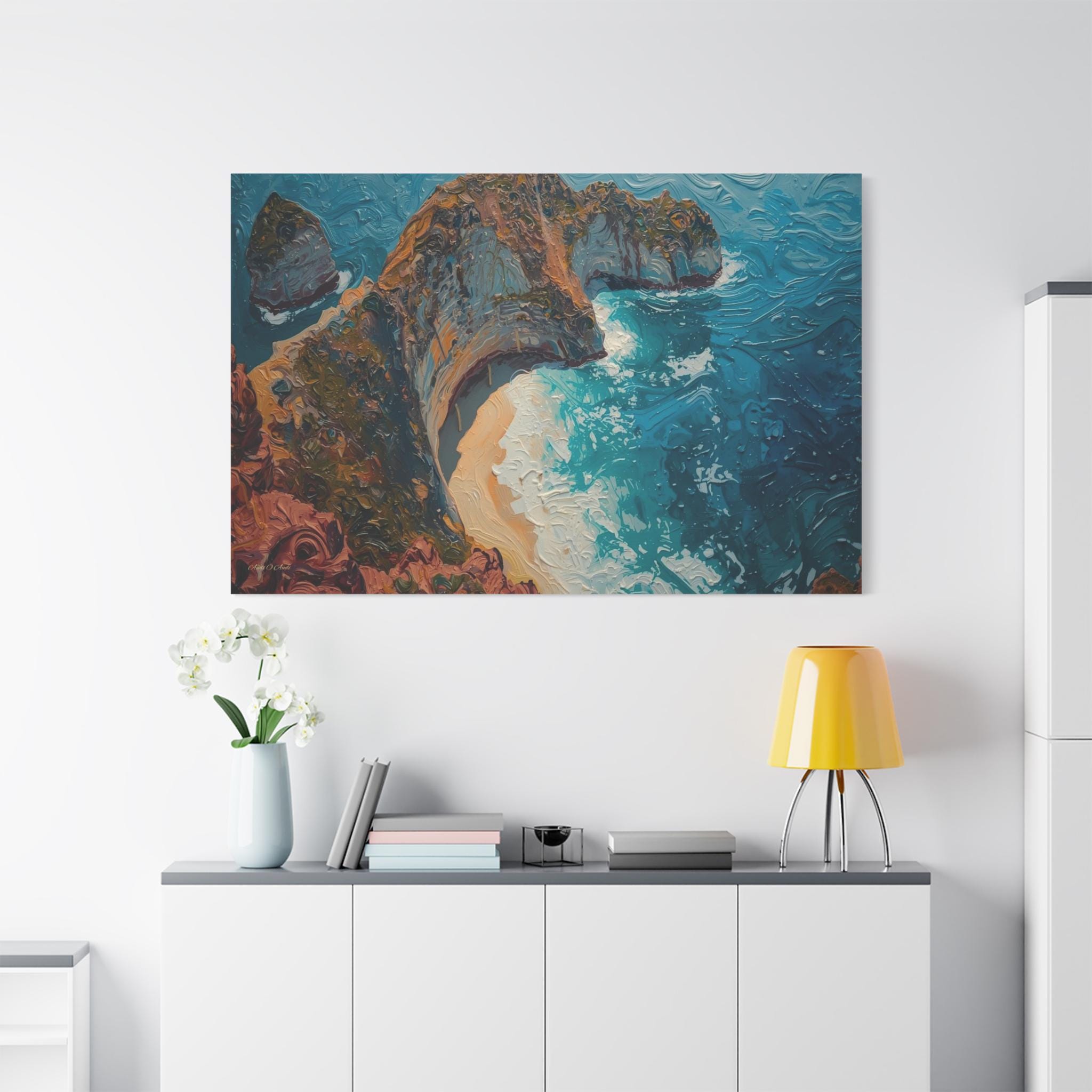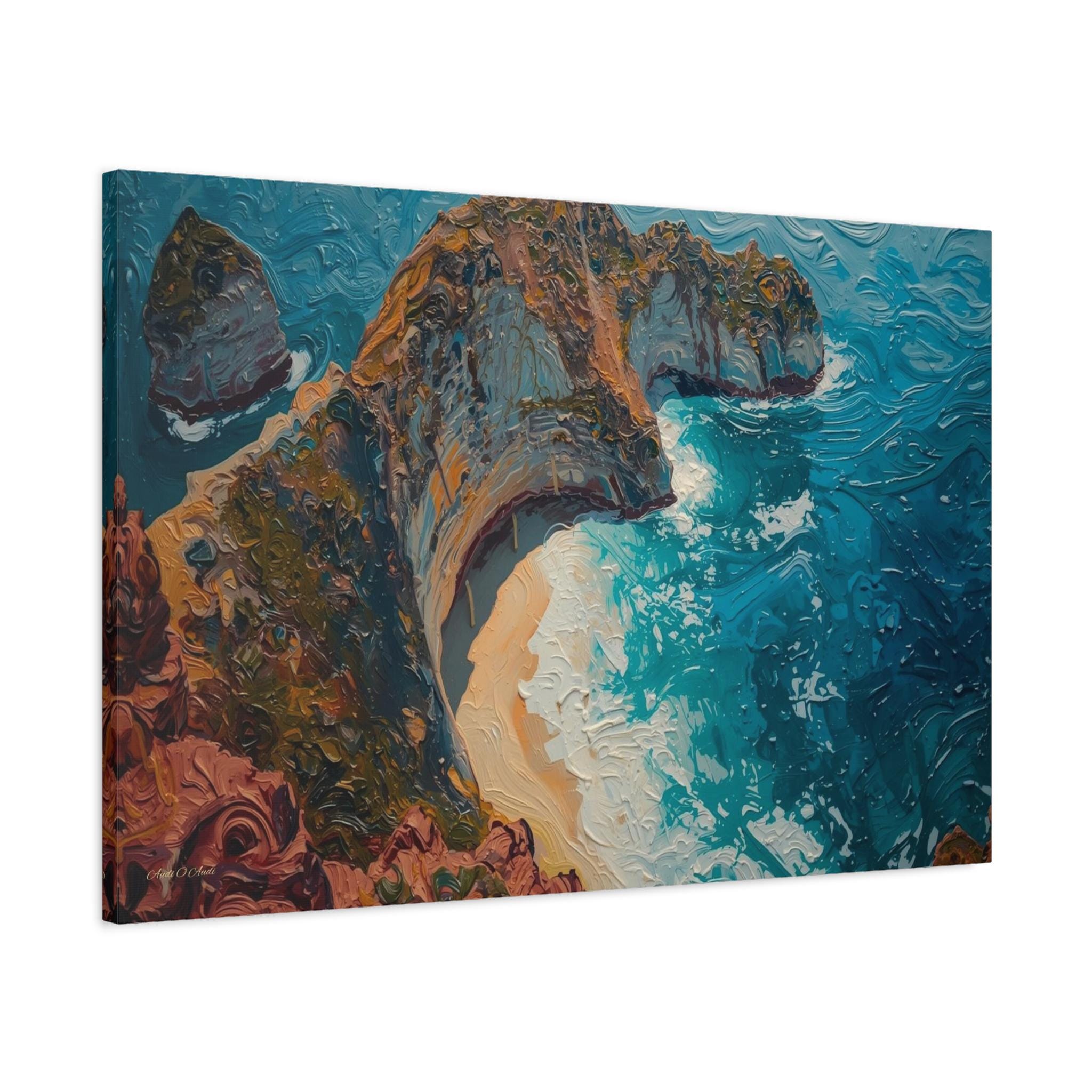 The Art & Technique: Rendered in a stunning, pure Impasto technique, this high-quality print is a feast for the eyes, reproducing the dramatic, three-dimensional surface of the original oil painting. Notice how the paint itself sculpts the scene: the thick, crusty layers define the ancient, mineral-rich cliff face, while the long, powerful, swirling strokes of bright blue capture the chaotic, frothing energy of the breaking waves and the pristine curve of the beach.