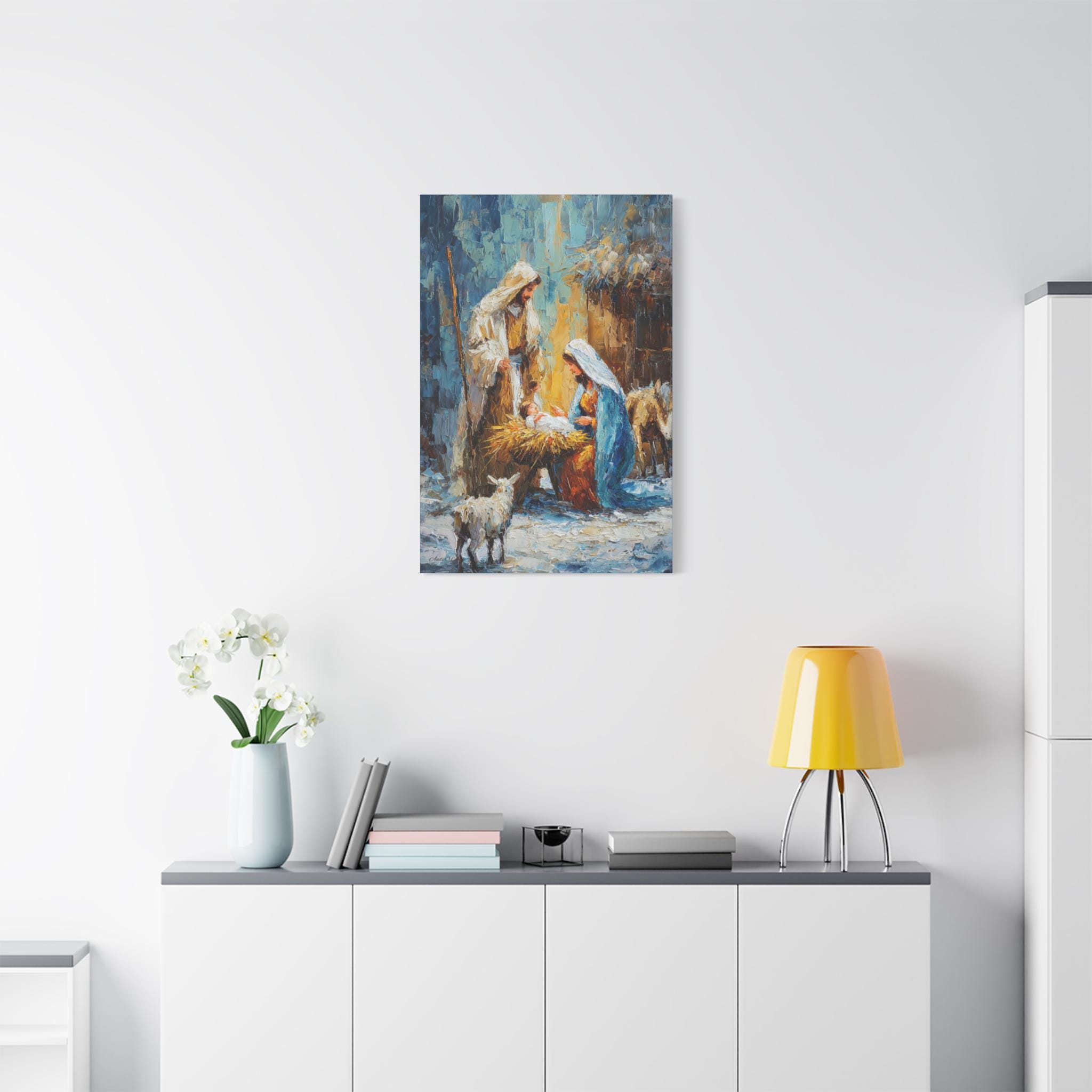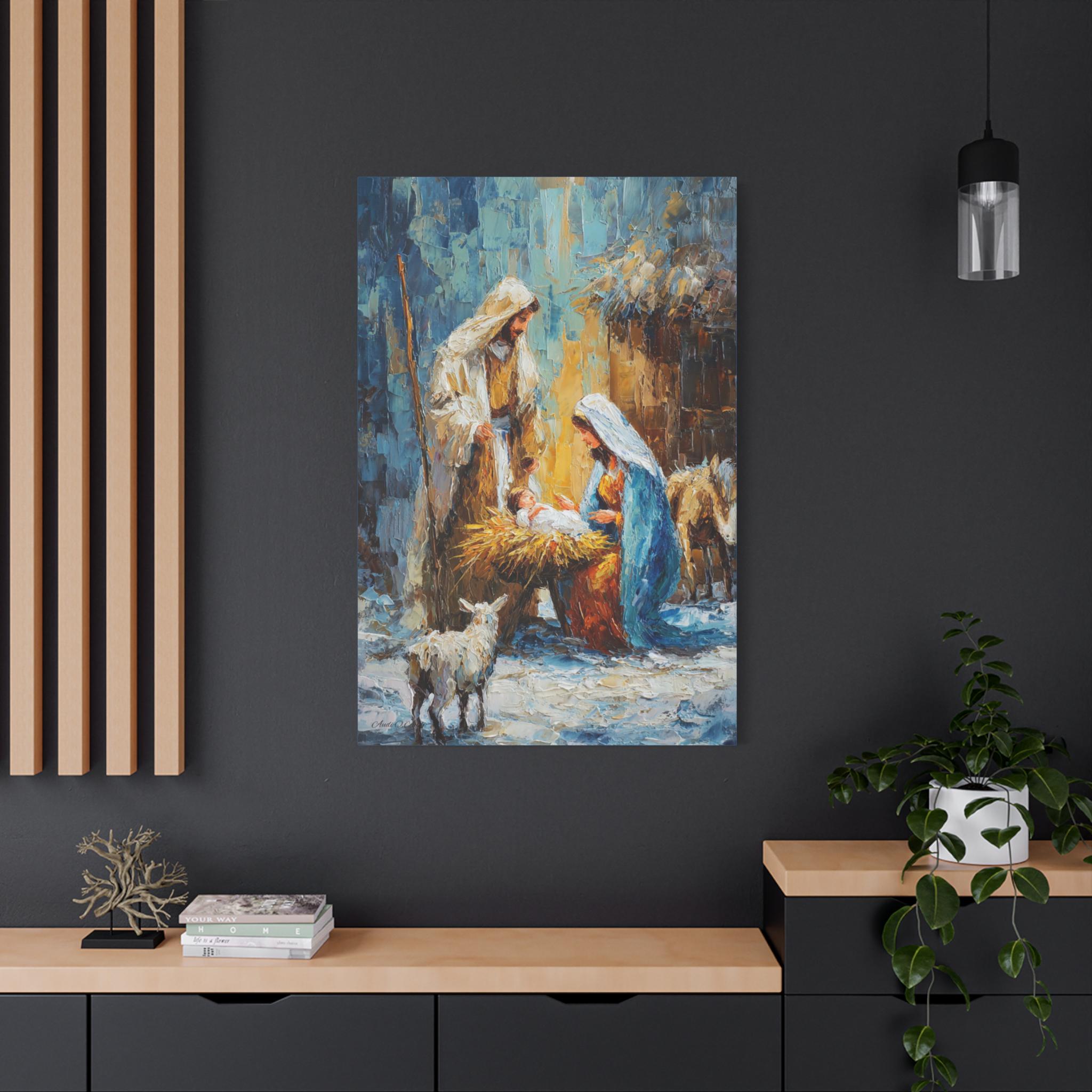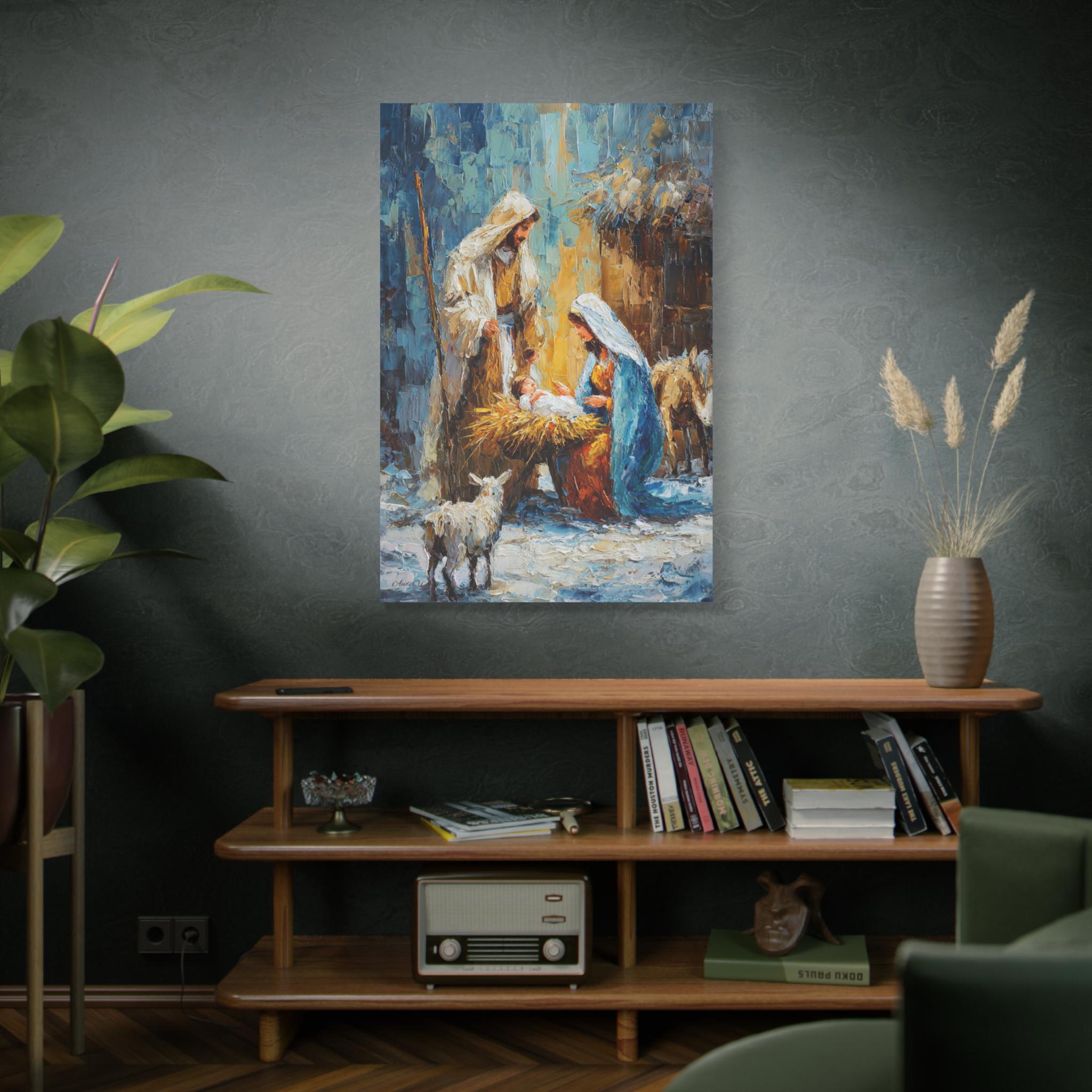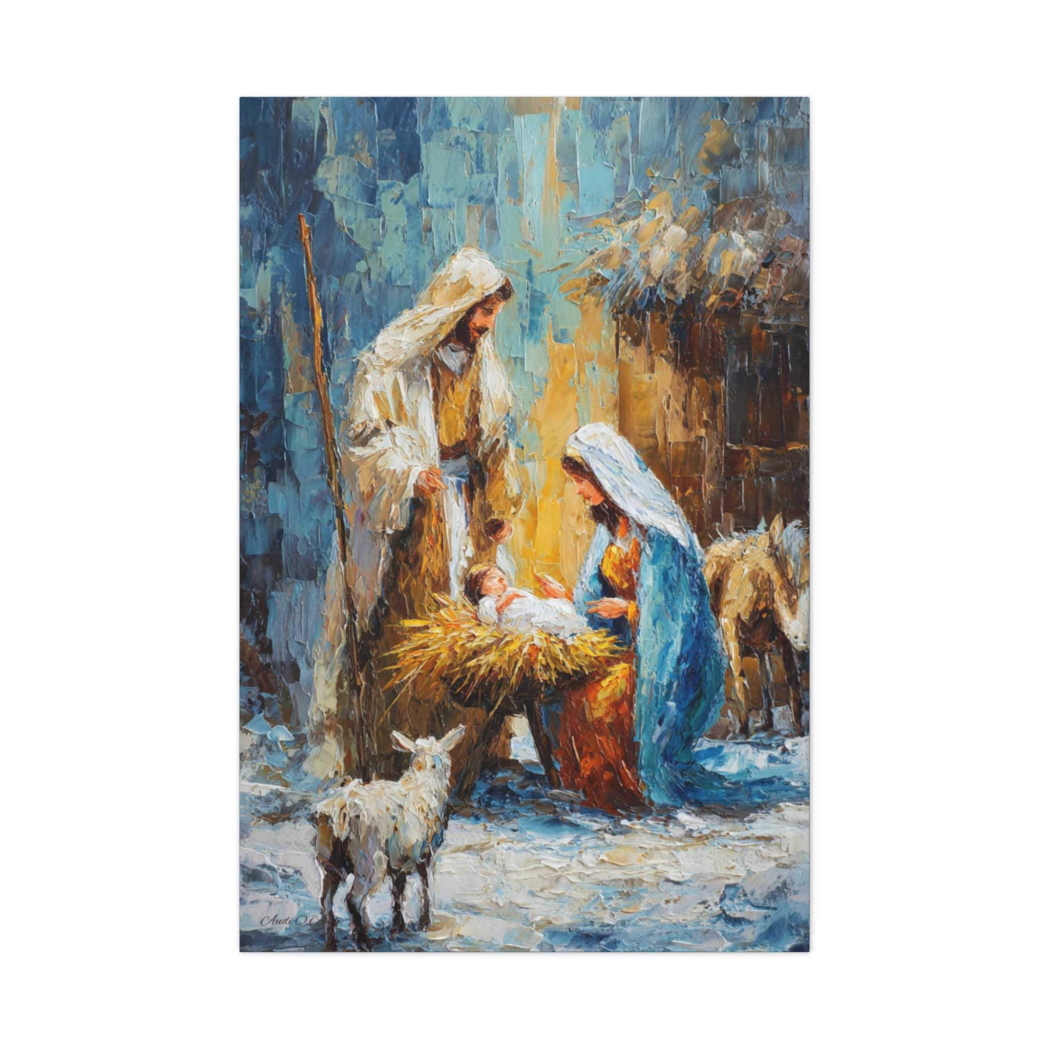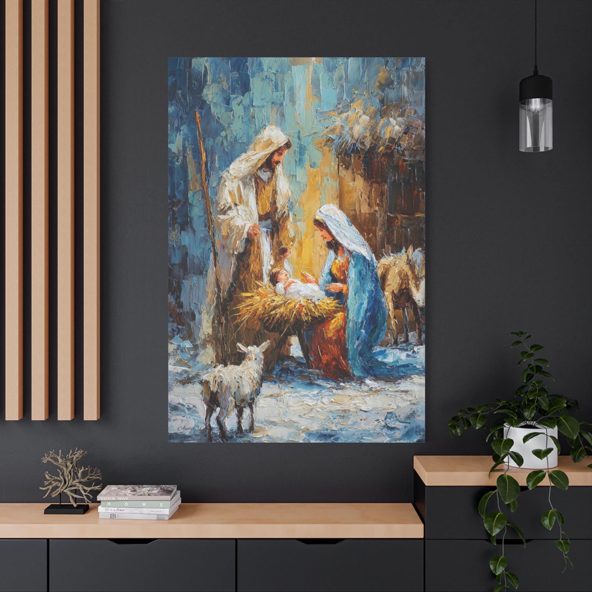 Capture the solemn, warm reverence of the Christmas season with this breathtaking heavy impasto canvas print, "A Silent Night's Embrace." This beautiful artwork depicts the Nativity in a dramatic, richly textured style, emphasizing the light and the depth of the sacred moment.