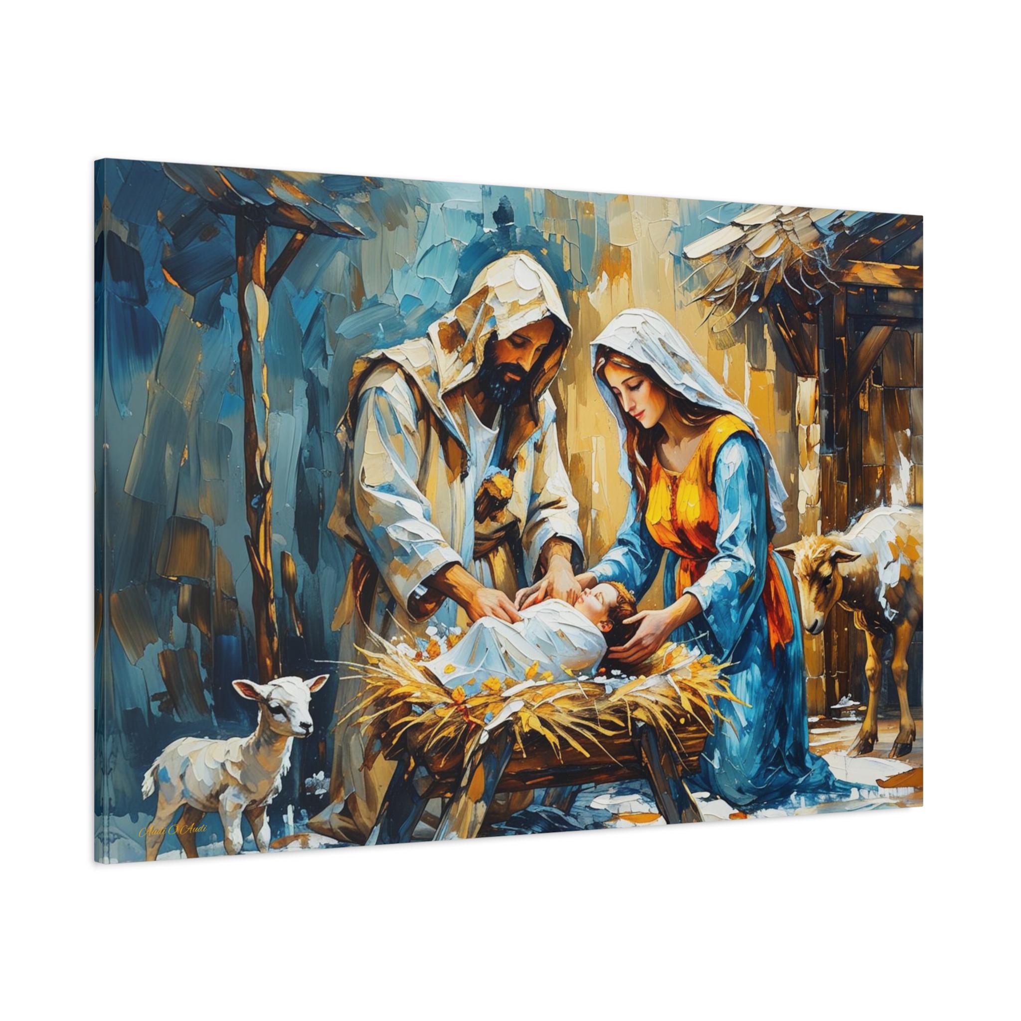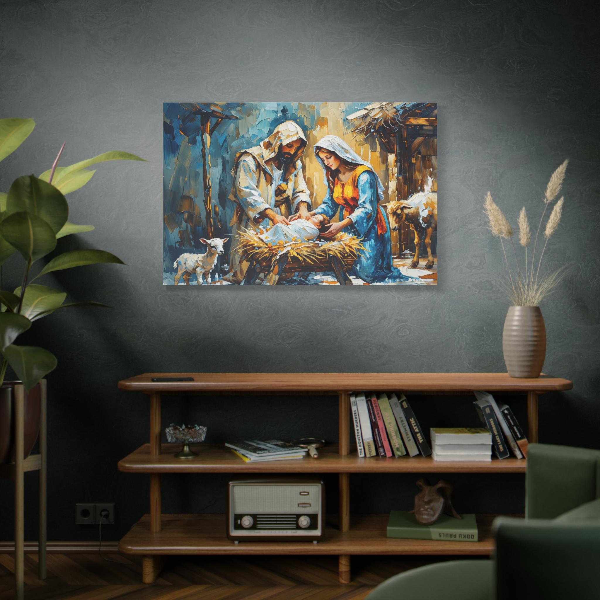 Invite the warmth and joy of the holiday season into your home with this stunning expressive canvas print, "A Humble Shelter's Warmth." This artwork beautifully captures the tender, intimate moment of Mary and Joseph leaning over the manger in a vibrant, painterly style.
