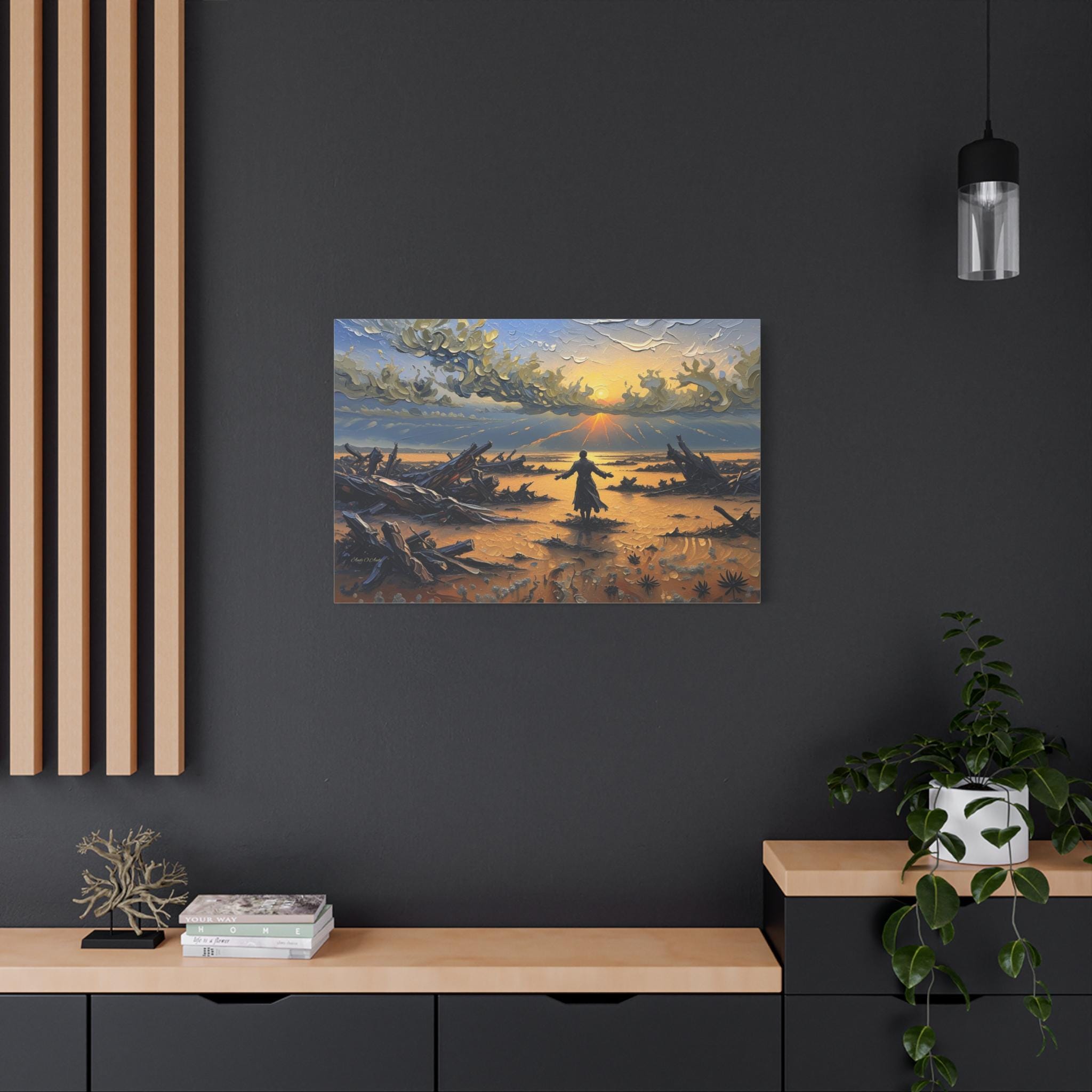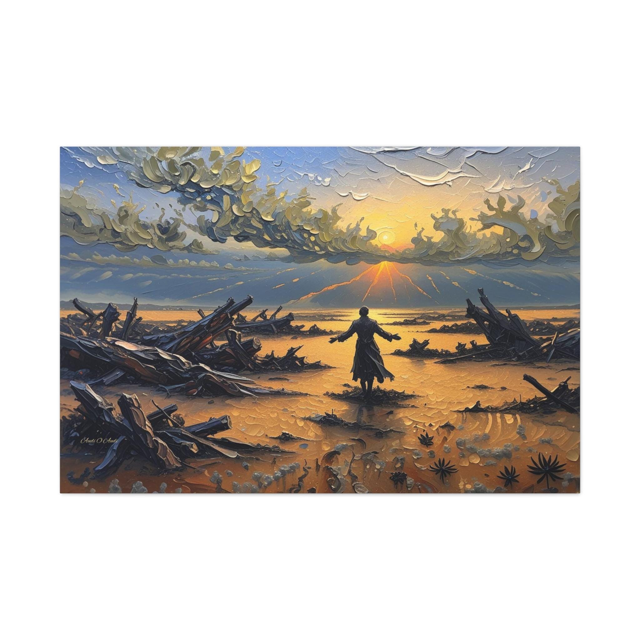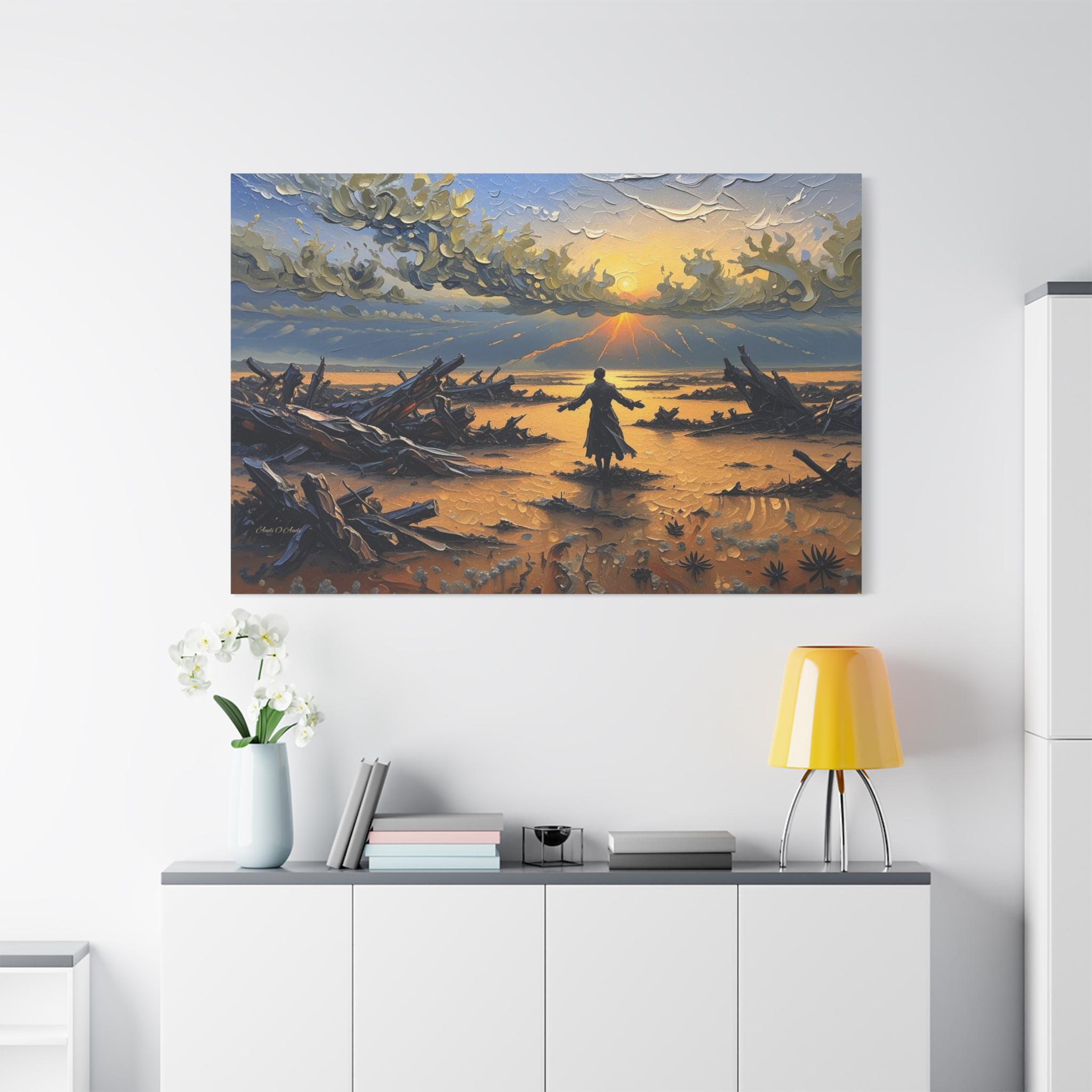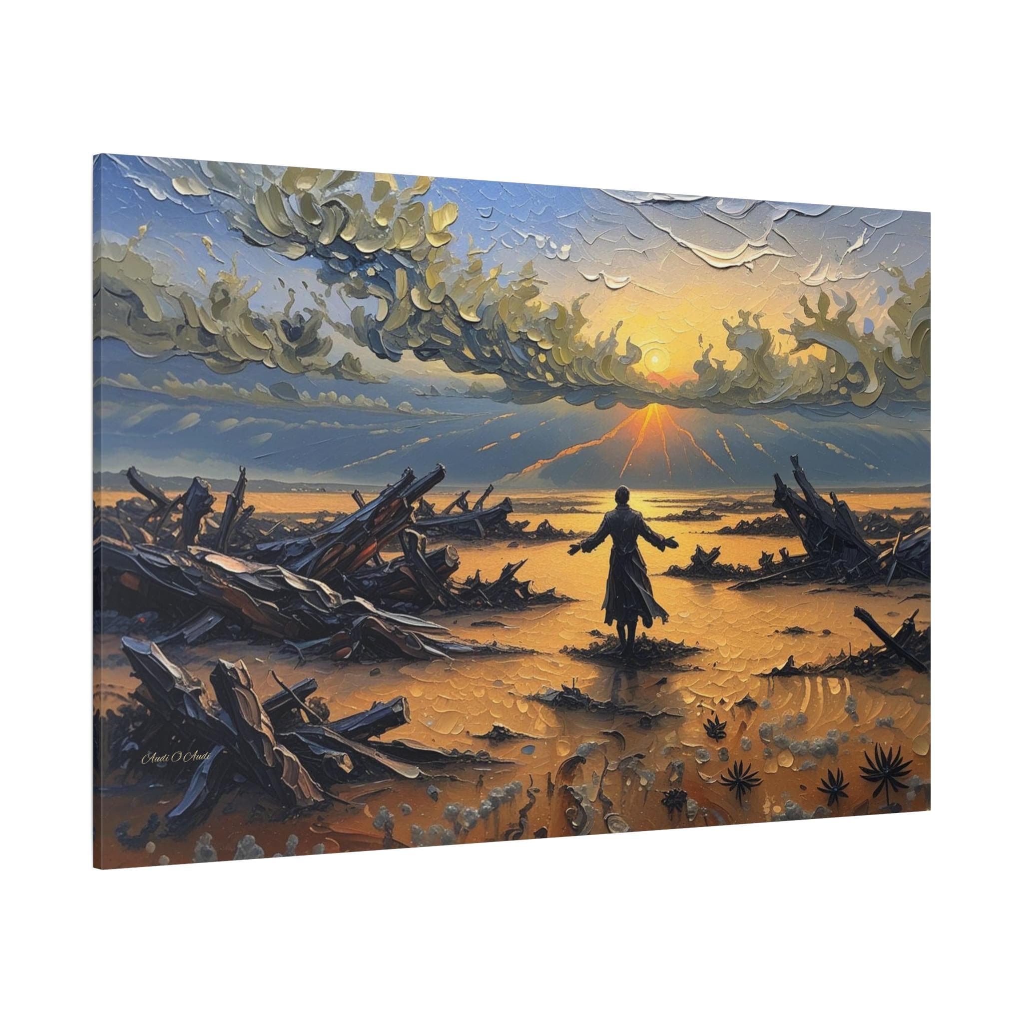 Make a profound, powerful statement with this dramatic canvas print, "Dawn of Reckoning." This artwork captures a solitary figure standing amid a desolate landscape, facing a brilliant, overwhelming sunrise. It is a piece that speaks to themes of resilience, finality, and new beginnings after destruction.