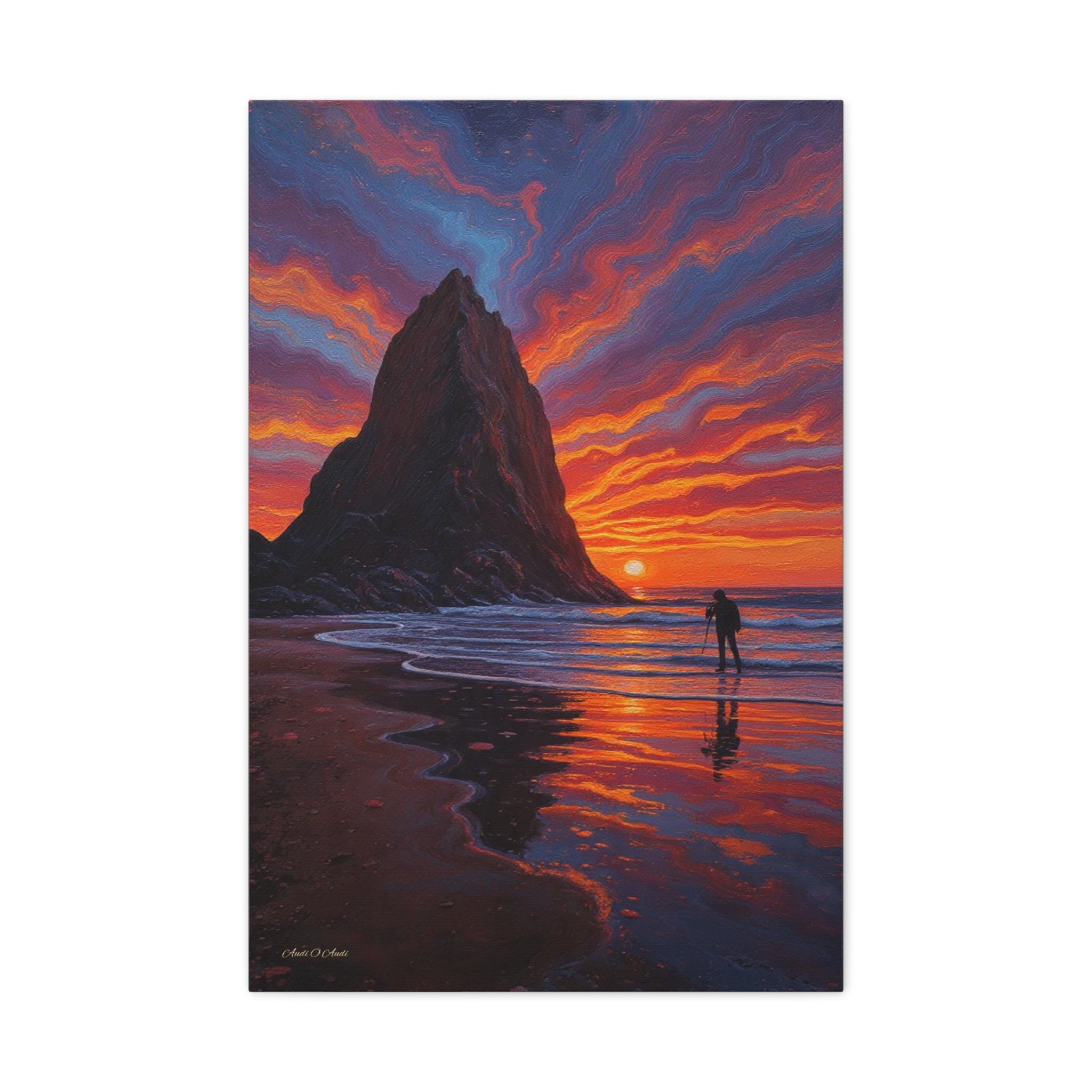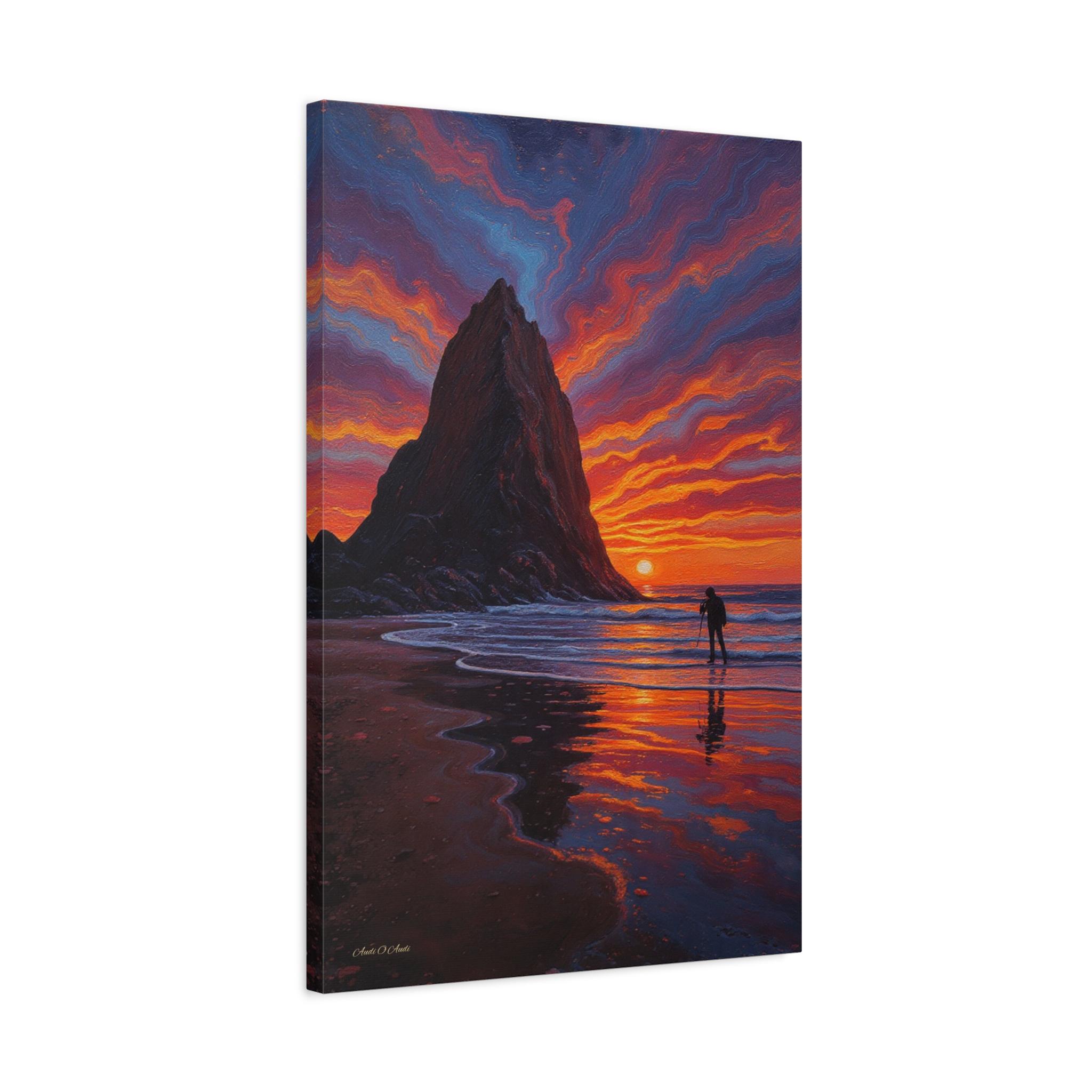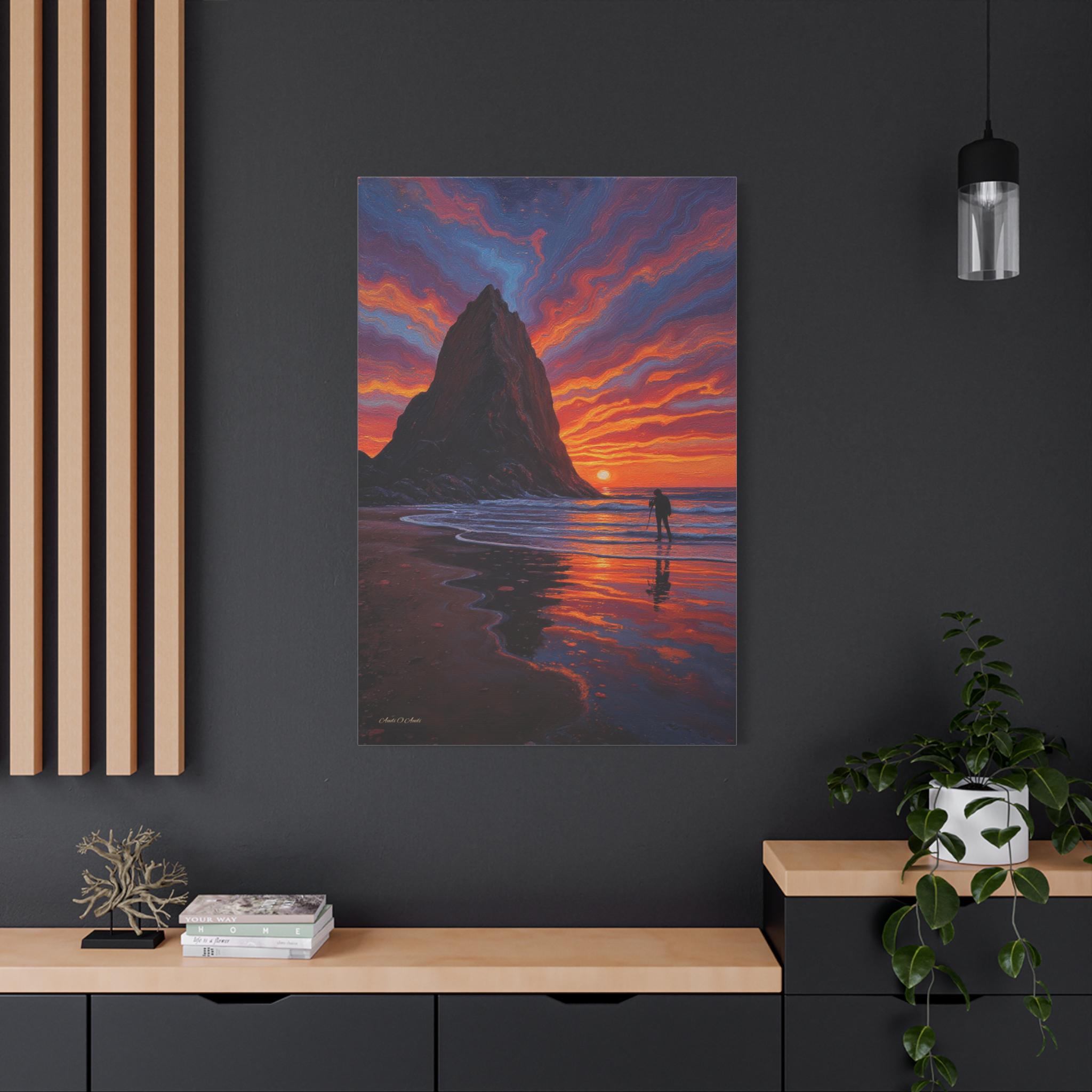 Immerse your space in the breathtaking drama of Echoes of the Ember Tide, a vivid canvas print capturing the soul of coastal serenity and awe. Two towering sea stacks rise from the ocean like ancient sentinels, silhouetted against a sky ablaze with swirling hues of crimson, violet, and gold. Below, a lone photographer stands in reverent stillness, tripod poised to preserve the fleeting magic of sunset.