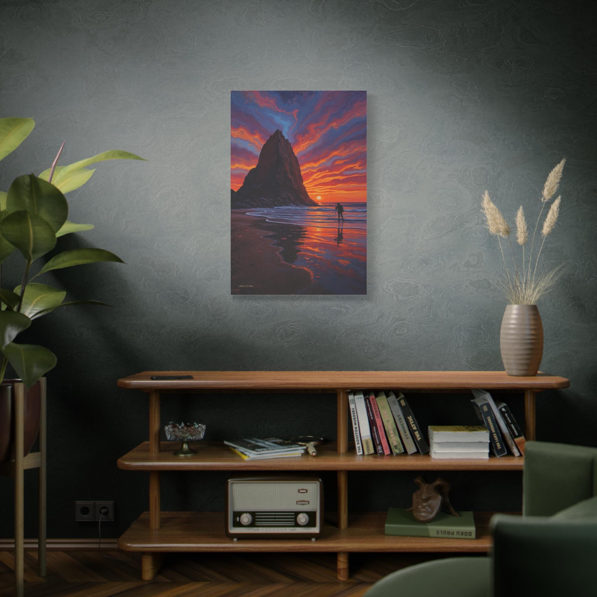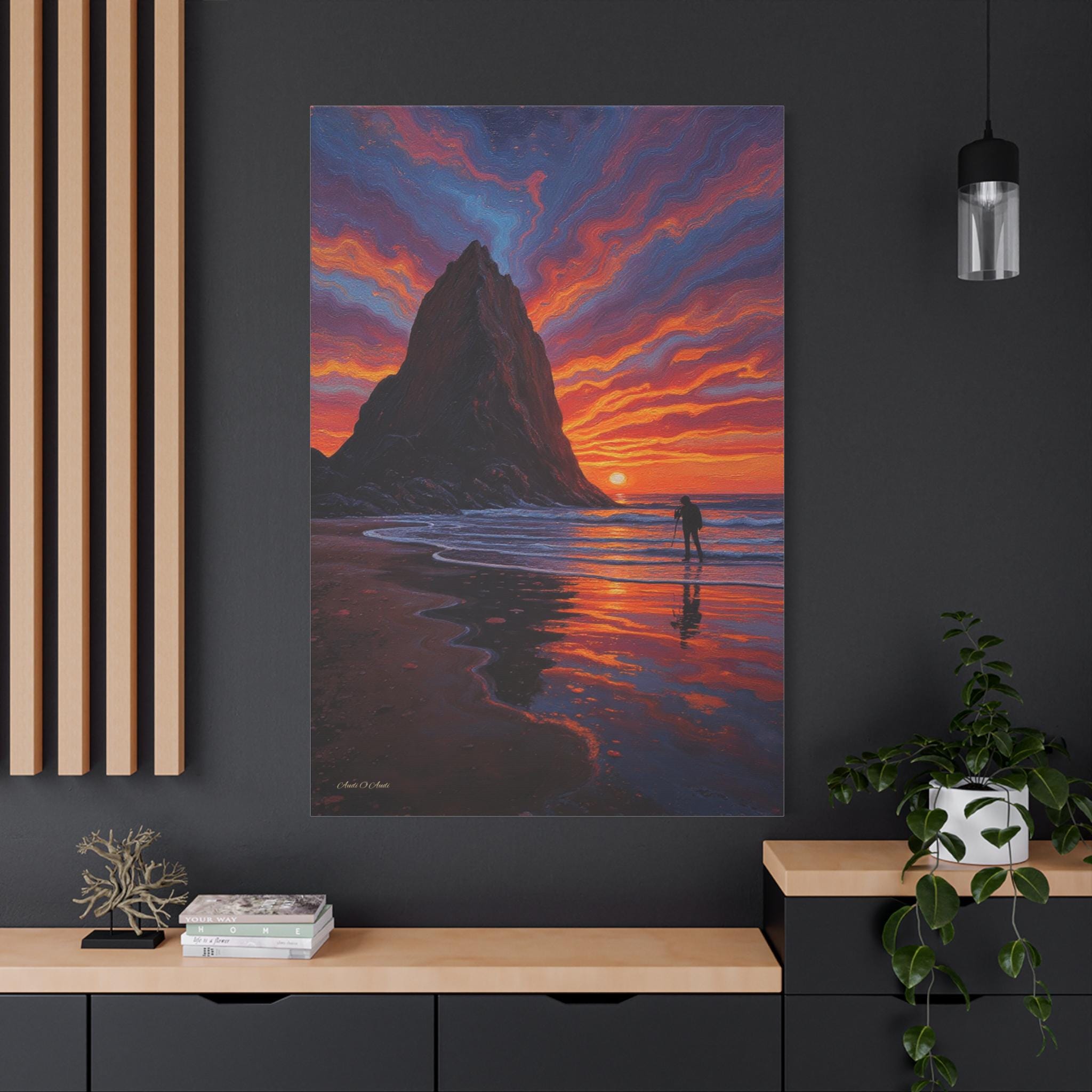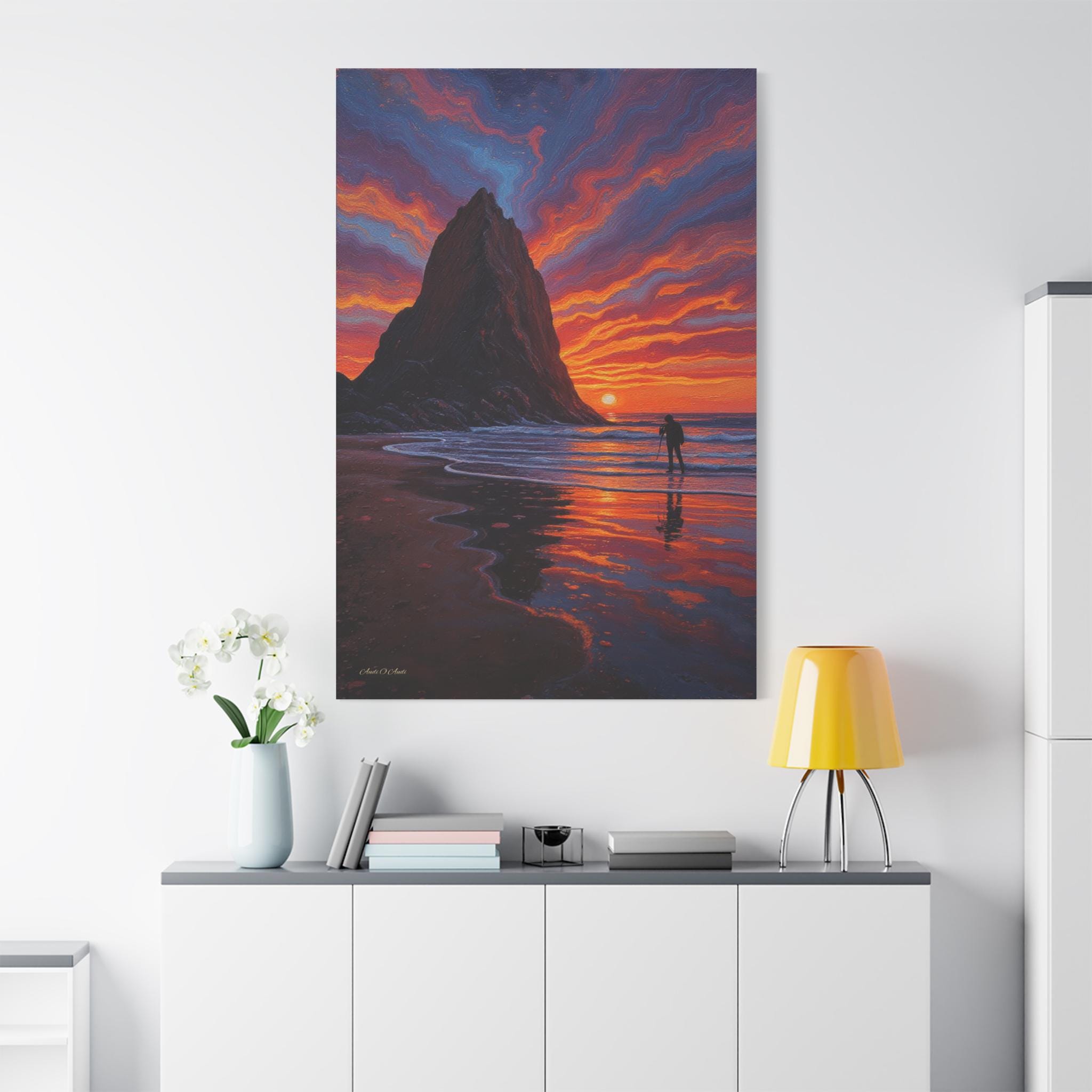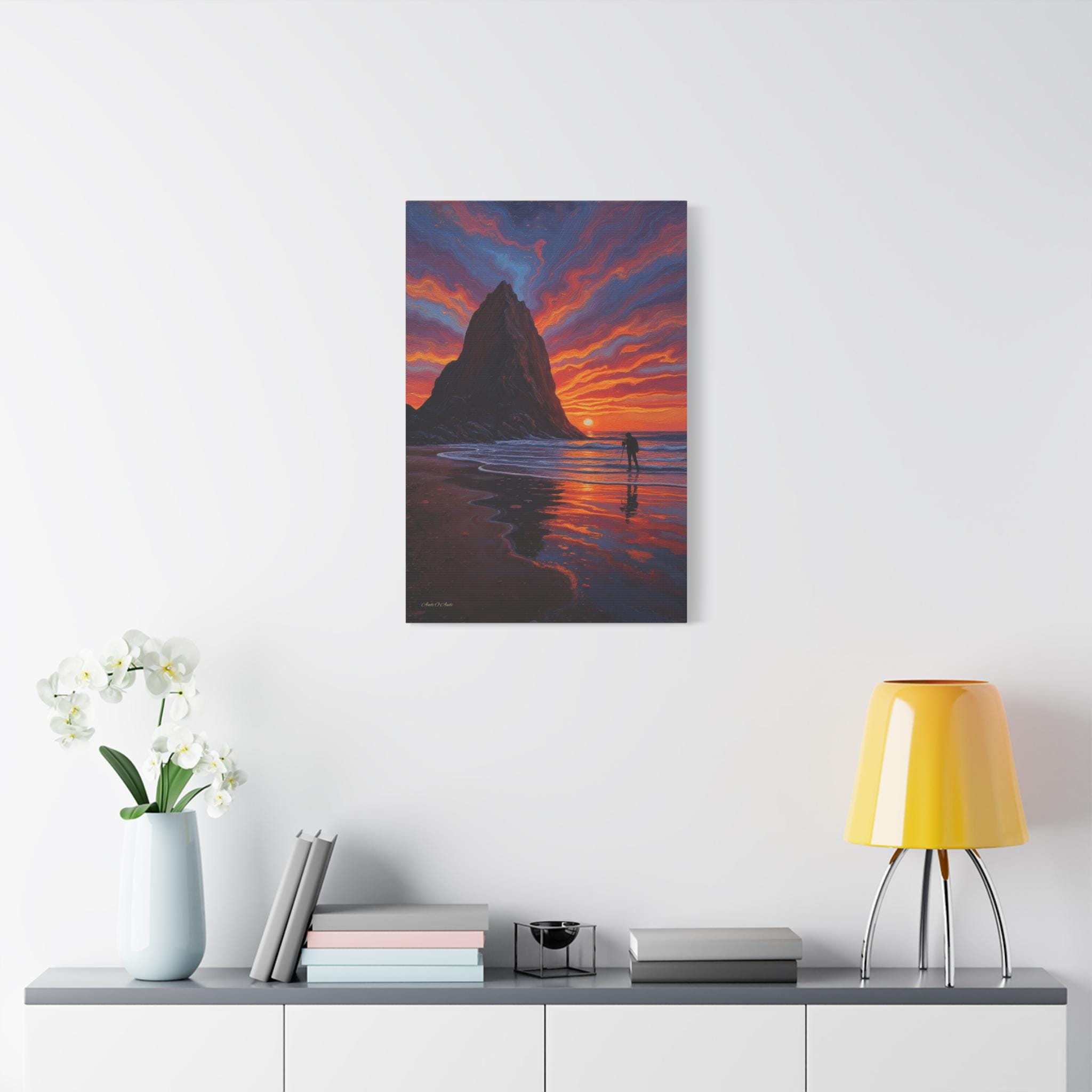 Immerse your space in the breathtaking drama of Echoes of the Ember Tide, a vivid canvas print capturing the soul of coastal serenity and awe. Two towering sea stacks rise from the ocean like ancient sentinels, silhouetted against a sky ablaze with swirling hues of crimson, violet, and gold. Below, a lone photographer stands in reverent stillness, tripod poised to preserve the fleeting magic of sunset.