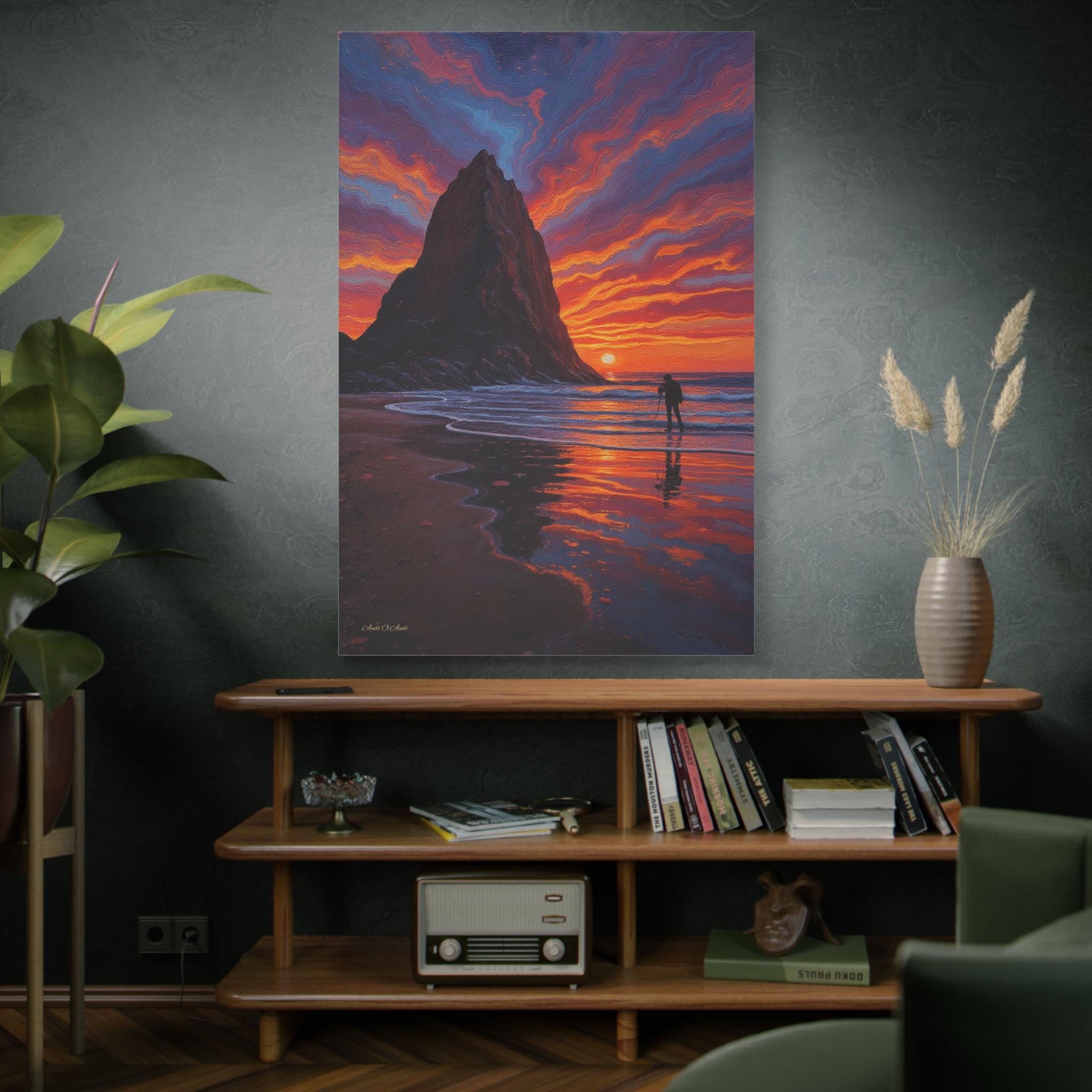 This artwork evokes themes of reflection, wonder, and the eternal dance between nature and human curiosity. The wet sand mirrors the sky’s fire, creating a dreamlike symmetry that draws the eye and calms the spirit.