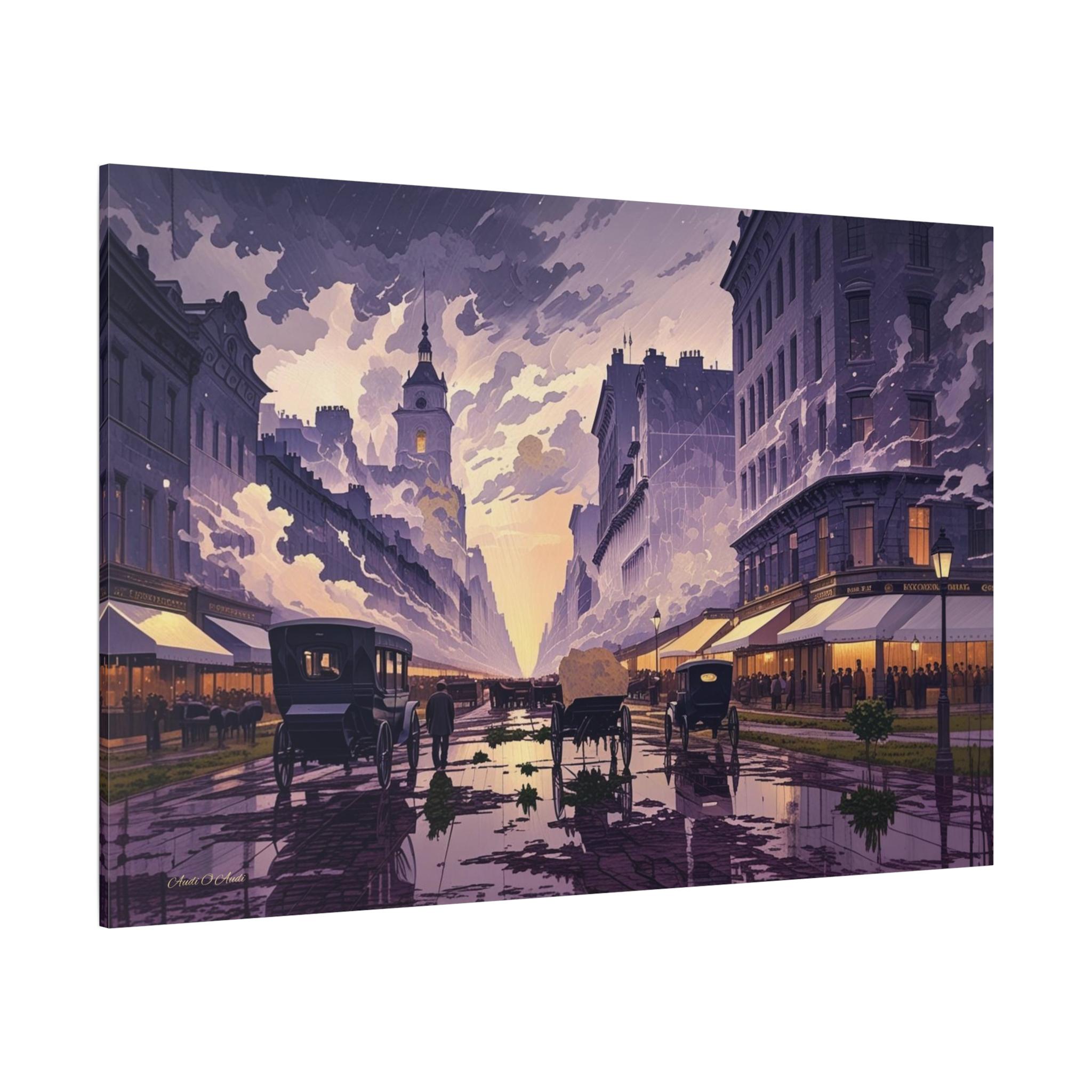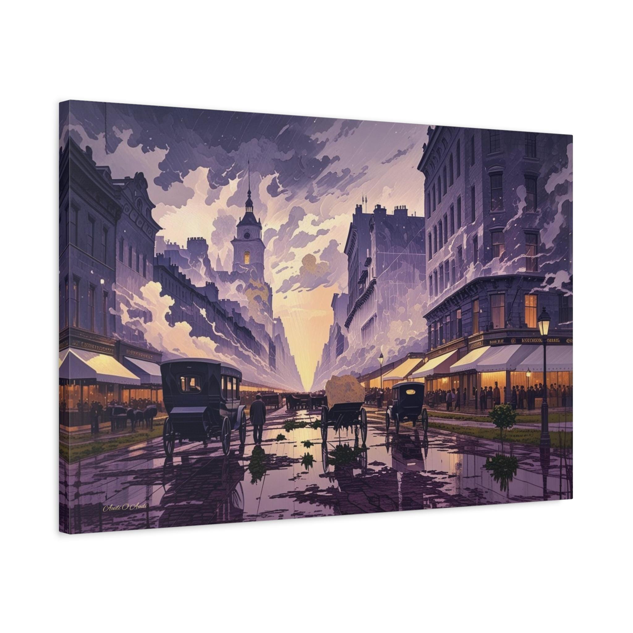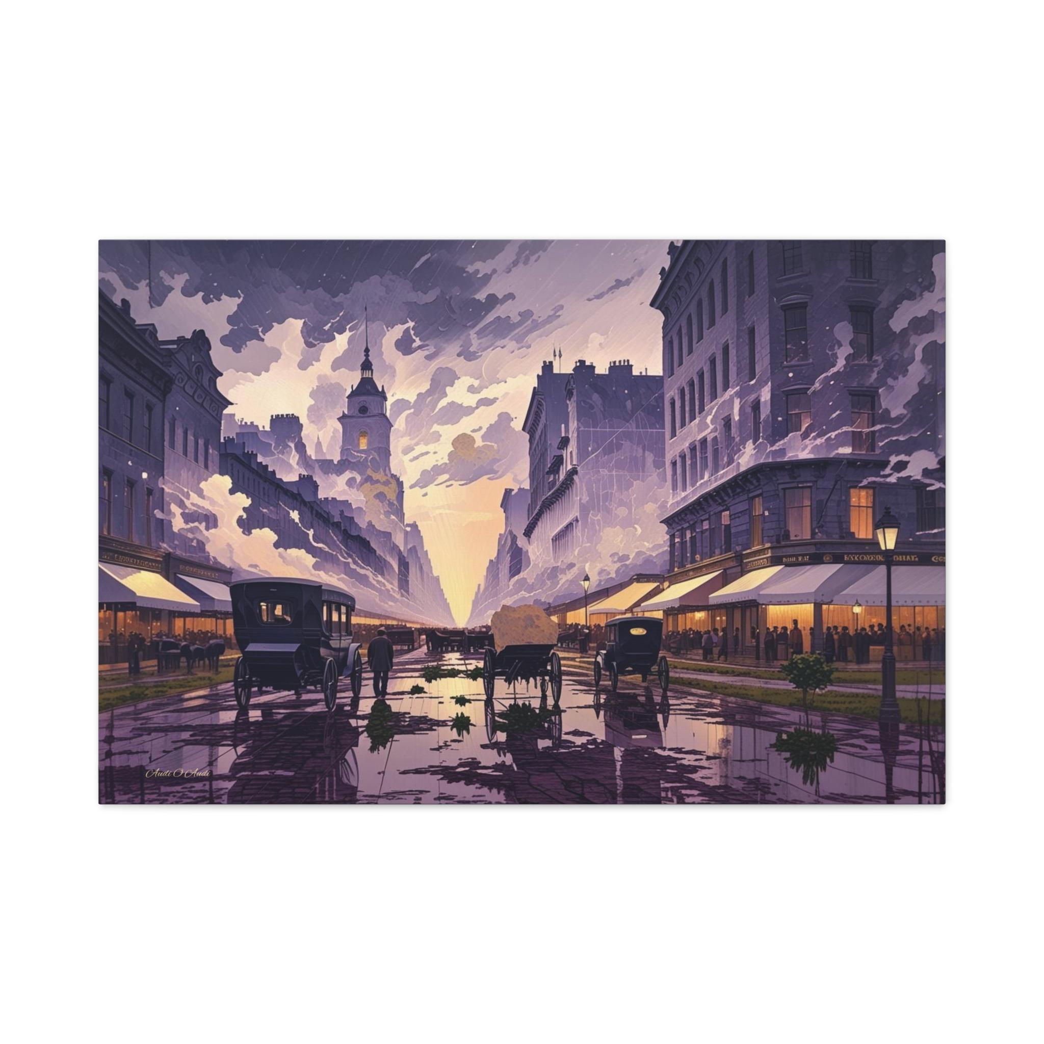 Transport yourself to the turn of the 20th century with this breathtaking, atmospheric canvas print, "Twilight of the Carriage Age." This artwork captures a wide-angle view of a bustling downtown street at dusk or dawn, featuring horse-drawn carriages and figures against a sky bursting with stylized light.