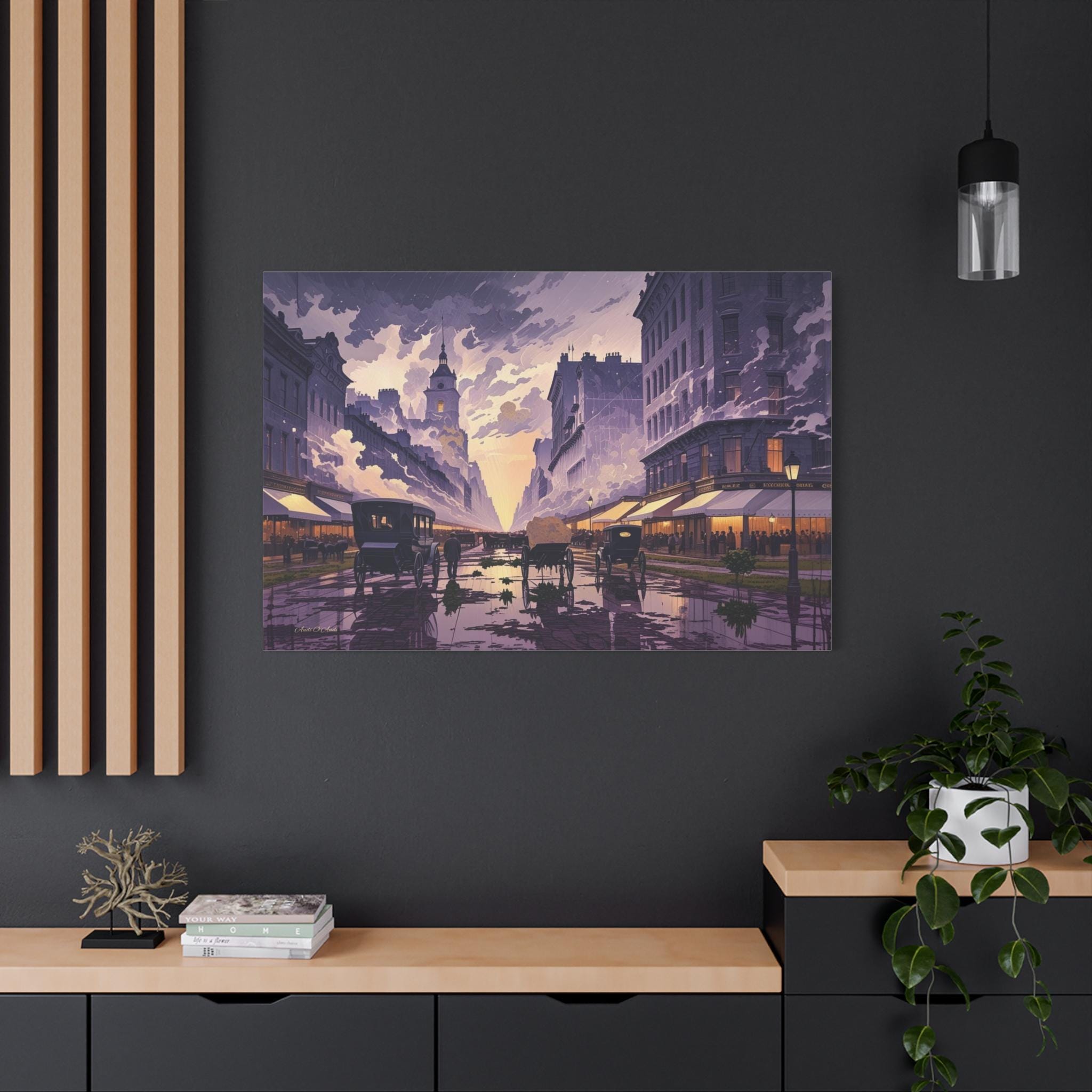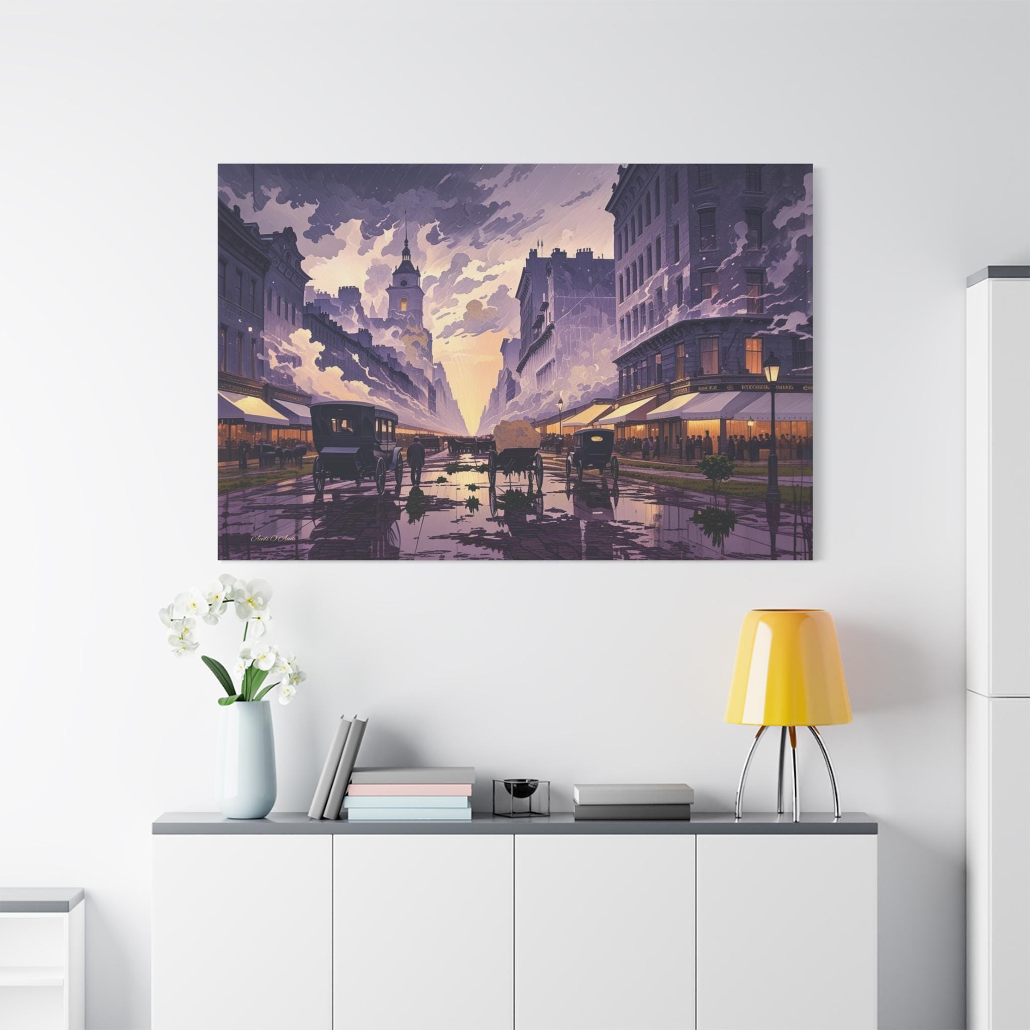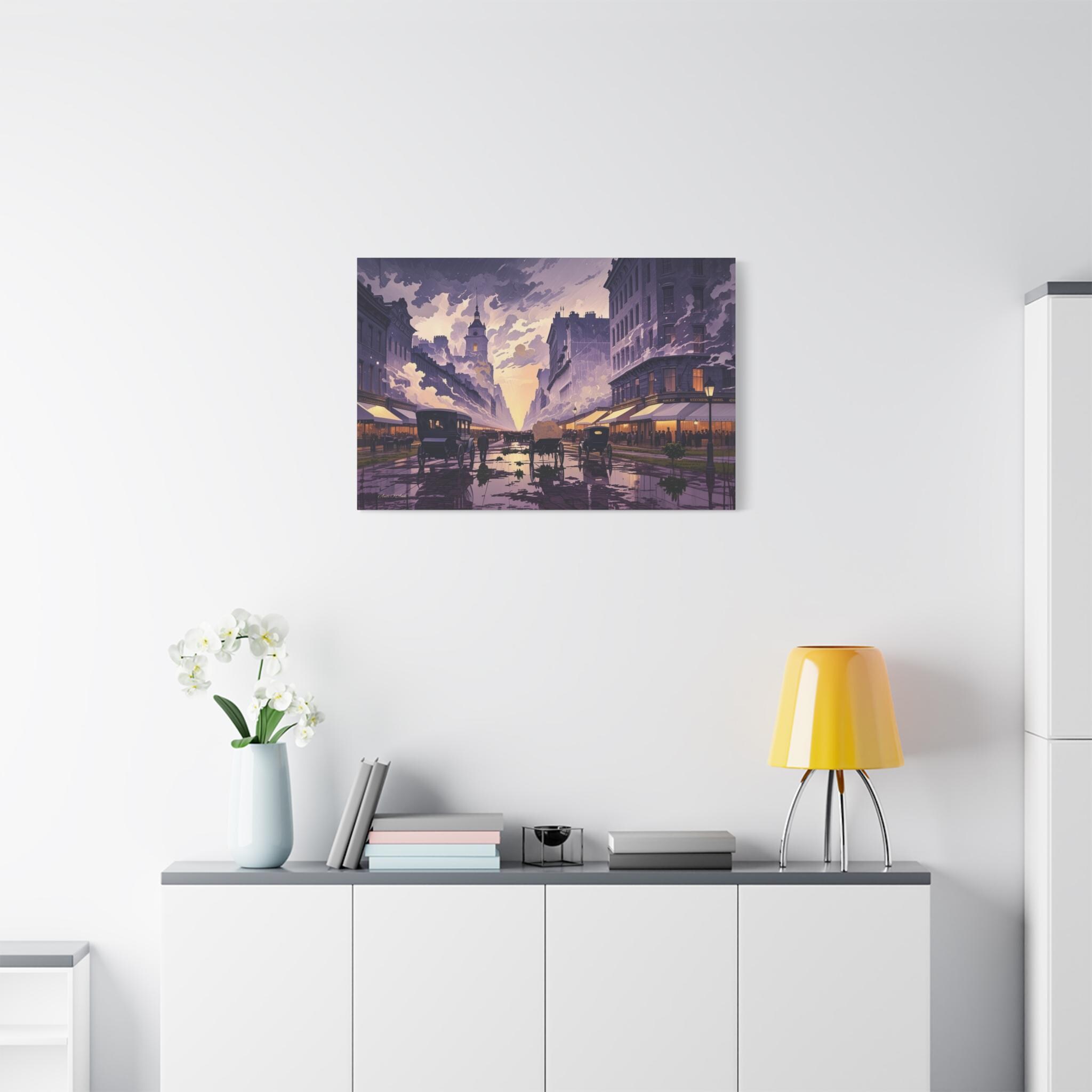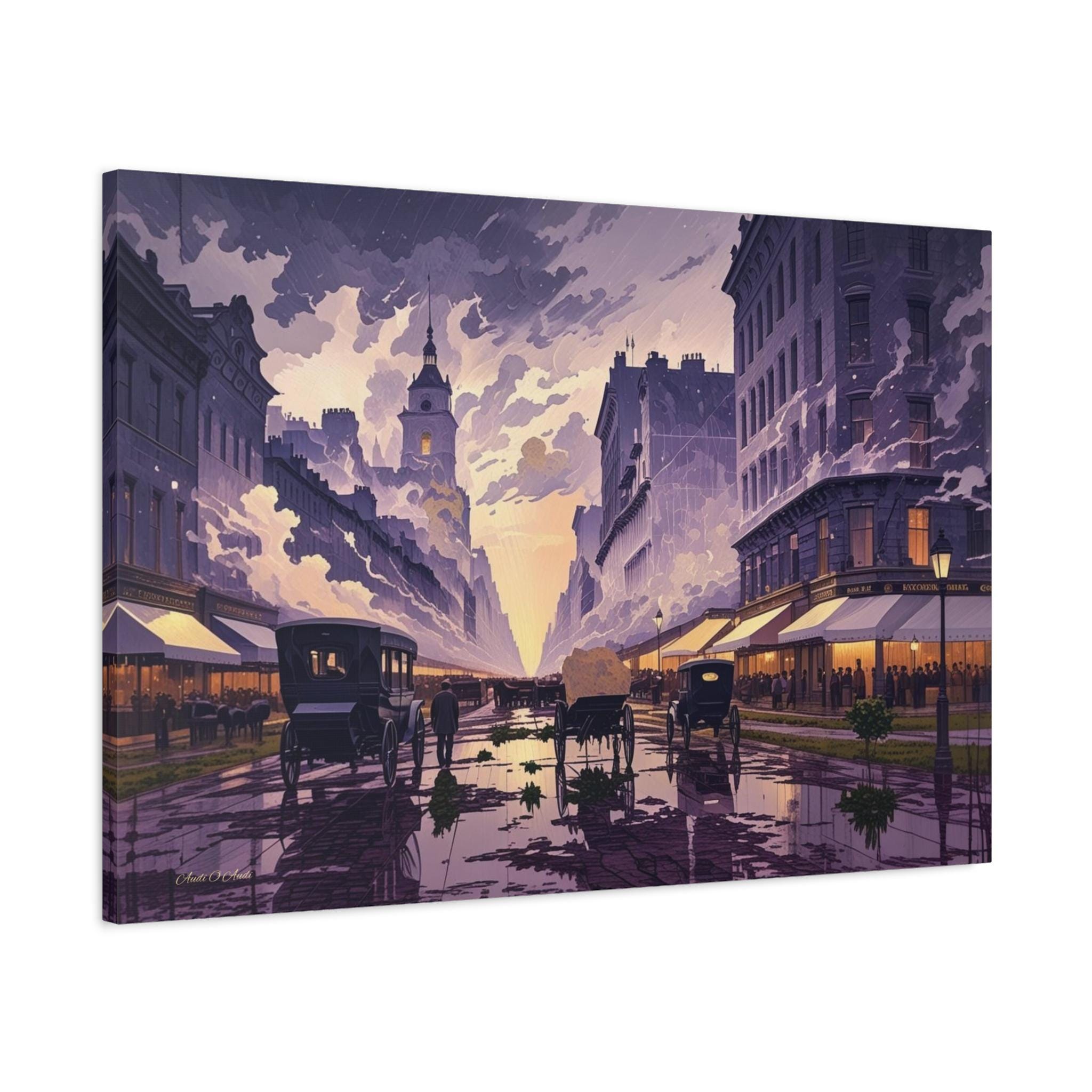 Transport yourself to the turn of the 20th century with this breathtaking, atmospheric canvas print, "Twilight of the Carriage Age." This artwork captures a wide-angle view of a bustling downtown street at dusk or dawn, featuring horse-drawn carriages and figures against a sky bursting with stylized light.