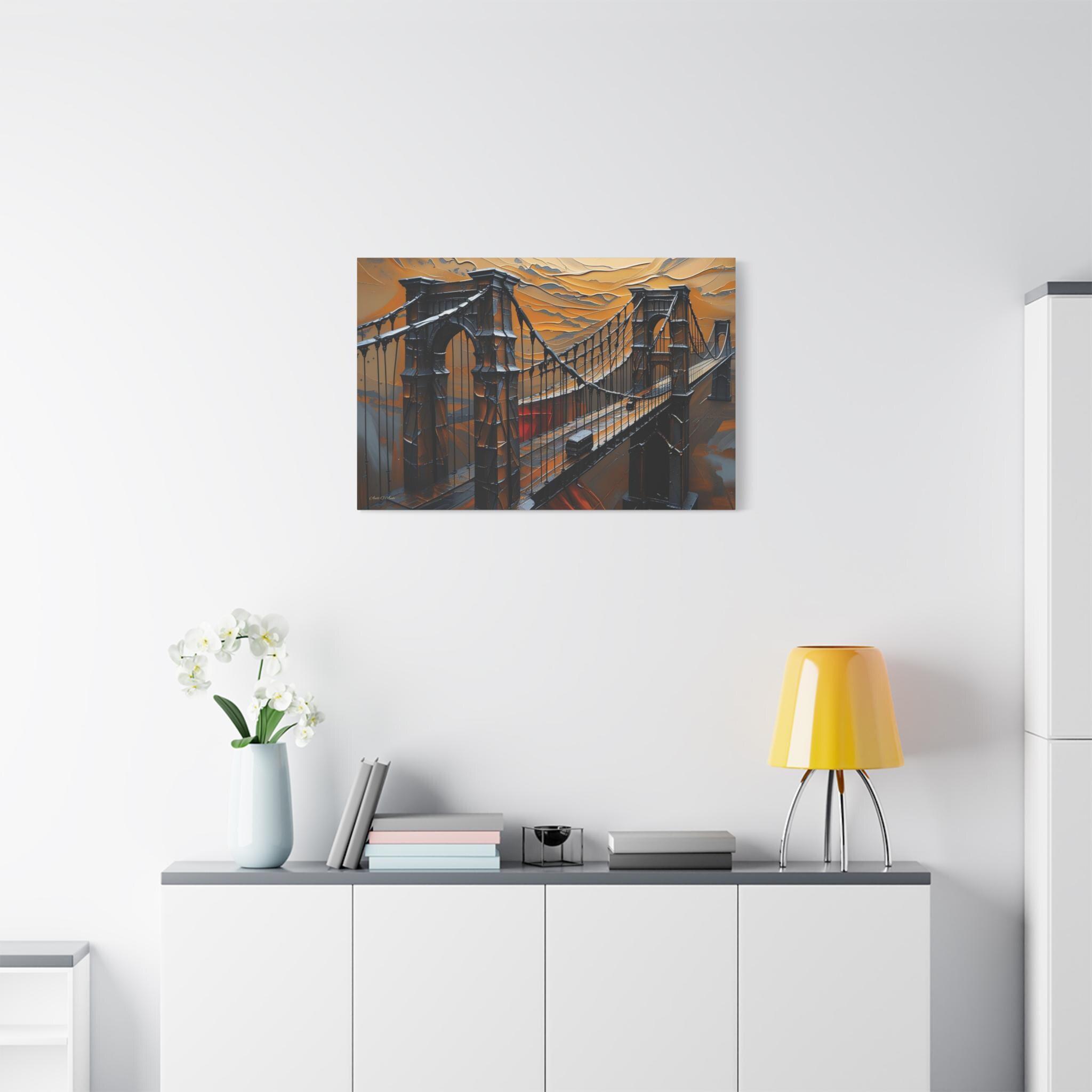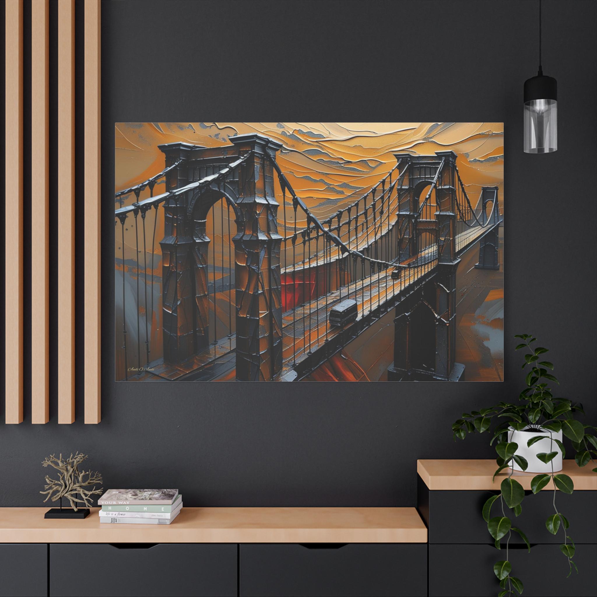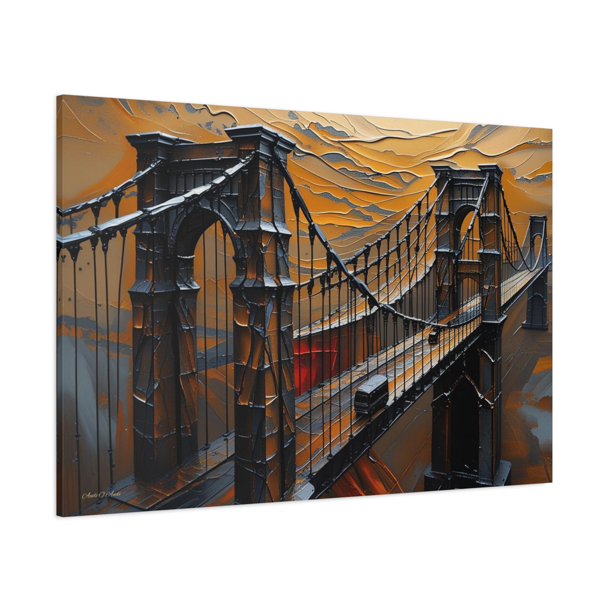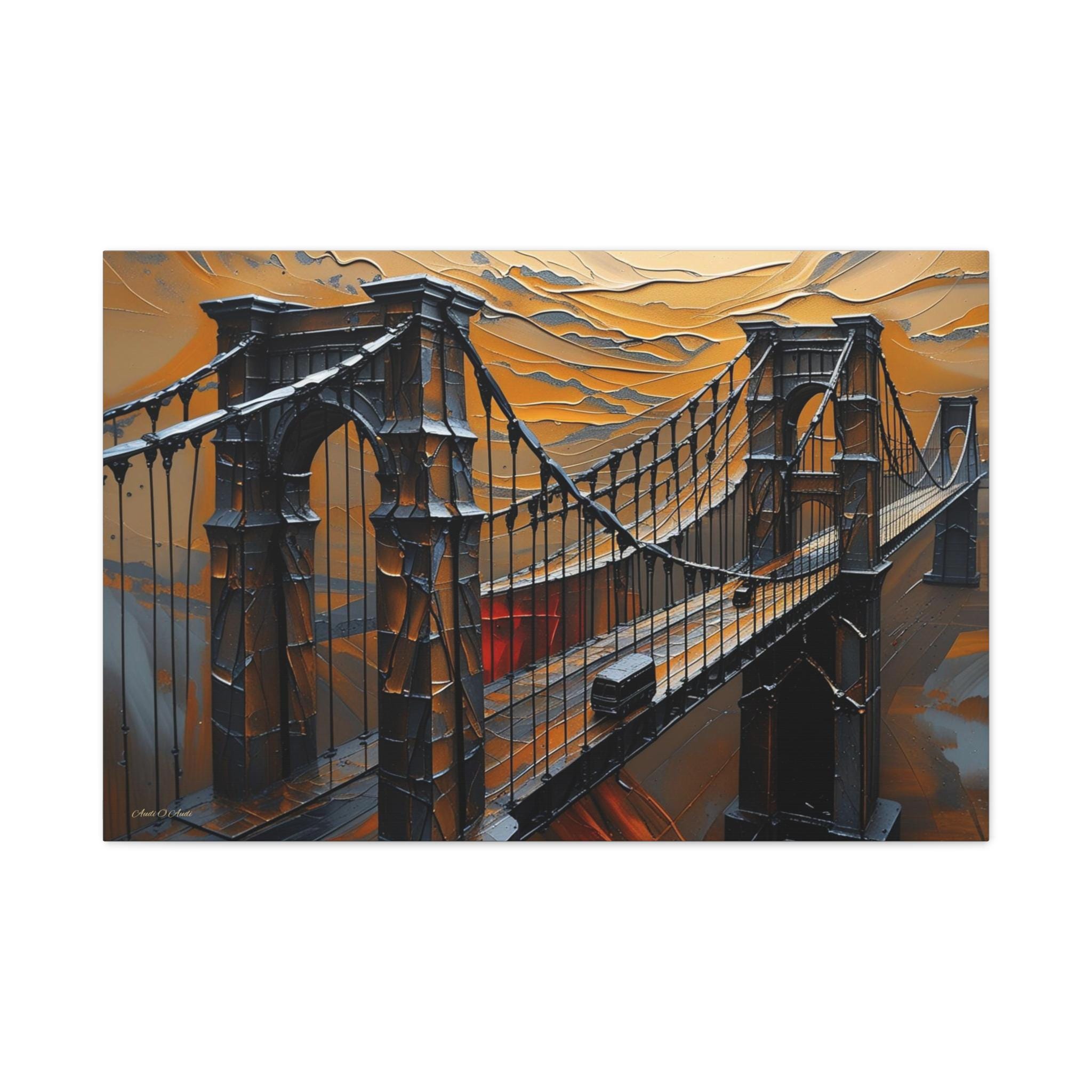 Make an unforgettable, bold statement with this intense canvas print, "Forged in Amber." This artwork transforms an iconic suspension bridge into a dramatic, stylized structure, rendered entirely in a striking heavy impasto technique against a fiery, textured sky.