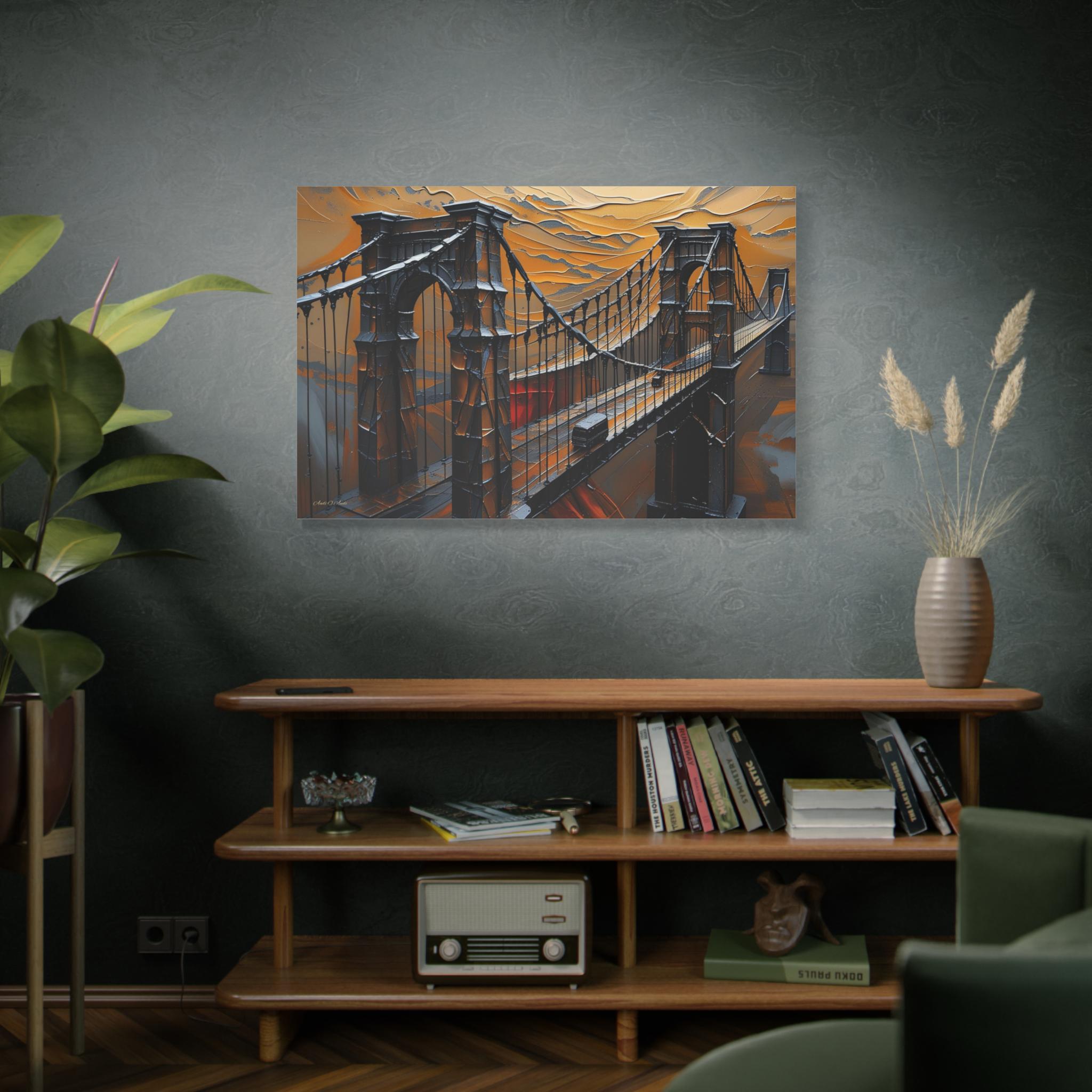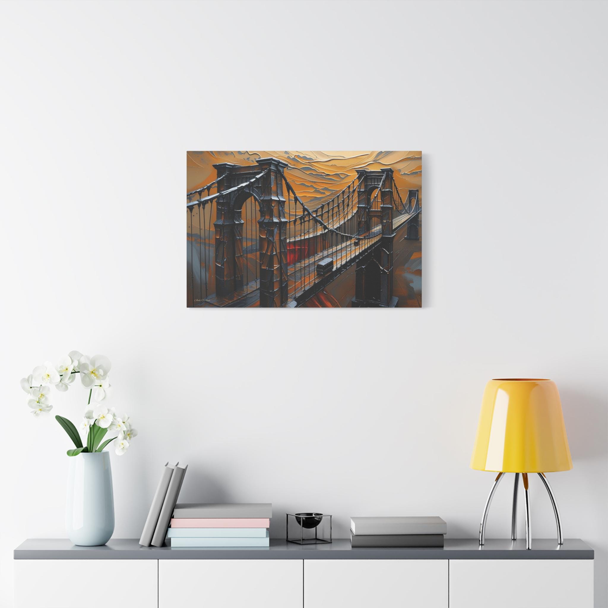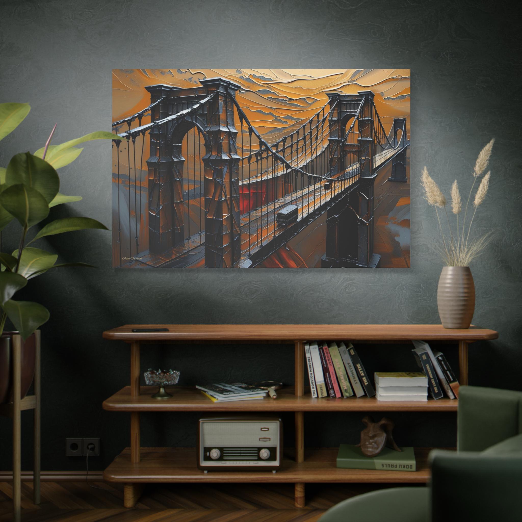 Make an unforgettable, bold statement with this intense canvas print, "Forged in Amber." This artwork transforms an iconic suspension bridge into a dramatic, stylized structure, rendered entirely in a striking heavy impasto technique against a fiery, textured sky.