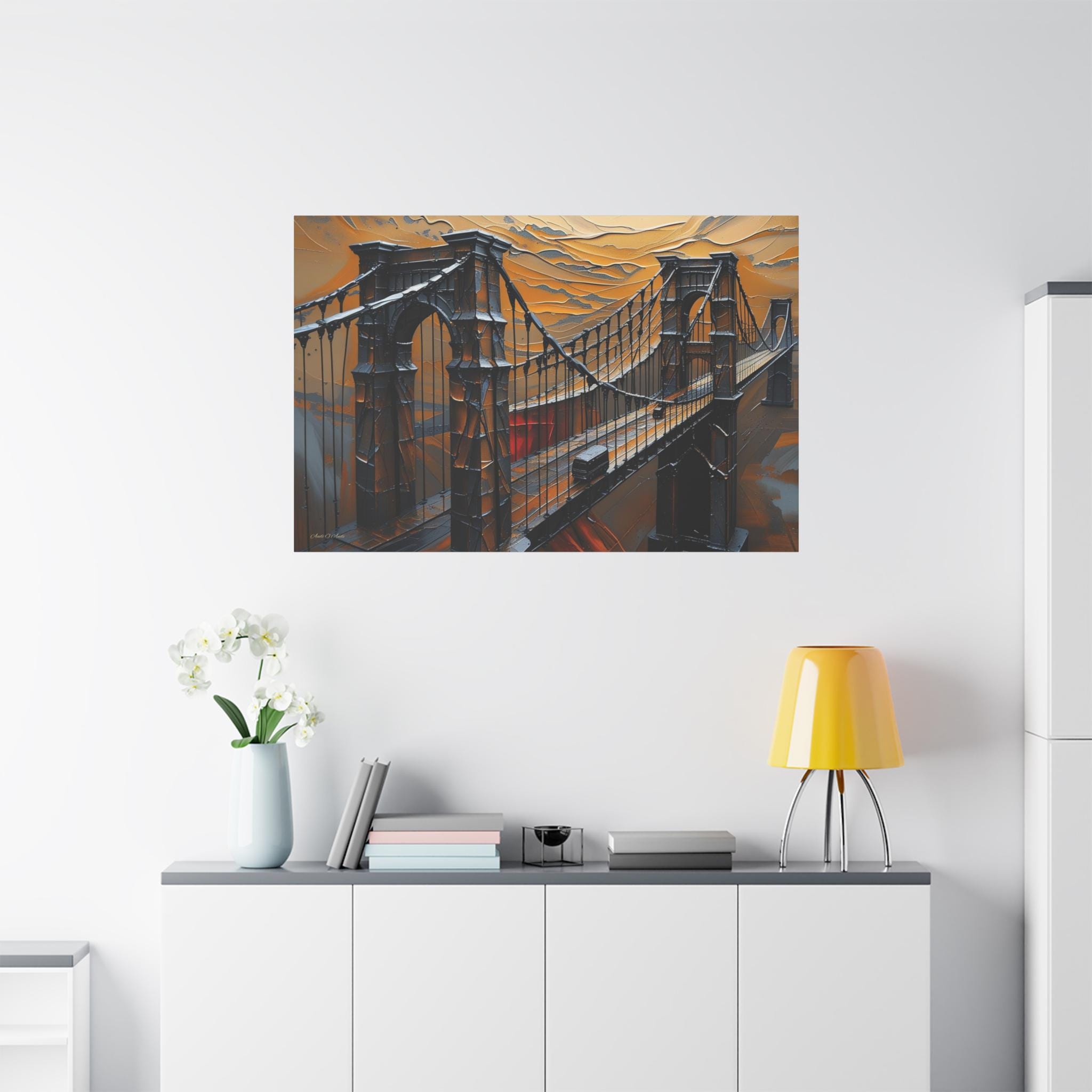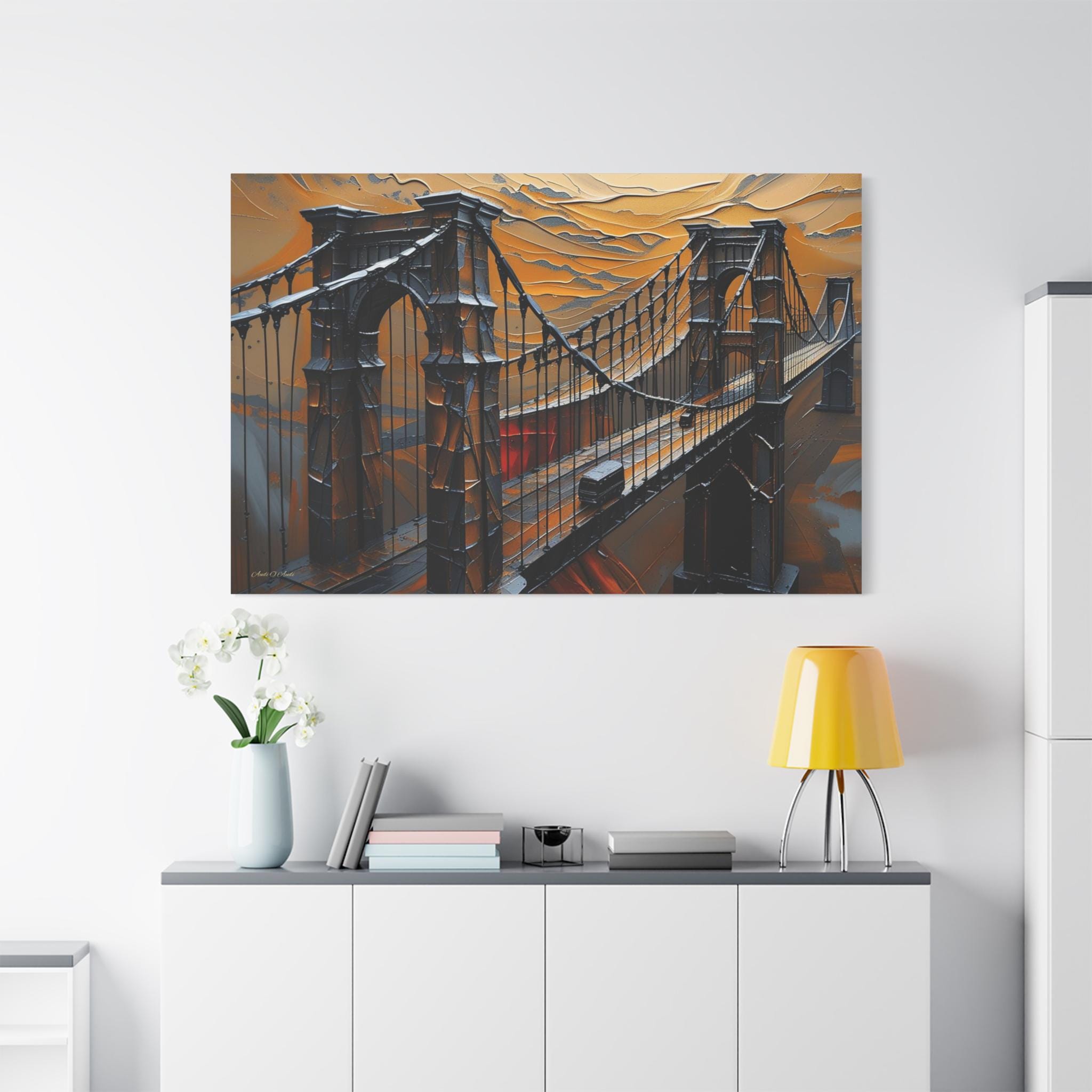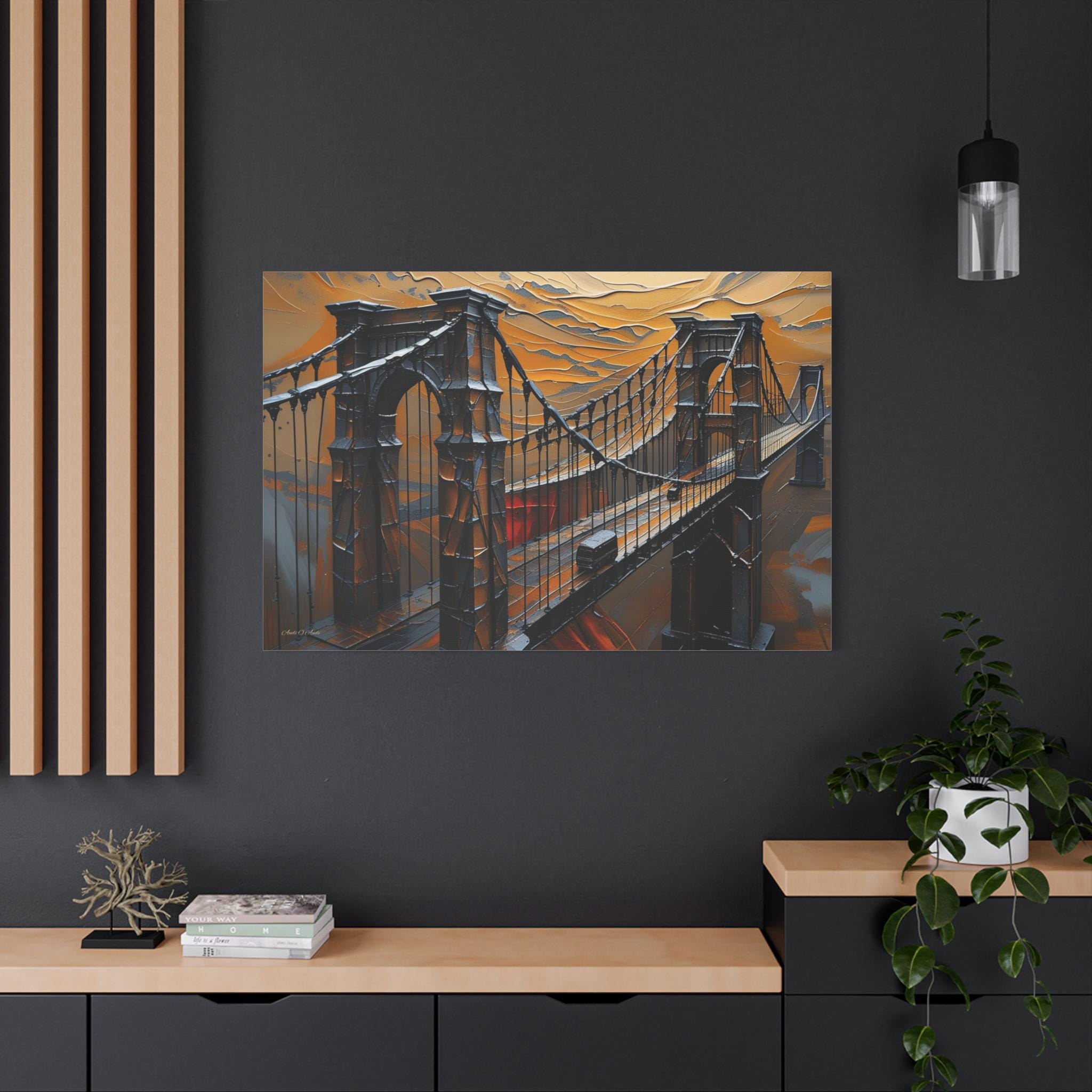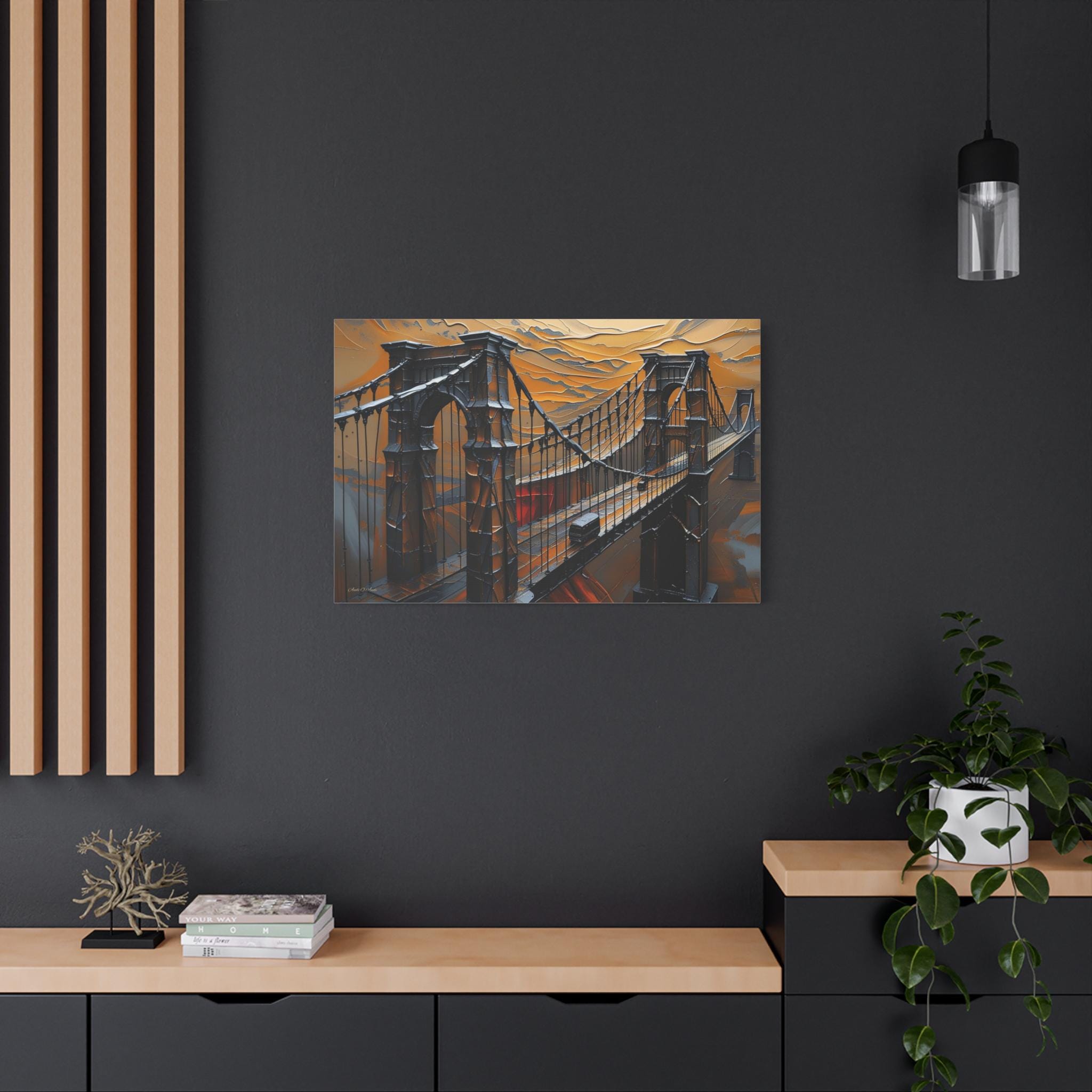 Make an unforgettable, bold statement with this intense canvas print, "Forged in Amber." This artwork transforms an iconic suspension bridge into a dramatic, stylized structure, rendered entirely in a striking heavy impasto technique against a fiery, textured sky.