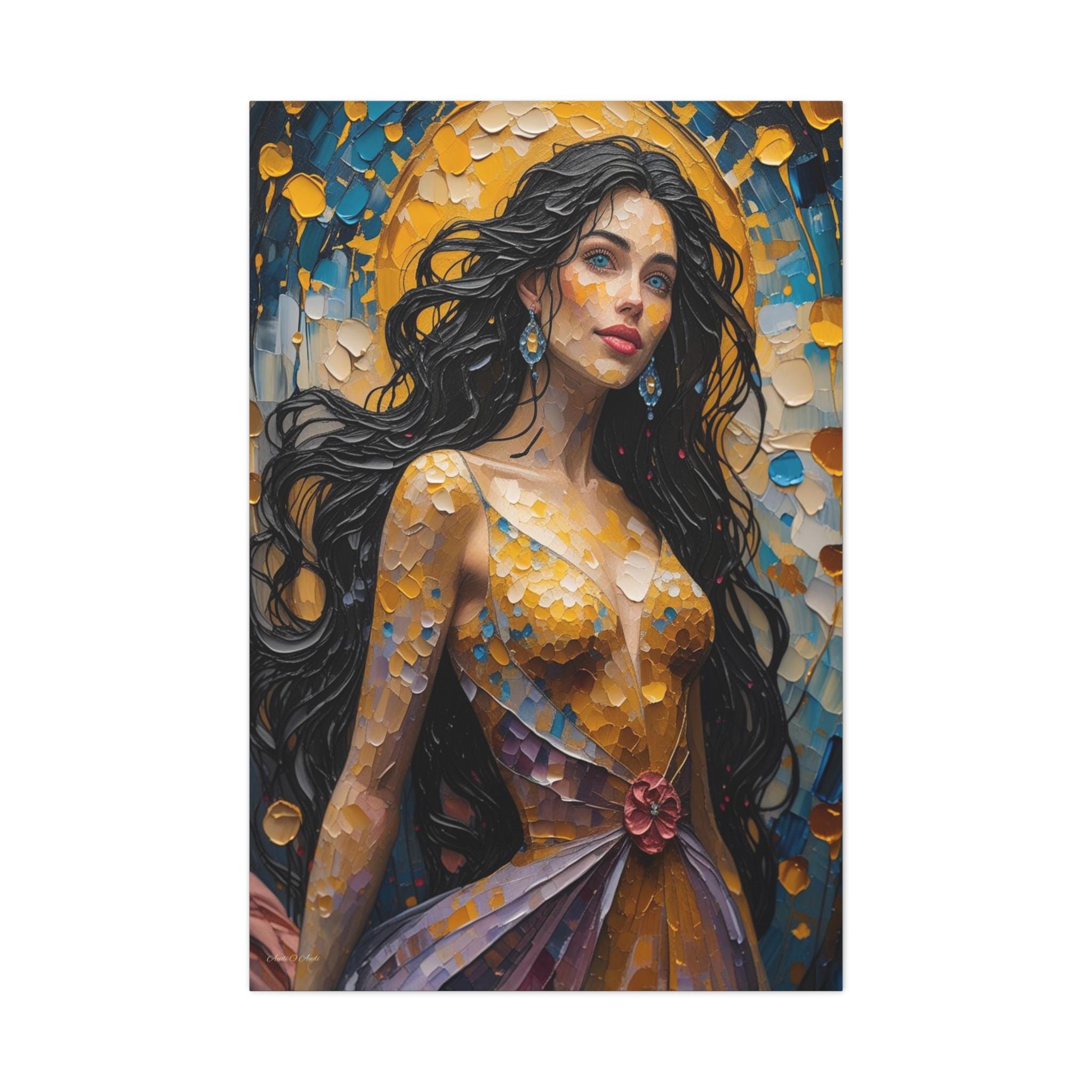 Feminine Grace: The woman is portrayed with striking black hair, piercing blue eyes, and jewelry that echoes the background colors. The mosaic pattern of her golden dress adds a unique, handcrafted feel to the luxury aesthetic.