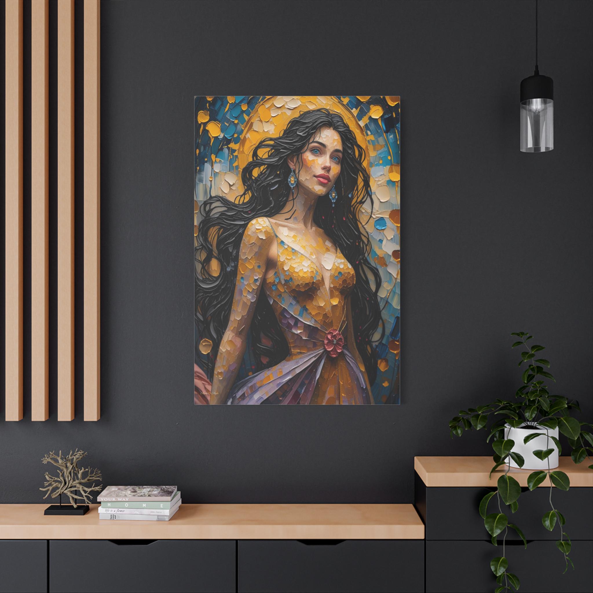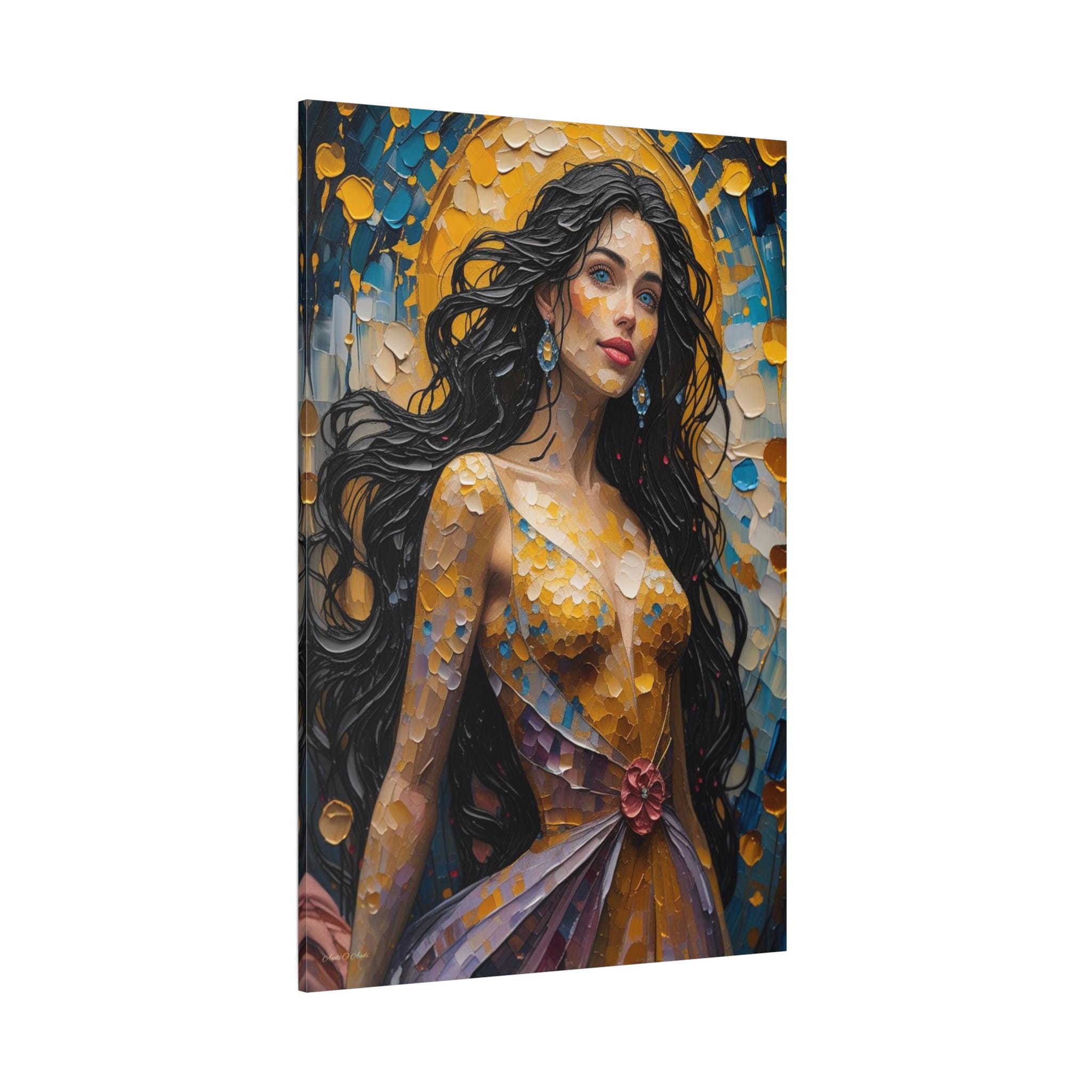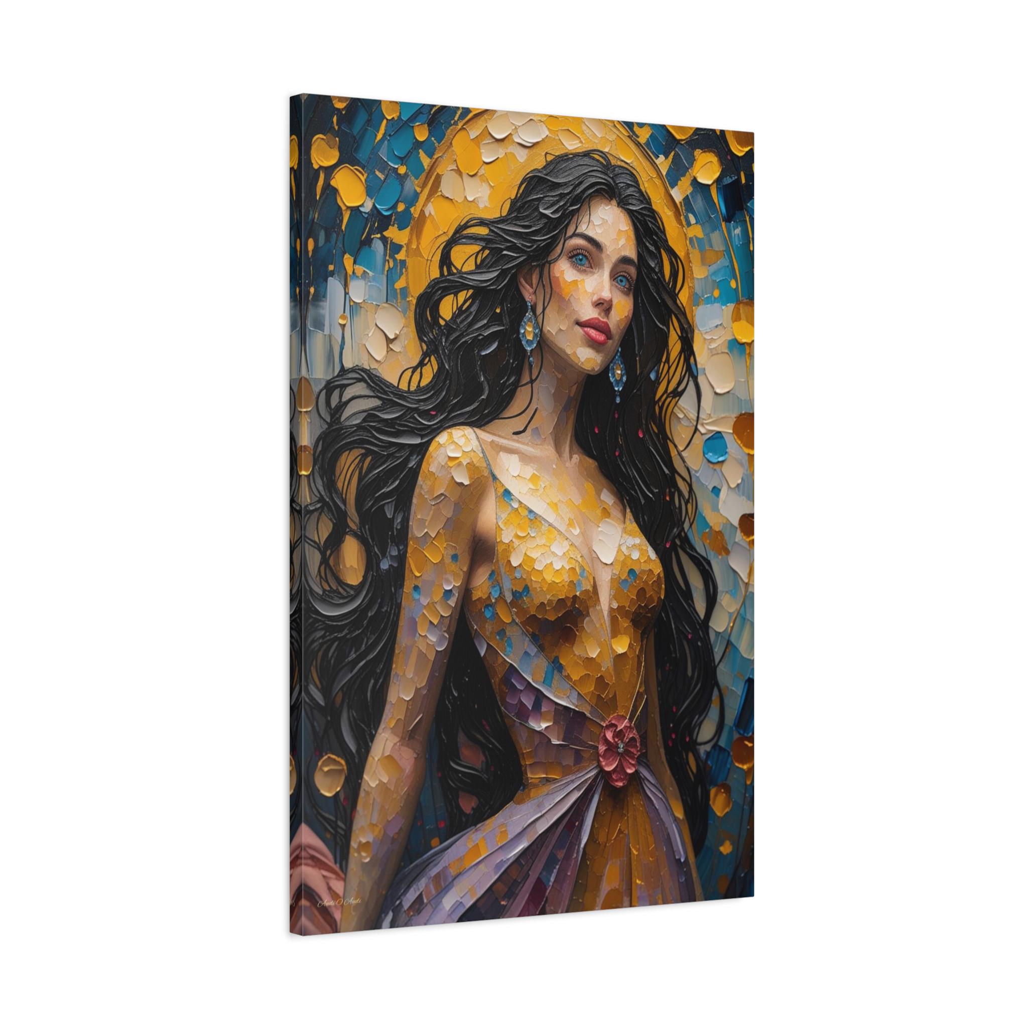 Illuminate your space with the dazzling beauty of this textured canvas print, "Golden Hour Muse." This magnificent portrait depicts a majestic woman radiating beauty and confidence, painted entirely in a vivid, mosaic-like heavy impasto style that captures the light.