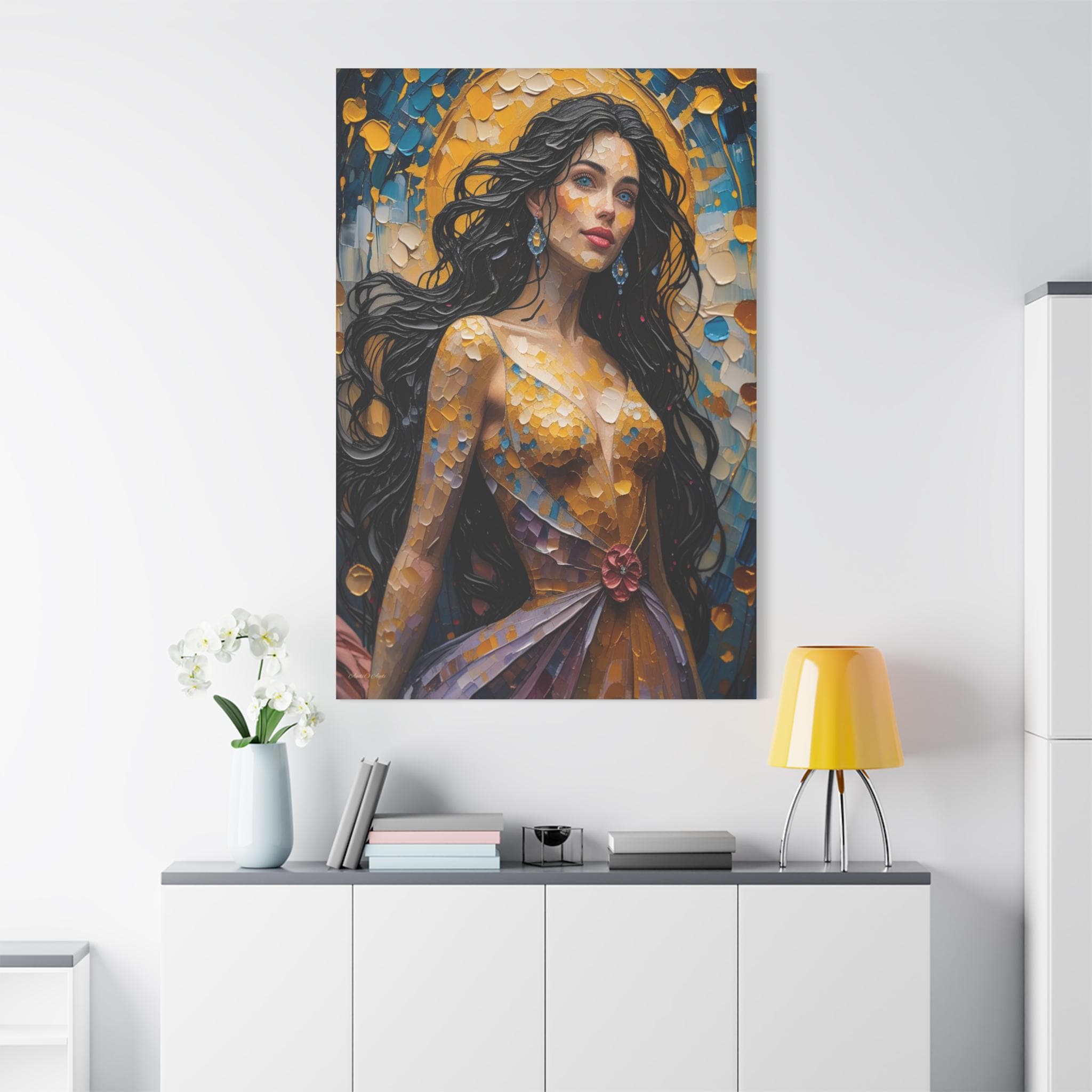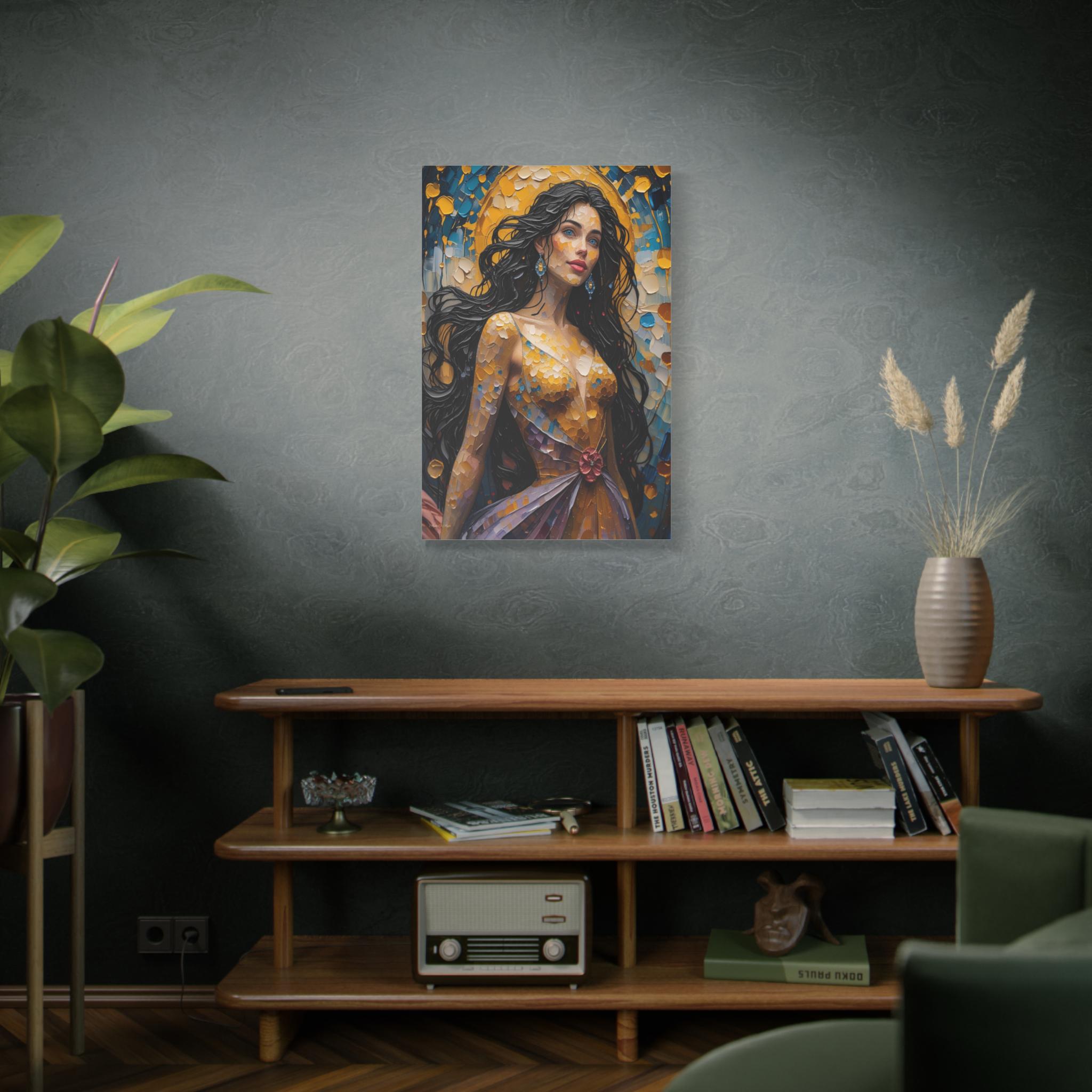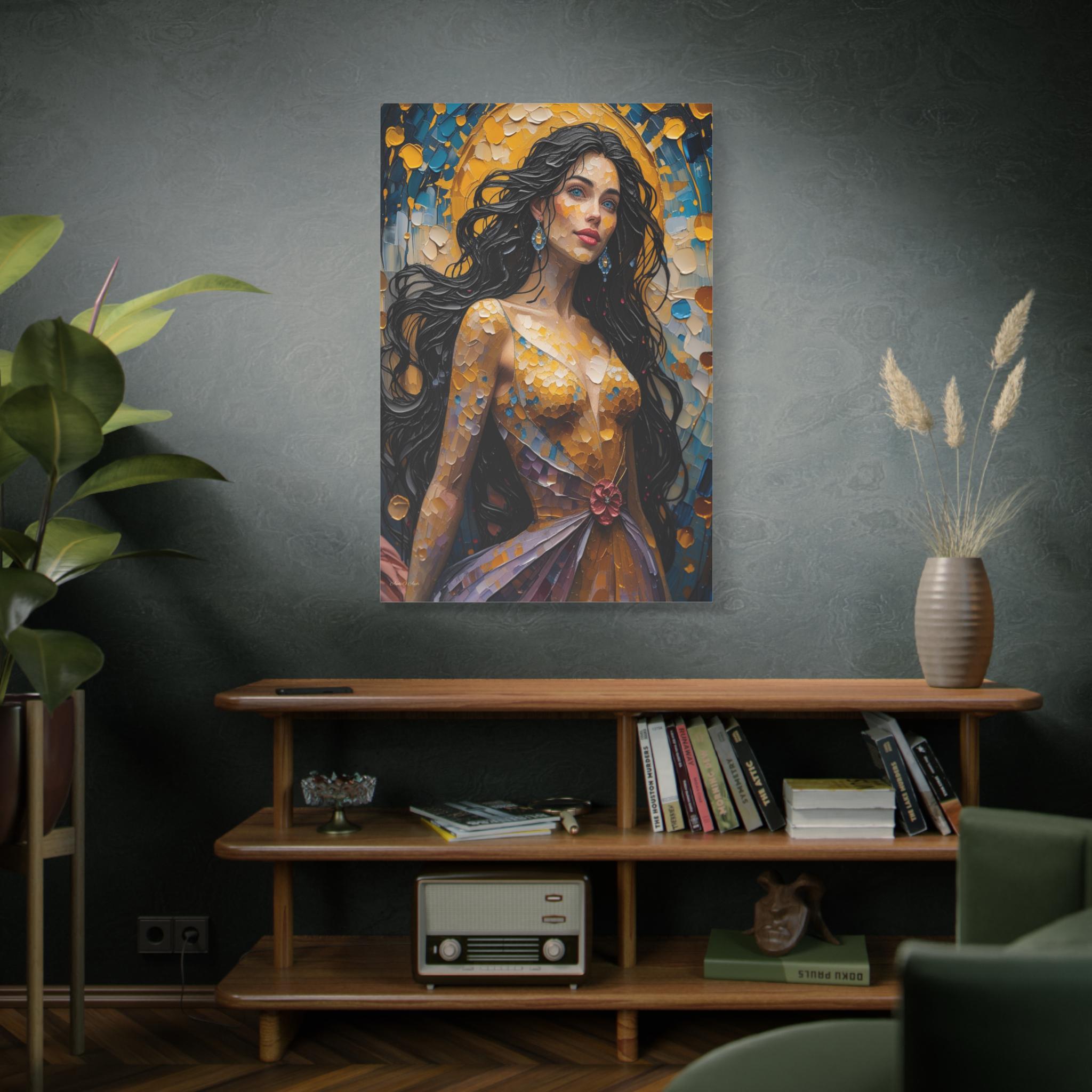 Illuminate your space with the dazzling beauty of this textured canvas print, "Golden Hour Muse." This magnificent portrait depicts a majestic woman radiating beauty and confidence, painted entirely in a vivid, mosaic-like heavy impasto style that captures the light.
