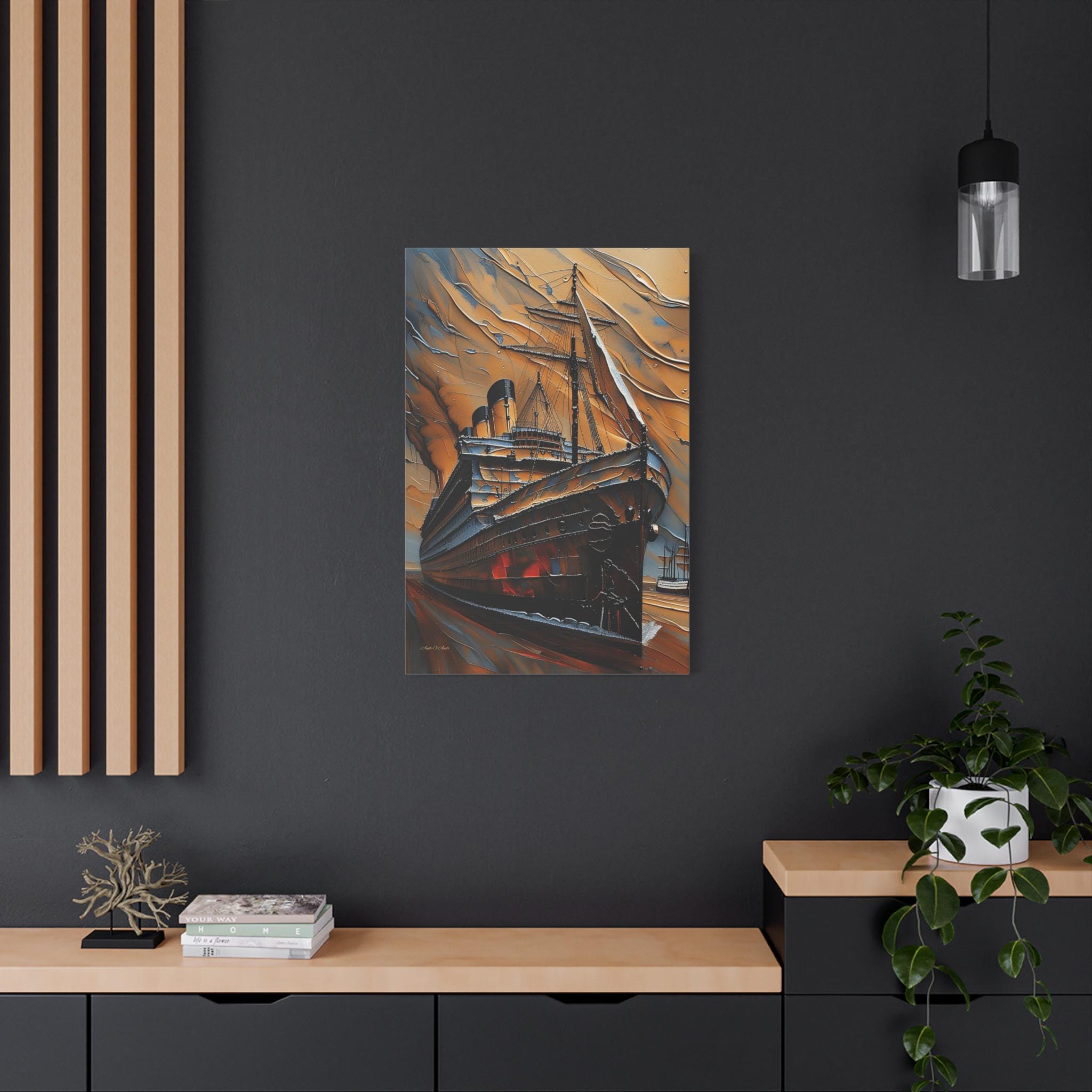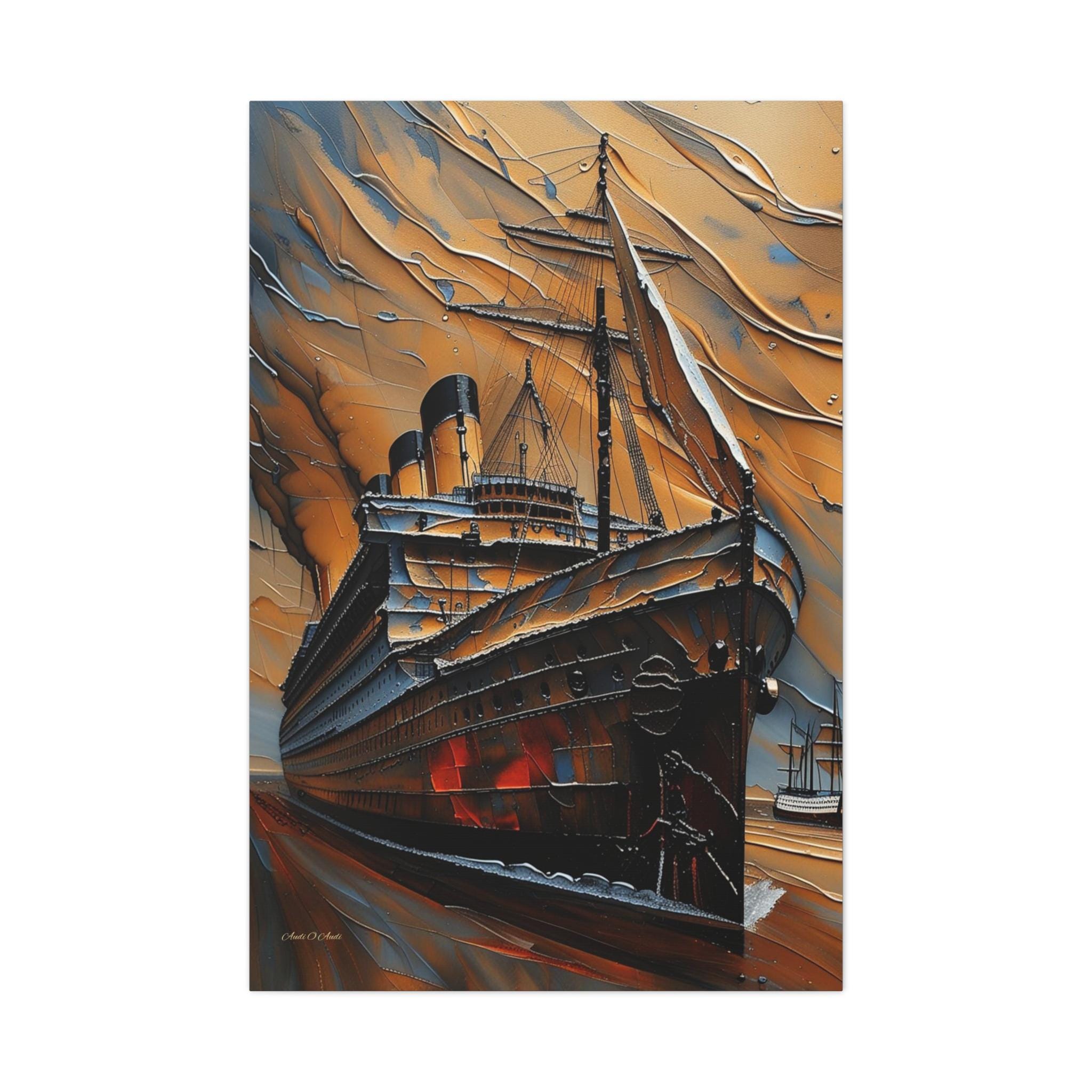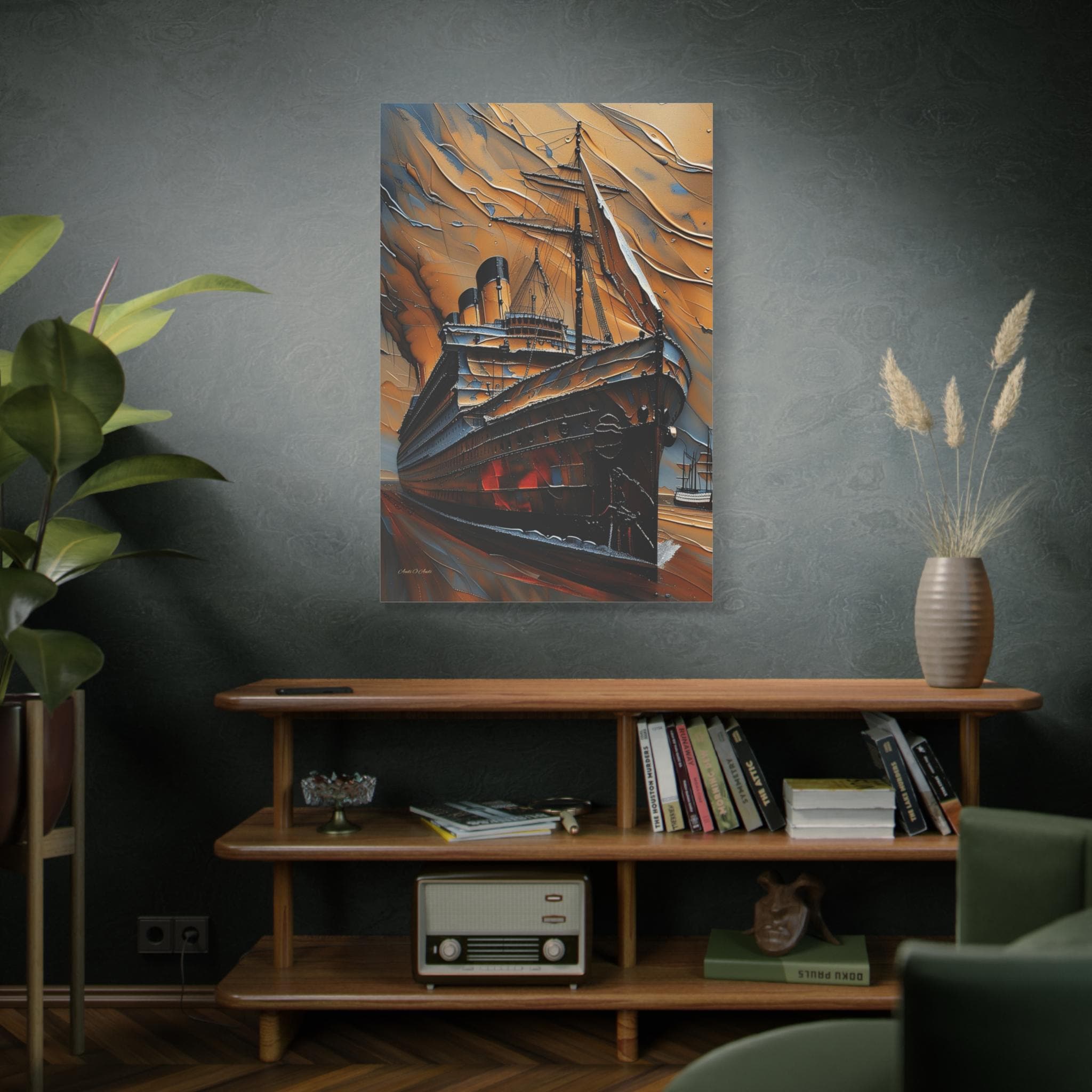 Capture the grandeur and dramatic history of the great era of ocean travel with this unique canvas print, "Voyage of the Sunken King." This painting portrays a majestic ship, likely the Titanic or a similar liner, rendered in an intense, highly textural style against a fiery, turbulent sky.