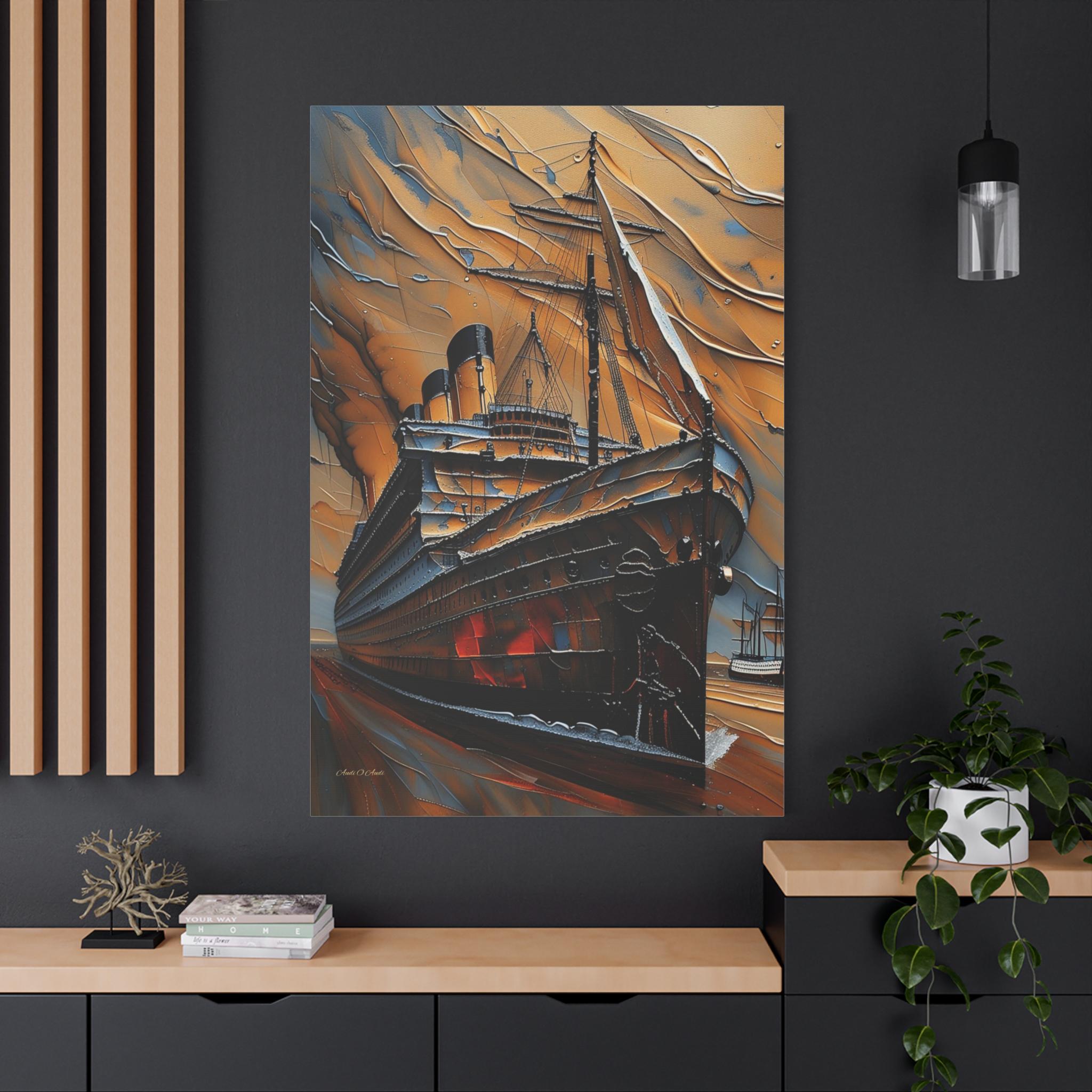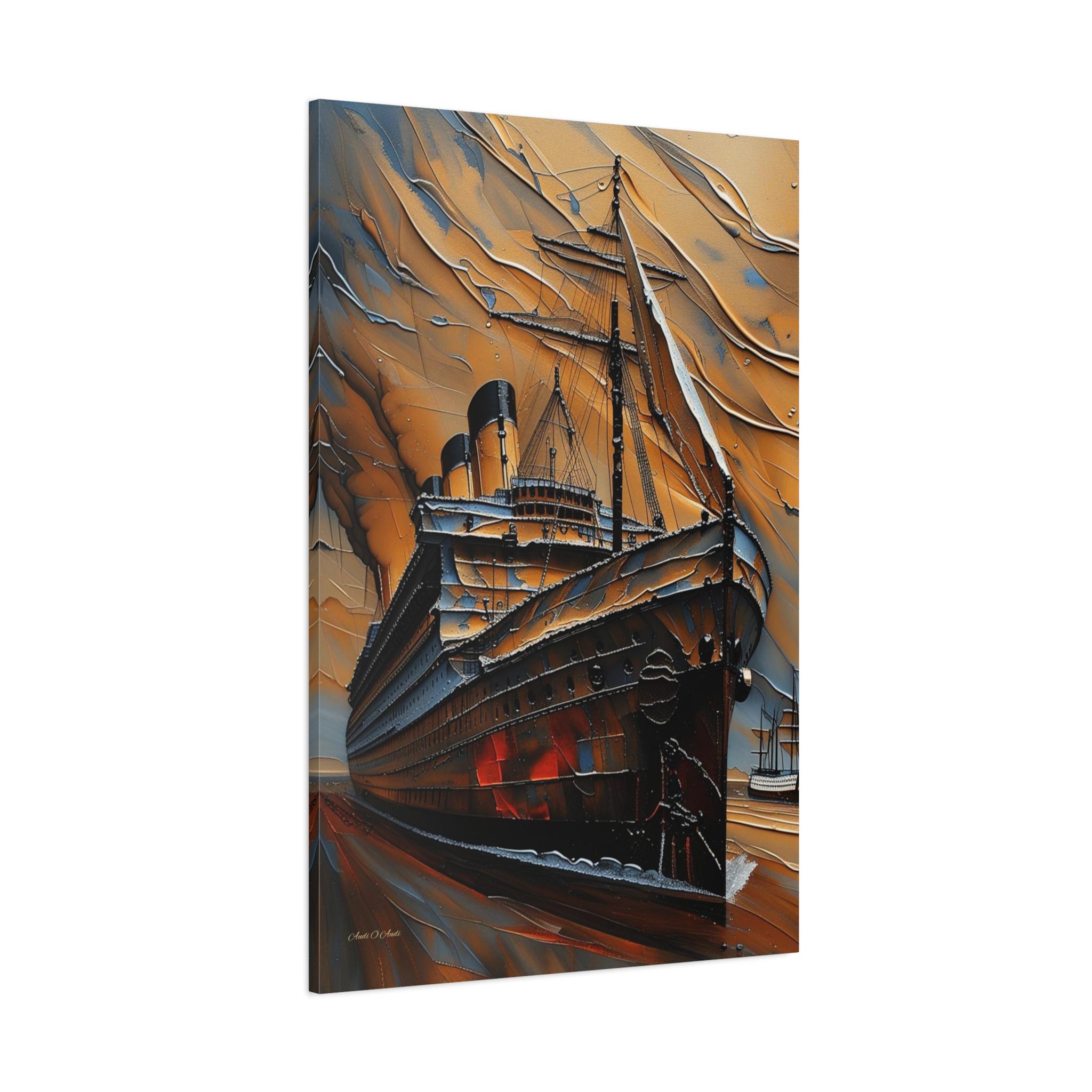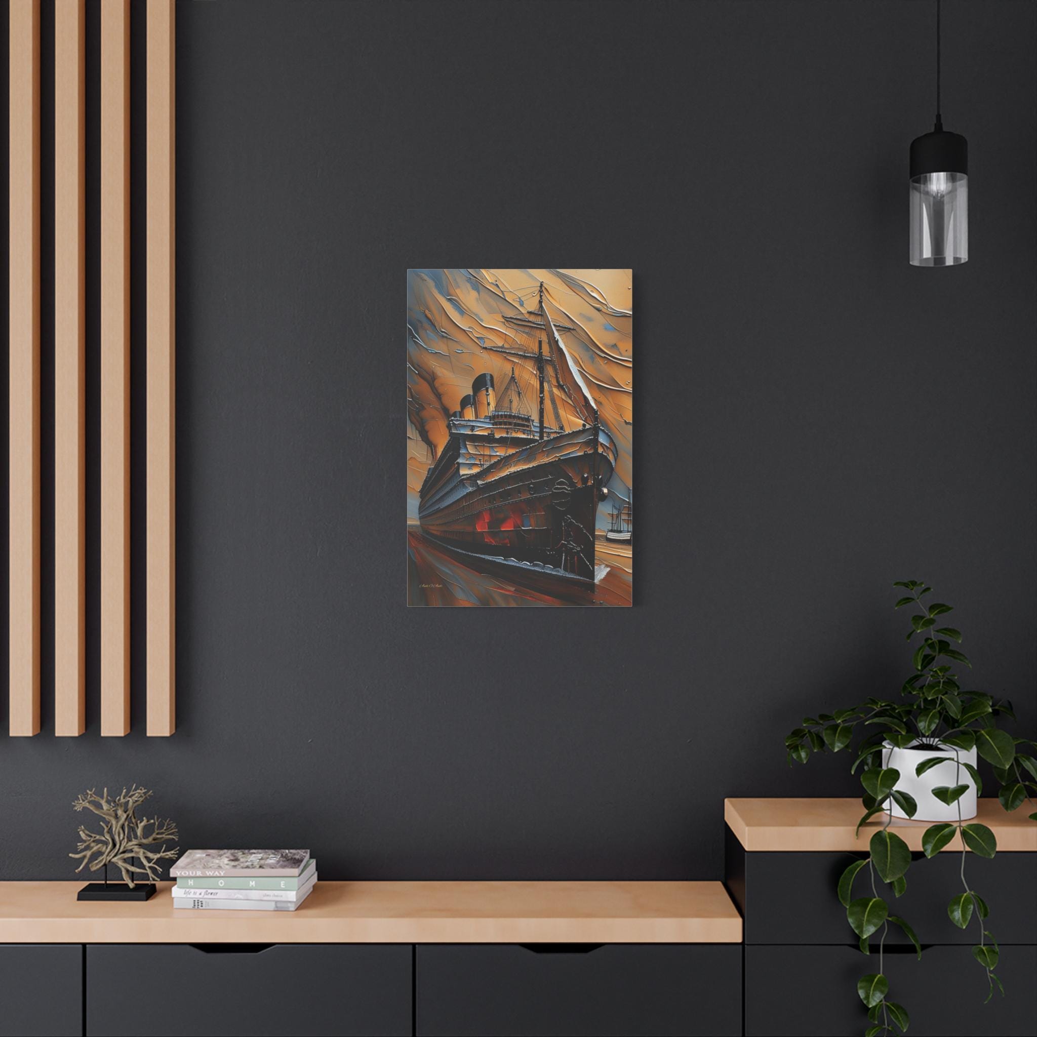 Capture the grandeur and dramatic history of the great era of ocean travel with this unique canvas print, "Voyage of the Sunken King." This painting portrays a majestic ship, likely the Titanic or a similar liner, rendered in an intense, highly textural style against a fiery, turbulent sky.