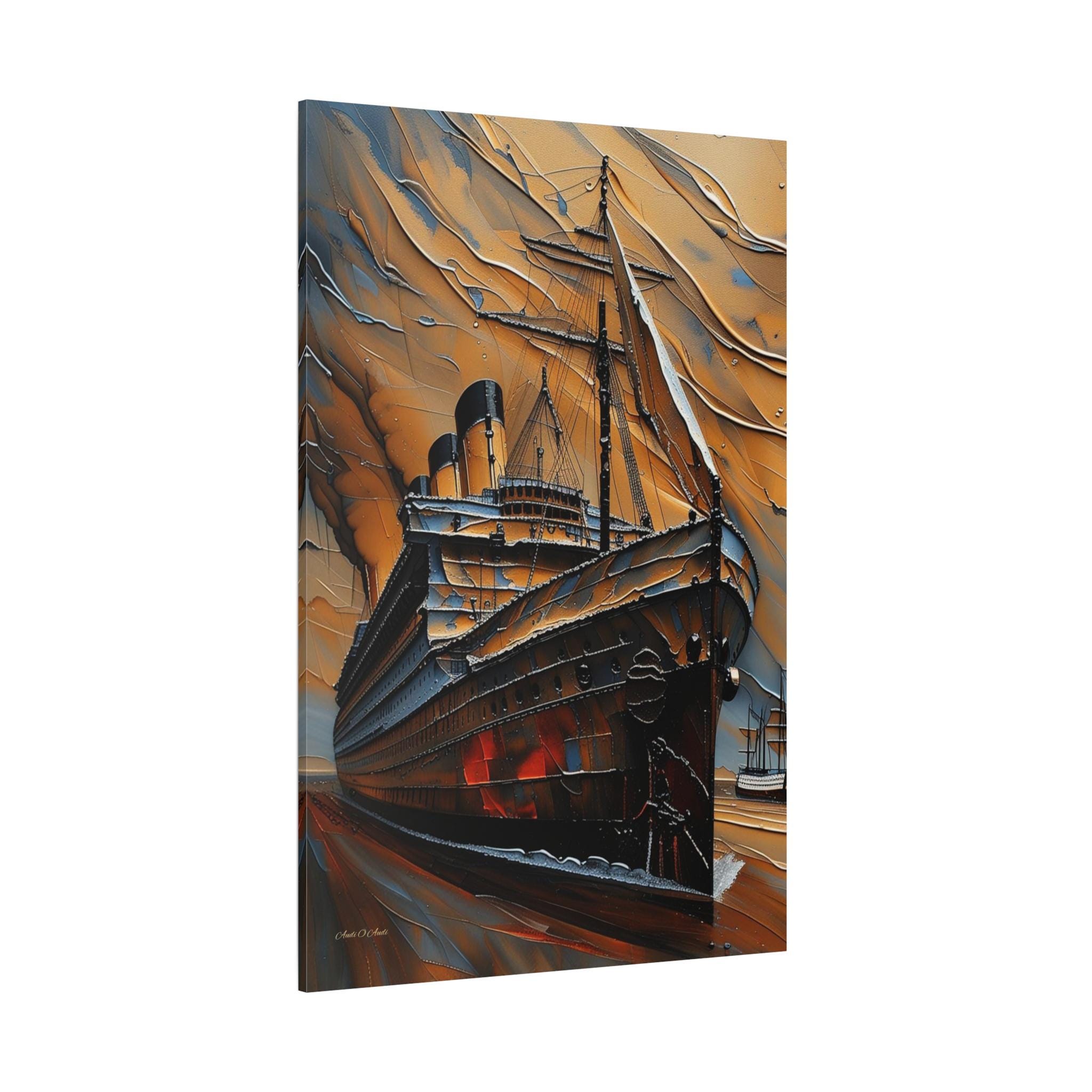 Grand Subject: The ship is depicted in a monumental, low-angle perspective that emphasizes its immense scale and power as it cuts through the water. The combination of classic design and abstract texture gives the piece a timeless yet contemporary feel.