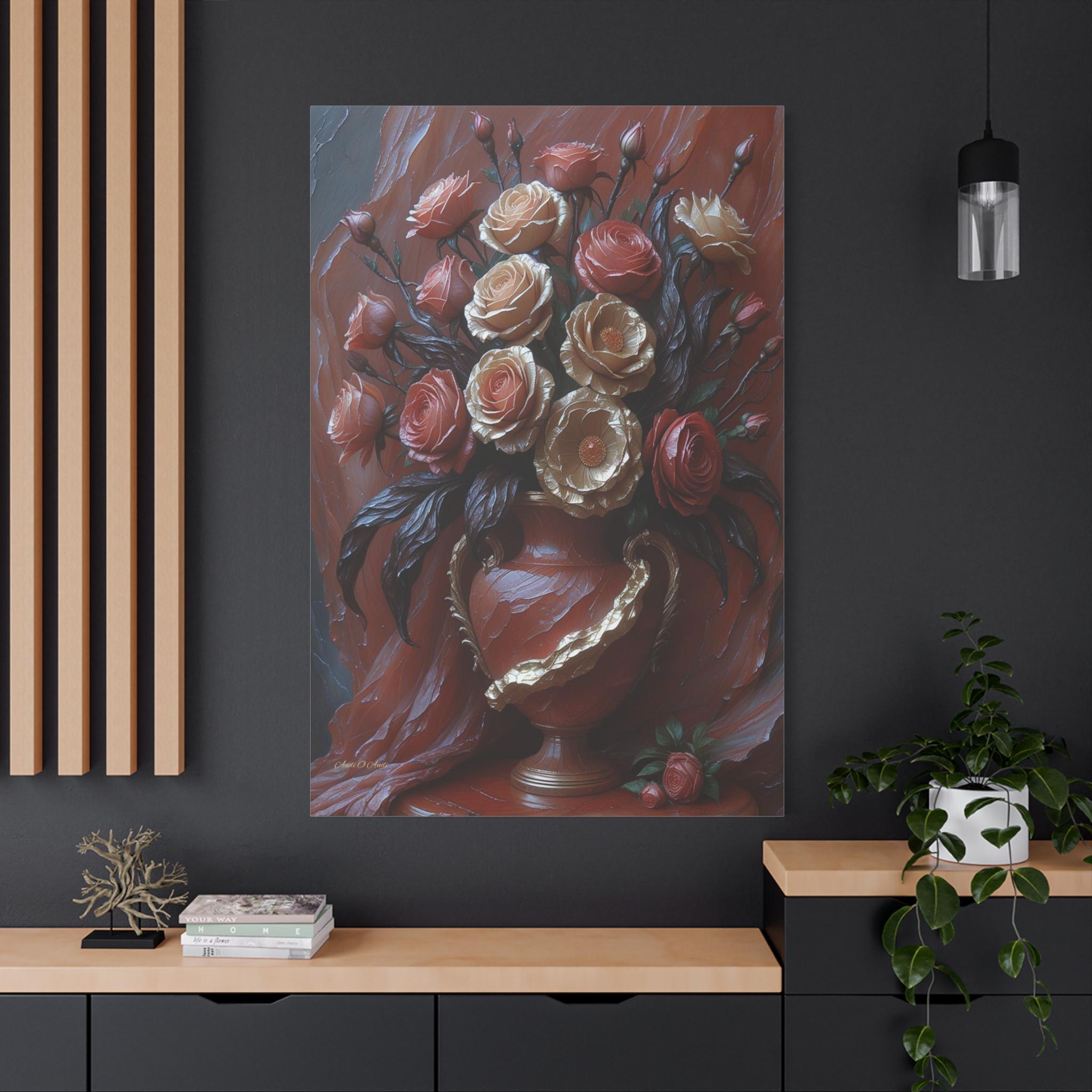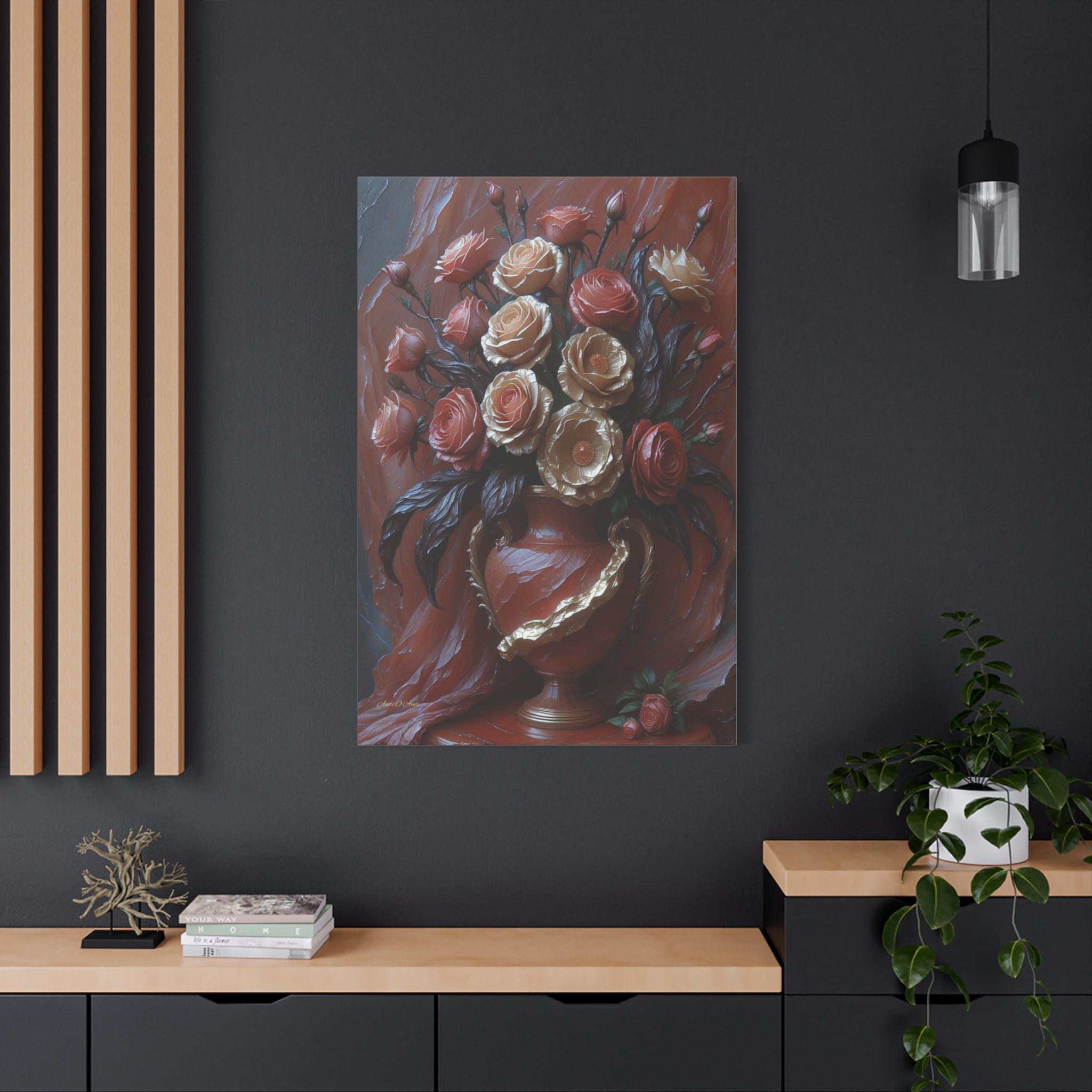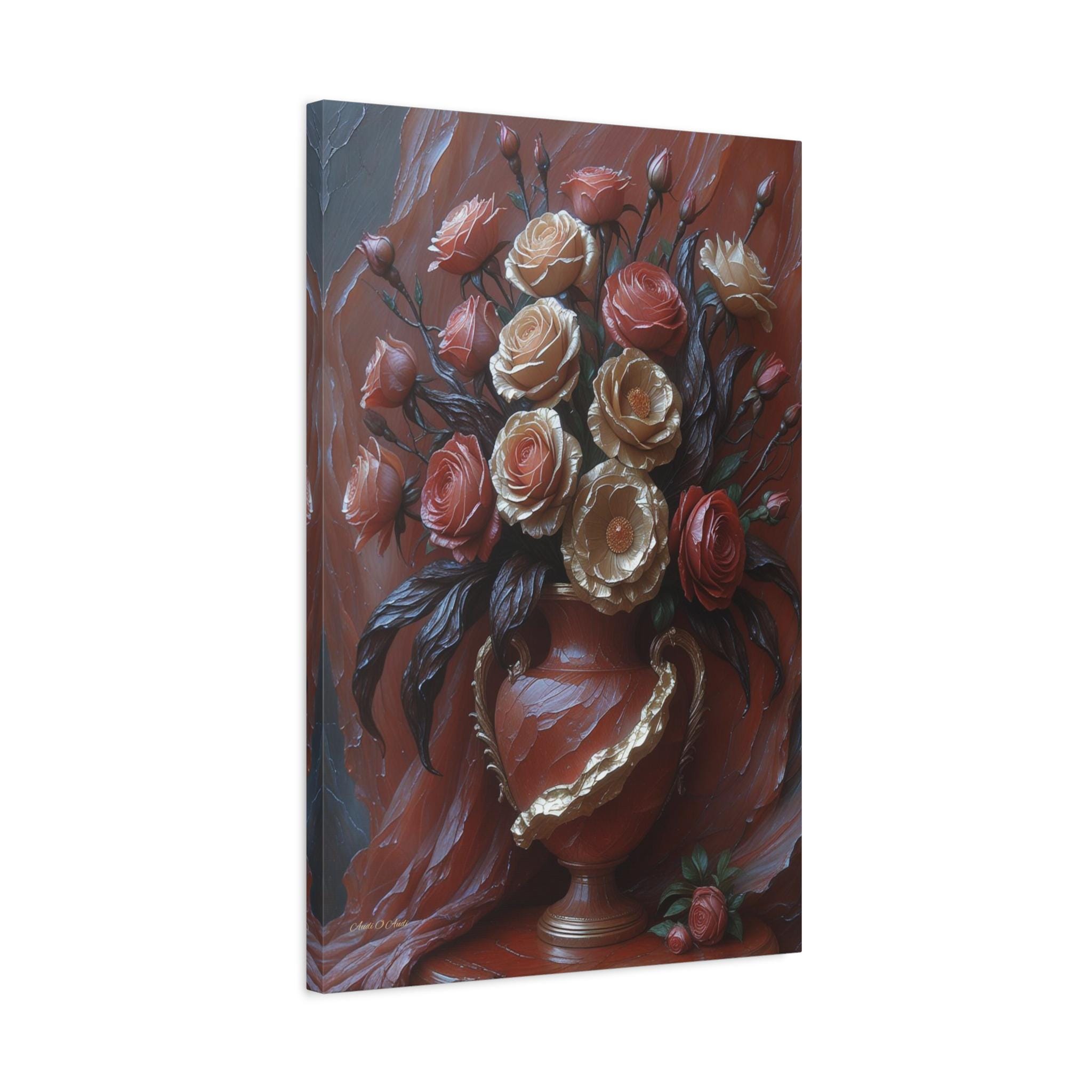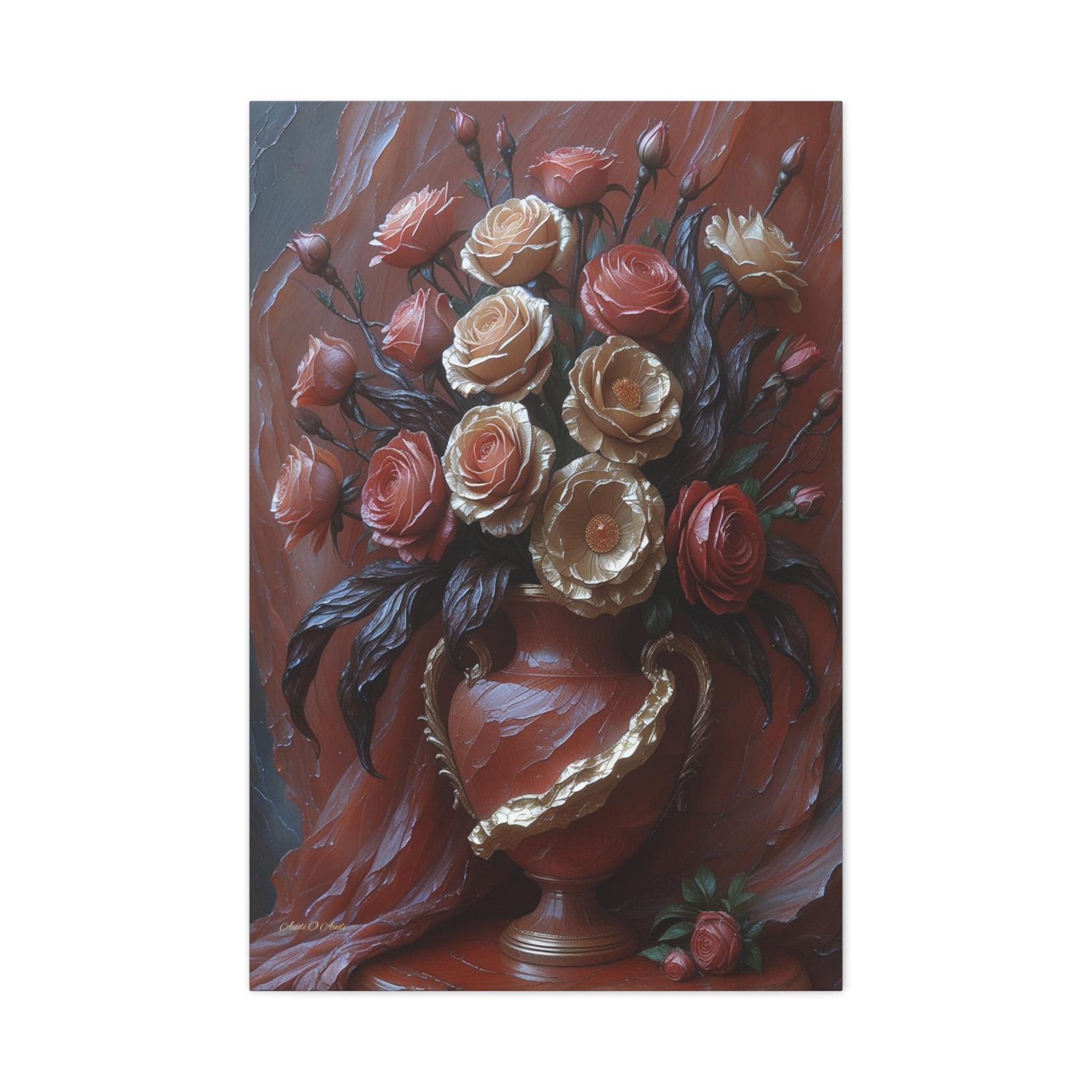 Adorn your space with the timeless elegance and dramatic texture of this magnificent canvas print, "Velvet & Gold Blooms." This artwork presents a luxurious bouquet of sculptural roses overflowing from an ornate vase, all set against a rich, deeply textured crimson drapery.