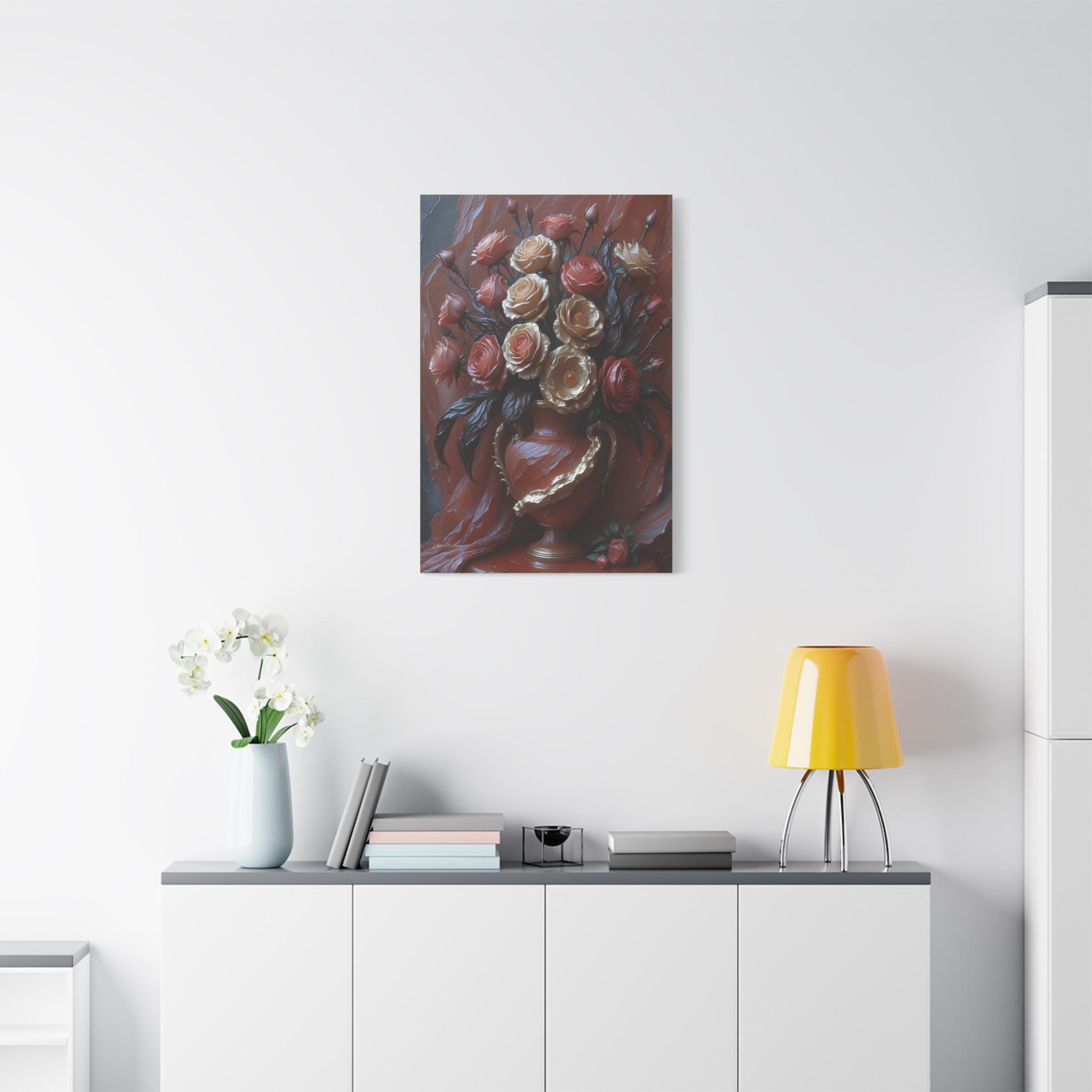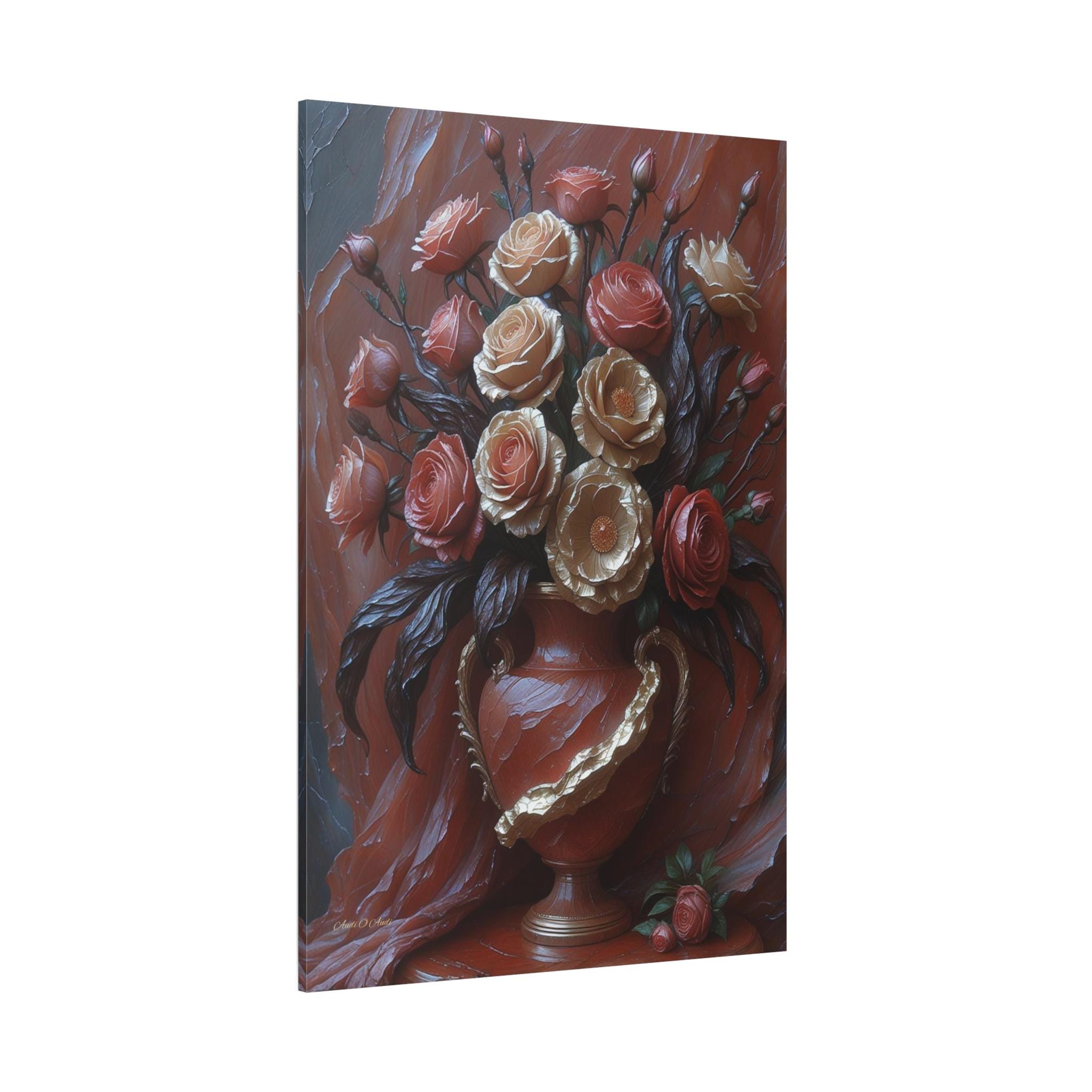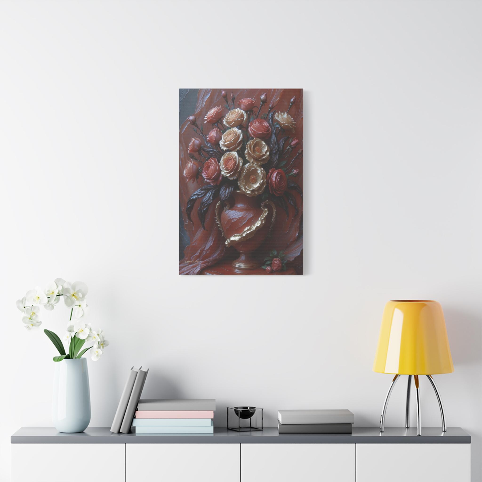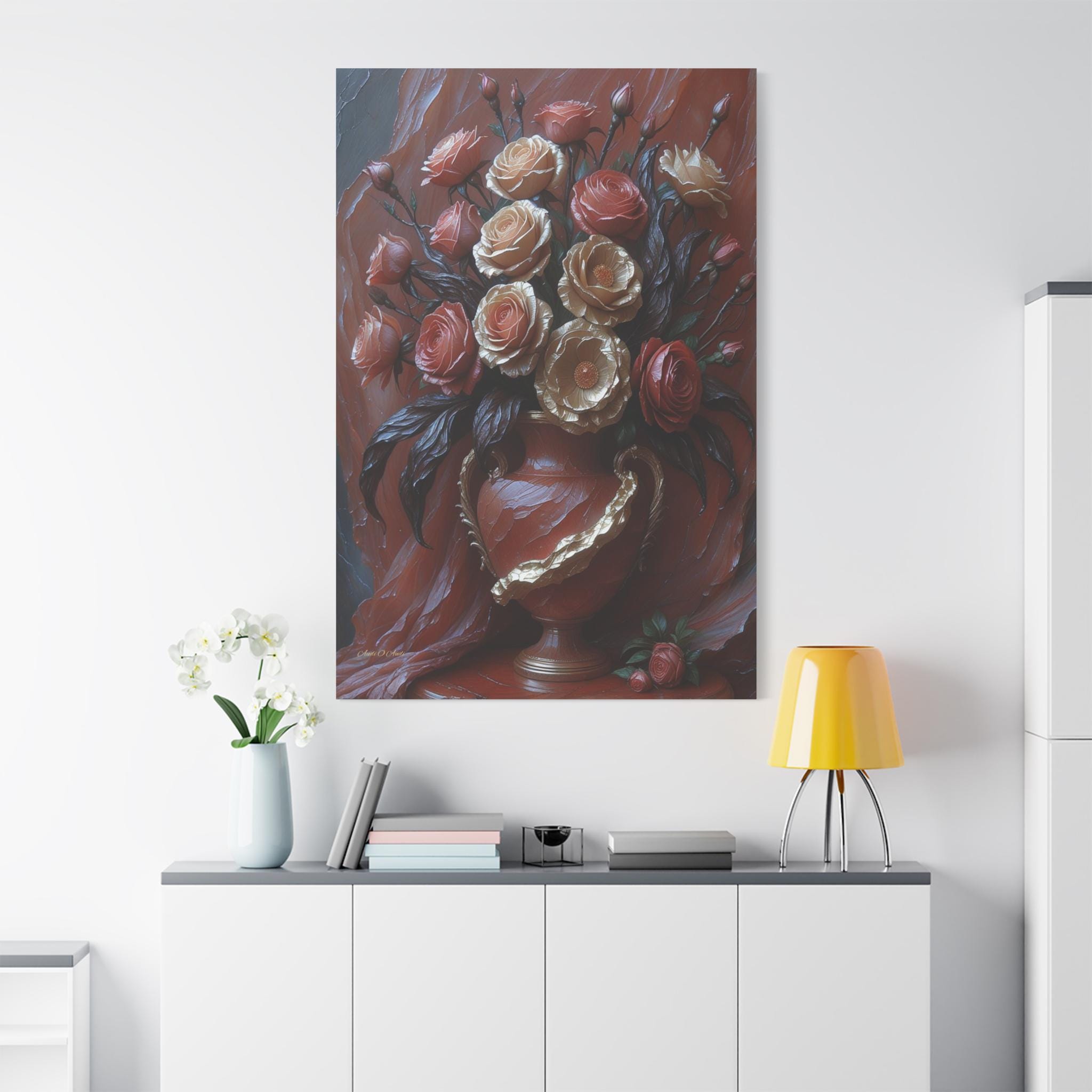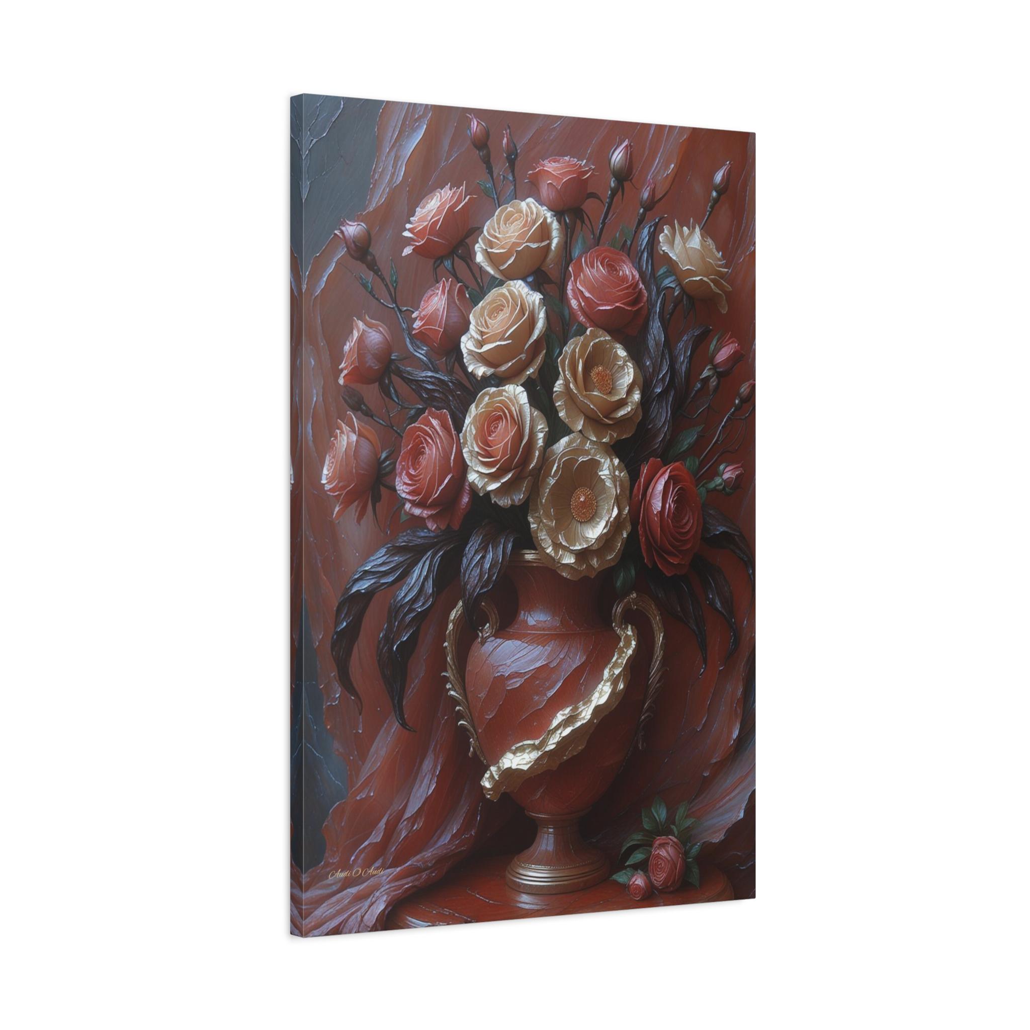 Adorn your space with the timeless elegance and dramatic texture of this magnificent canvas print, "Velvet & Gold Blooms." This artwork presents a luxurious bouquet of sculptural roses overflowing from an ornate vase, all set against a rich, deeply textured crimson drapery.