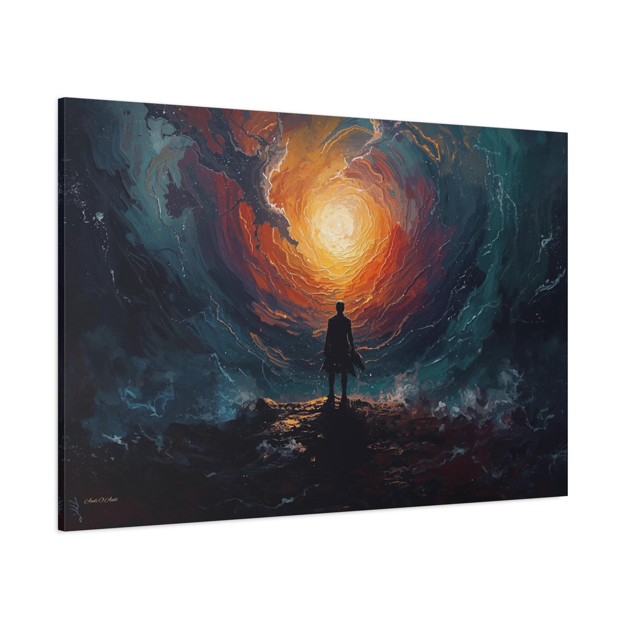 Make an unforgettable, powerful statement with this breathtaking canvas print, "Edge of the Singularity." This artwork captures a solitary figure standing at the brink of a vast cosmic or elemental vortex, illuminated by a brilliant, fiery orange sun or portal. It is a piece that evokes themes of courage, destiny, the unknown, and the immensity of the universe.
