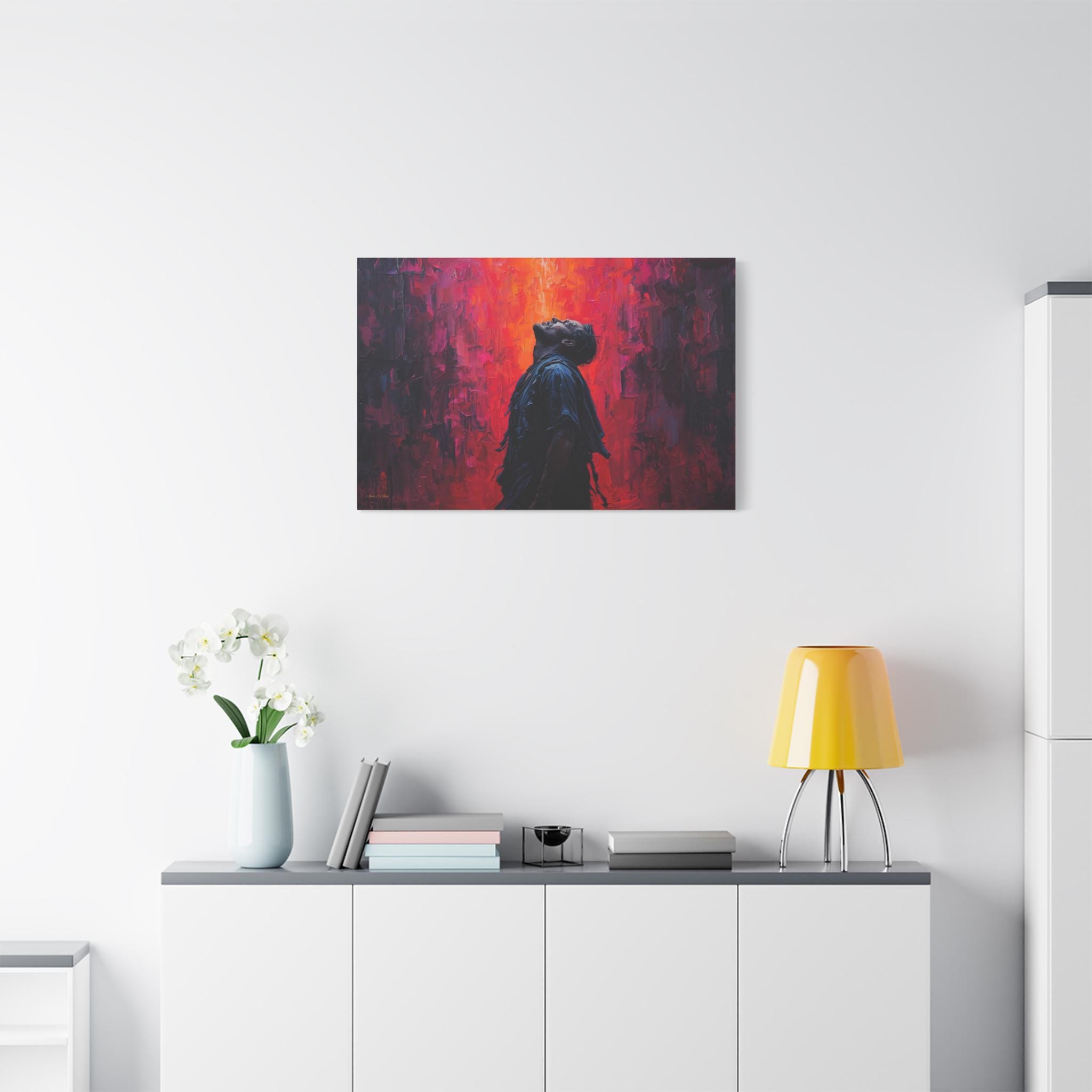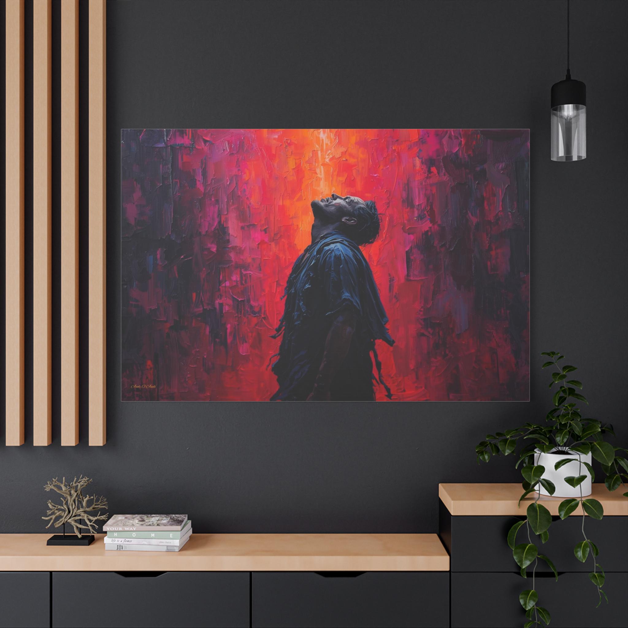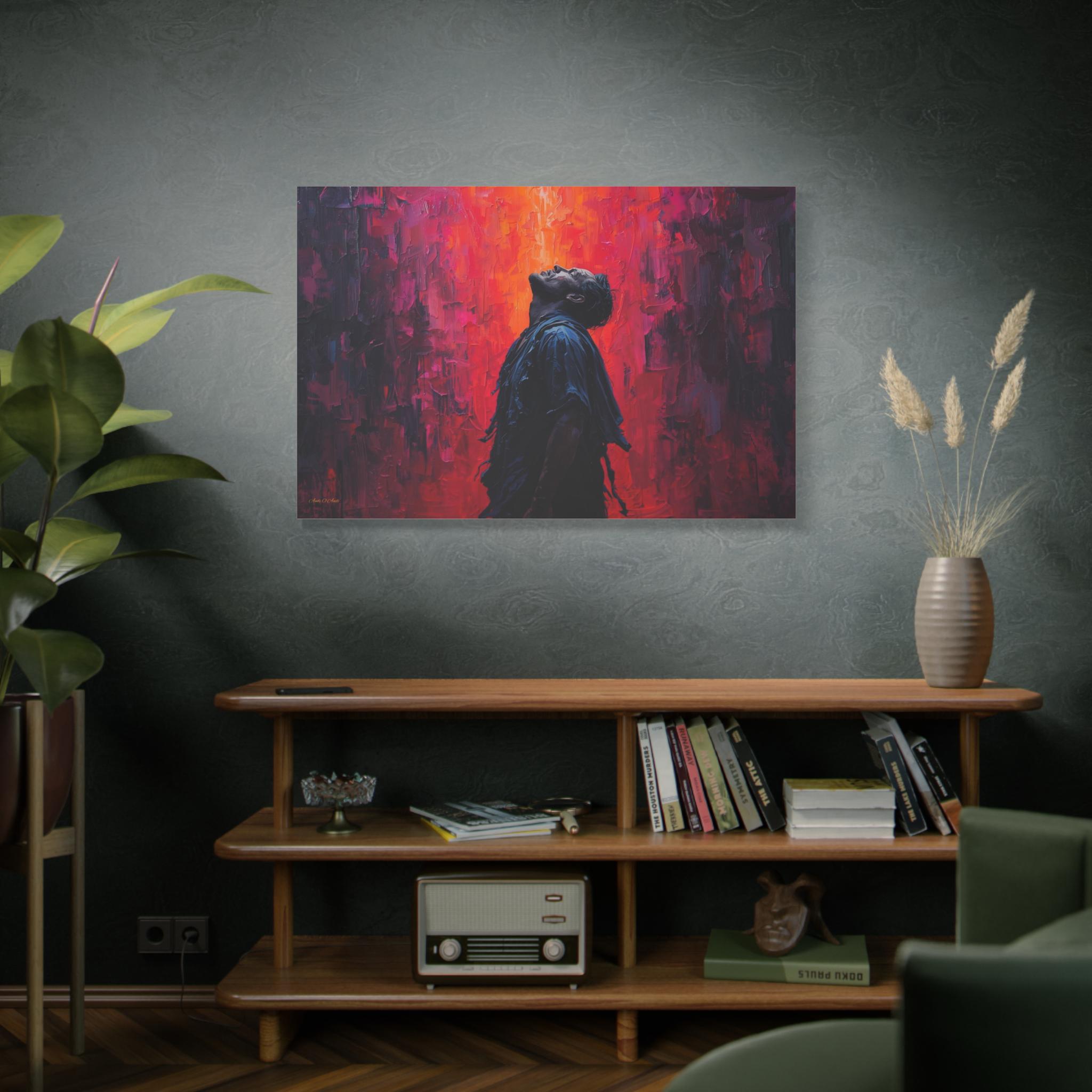 Unleash dramatic energy into your space with this breathtaking canvas print, "Apotheosis in Crimson." This artwork features a solitary figure caught in a moment of emotional catharsis, illuminated by a fierce backdrop of textured, fiery color.