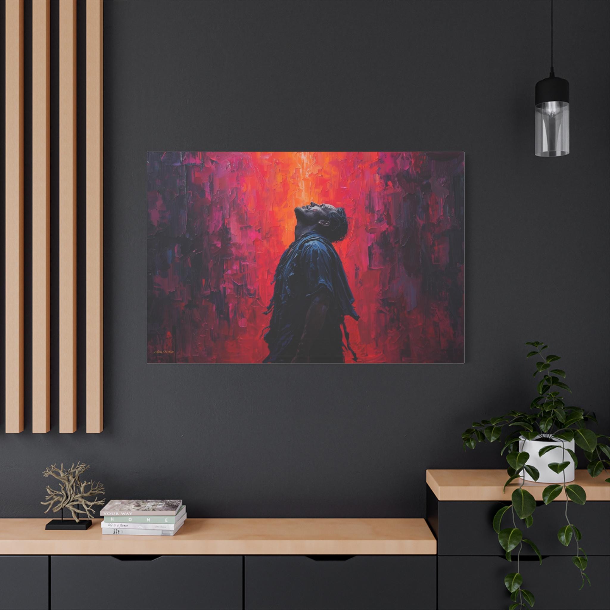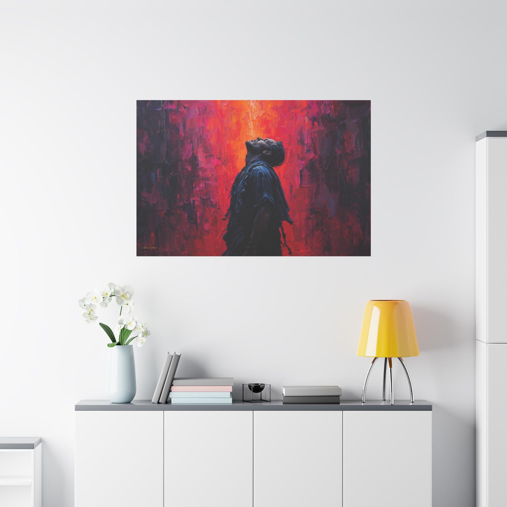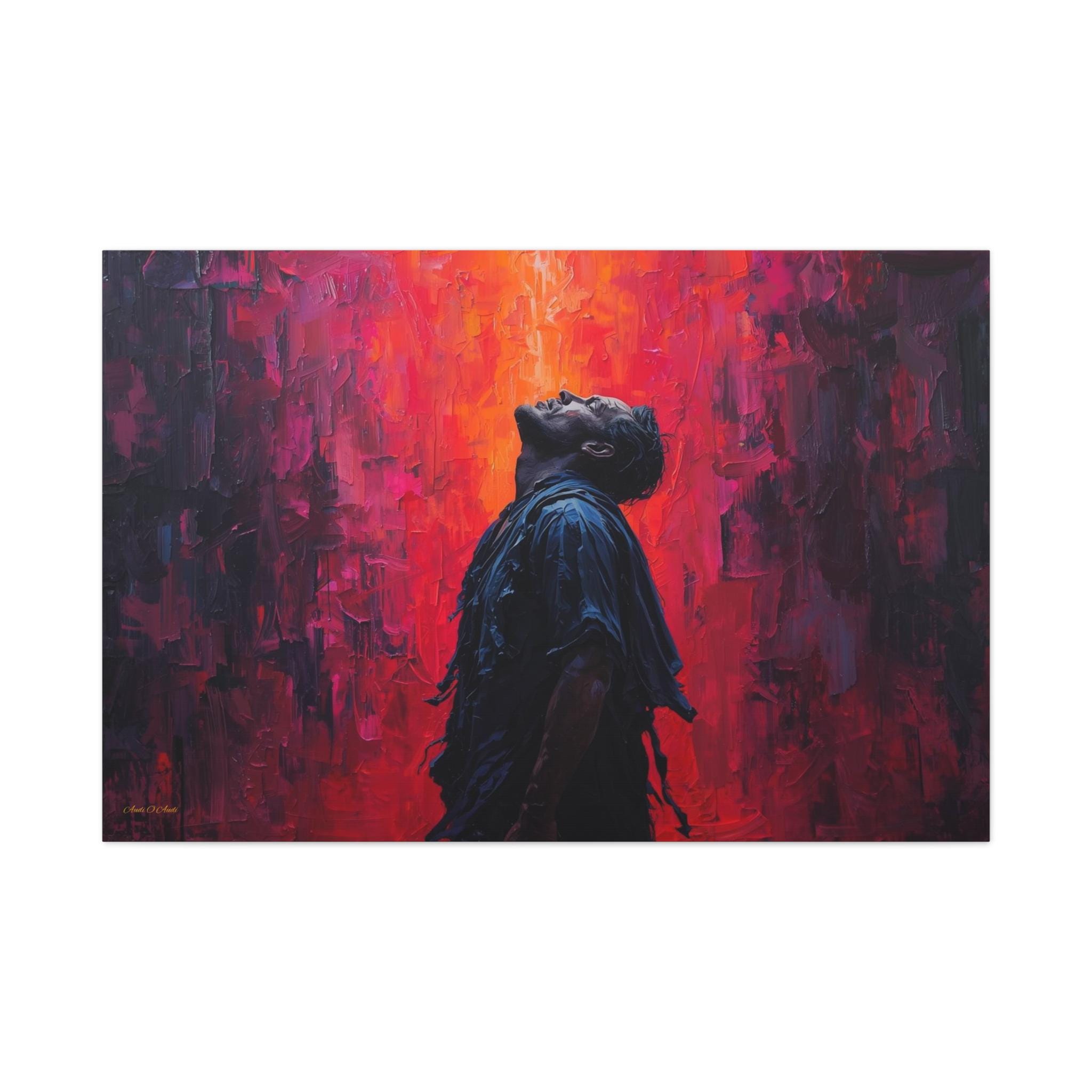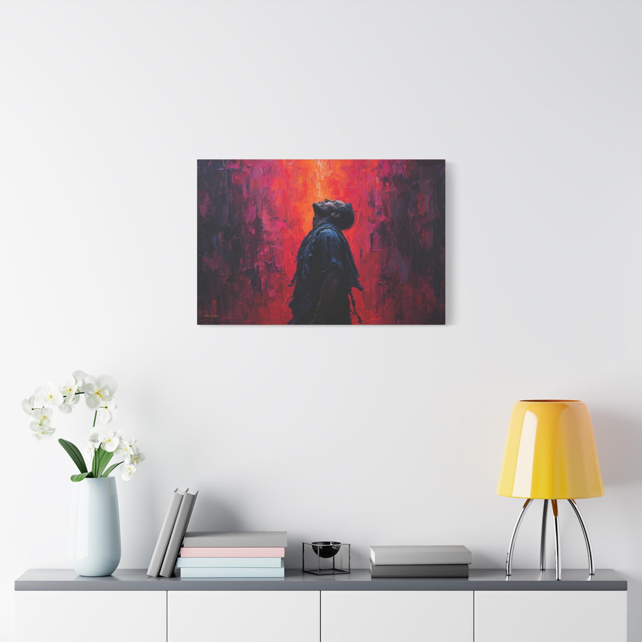 Unleash dramatic energy into your space with this breathtaking canvas print, "Apotheosis in Crimson." This artwork features a solitary figure caught in a moment of emotional catharsis, illuminated by a fierce backdrop of textured, fiery color.