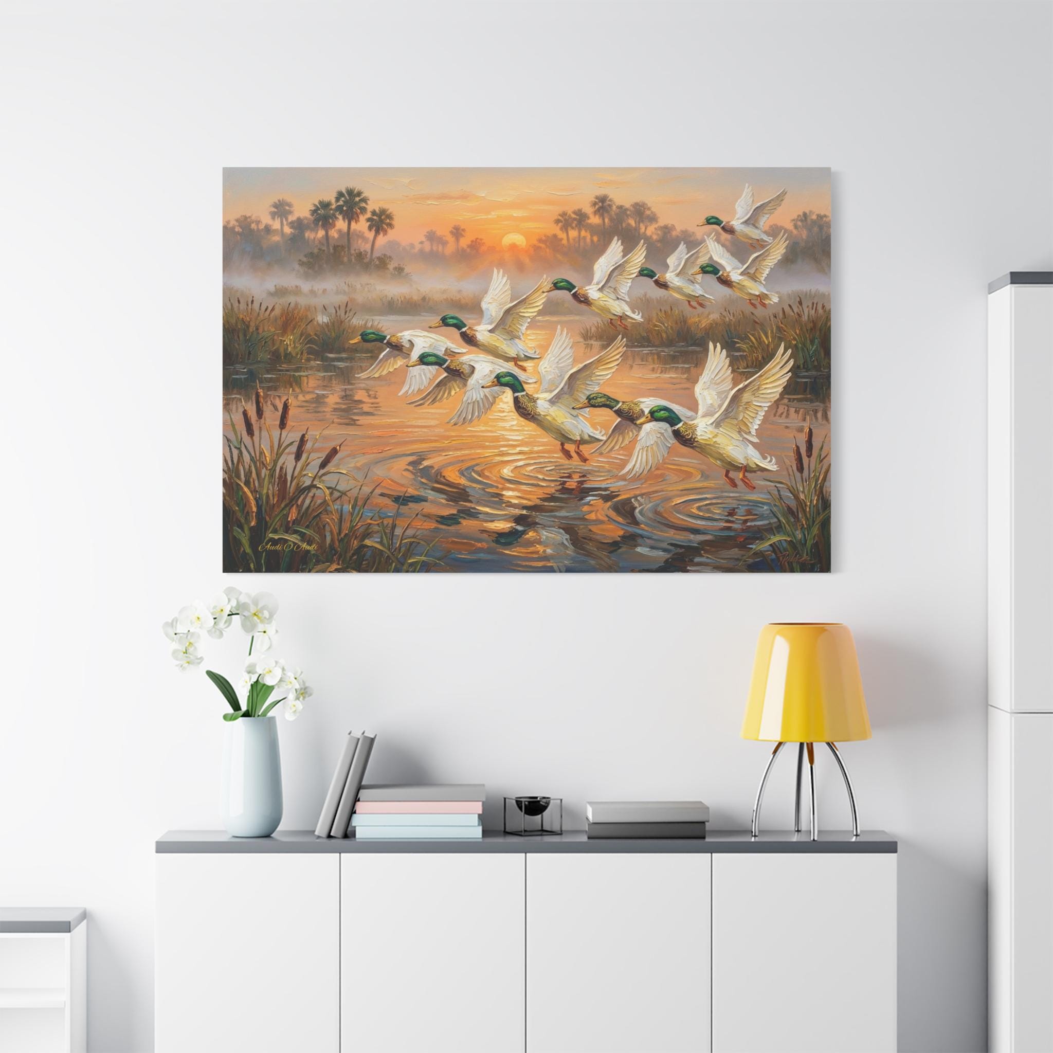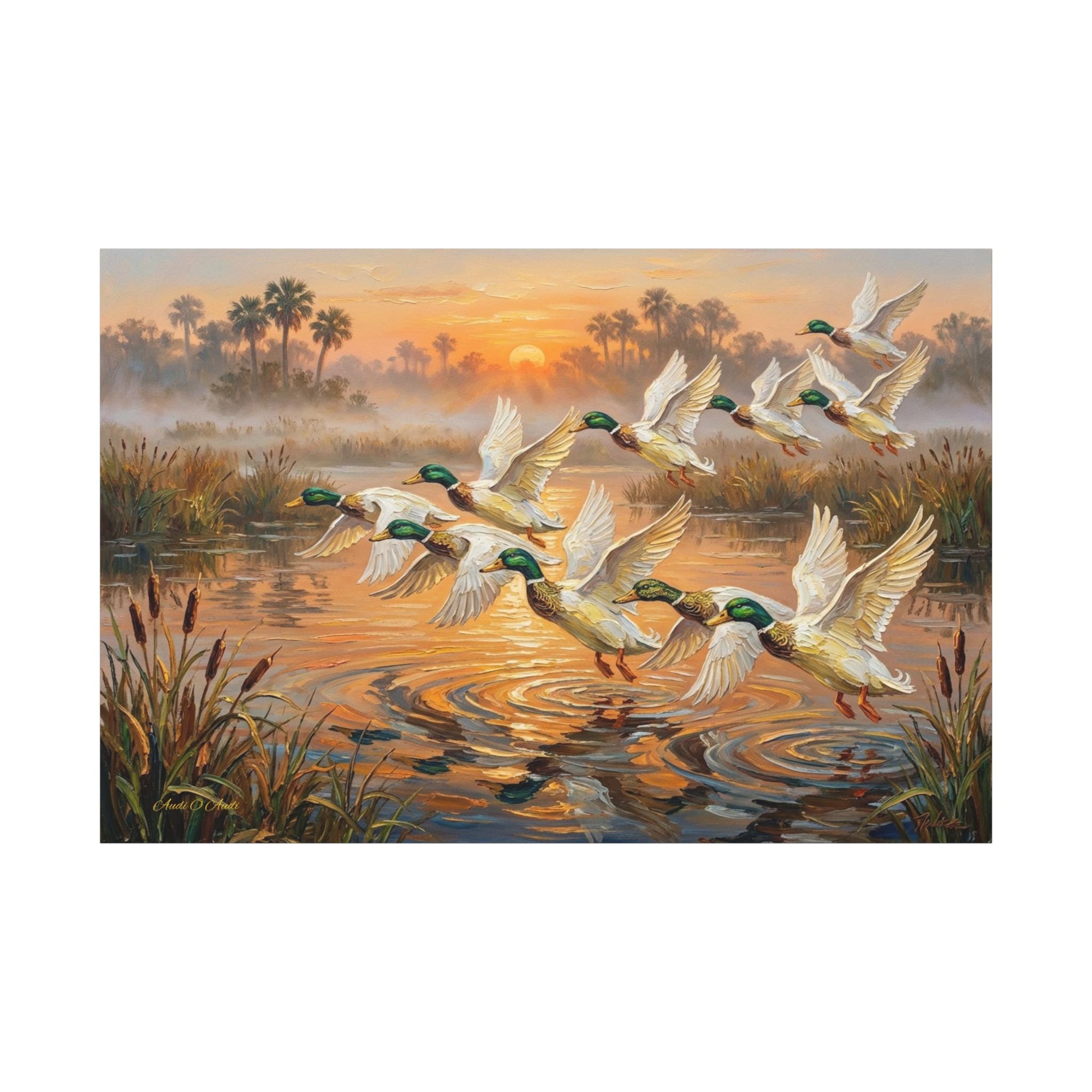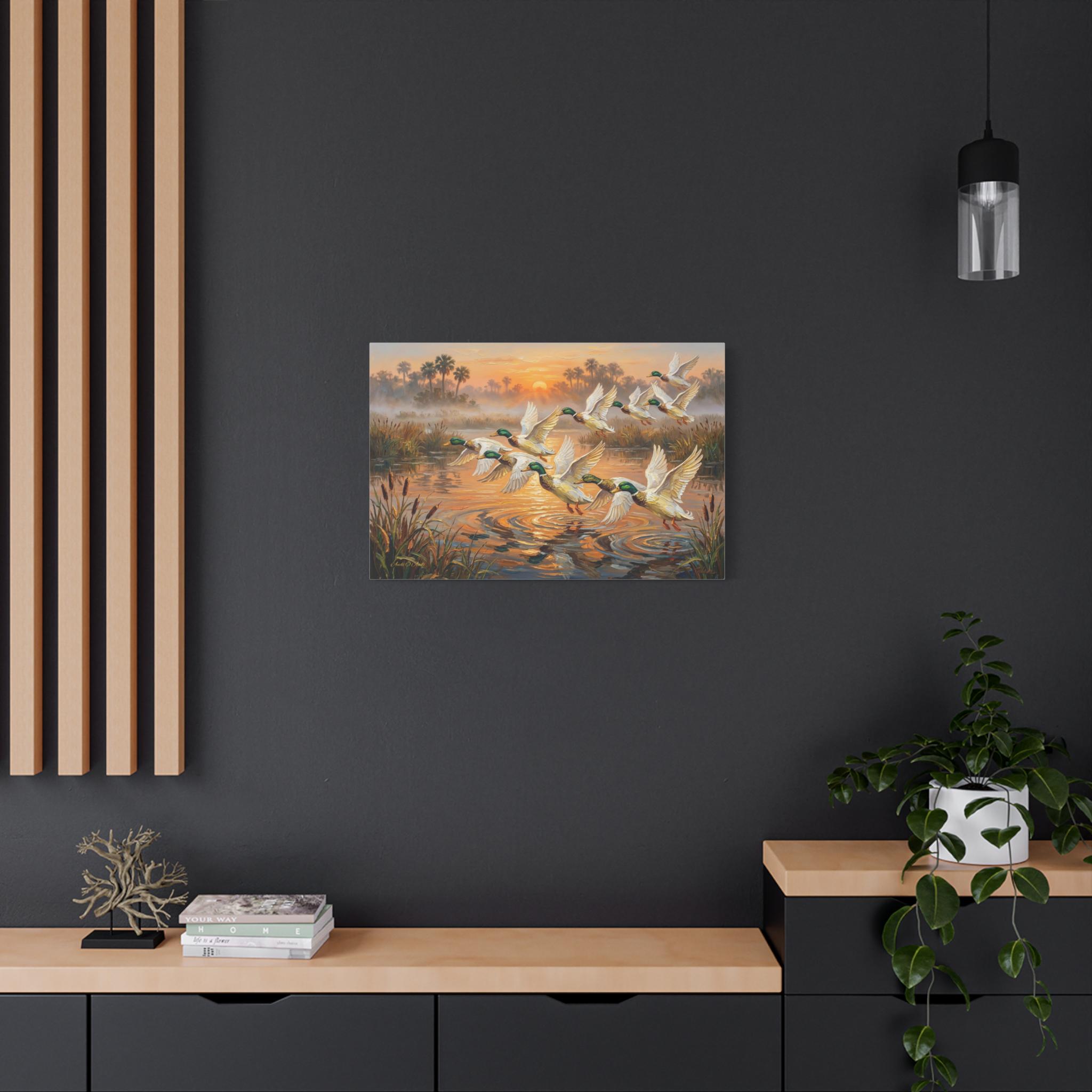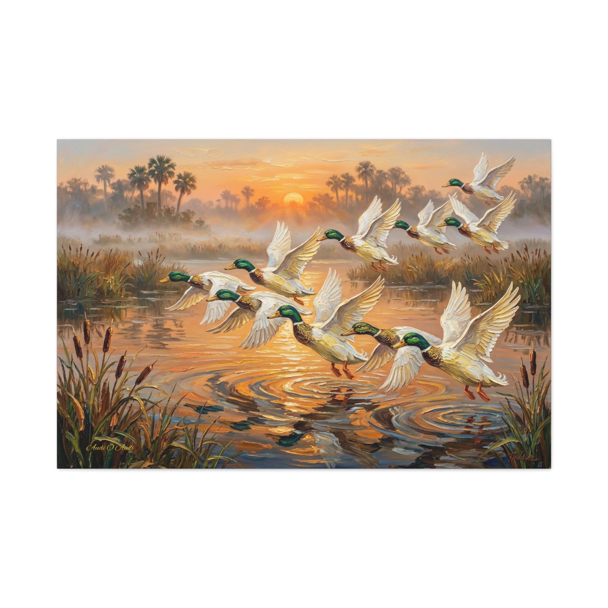 Bring the peaceful yet exhilarating moment of a marsh sunrise into your home with this stunning canvas print, "Coastal Dawn Flight." This expressive oil painting captures a flock of magnificent mallard ducks taking flight from misty waters, leaving shimmering ripples behind.