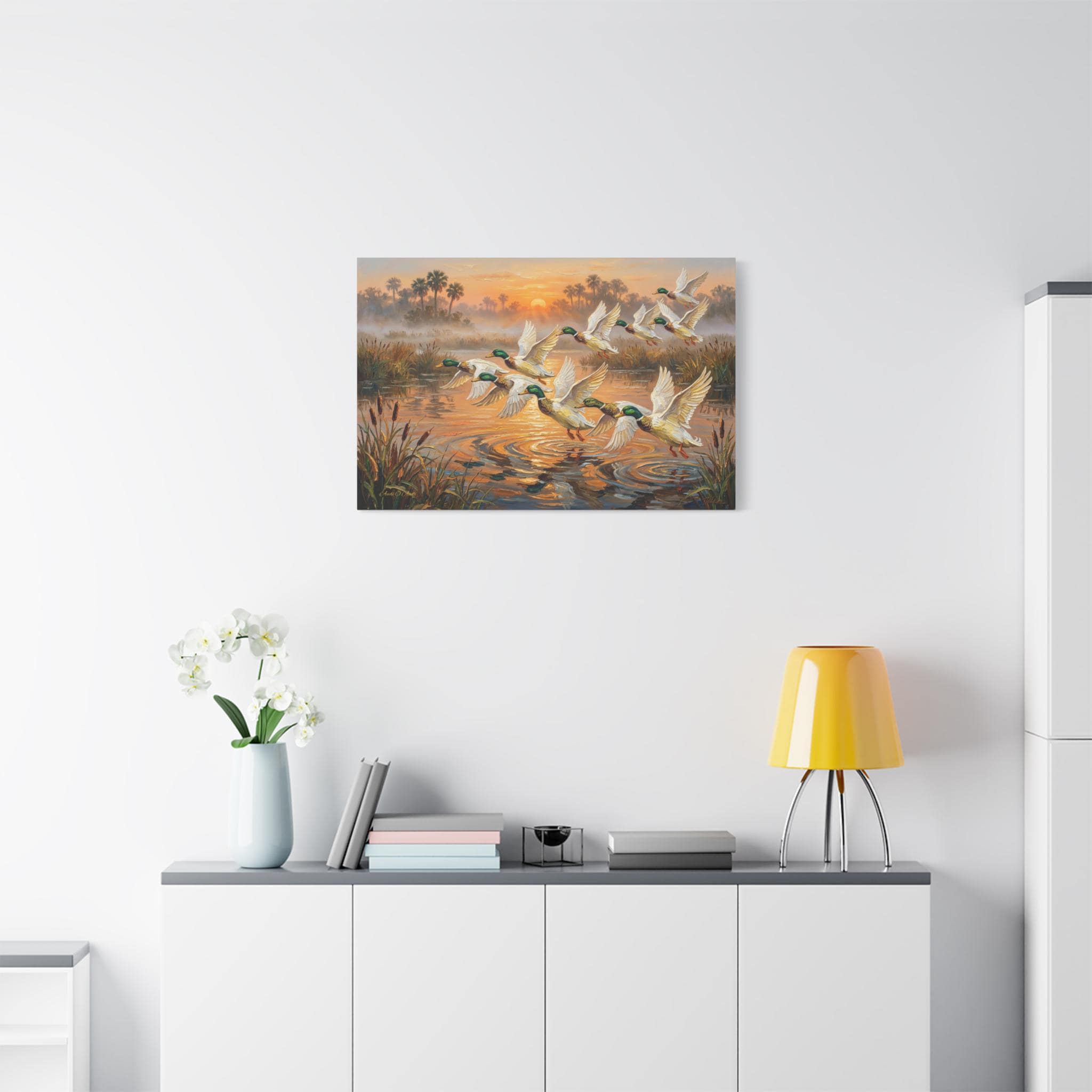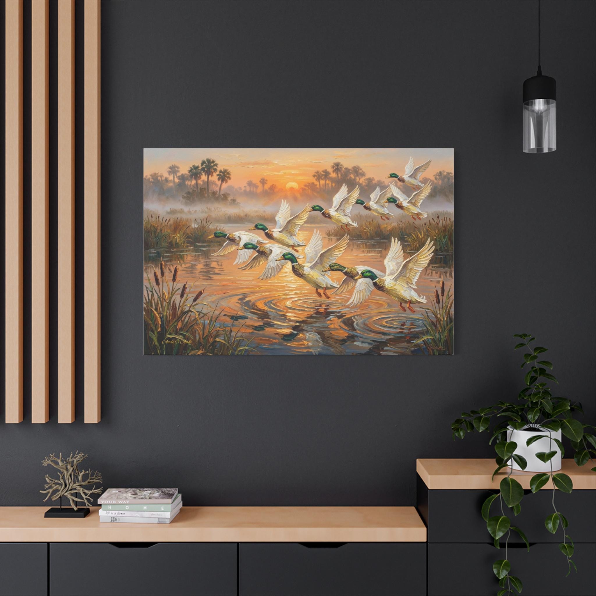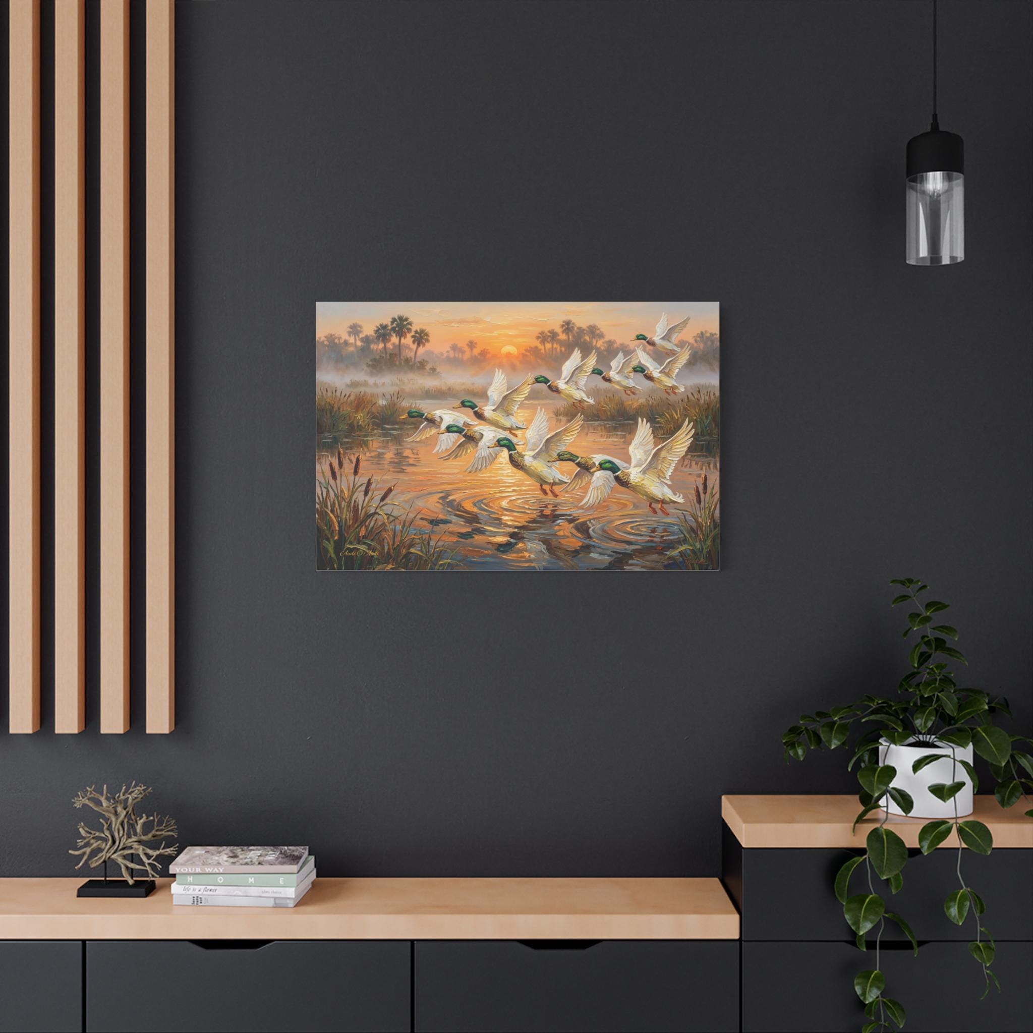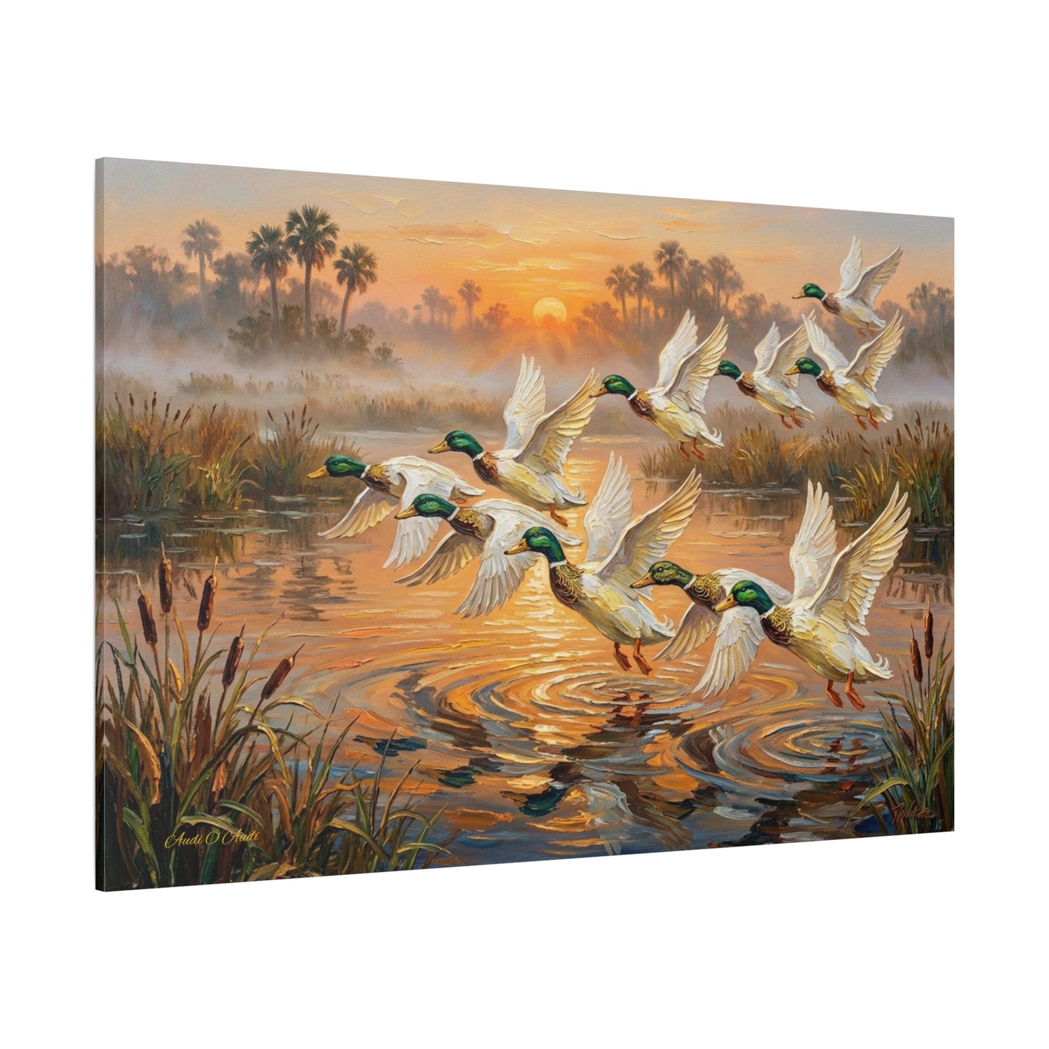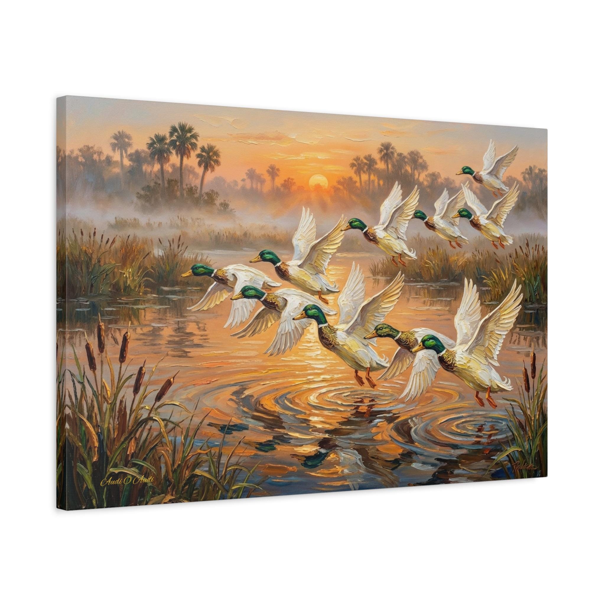 Bring the peaceful yet exhilarating moment of a marsh sunrise into your home with this stunning canvas print, "Coastal Dawn Flight." This expressive oil painting captures a flock of magnificent mallard ducks taking flight from misty waters, leaving shimmering ripples behind.