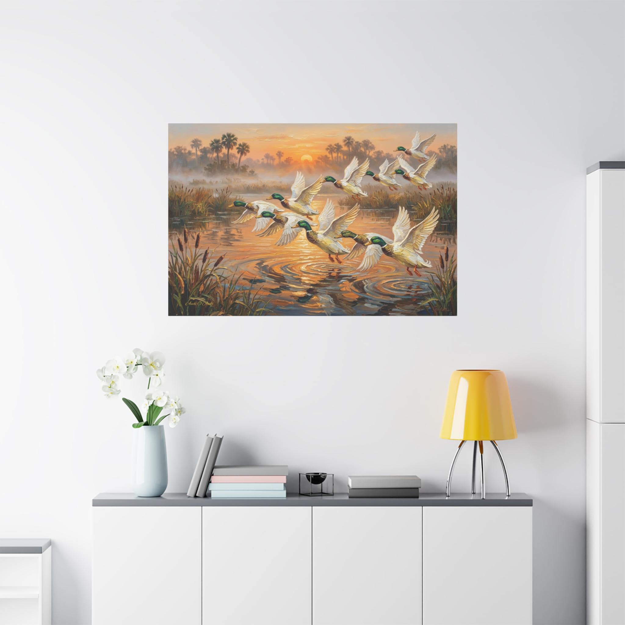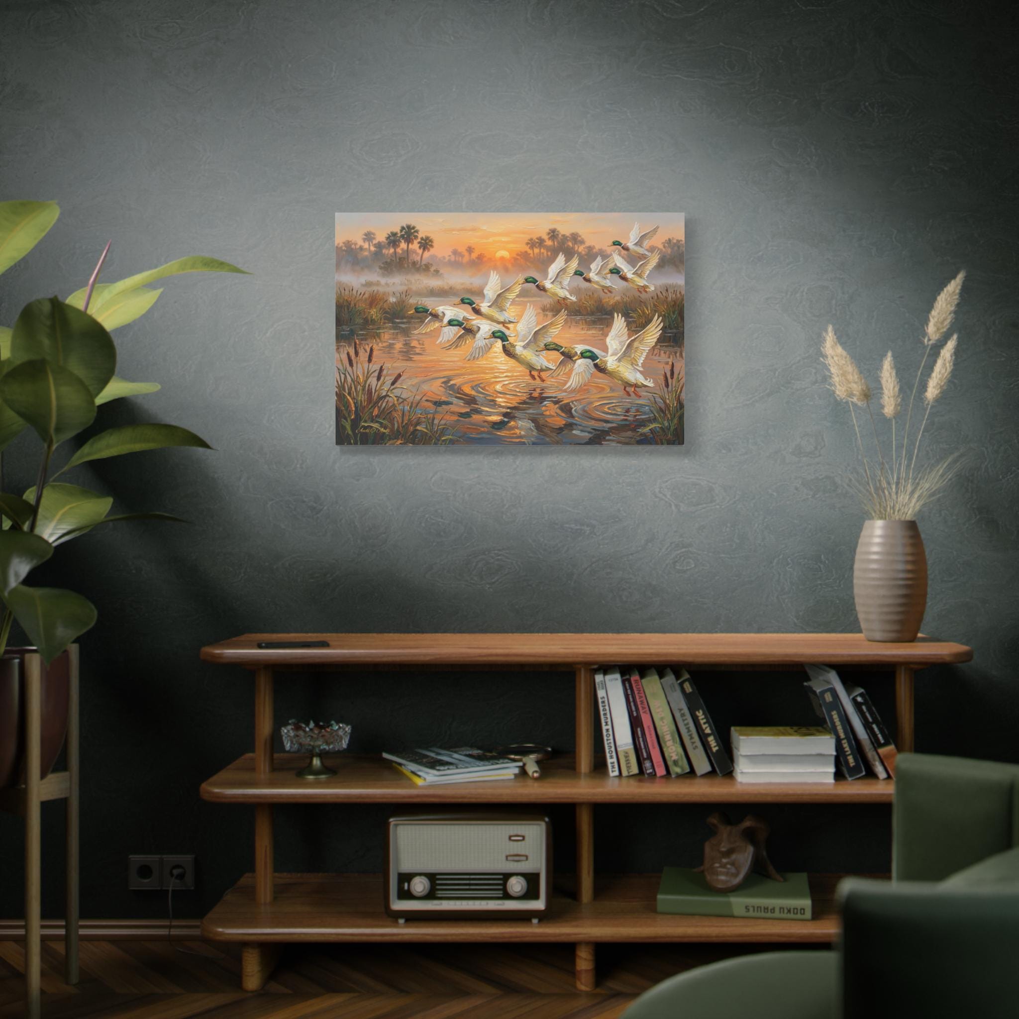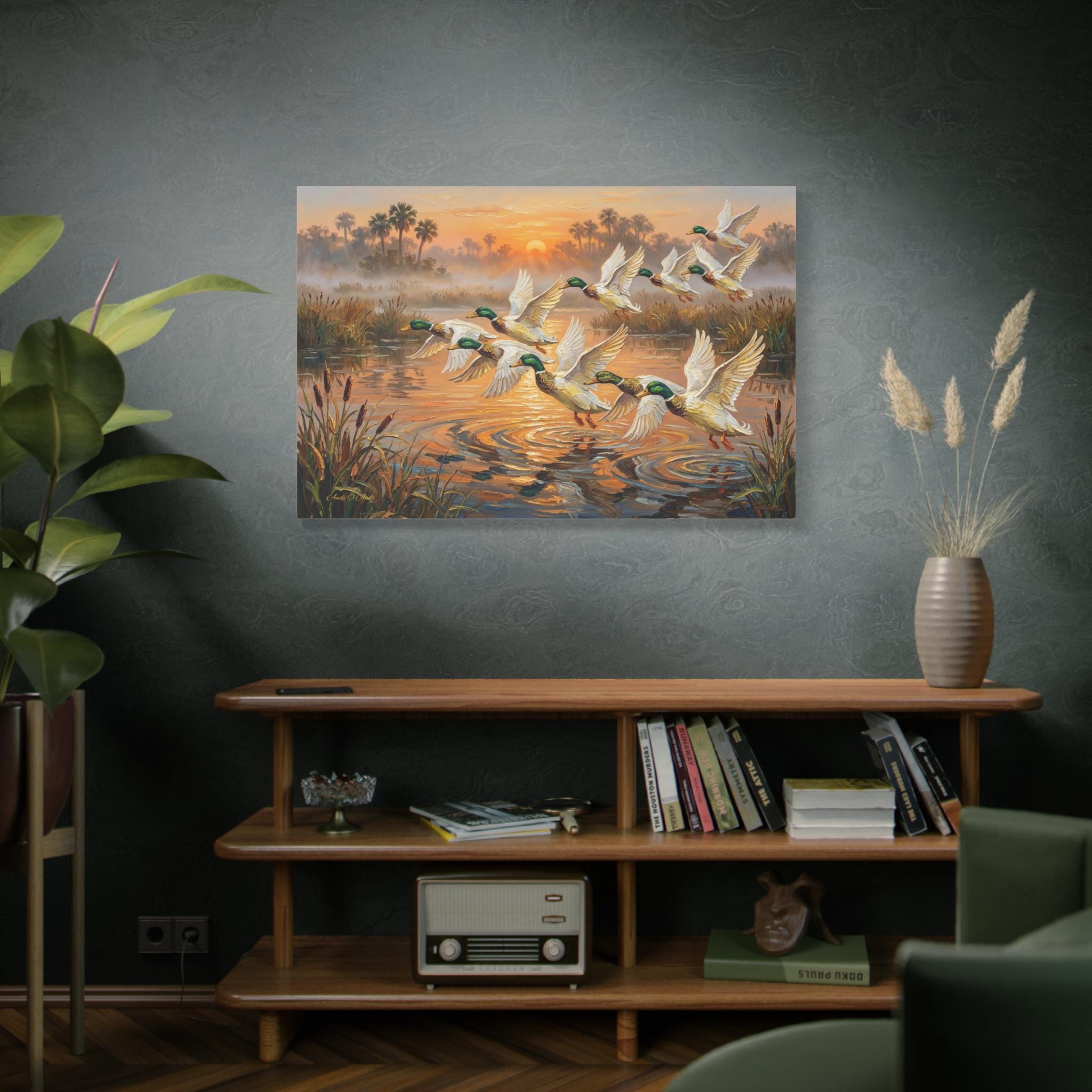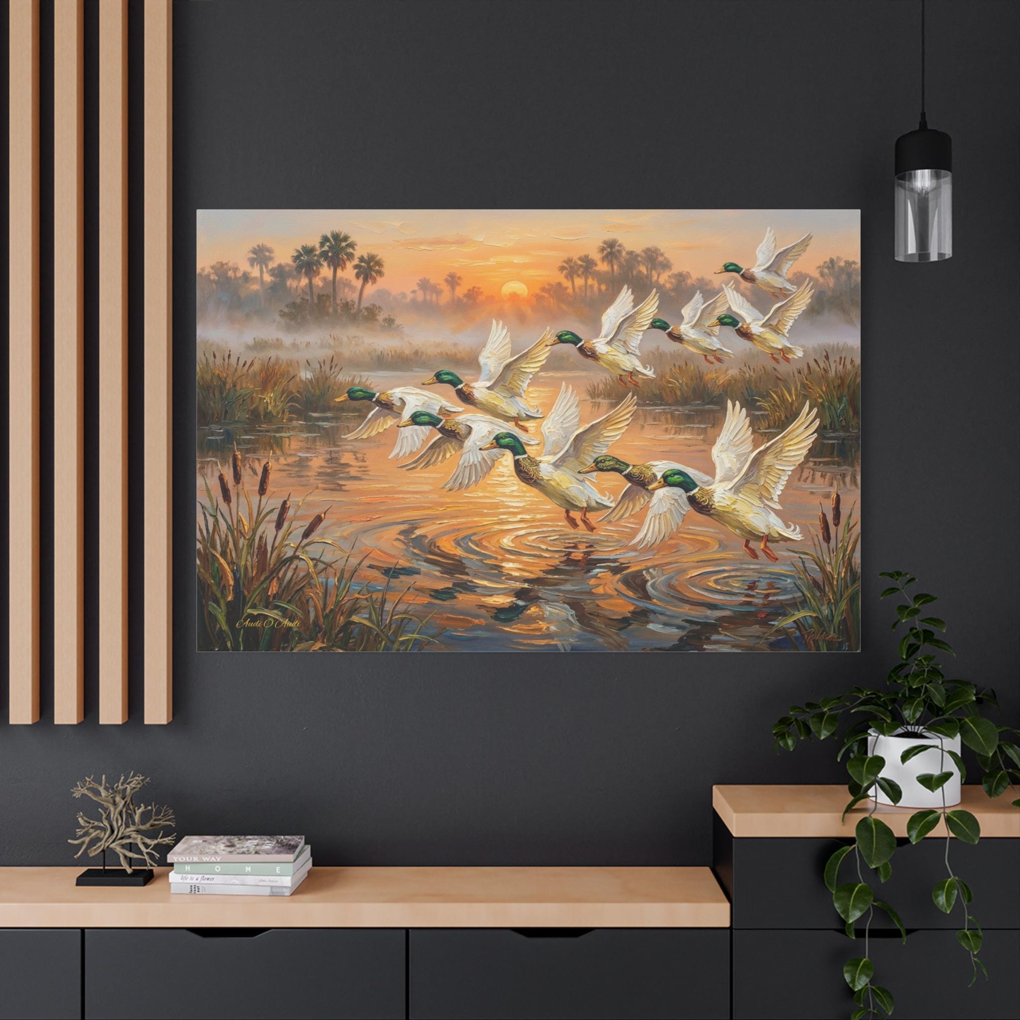 Bring the peaceful yet exhilarating moment of a marsh sunrise into your home with this stunning canvas print, "Coastal Dawn Flight." This expressive oil painting captures a flock of magnificent mallard ducks taking flight from misty waters, leaving shimmering ripples behind.
