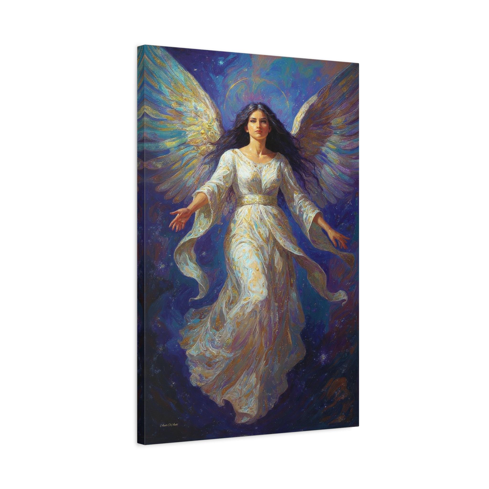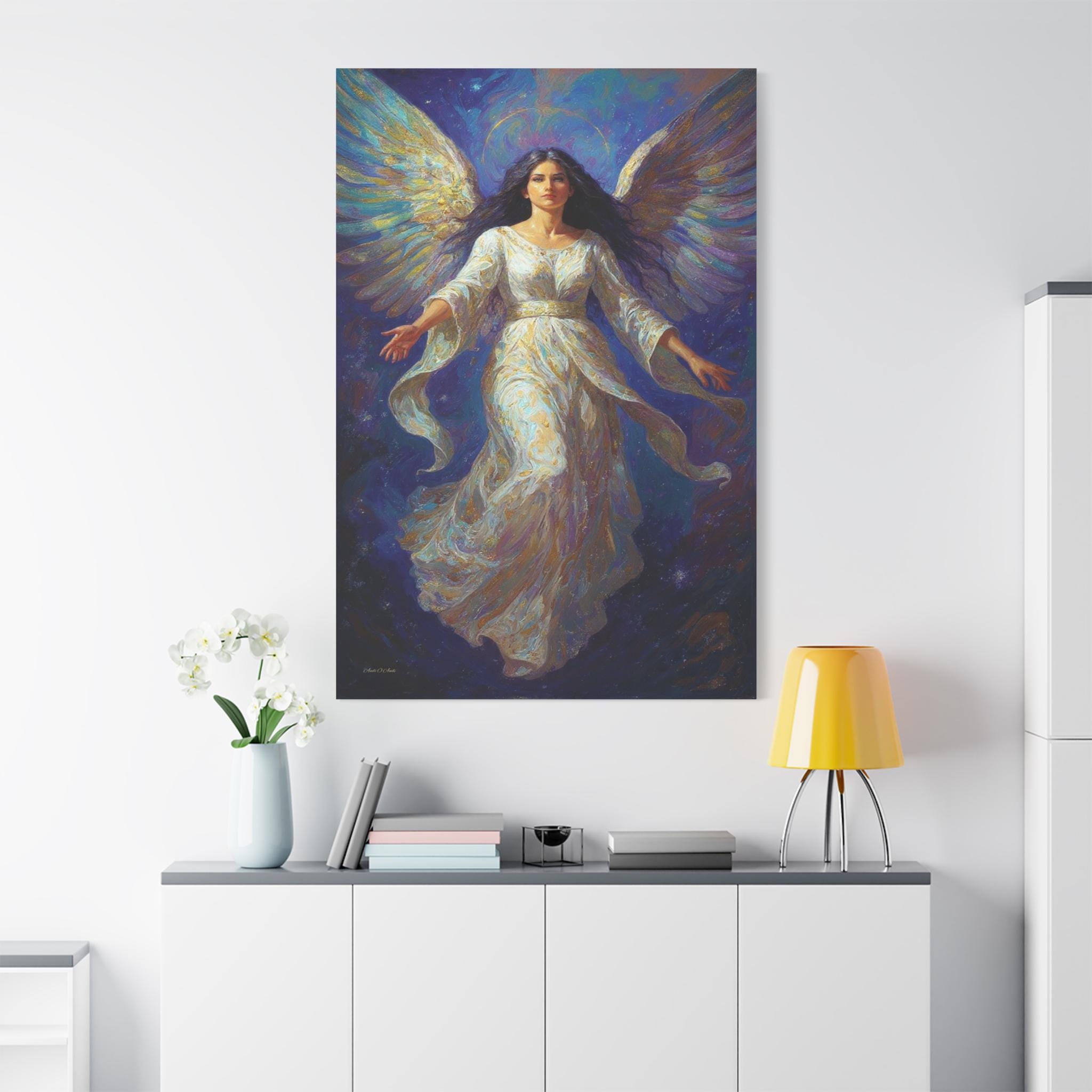Welcome the divine into your home with this breathtaking canvas print, "Archangel's Radiance." This magnificent painting features a radiant angel, wings spread wide, descending from a celestial, star-filled void. Rendered in a dynamic, expressive style, the artwork glows with an inner light, symbolizing peace, guidance, and divine protection.
