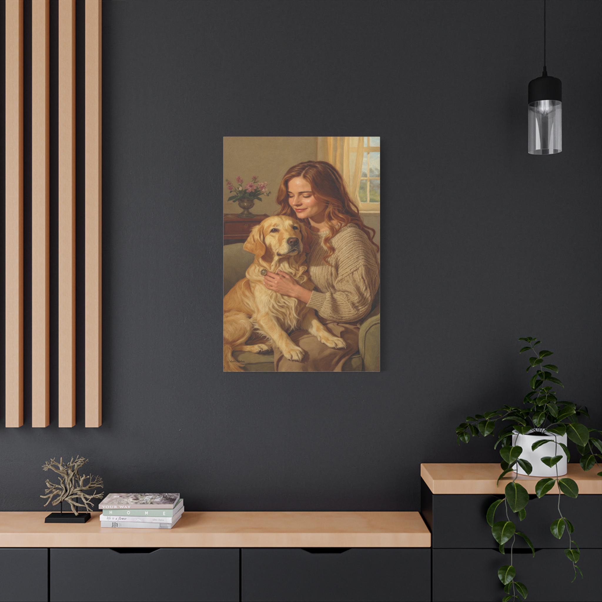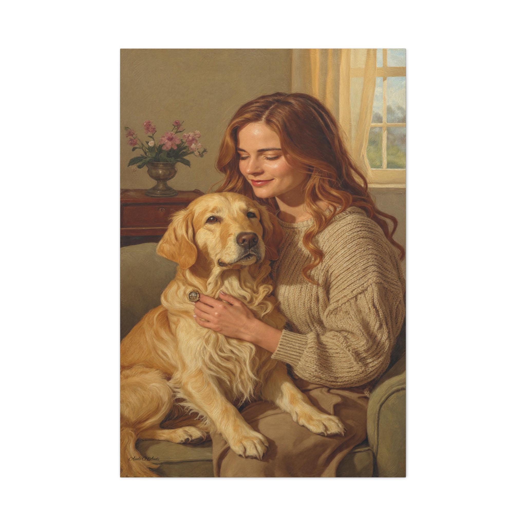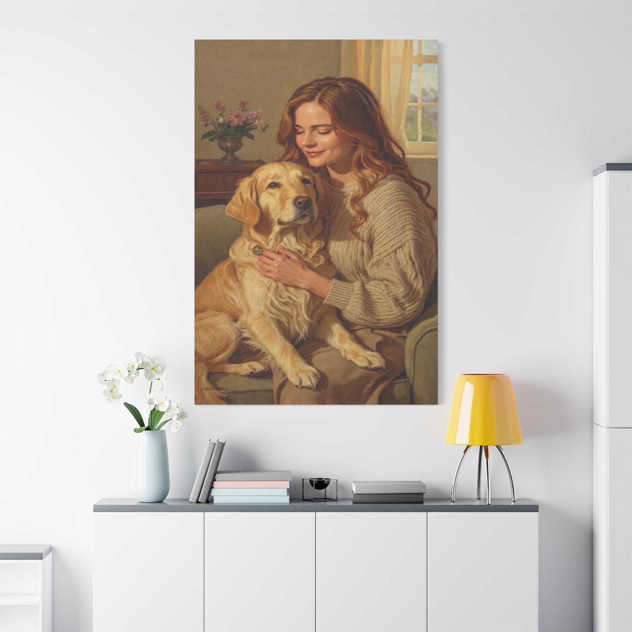 Capture the profound bond between human and animal with this beautiful canvas print, "Golden Companion." This painting portrays a serene moment as a woman gently embraces her loyal Golden Retriever in a sunlit, cozy interior. The artwork exudes warmth, loyalty, and the comforting spirit of home.