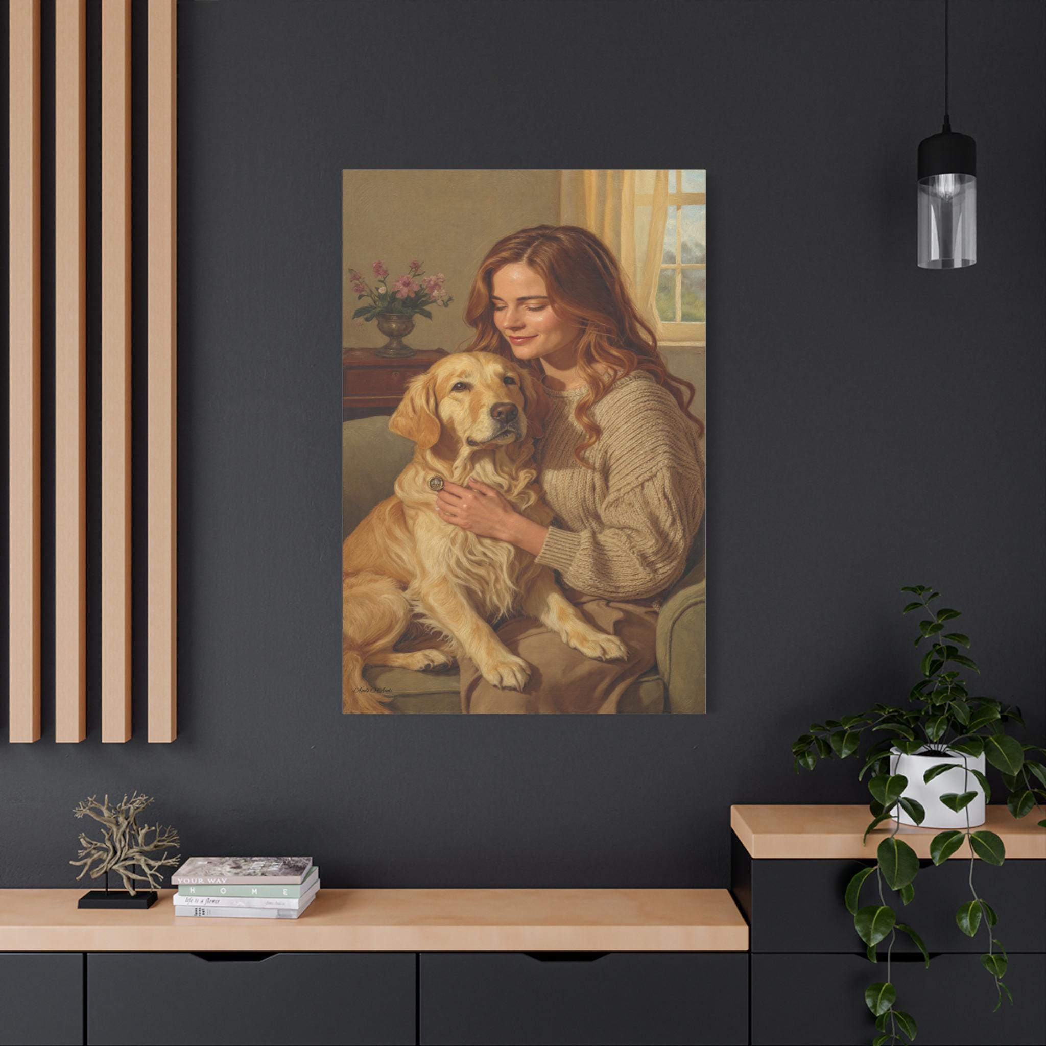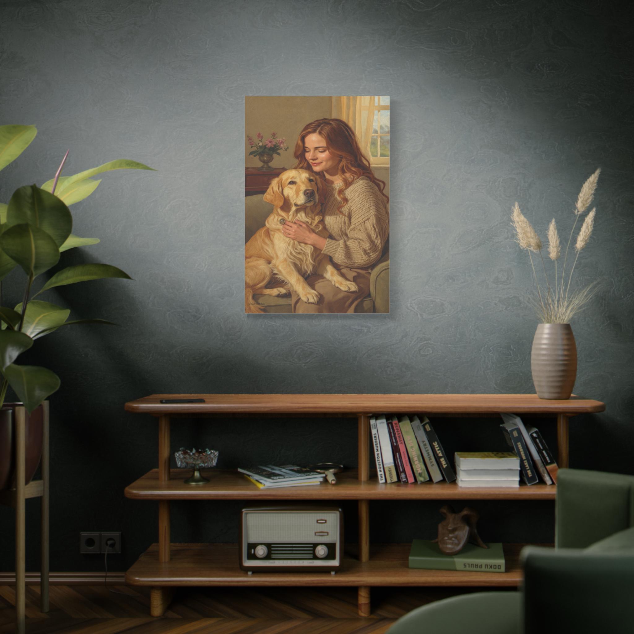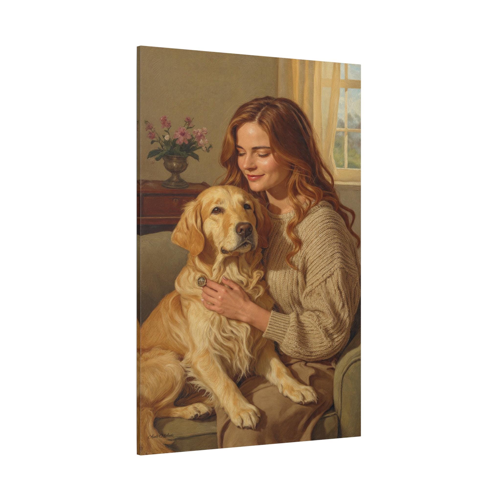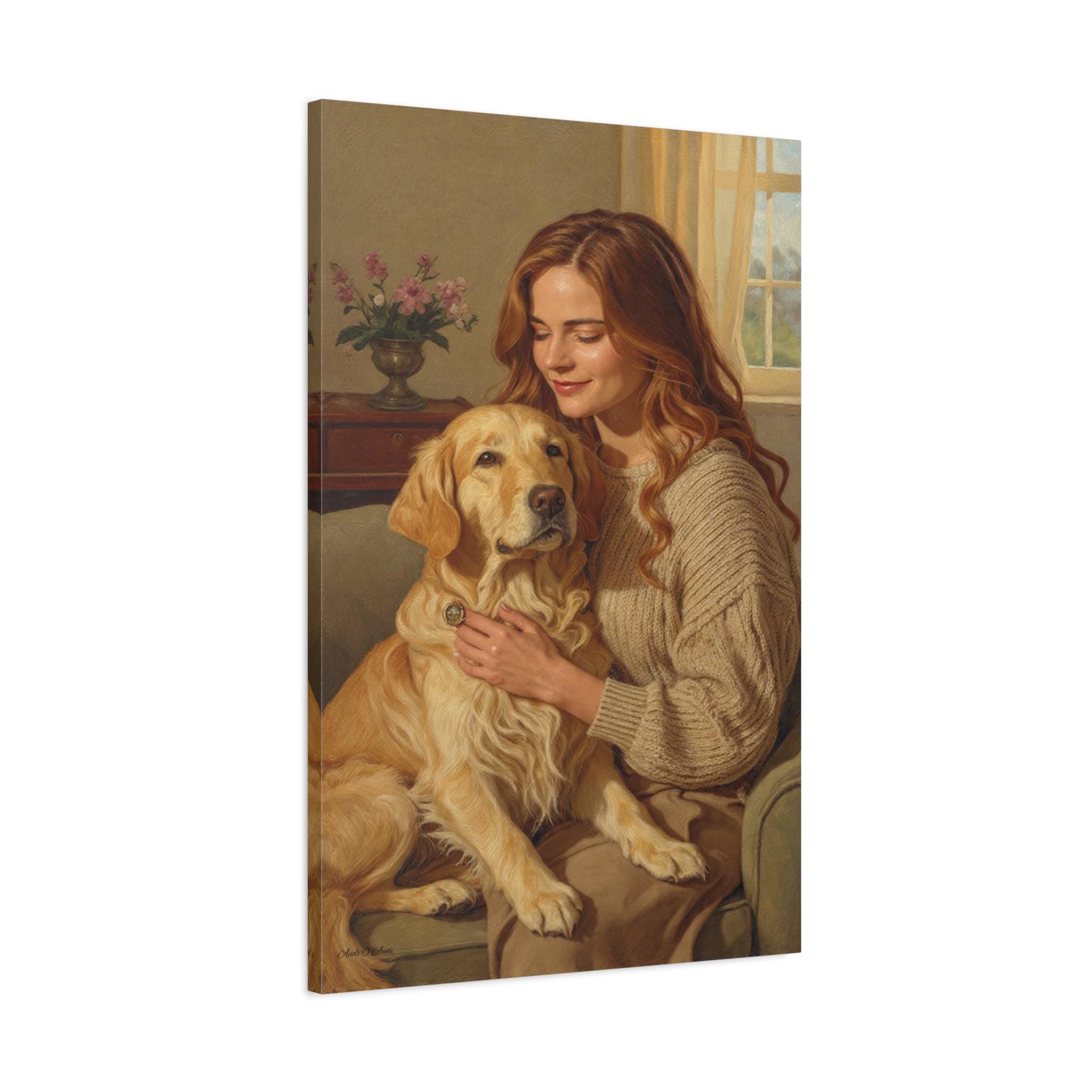 Capture the profound bond between human and animal with this beautiful canvas print, "Golden Companion." This painting portrays a serene moment as a woman gently embraces her loyal Golden Retriever in a sunlit, cozy interior. The artwork exudes warmth, loyalty, and the comforting spirit of home.
