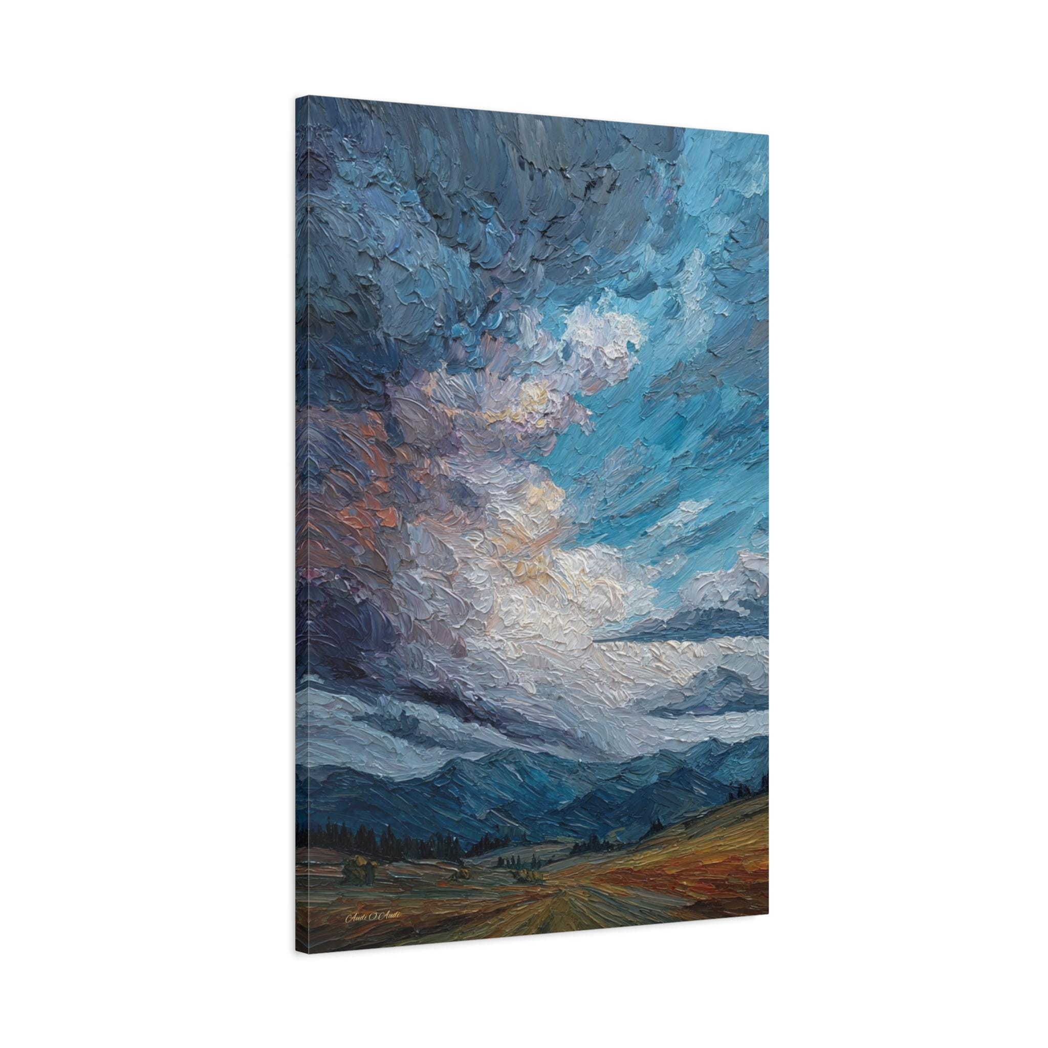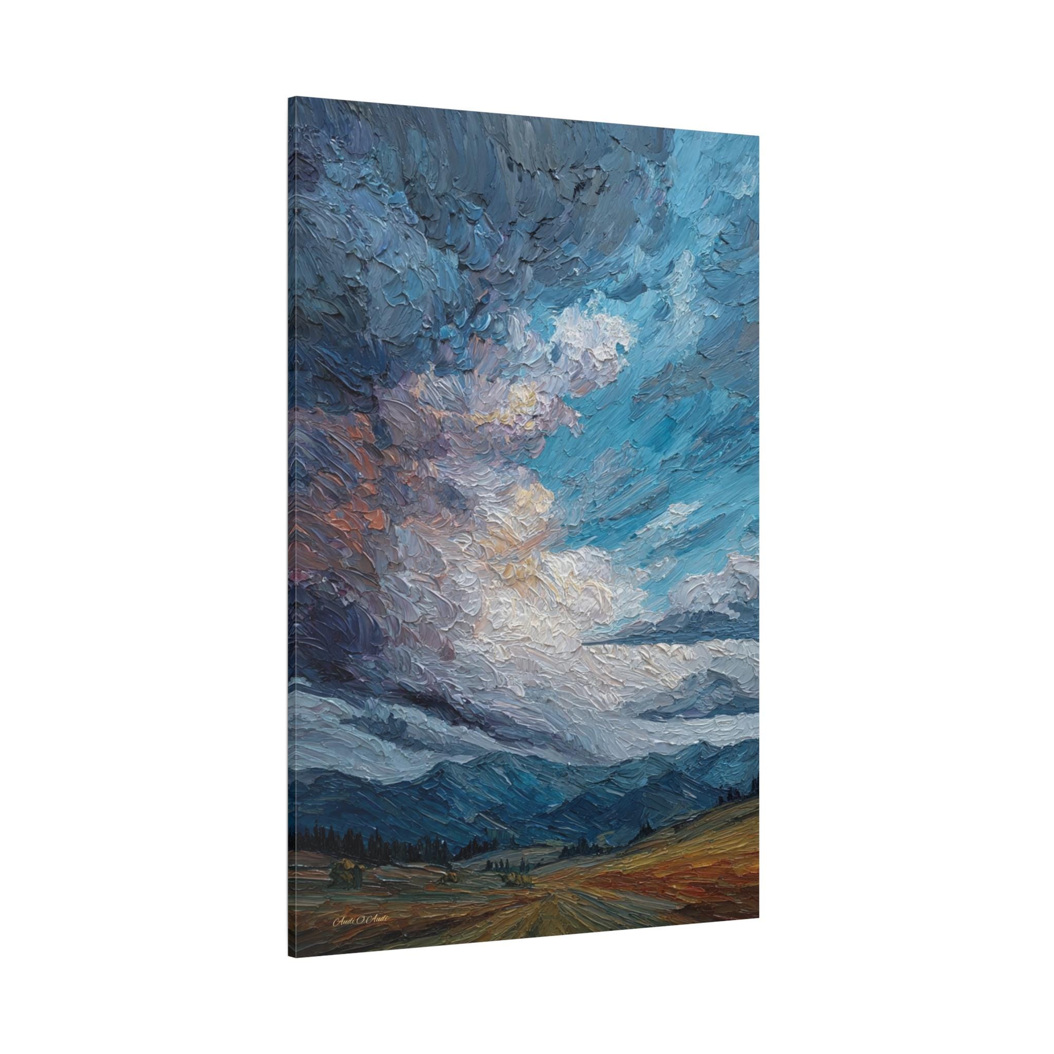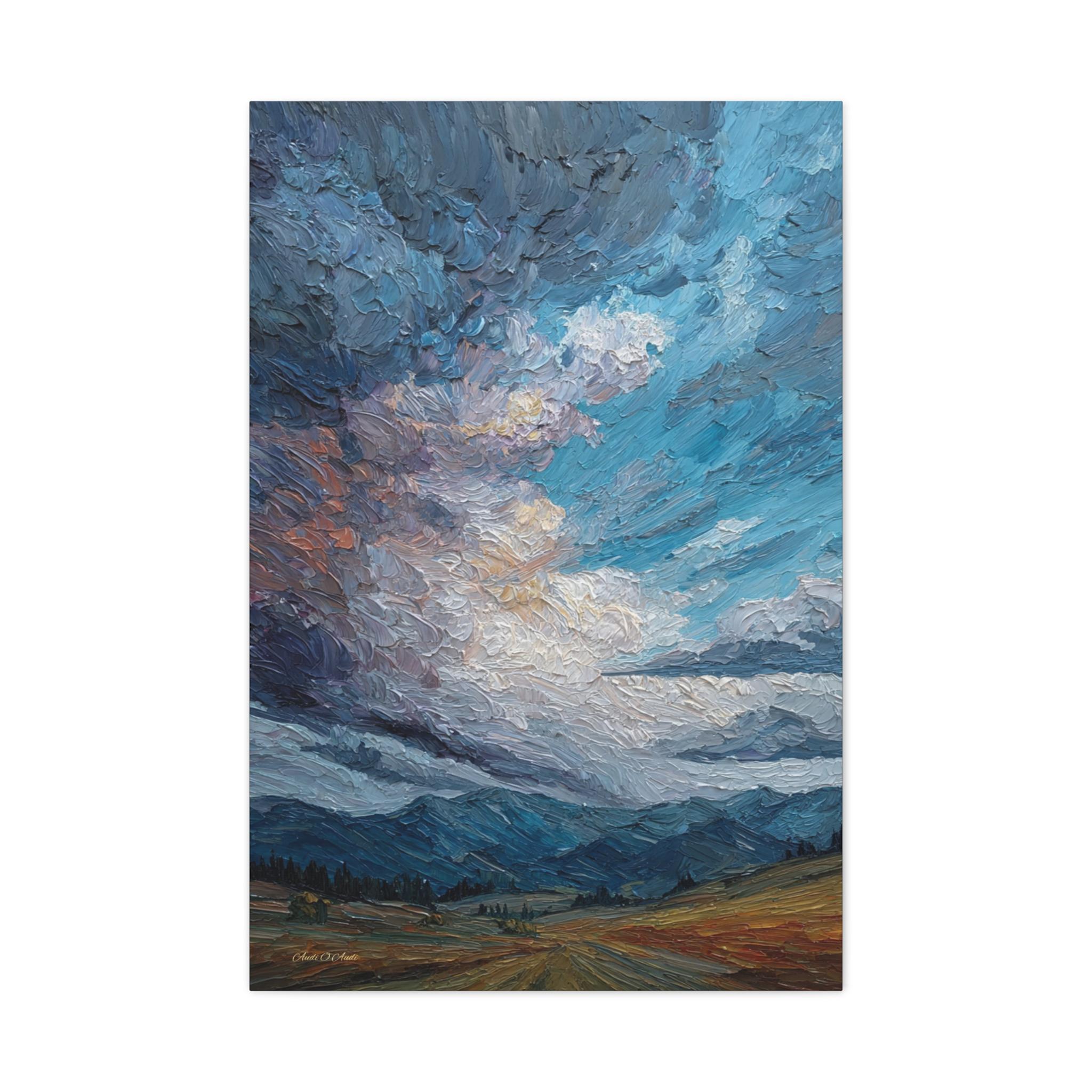 Capture the raw, expressive power of nature with this breathtaking canvas print, "Storm Clouds over the Foothills." This artwork features an immense, turbulent sky rendered in thick, sculpted paint, towering over distant blue mountains and a warm, golden foreground.