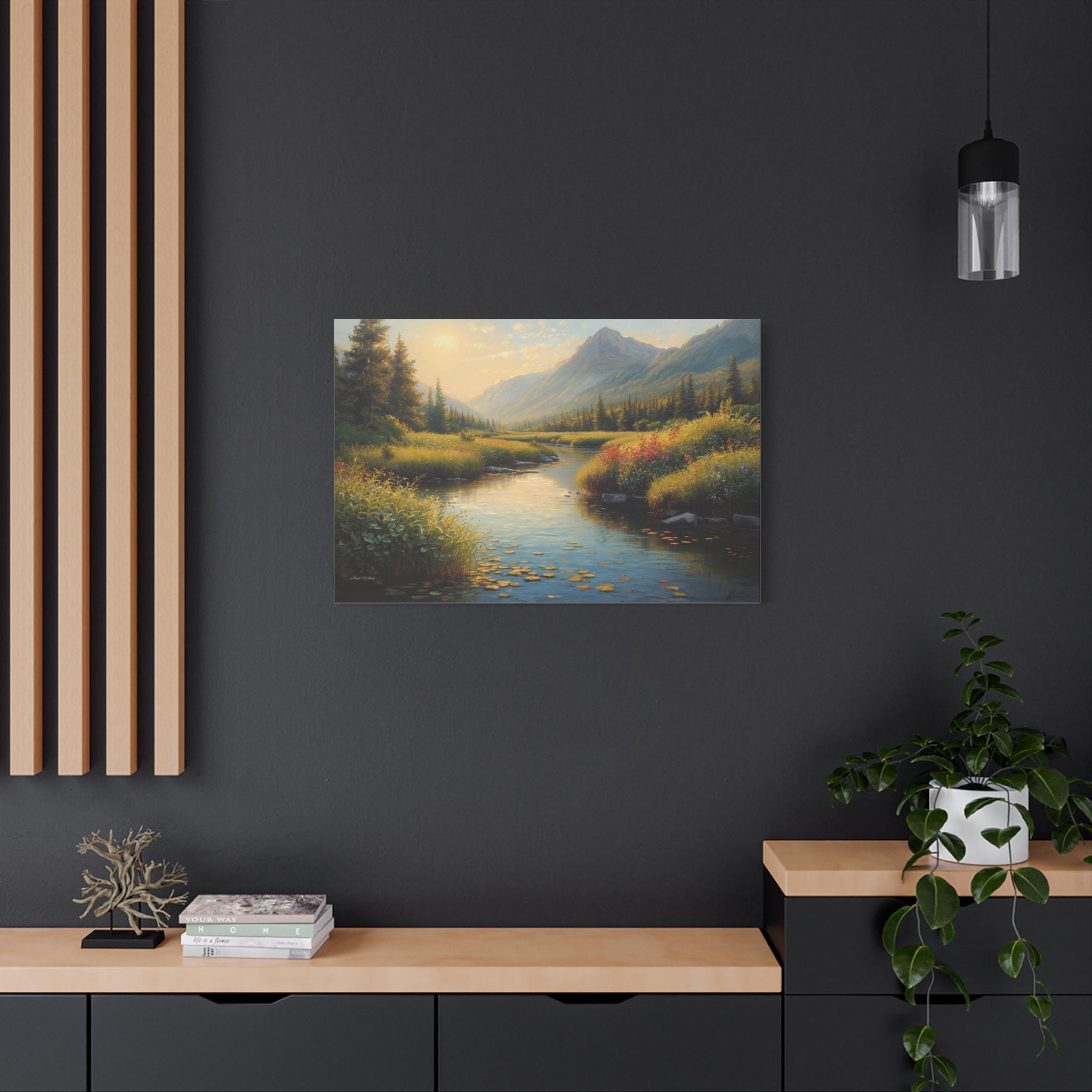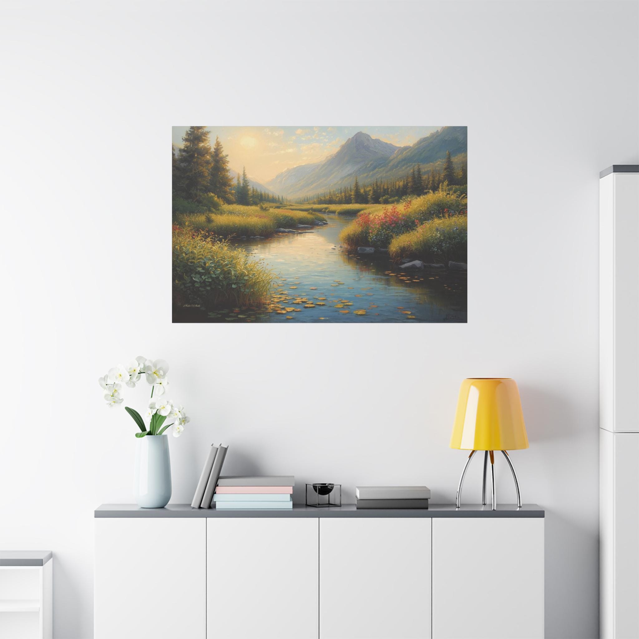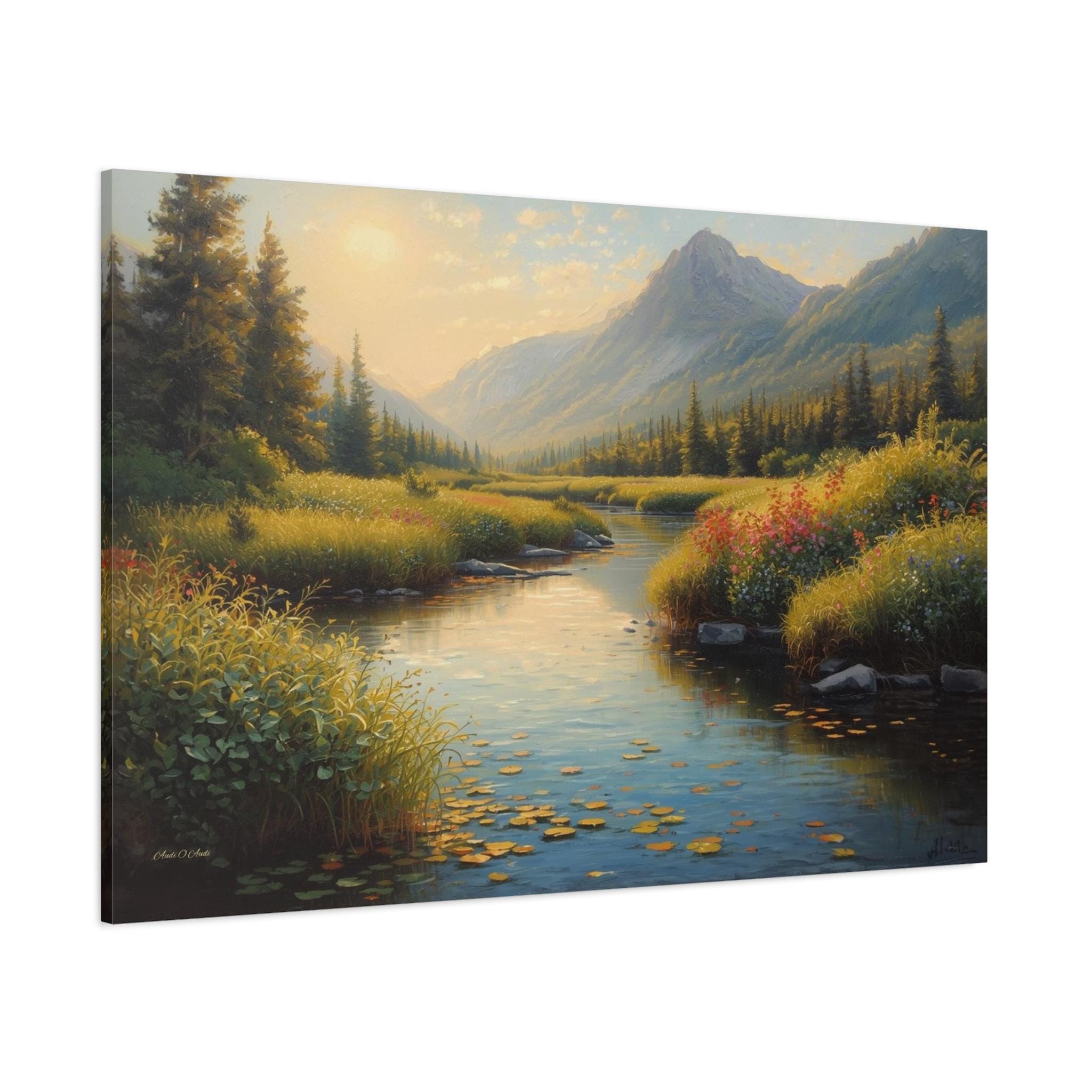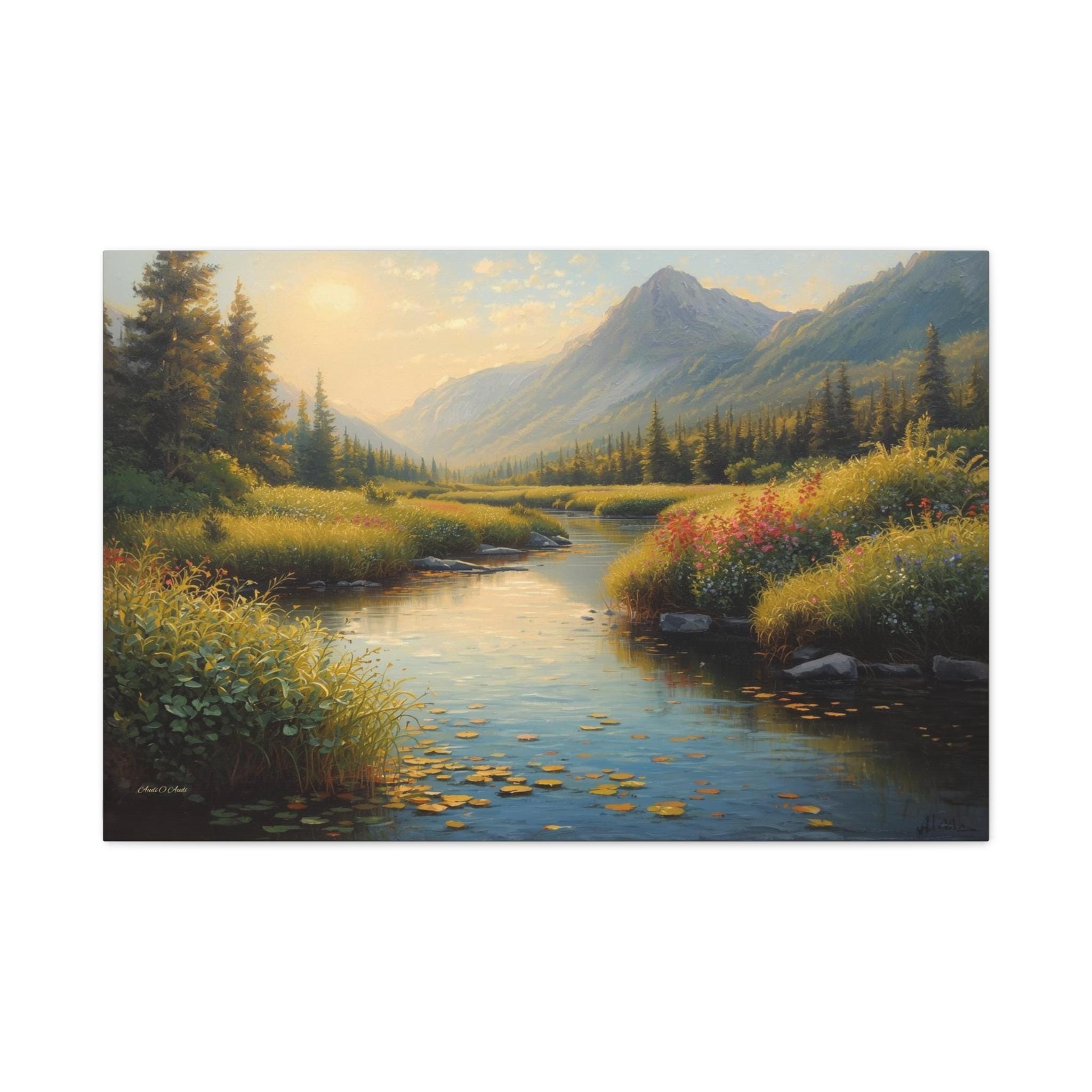 Invite the peaceful serenity of the wilderness into your home with this breathtaking canvas print, "Golden Valley Retreat." This exquisite painting captures a gentle river winding through a sun-drenched mountain valley, surrounded by lush meadows and towering pine forests.