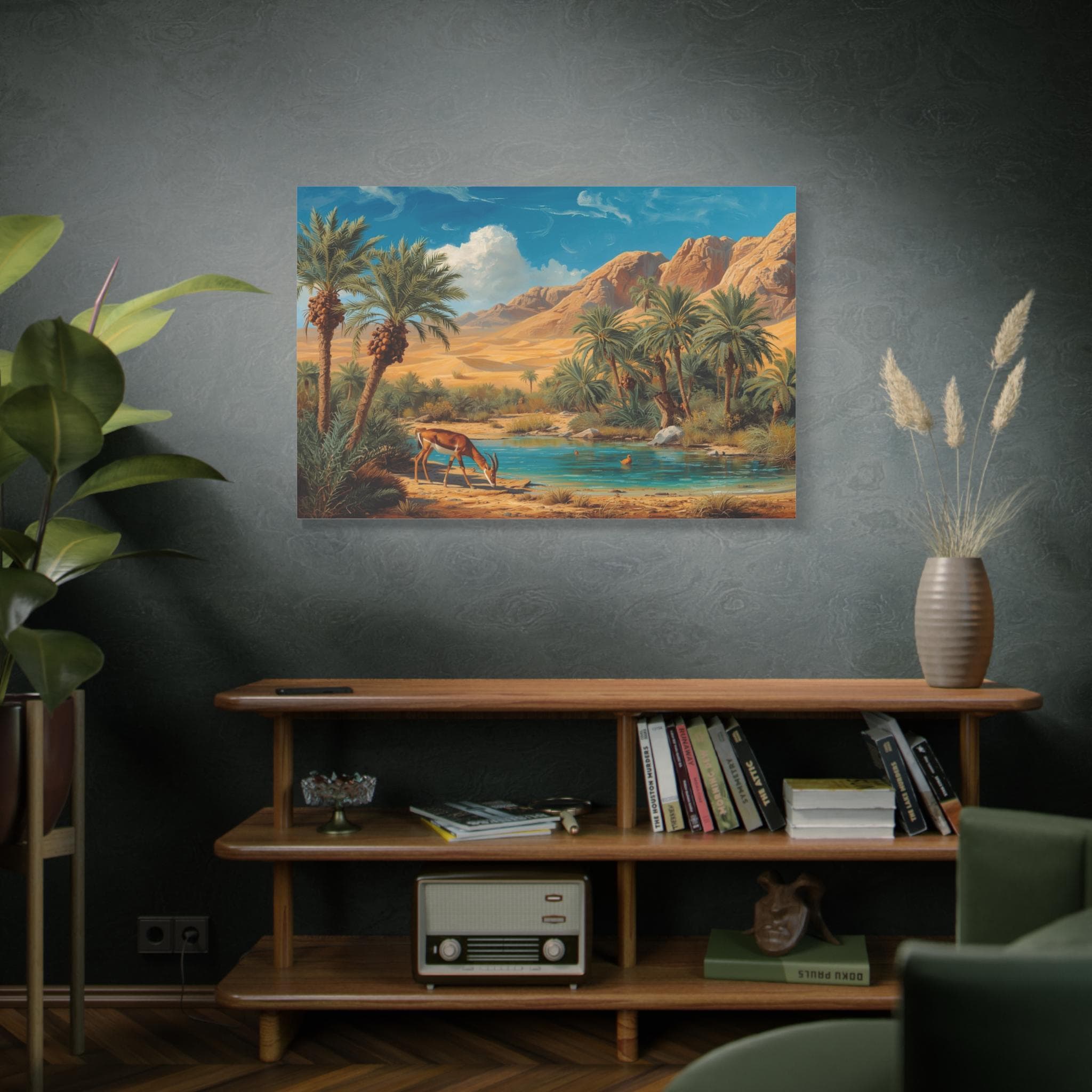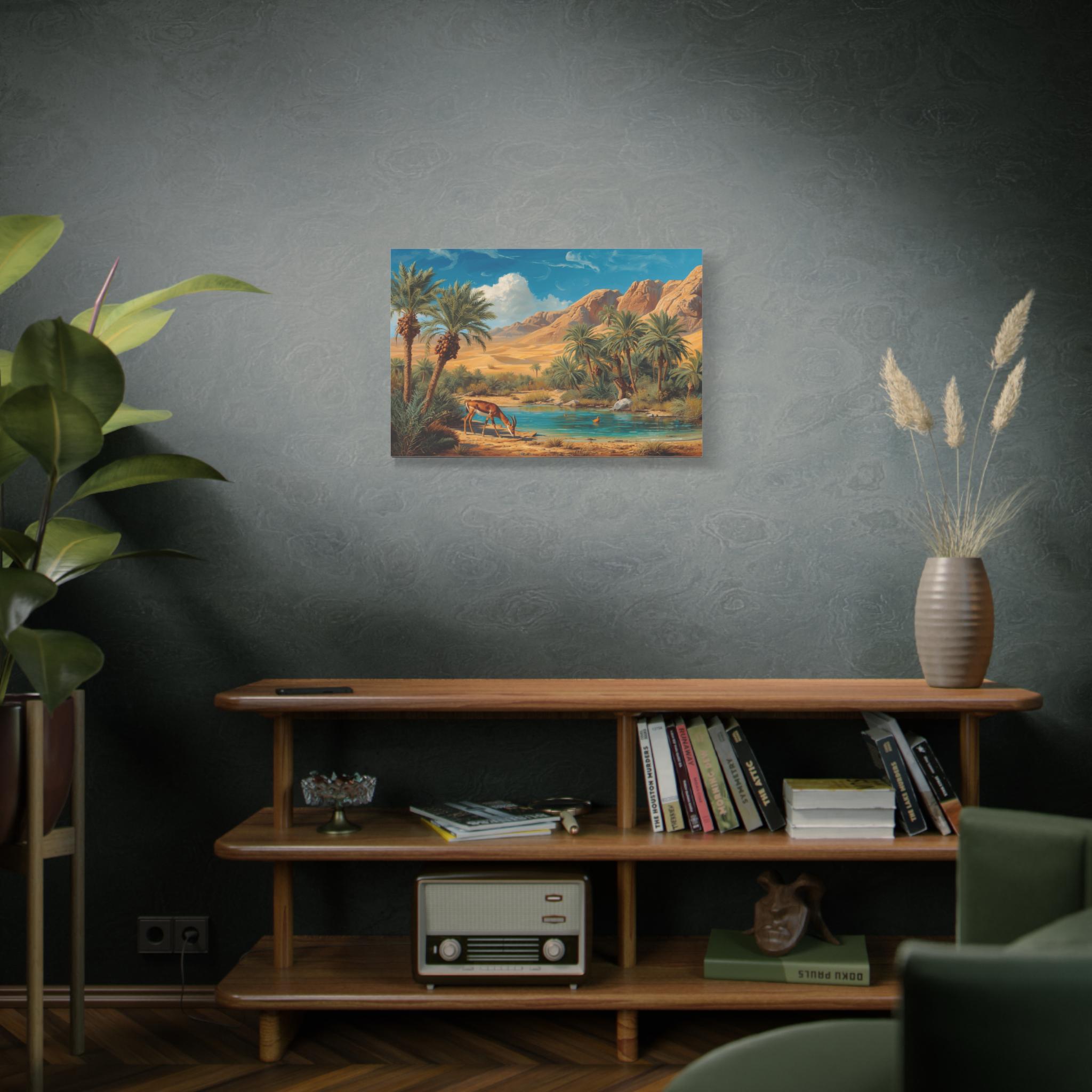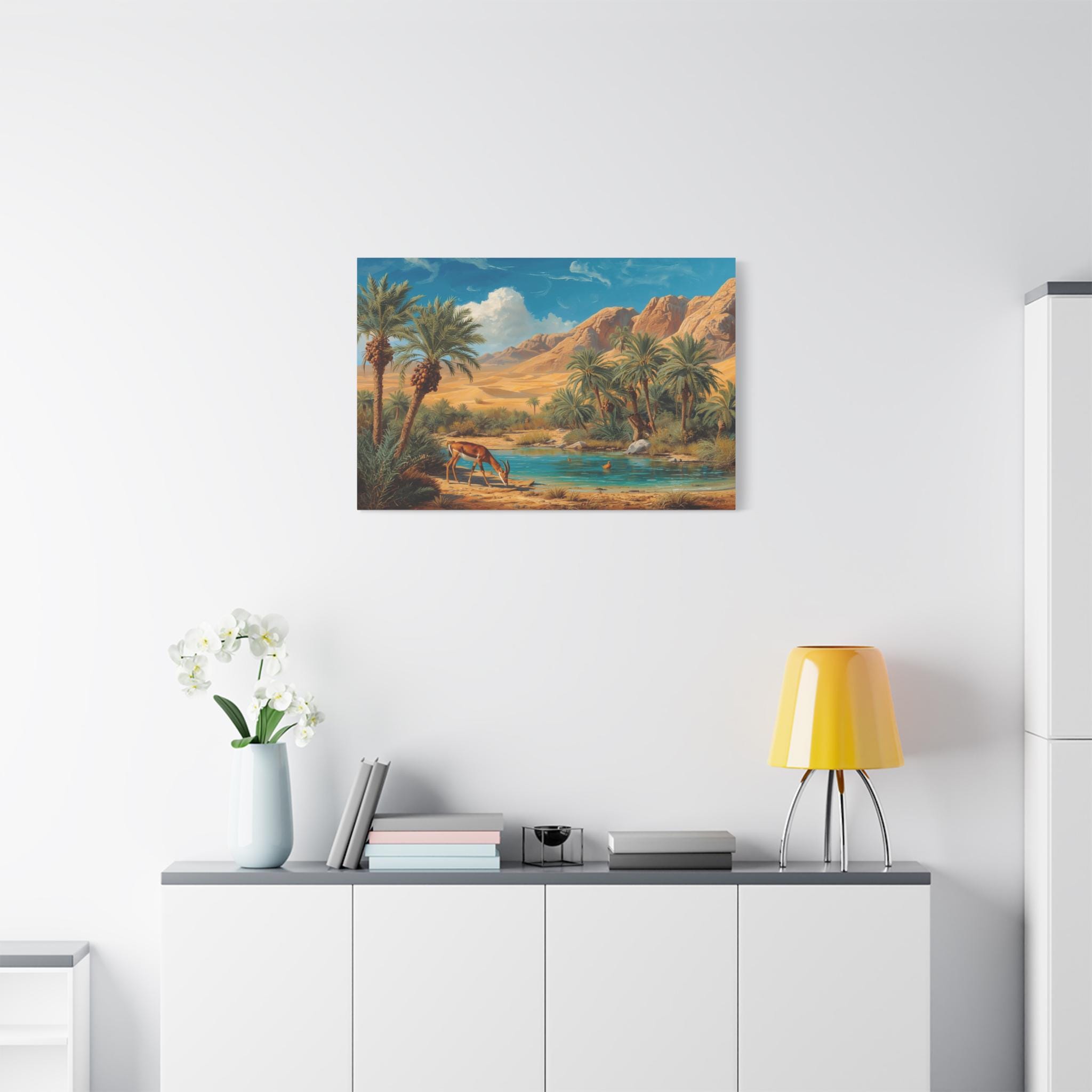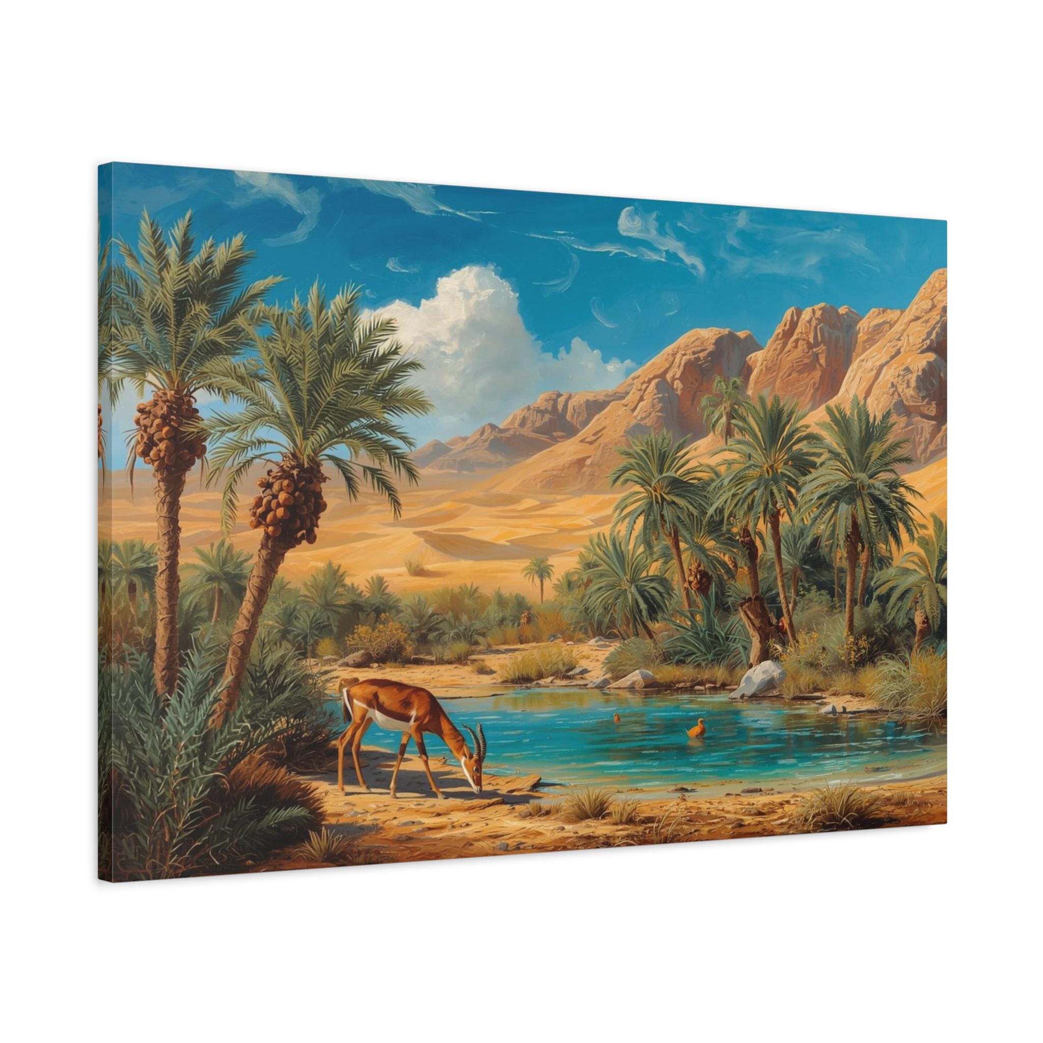 Transport yourself to a vibrant haven in the wilderness with this stunning canvas print, "Desert Sanctuary." This painting beautifully depicts a lush oasis, where tall palm trees frame a pool of clear, turquoise water, set against the vast, golden expanse of sandy dunes and rugged mountains.