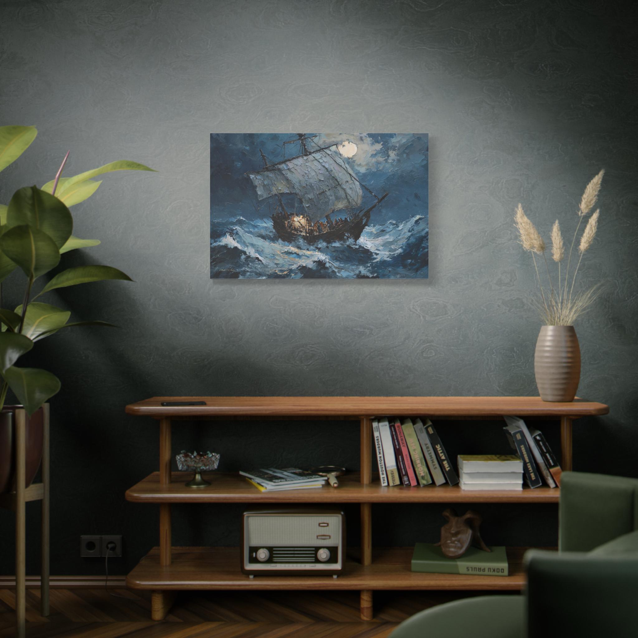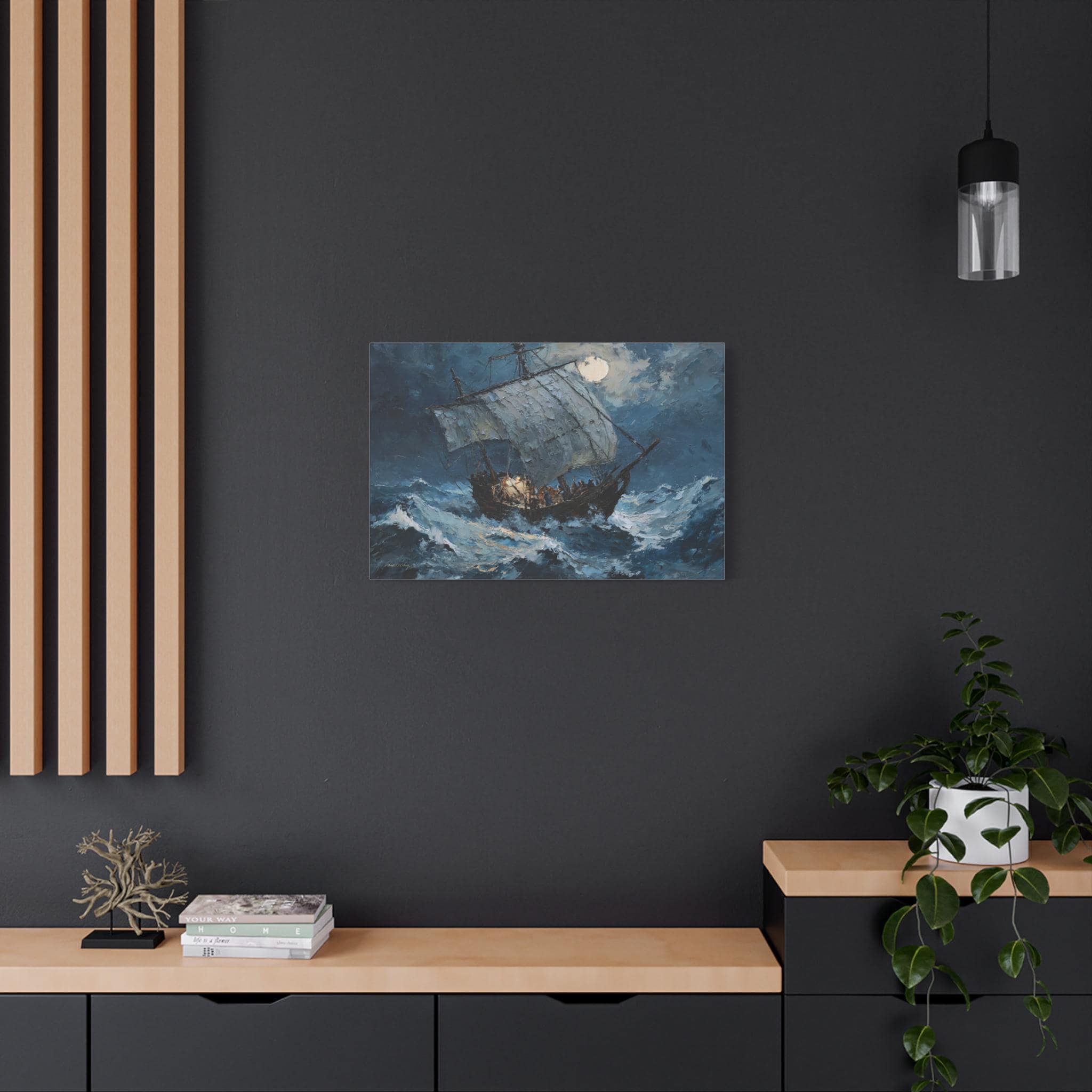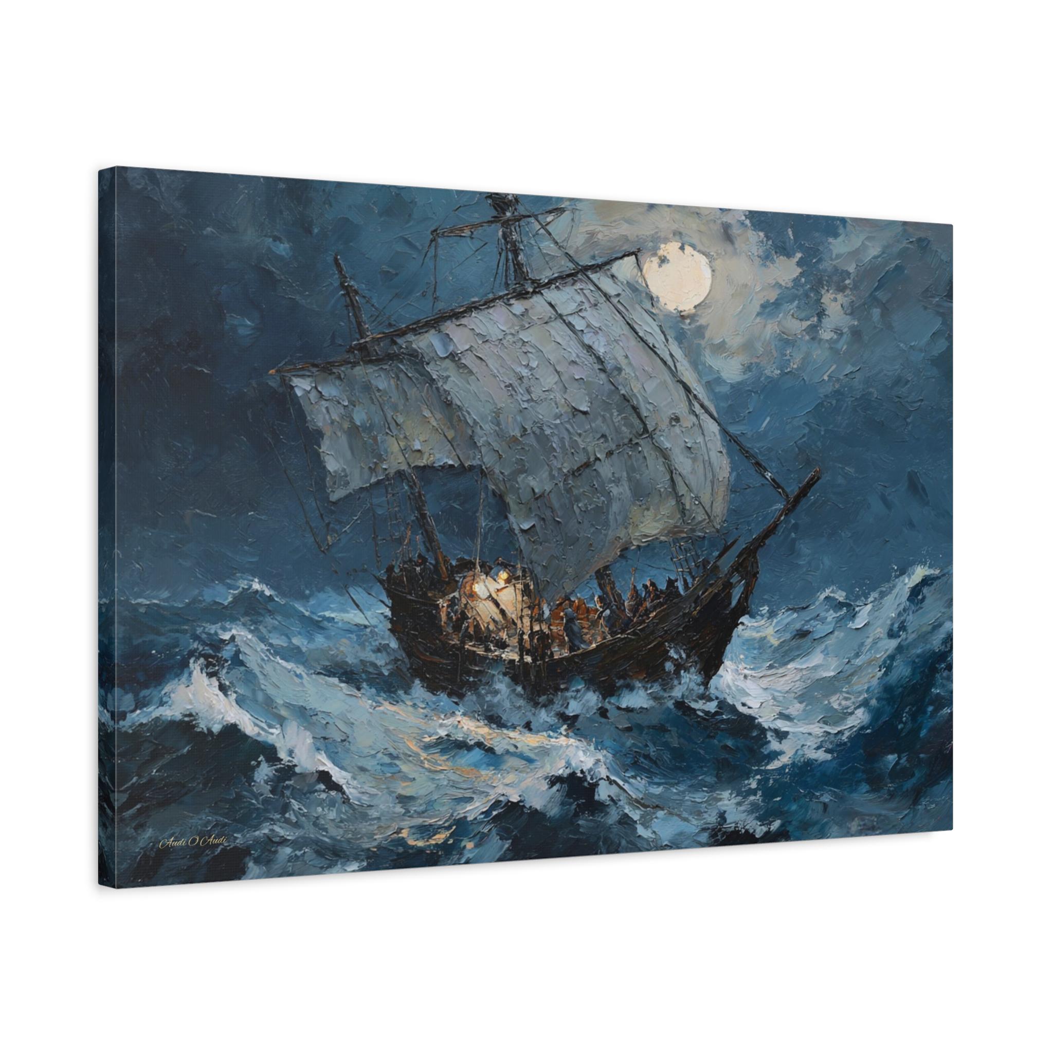 Capture the raw, beautiful power of the sea with this stunning canvas print, "Moonlit Tempest." This painting features a small, rugged sailing ship fighting through immense, churning waves under the cold, luminous light of a full moon. Rendered in a spectacular heavy impasto style, the artwork conveys intense motion, courage, and high seas drama.