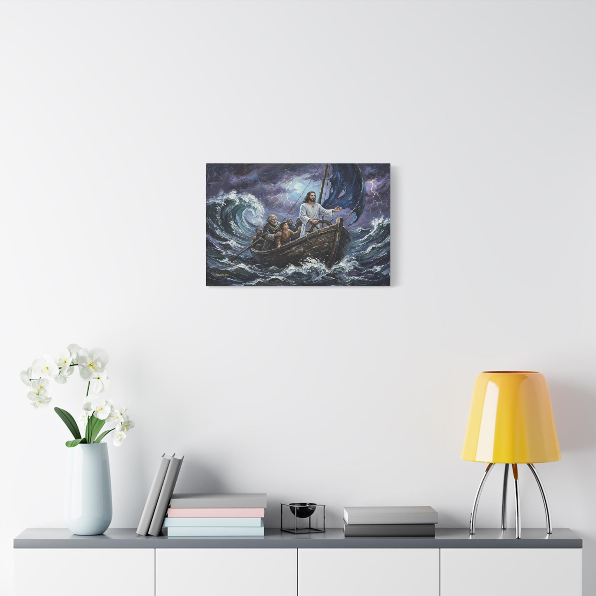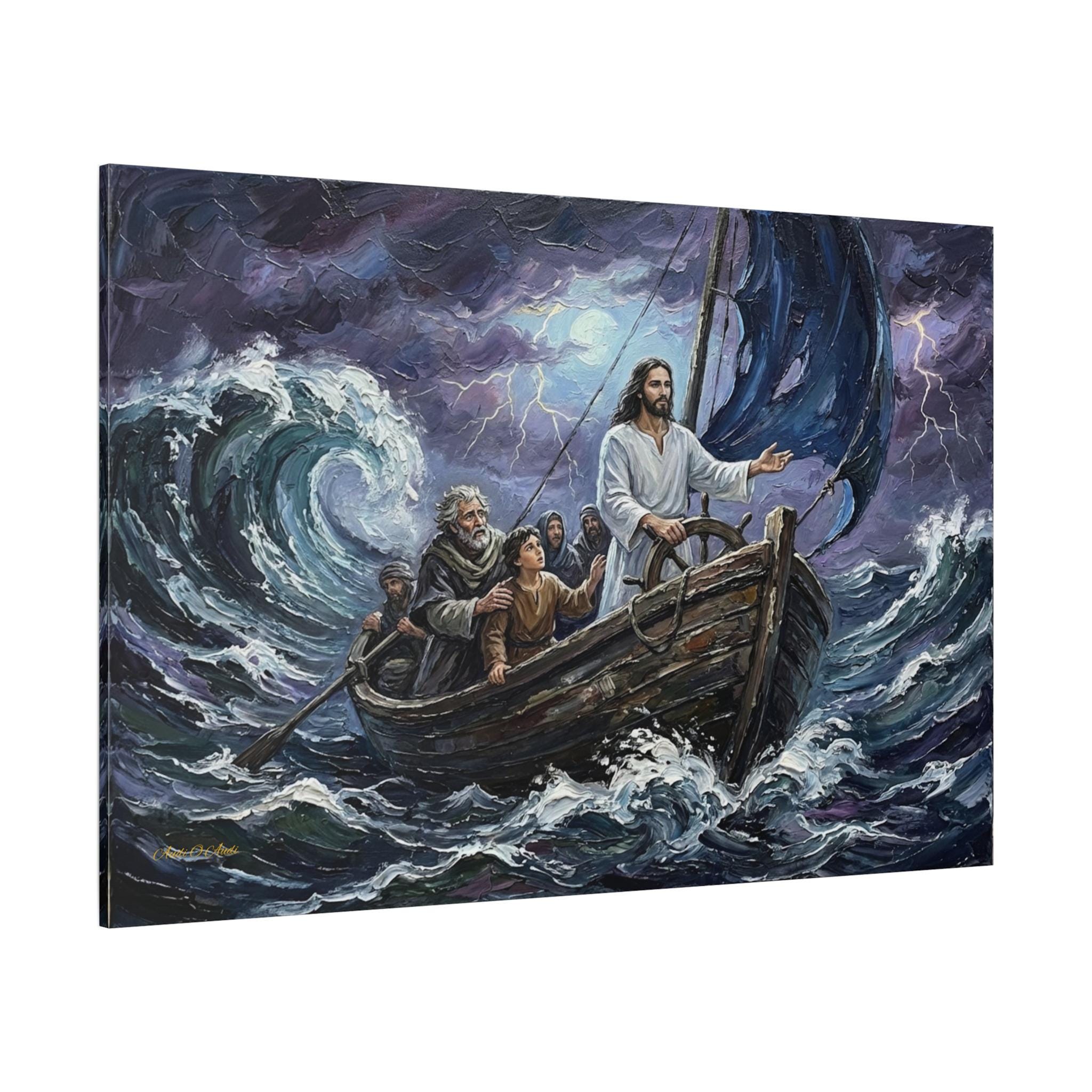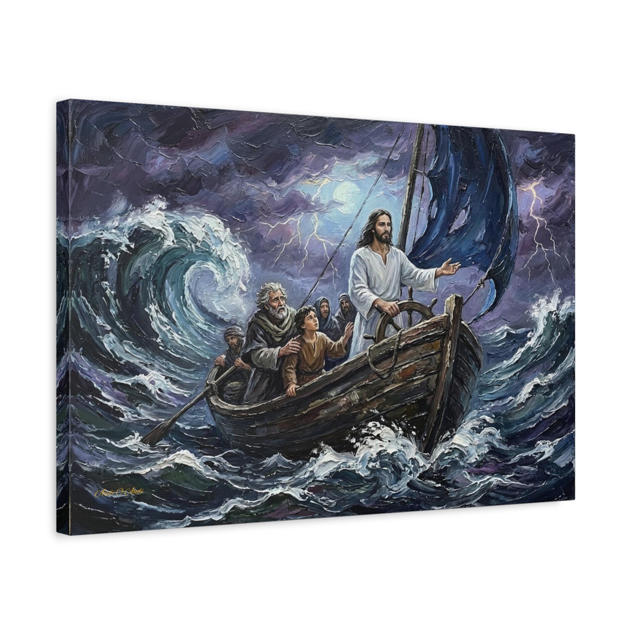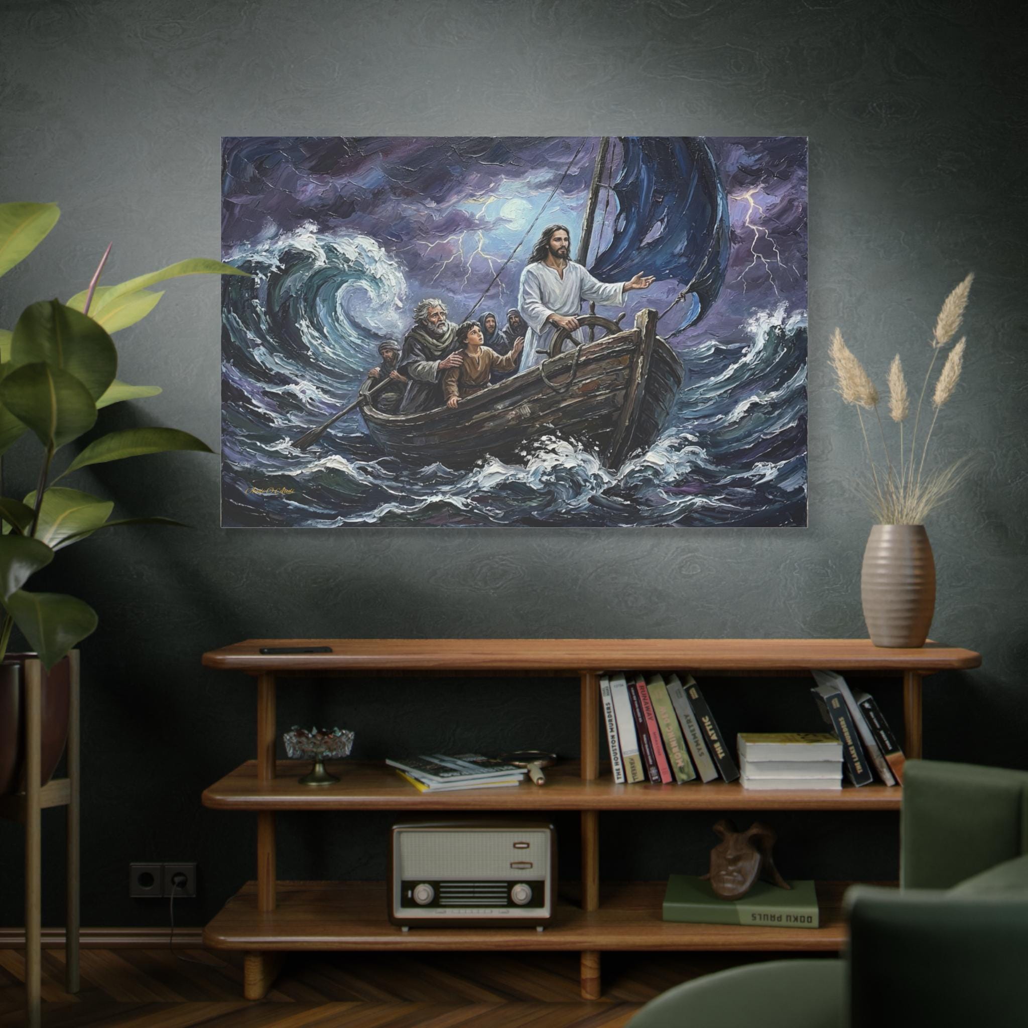 Command attention in your home with this stunning canvas print, "Peace, Be Still." This artwork captures the powerful biblical moment when Jesus calms the sea, standing resolutely at the helm of a small boat tossed by an immense storm. Rendered in a bold, expressive, heavy impasto style, the painting conveys Christ's authority over chaos and his presence during life's greatest trials.