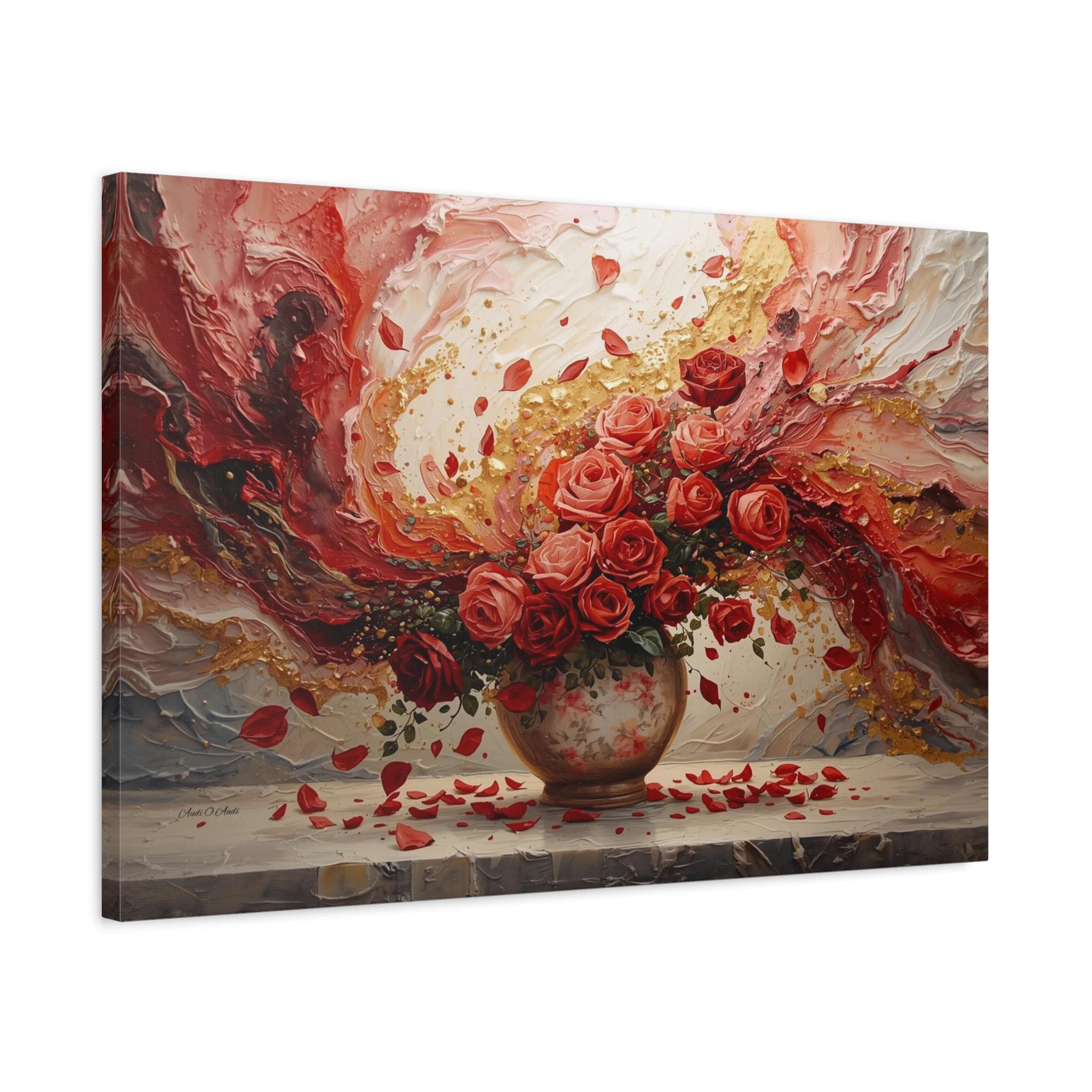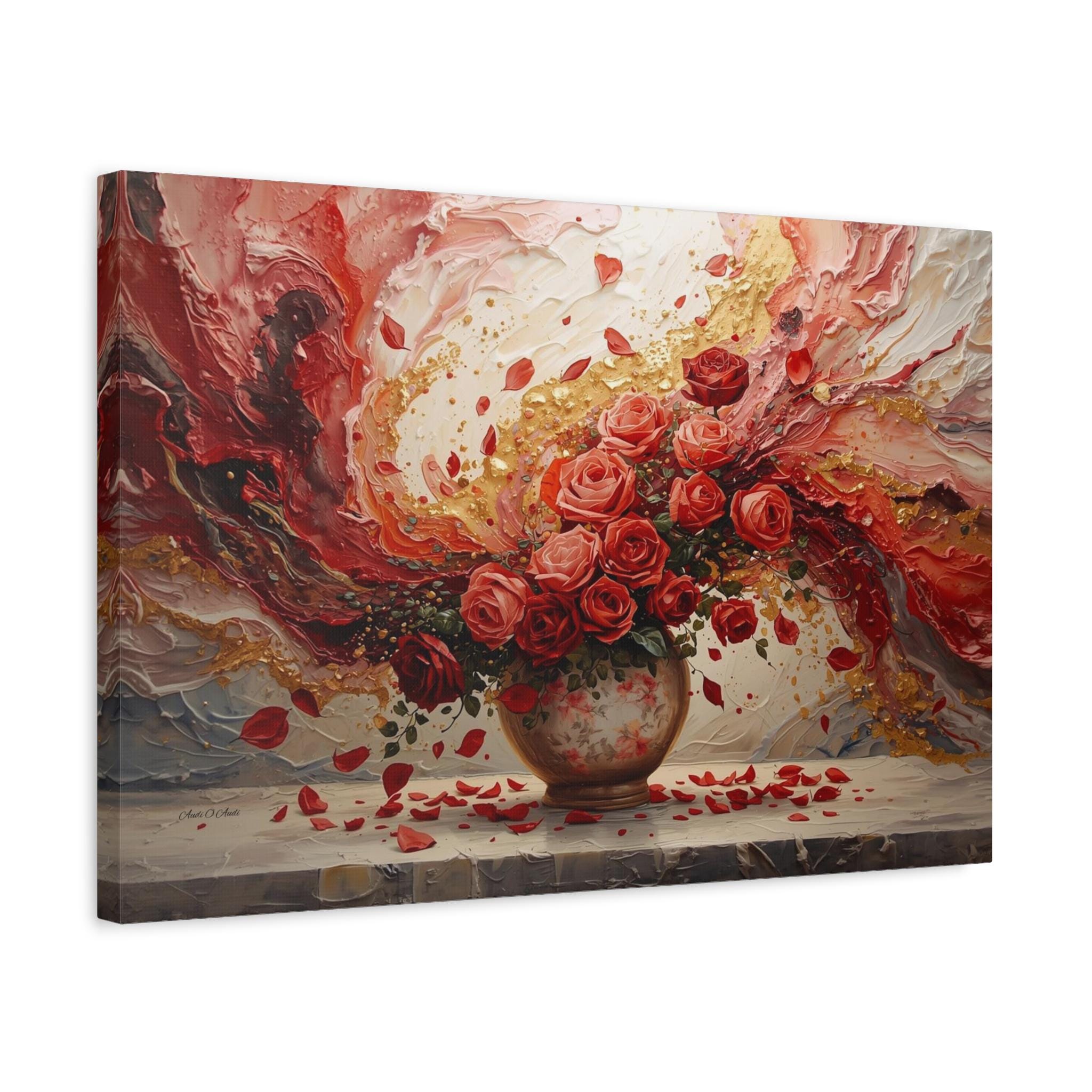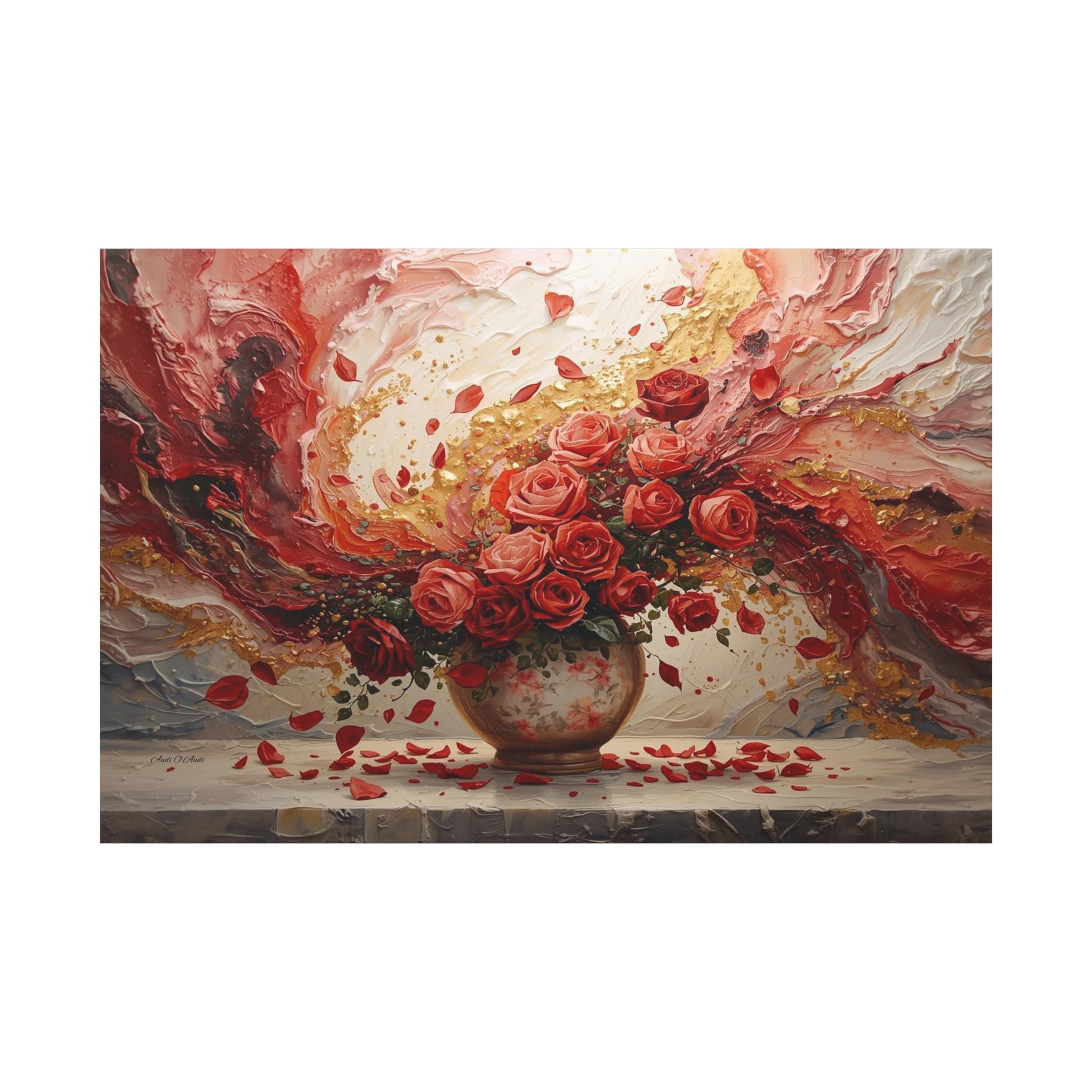 Immerse your space in passionate romance with this spectacular canvas print, a stunning fusion of traditional still life and modern abstract expressionism. The piece features a lush bouquet of ruby and coral roses overflowing from an antique vase, set against a dramatic, swirling background of rich color and dazzling texture.
