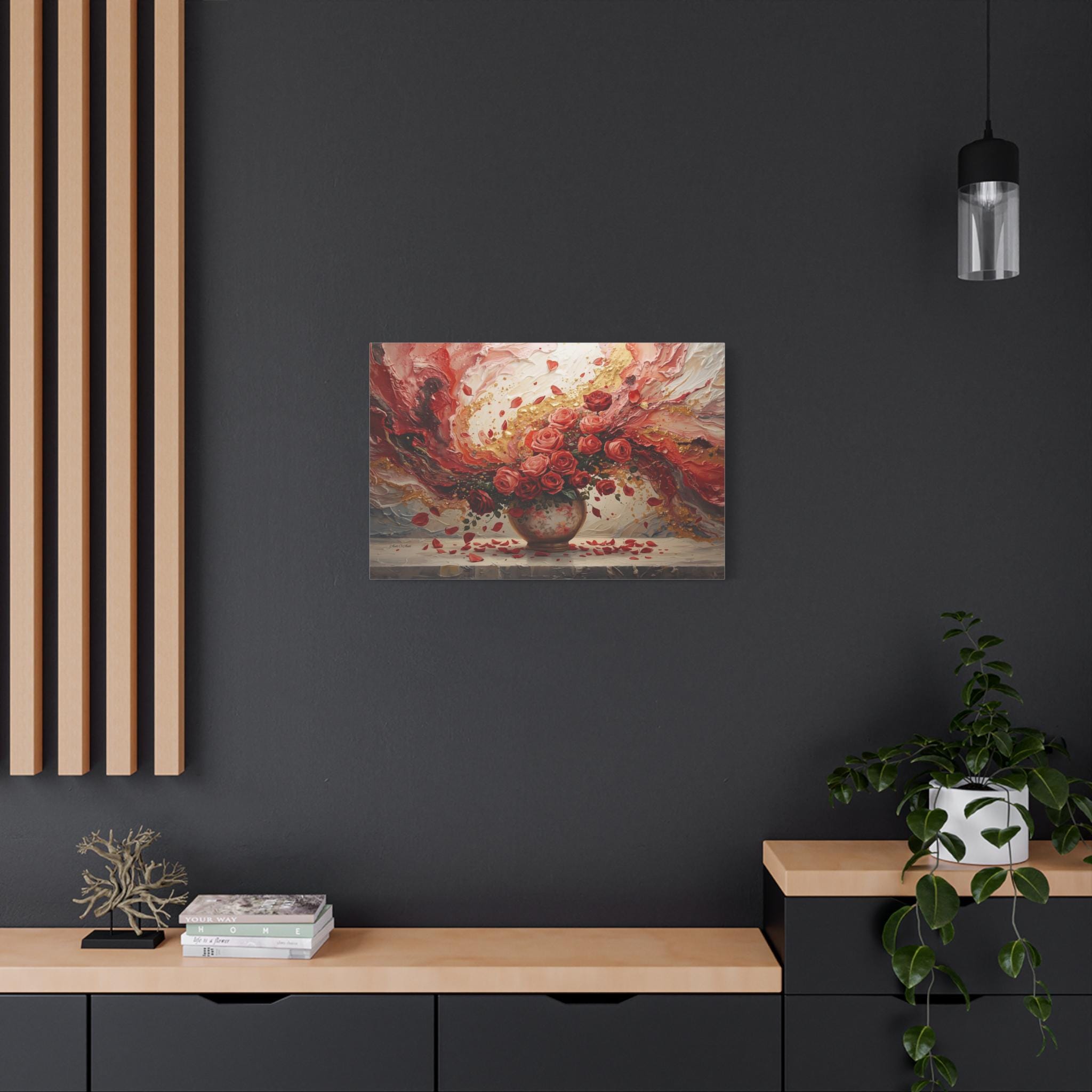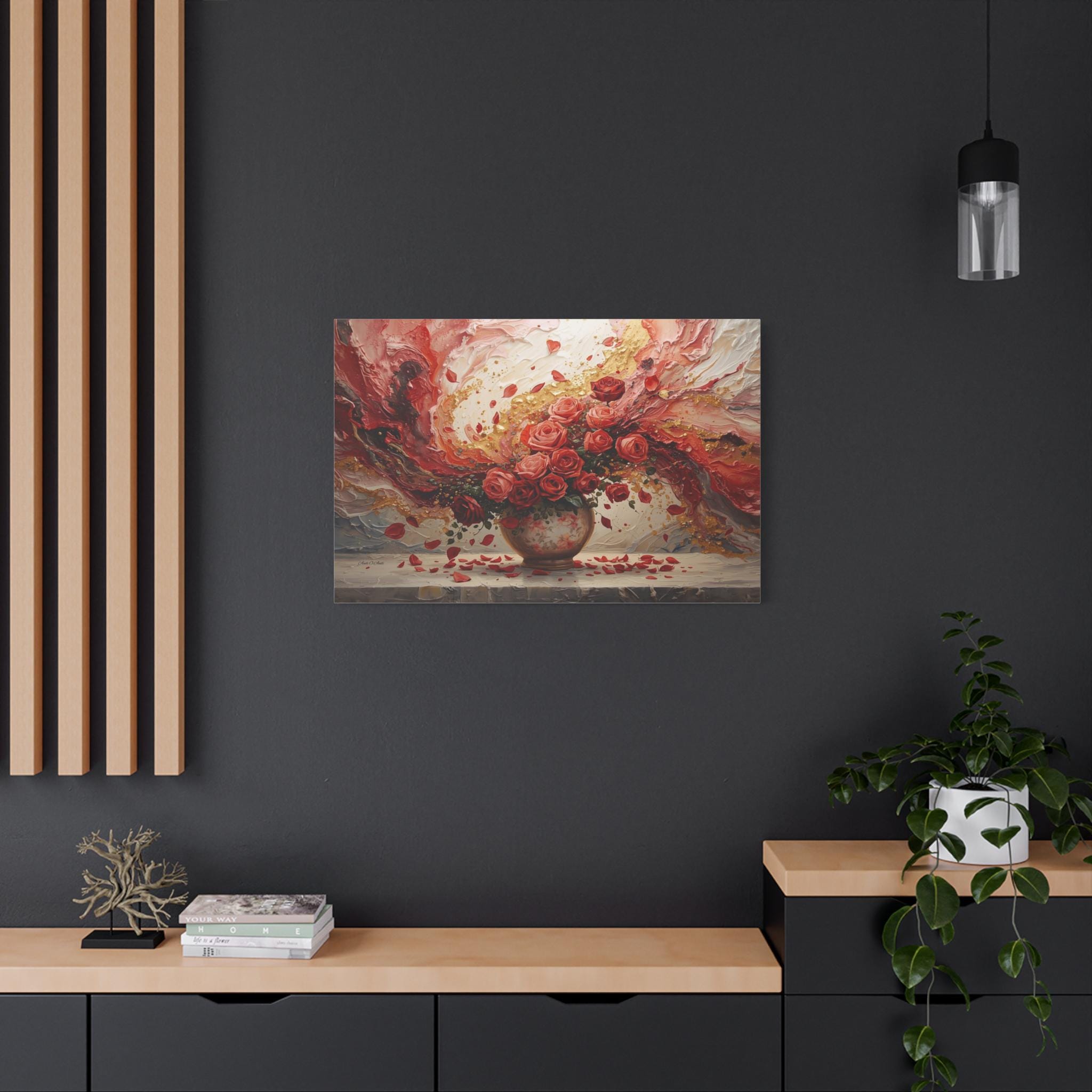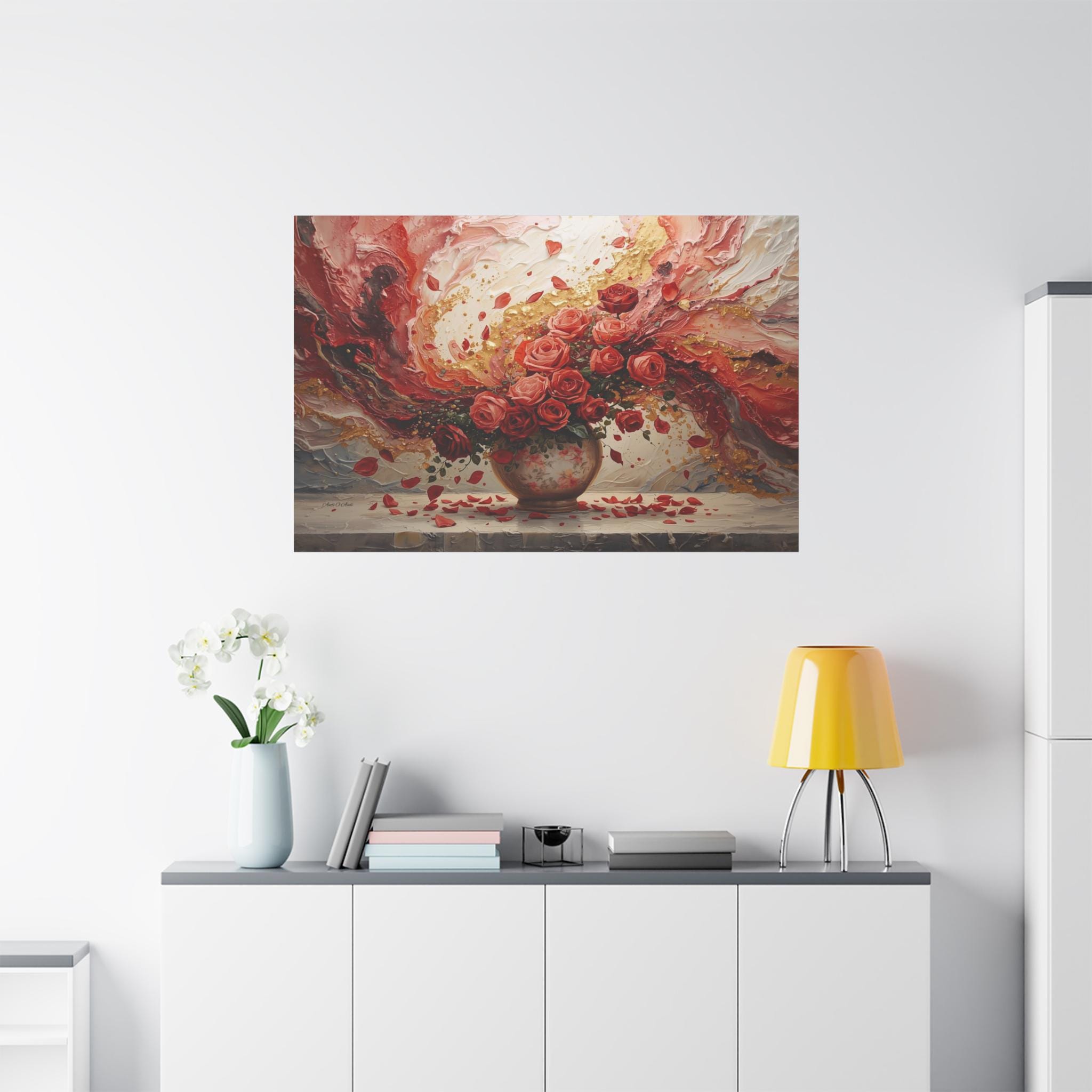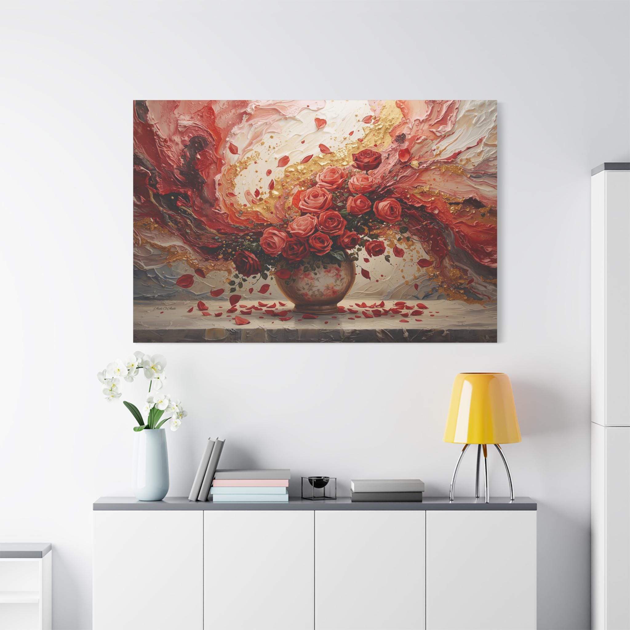 Immerse your space in passionate romance with this spectacular canvas print, a stunning fusion of traditional still life and modern abstract expressionism. The piece features a lush bouquet of ruby and coral roses overflowing from an antique vase, set against a dramatic, swirling background of rich color and dazzling texture.