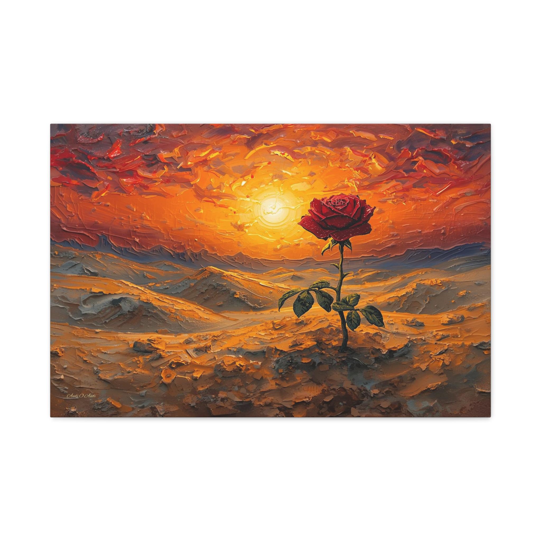 Witness the breathtaking drama of the desert at dusk with "Desert Rose Sunset." This fiercely beautiful piece captures a solitary, deep red rose rising from the undulating, golden dunes as a brilliant sun sets in an explosion of thick, fiery oranges and reds. The extreme impasto-style texture makes the entire piece feel alive and full of passion.