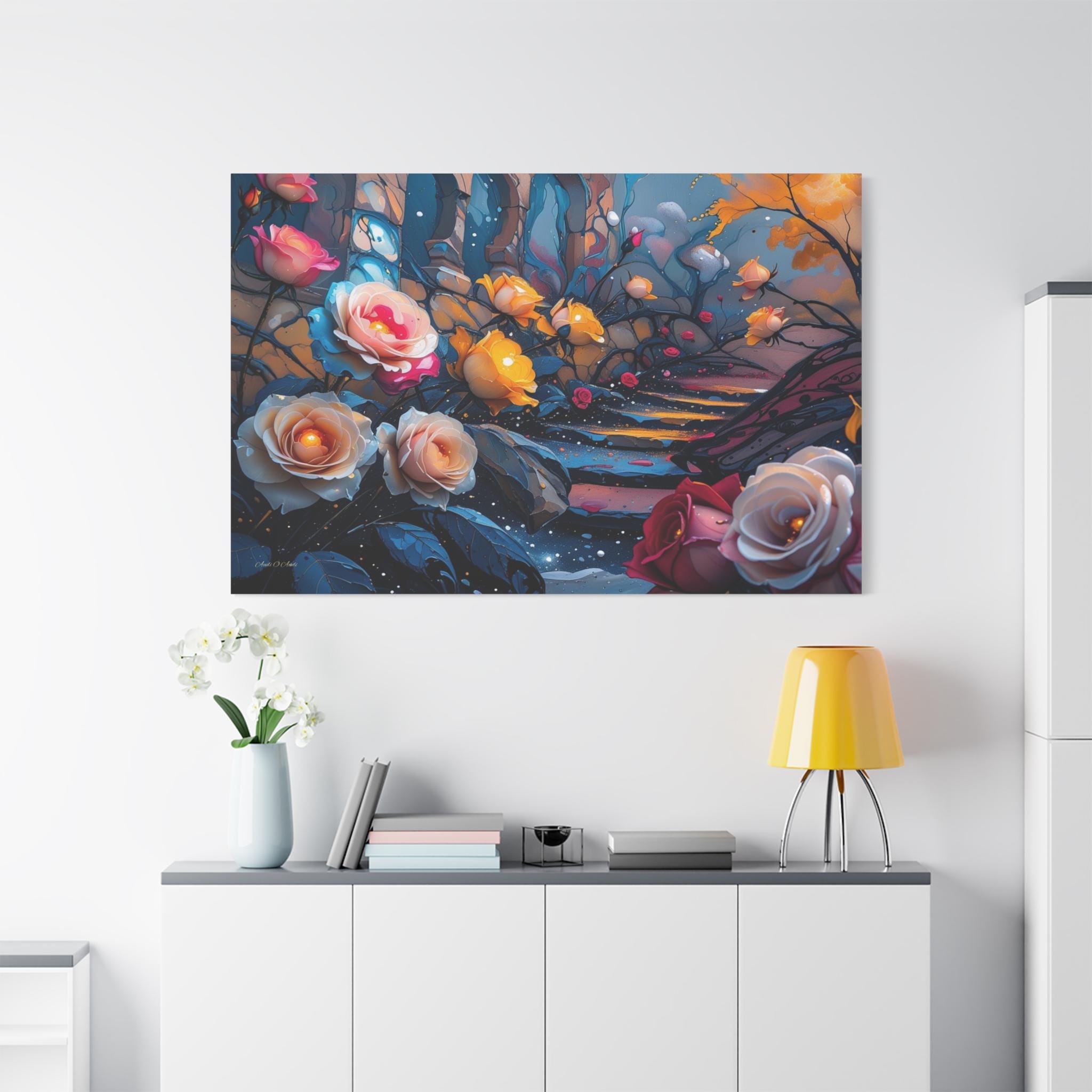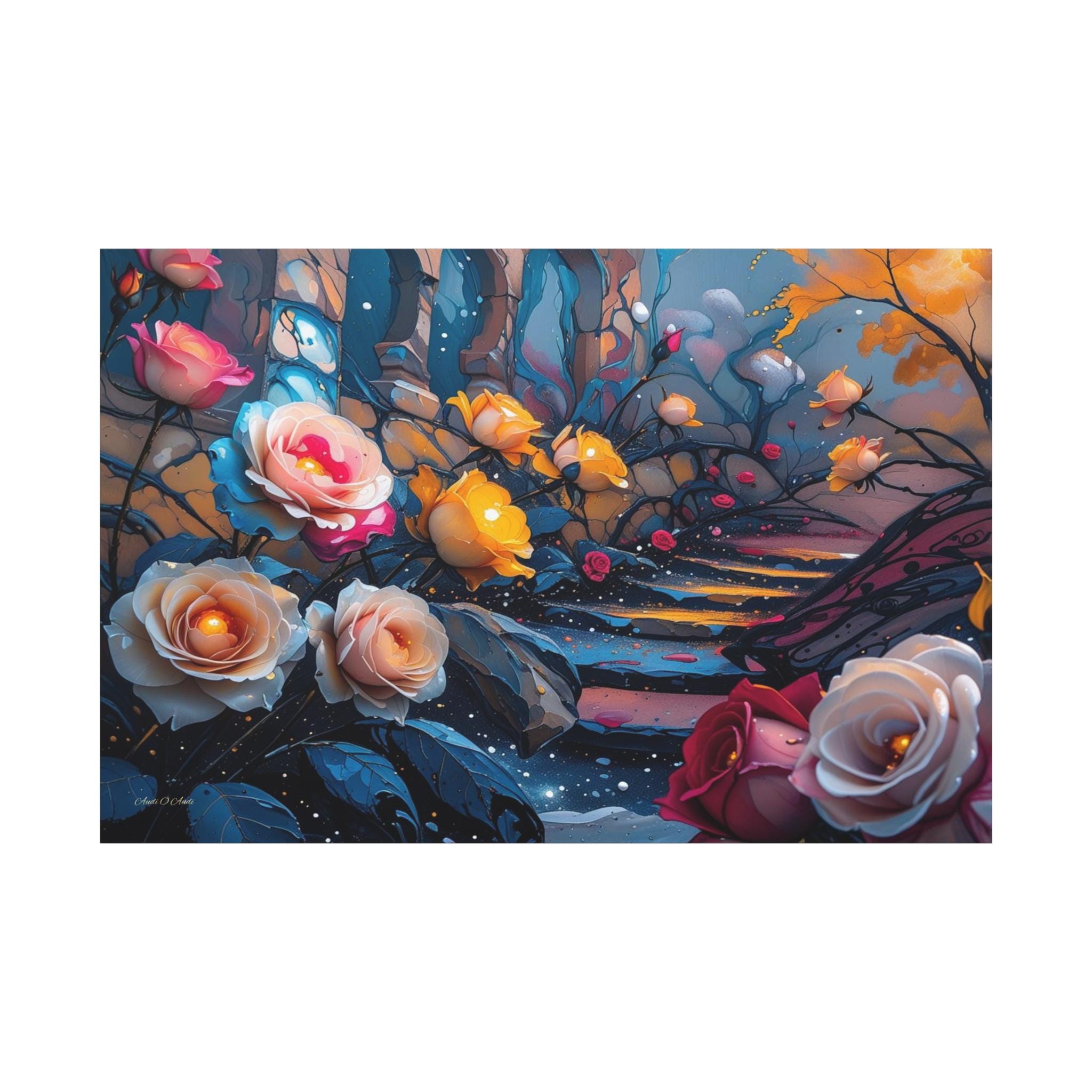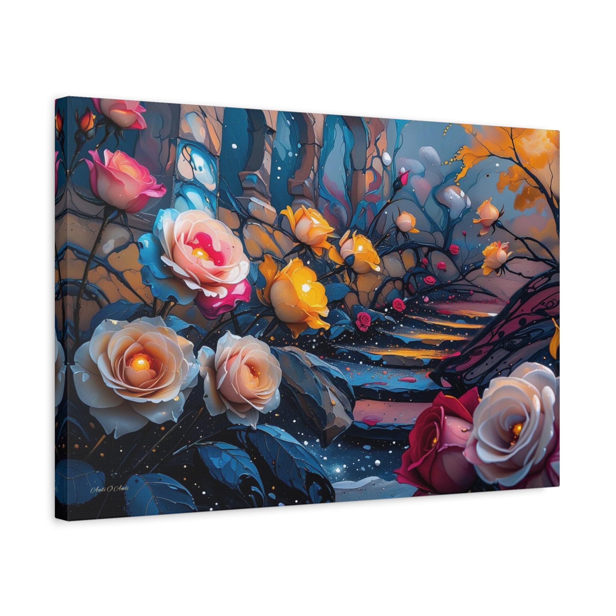 Step into a dream world with "The Heavenly Garden," an enchanting canvas print that redefines floral art. This stunning piece features lush, highly detailed roses—in vibrant shades of pink, buttery yellow, and blush white—set against a breathtaking, fantastical backdrop of deep midnight blues, coppery tones, and mysterious ruins. The rich, deep color palette and imaginative setting give the classic rose motif a dramatic, modern twist.
