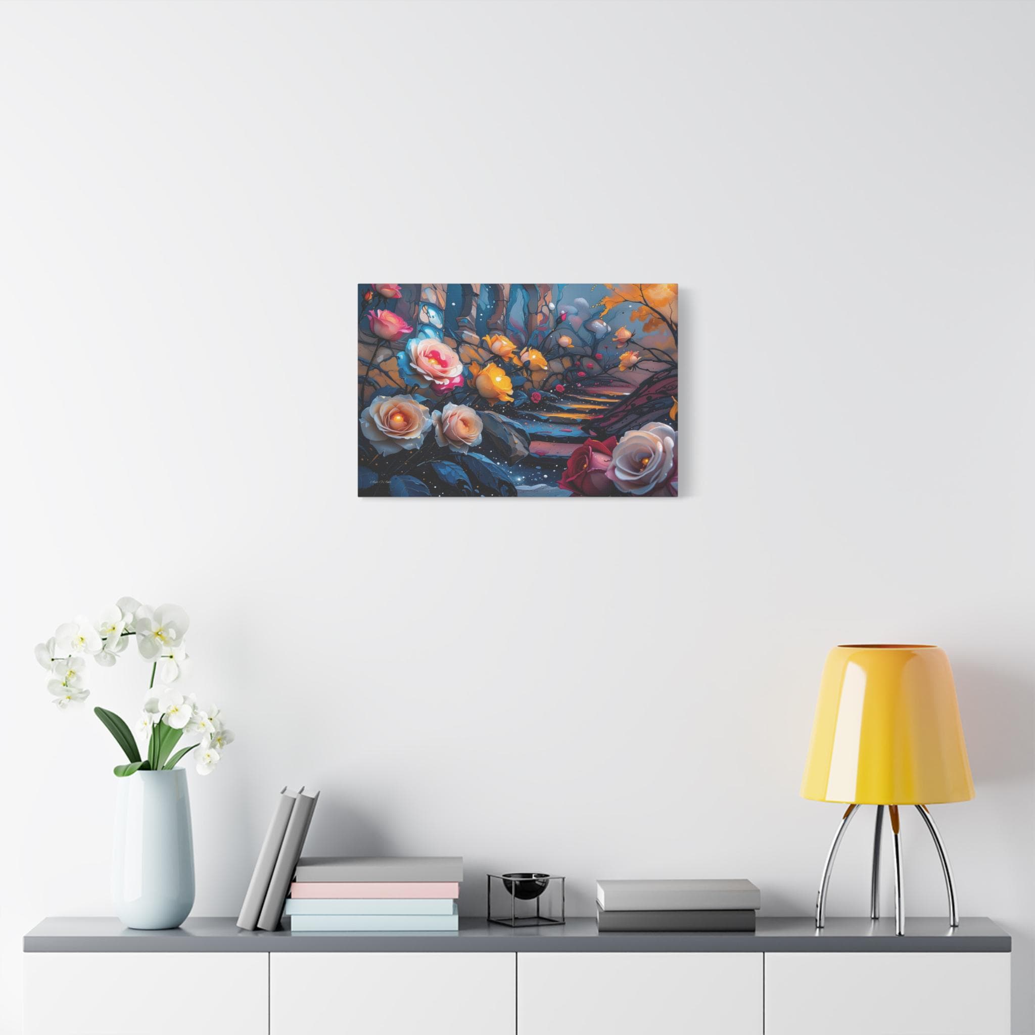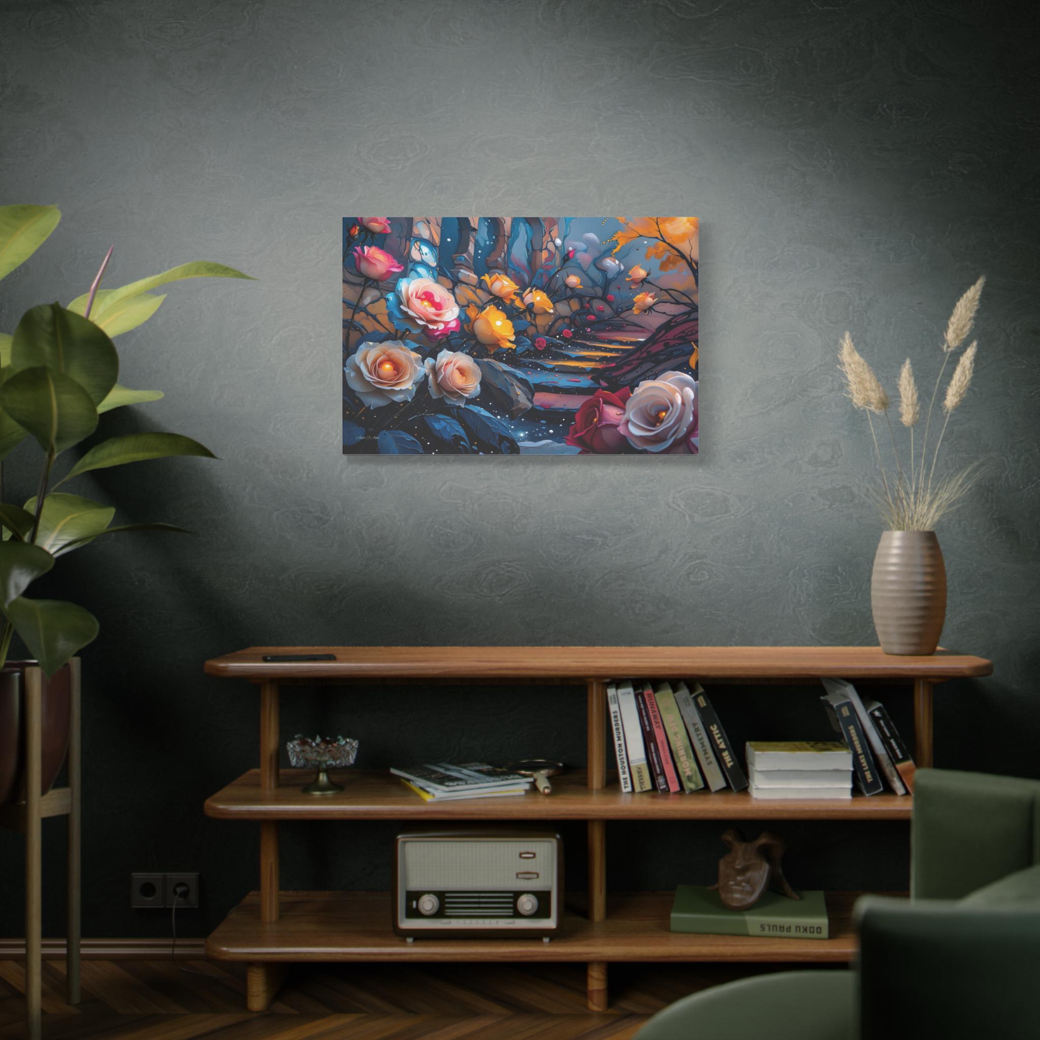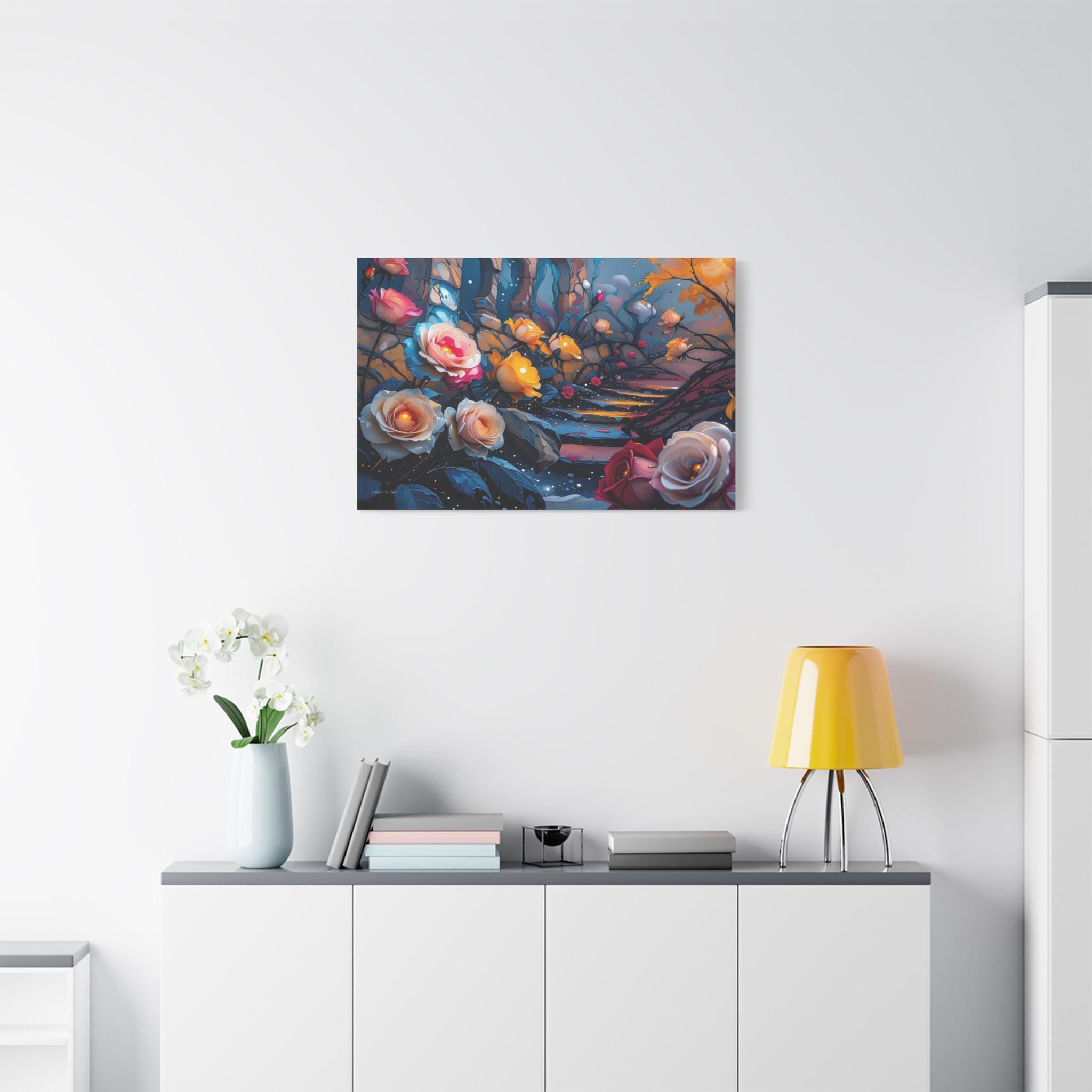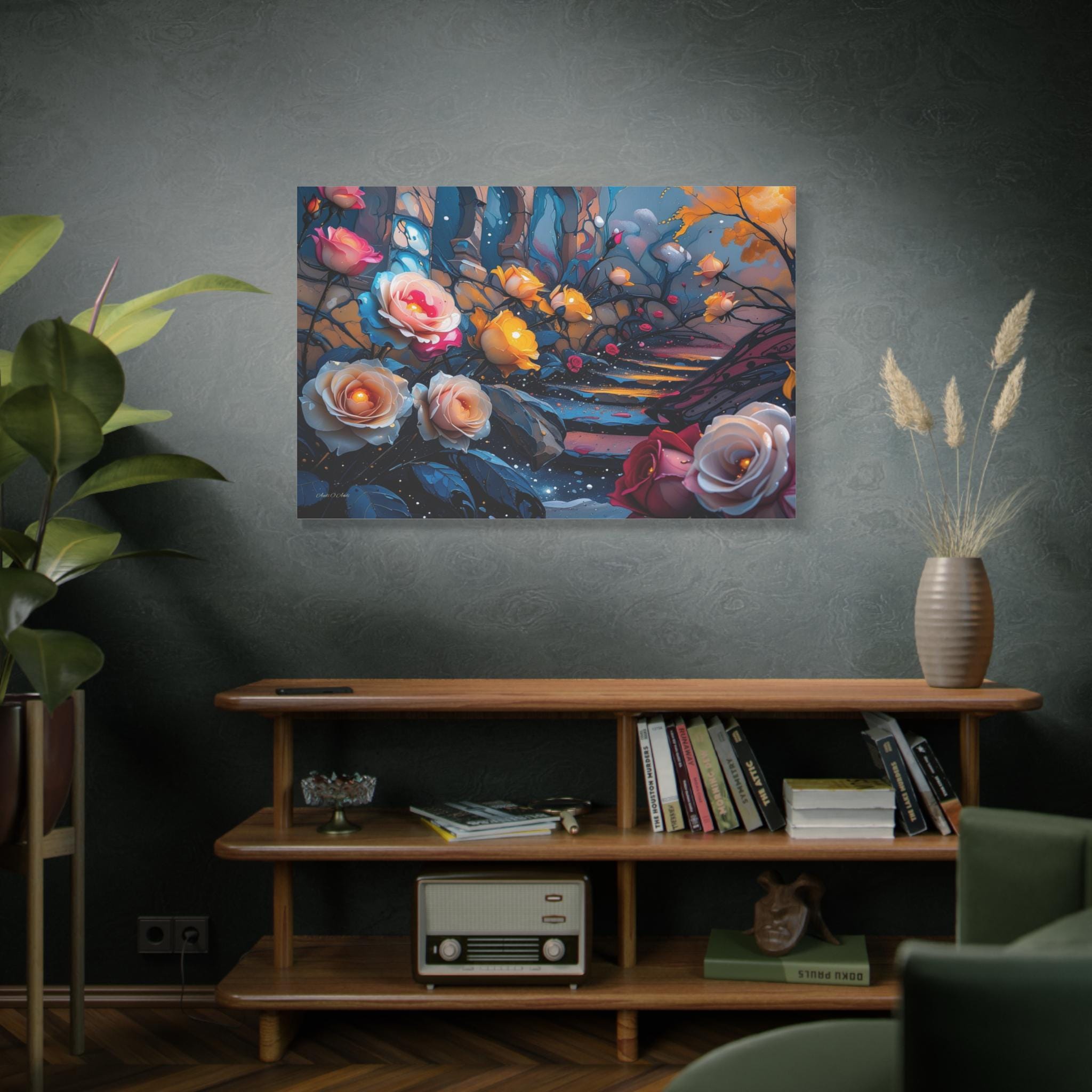 Step into a dream world with "The Heavenly Garden," an enchanting canvas print that redefines floral art. This stunning piece features lush, highly detailed roses—in vibrant shades of pink, buttery yellow, and blush white—set against a breathtaking, fantastical backdrop of deep midnight blues, coppery tones, and mysterious ruins. The rich, deep color palette and imaginative setting give the classic rose motif a dramatic, modern twist.