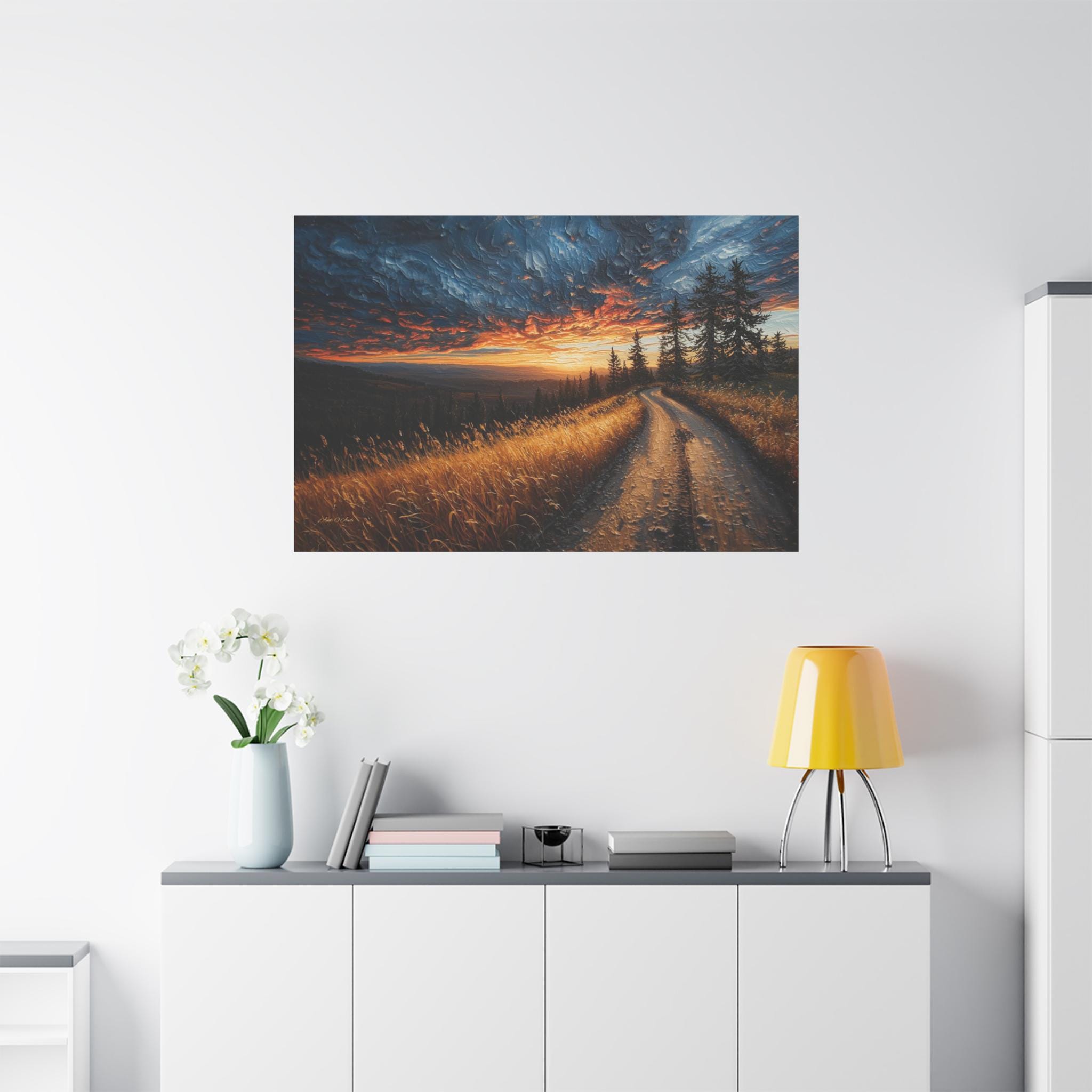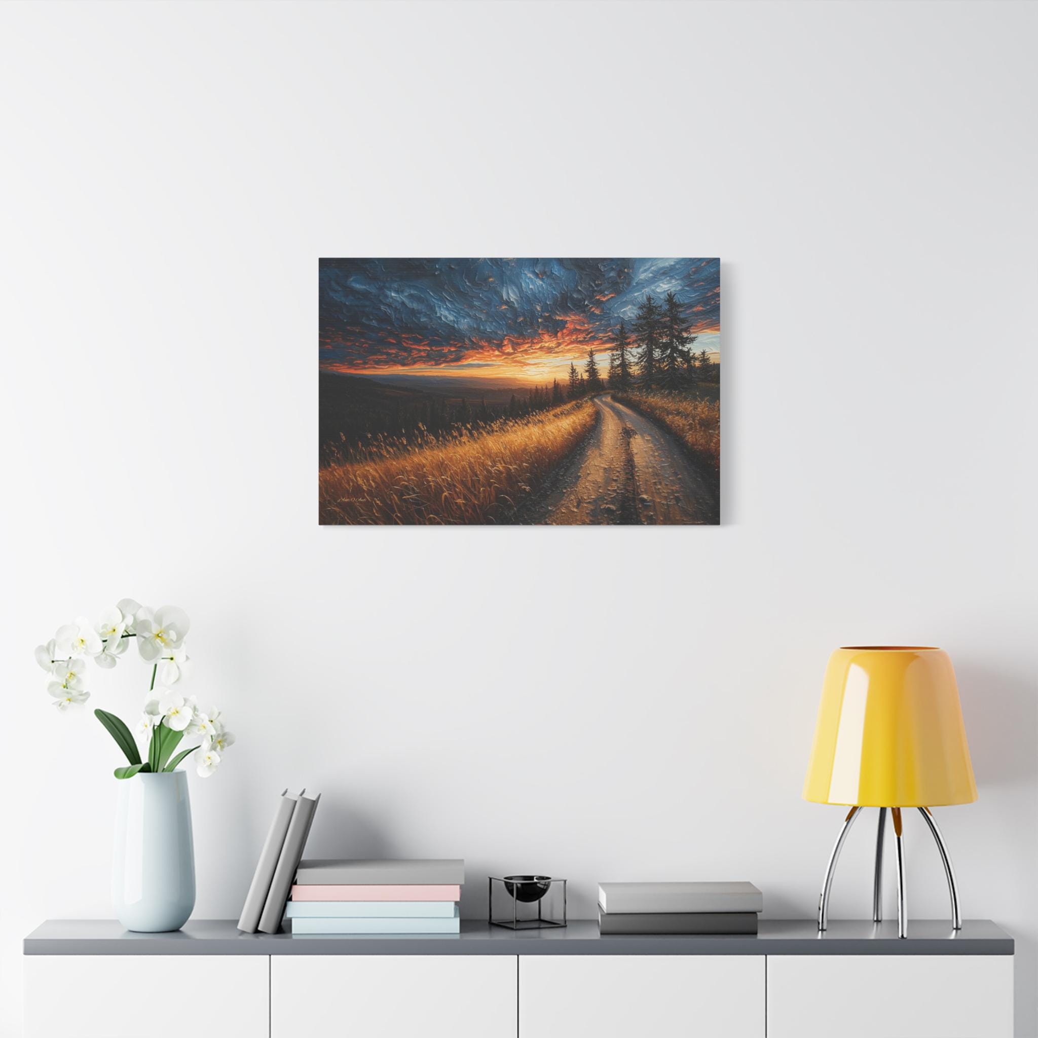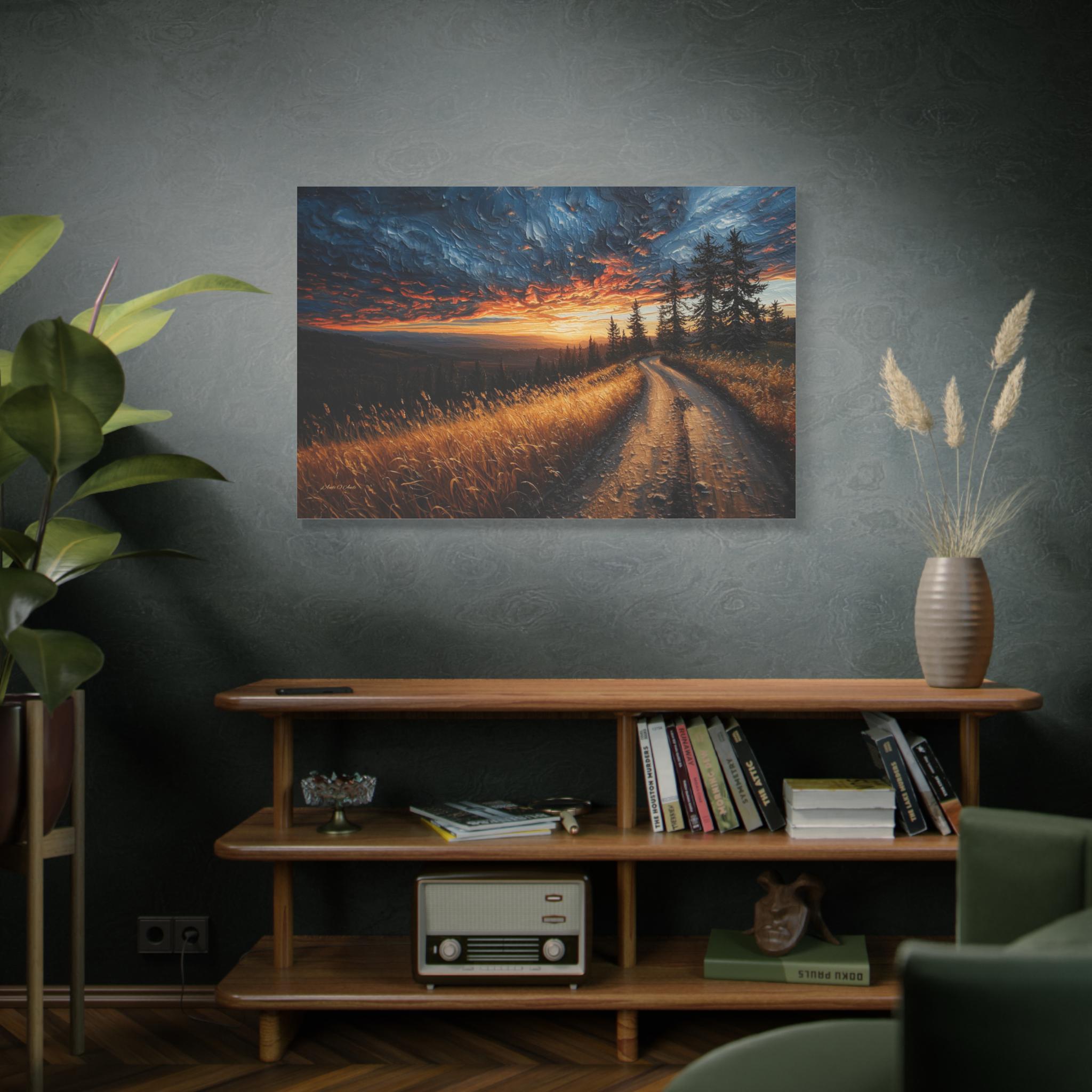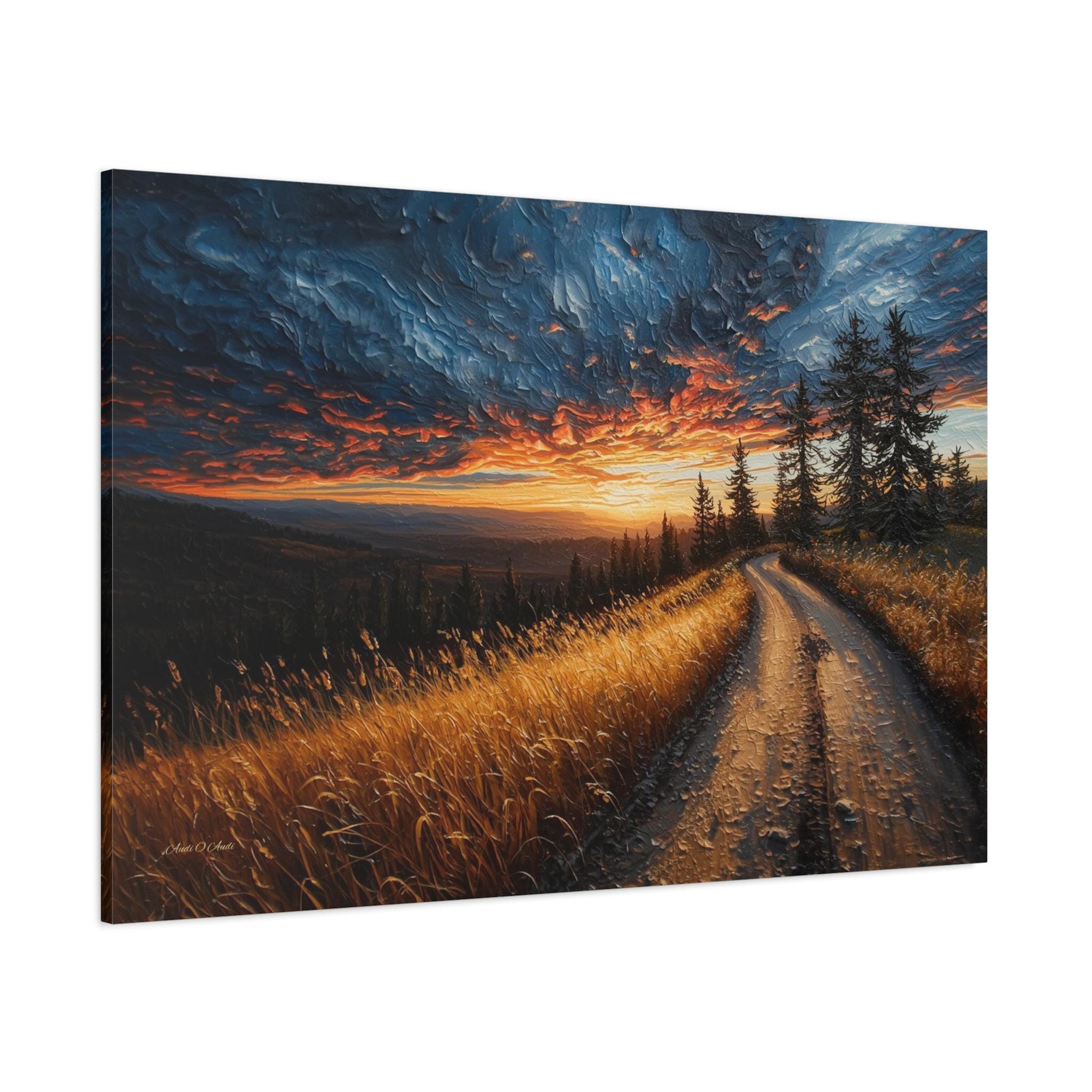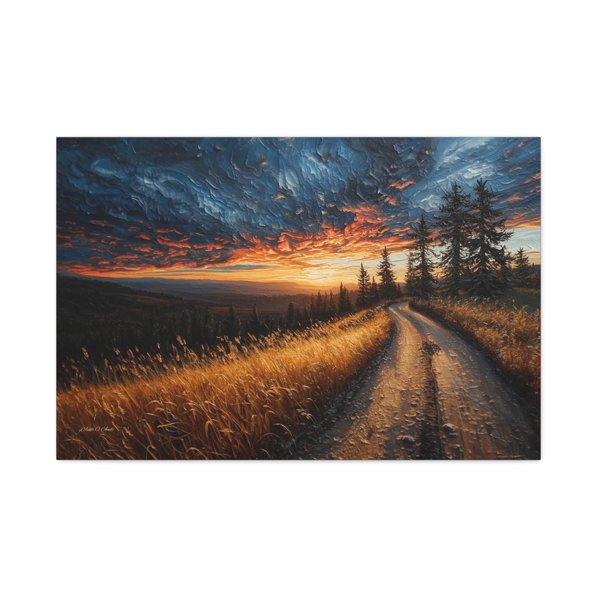 Bring the warmth of the setting sun and the spirit of adventure into your home with "The Golden Bend." This captivating canvas print features a winding country road cutting through fields of tall, golden grass, leading toward a dramatic, fiery sunset.
