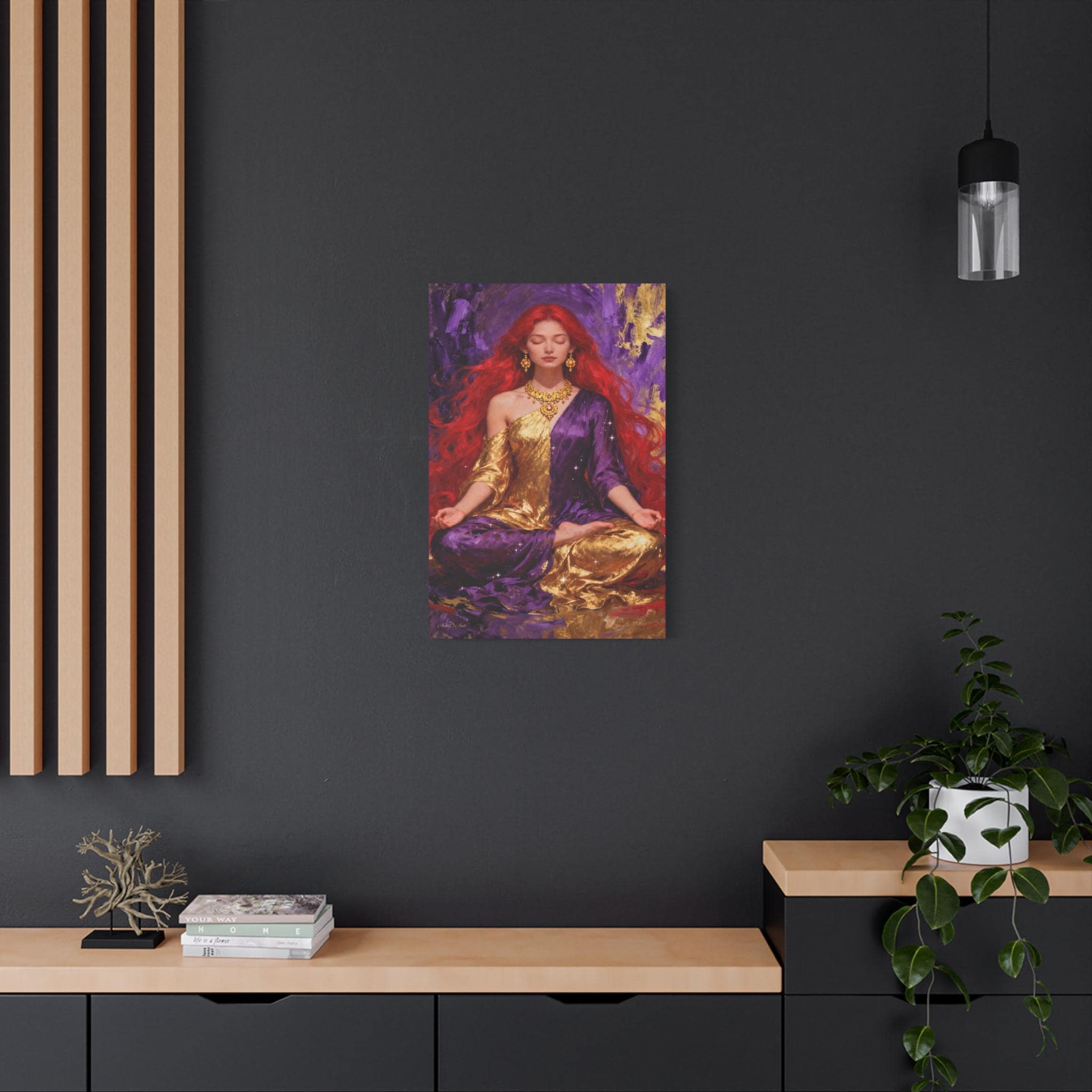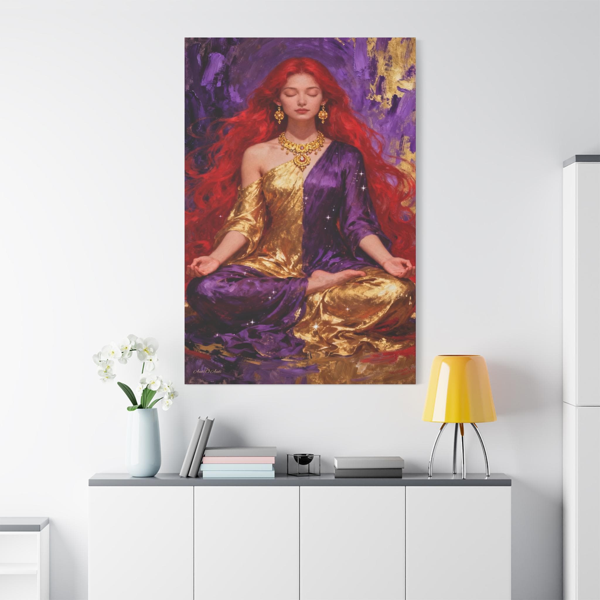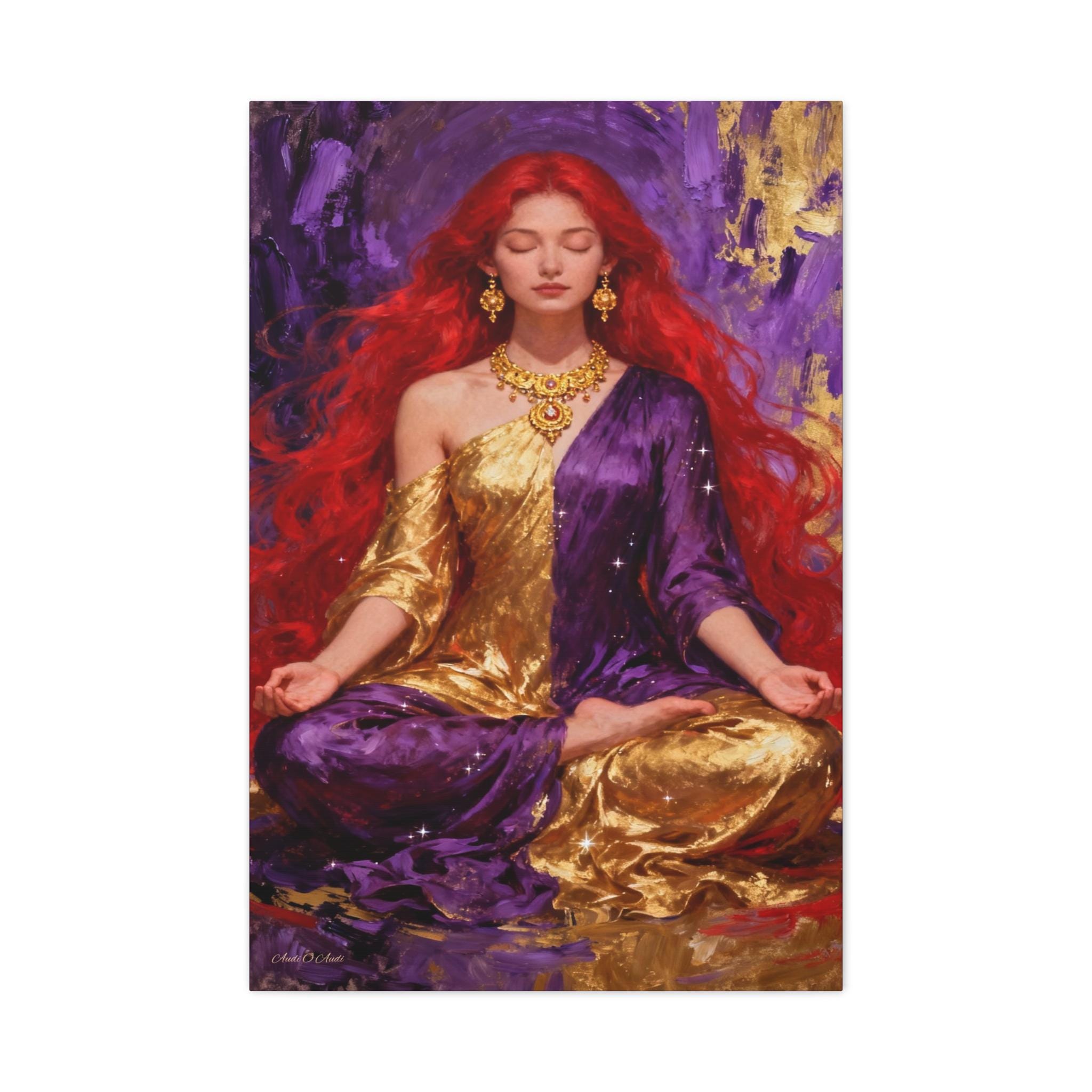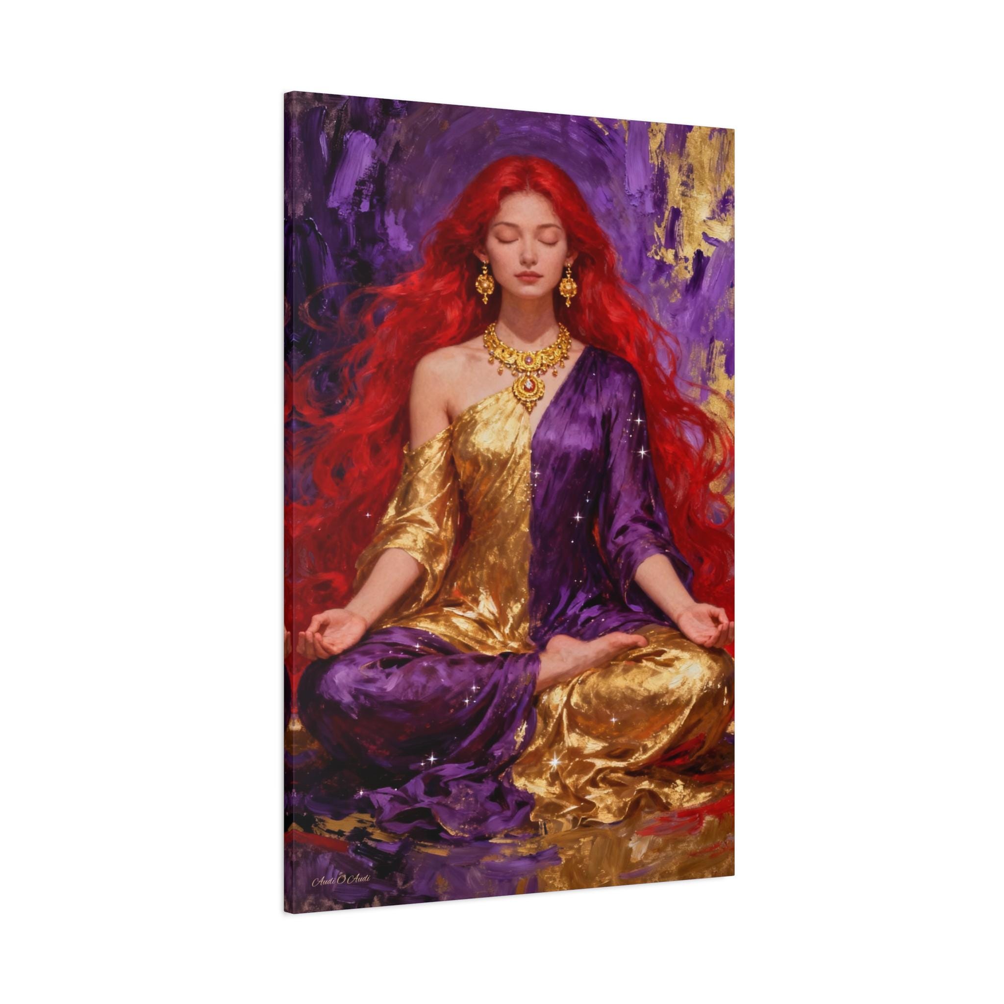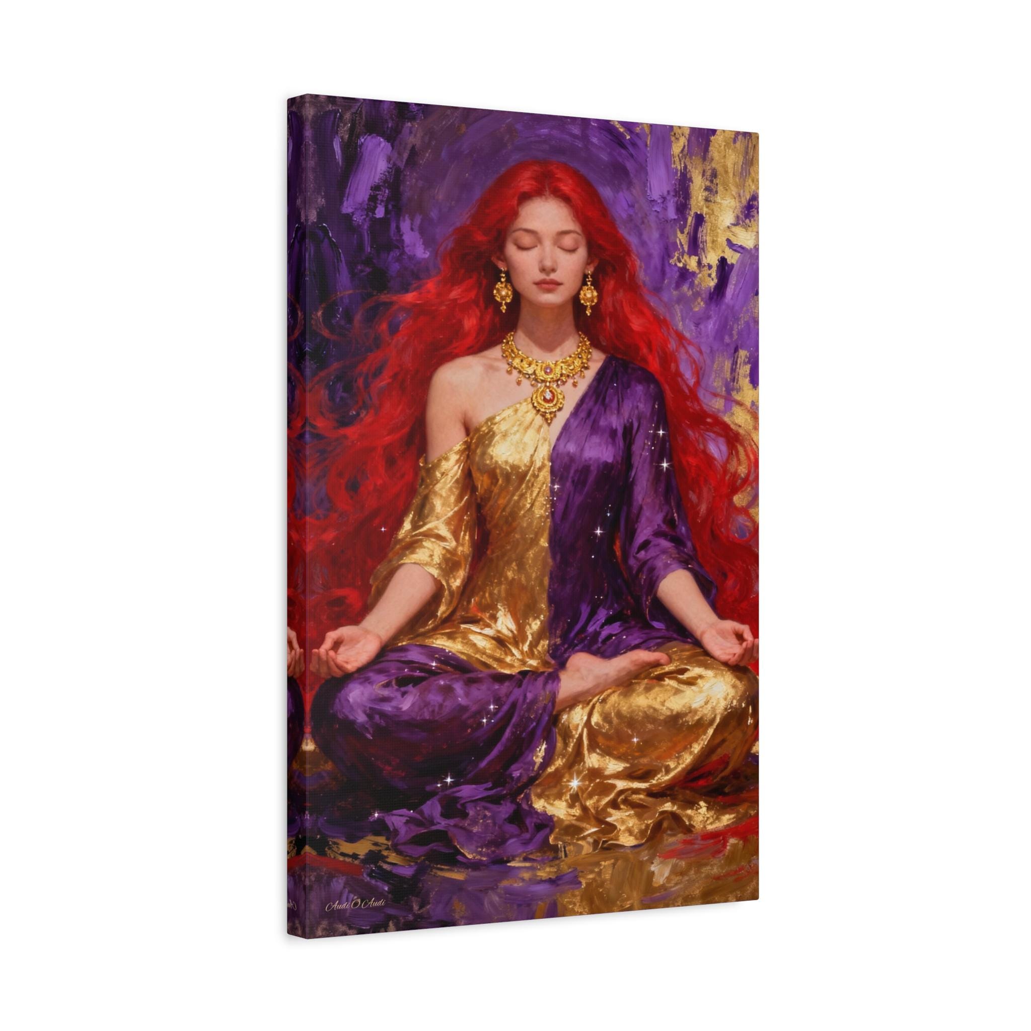 Immerse yourself in the calm intensity of this stunning canvas print. Featuring a serene woman in deep meditation, this piece captures the essence of the "Divine Feminine." Adorned in flowing robes of split-tone violet and shimmering gold, and framed by vibrant red hair, she represents the perfect balance of power and peace.