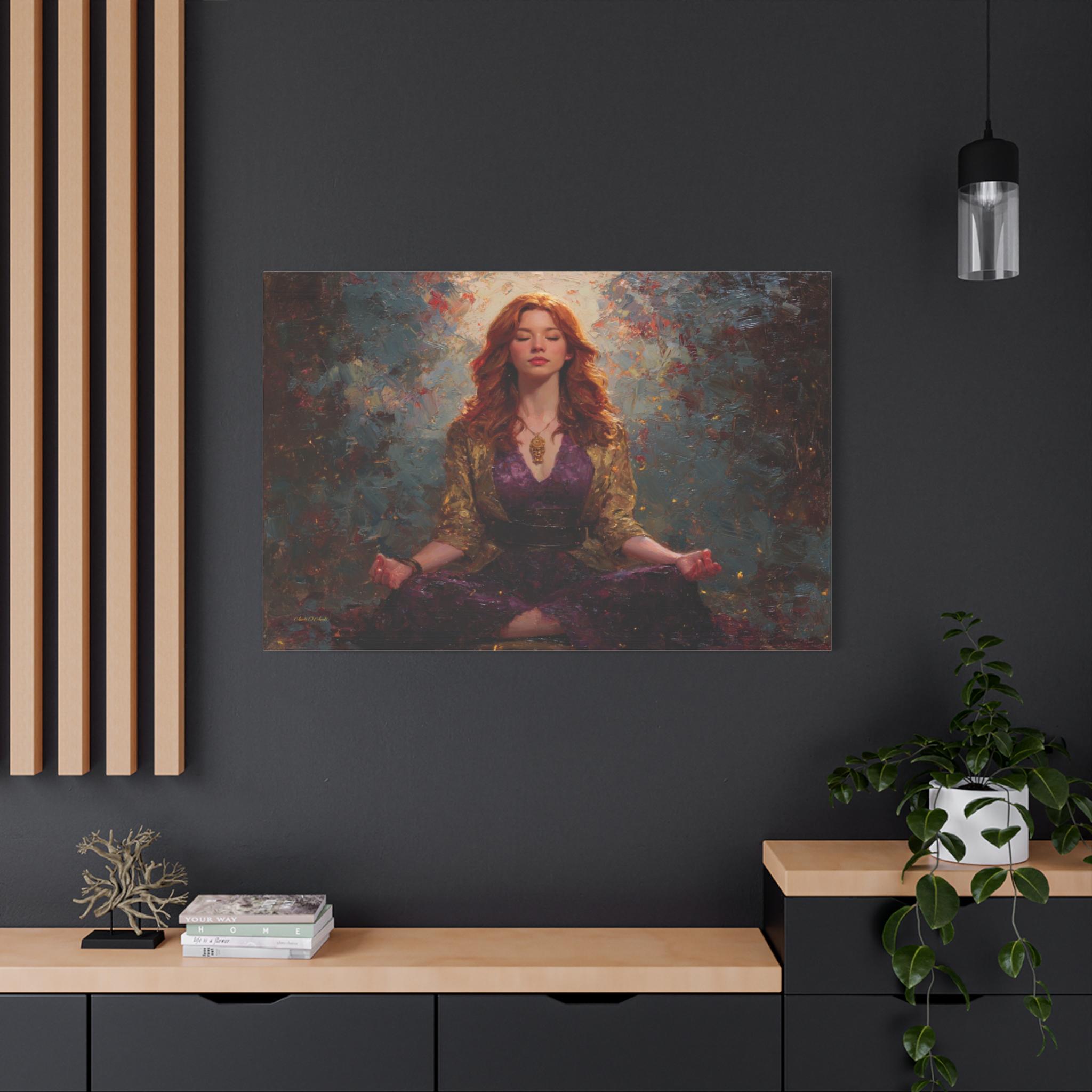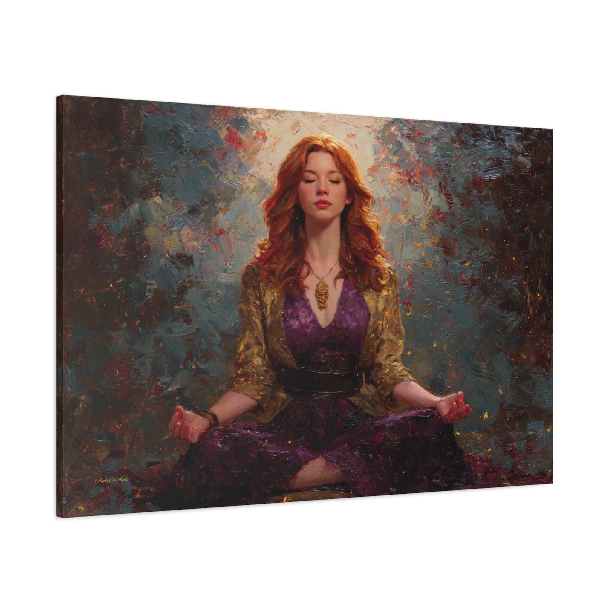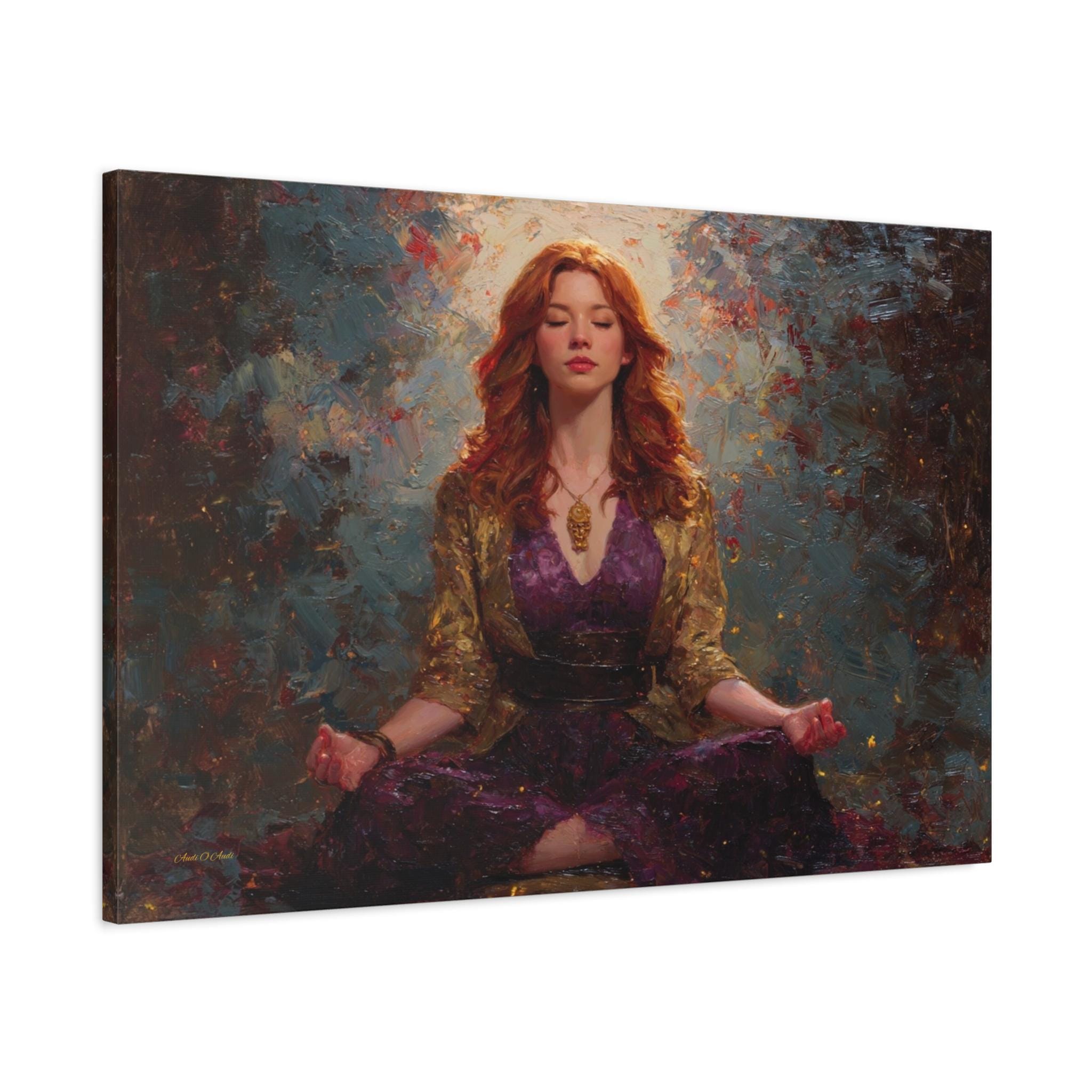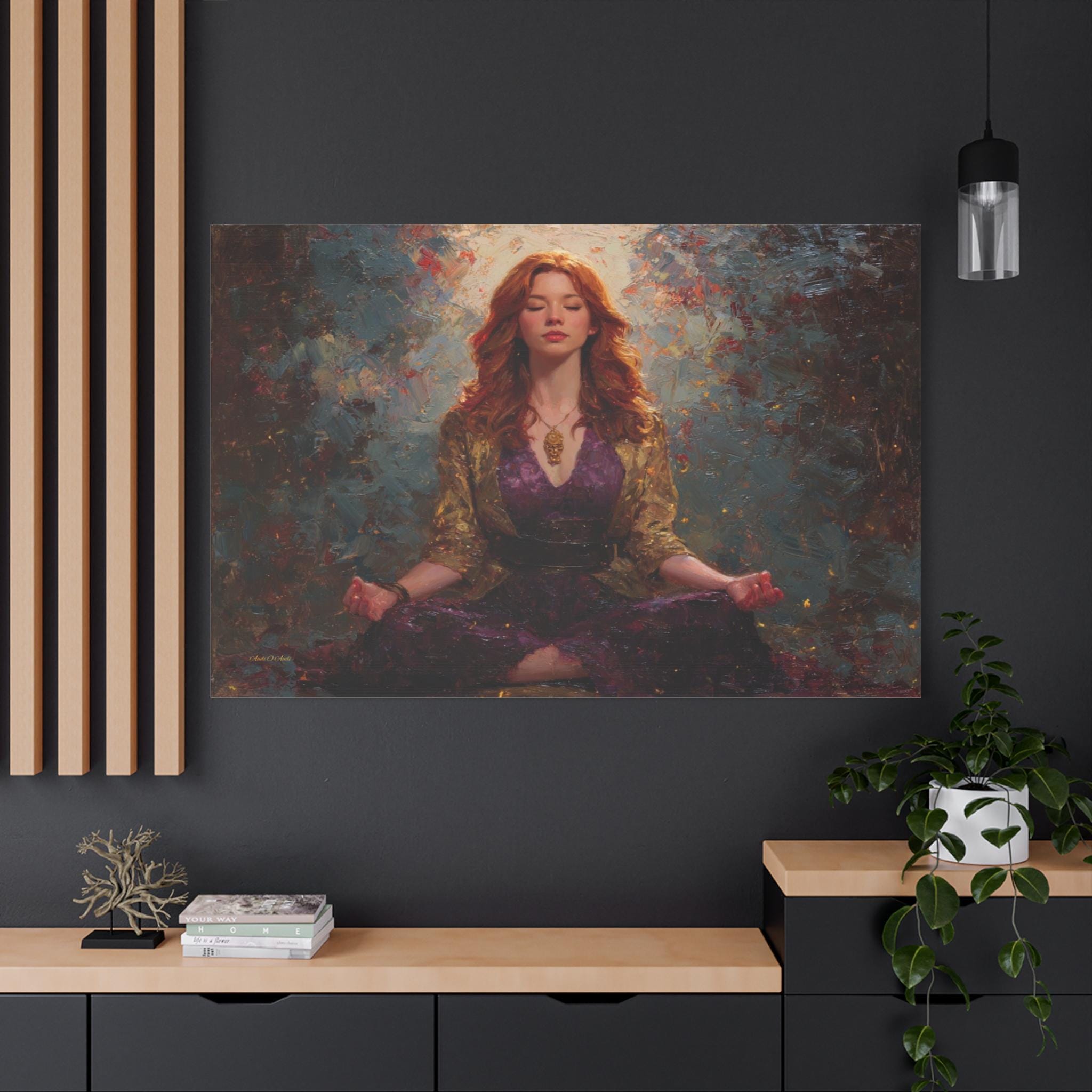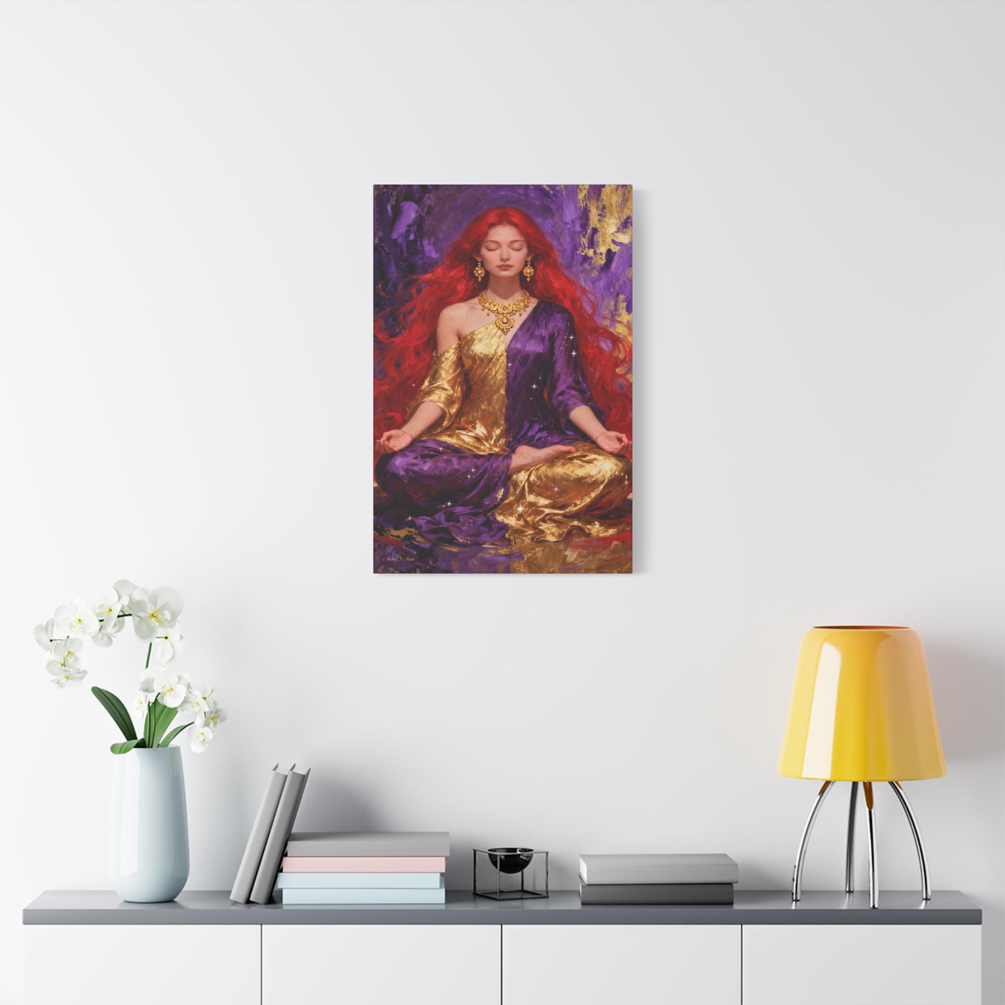 Immerse yourself in the calm intensity of this stunning canvas print. Featuring a serene woman in deep meditation, this piece captures the essence of the "Divine Feminine." Adorned in flowing robes of split-tone violet and shimmering gold, and framed by vibrant red hair, she represents the perfect balance of power and peace.