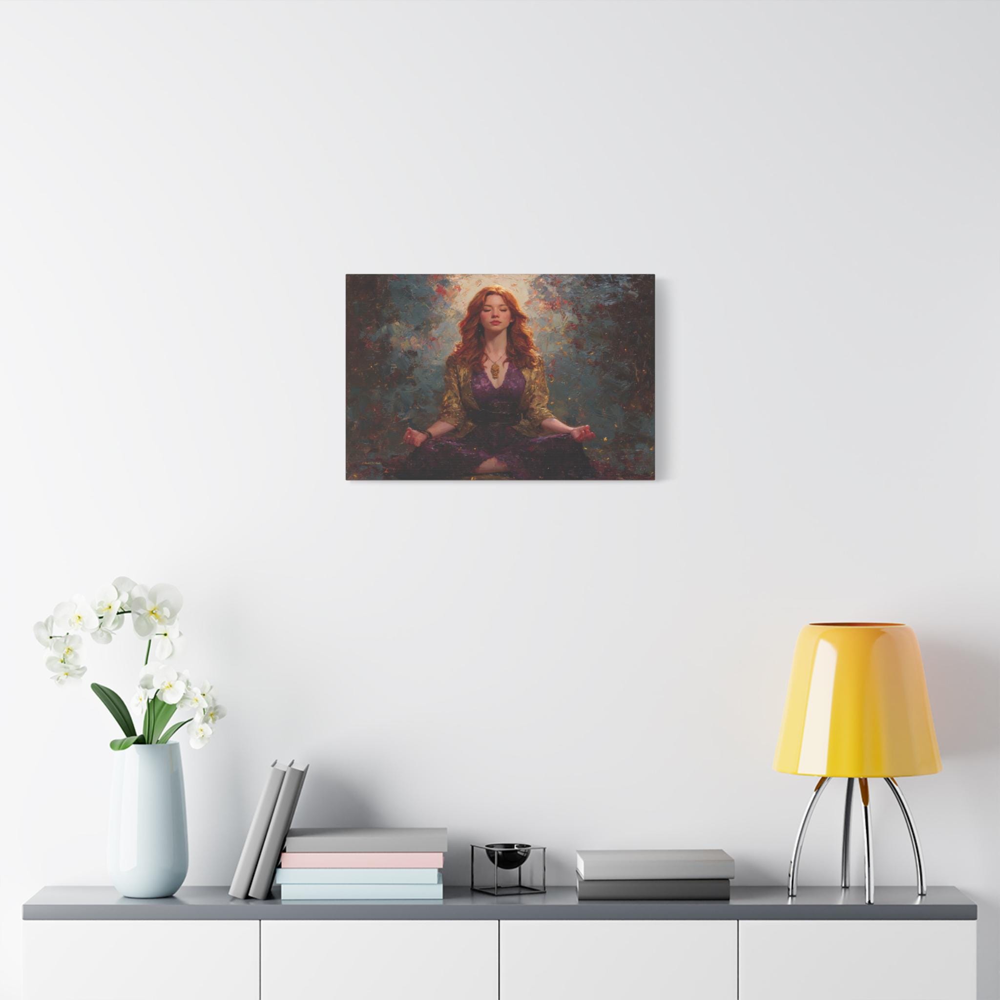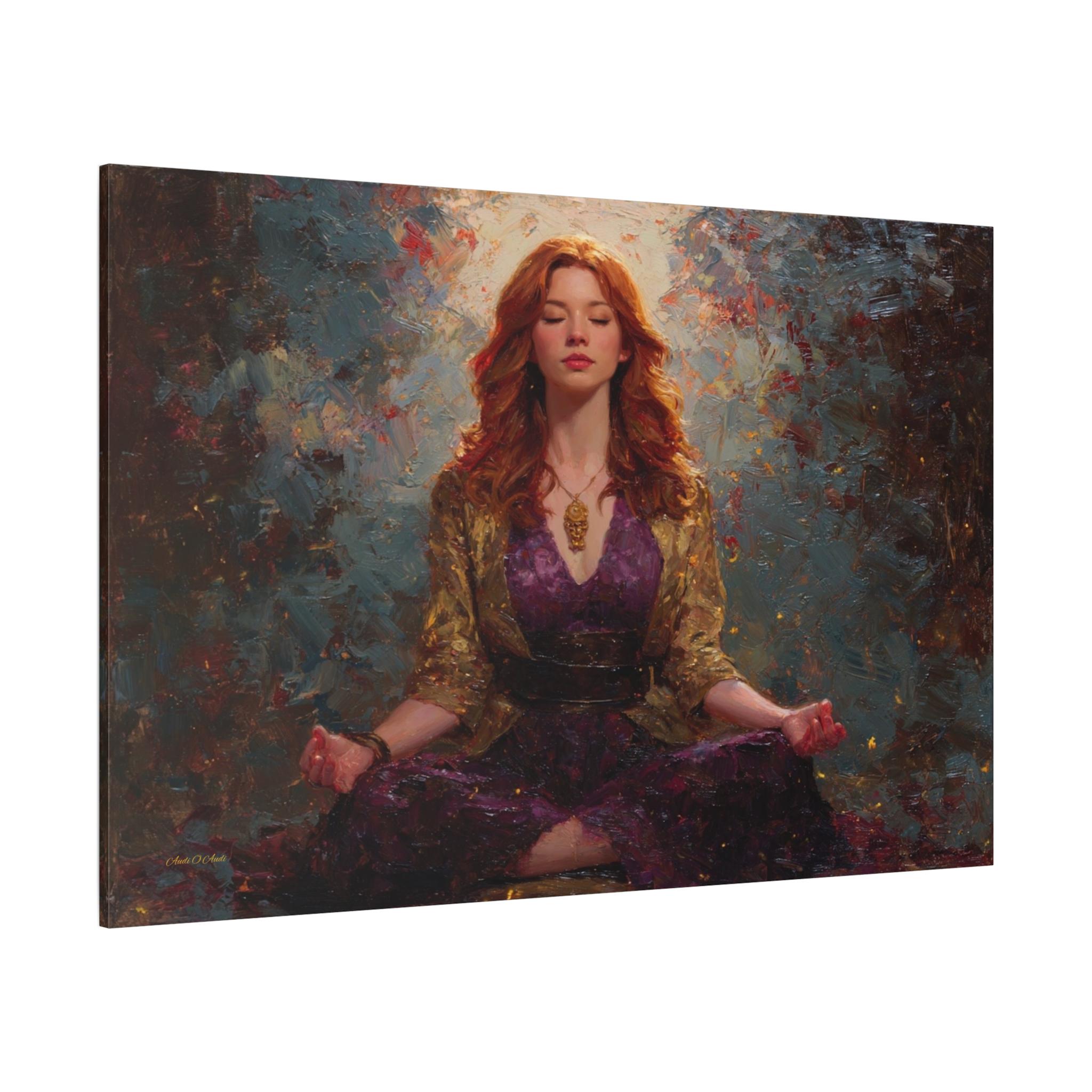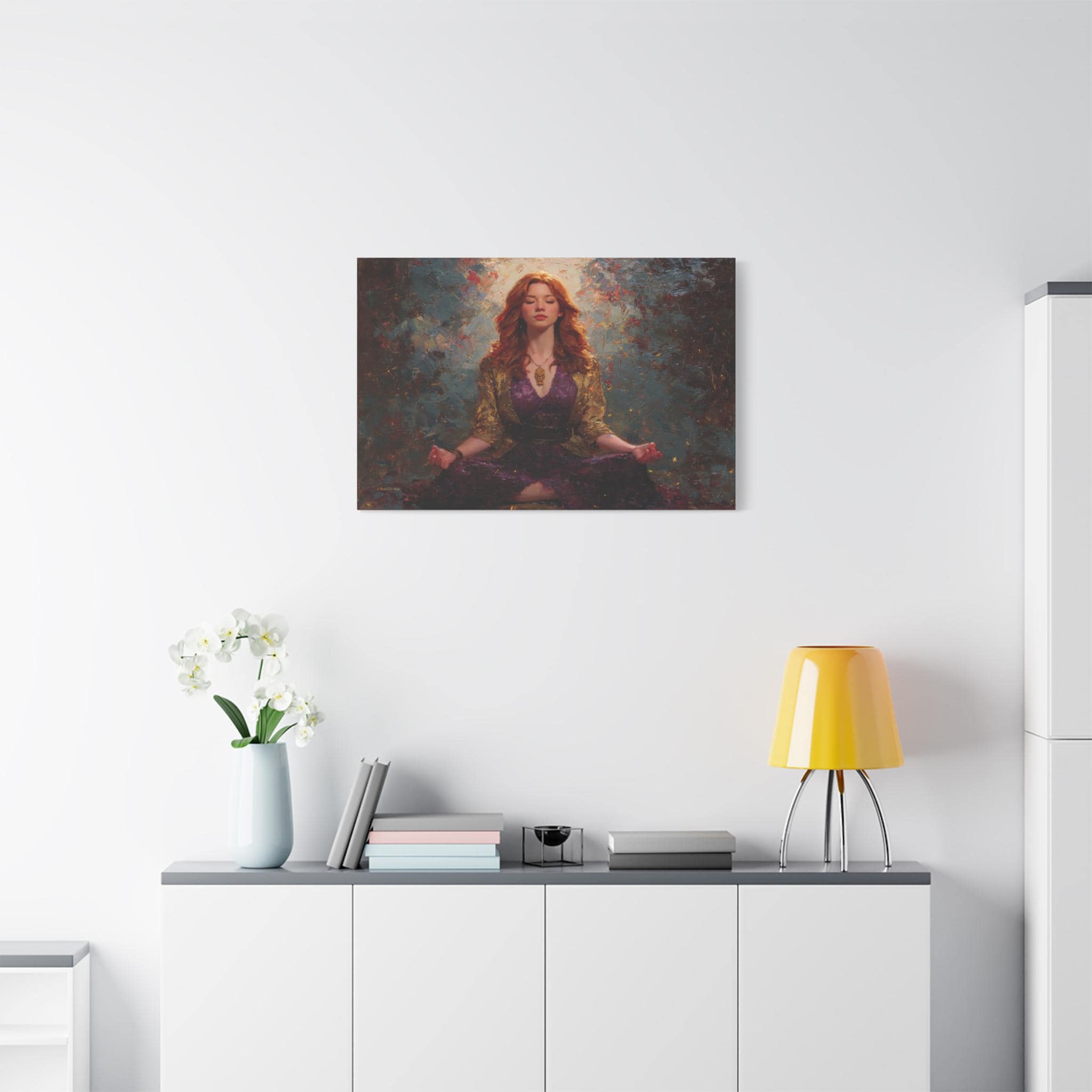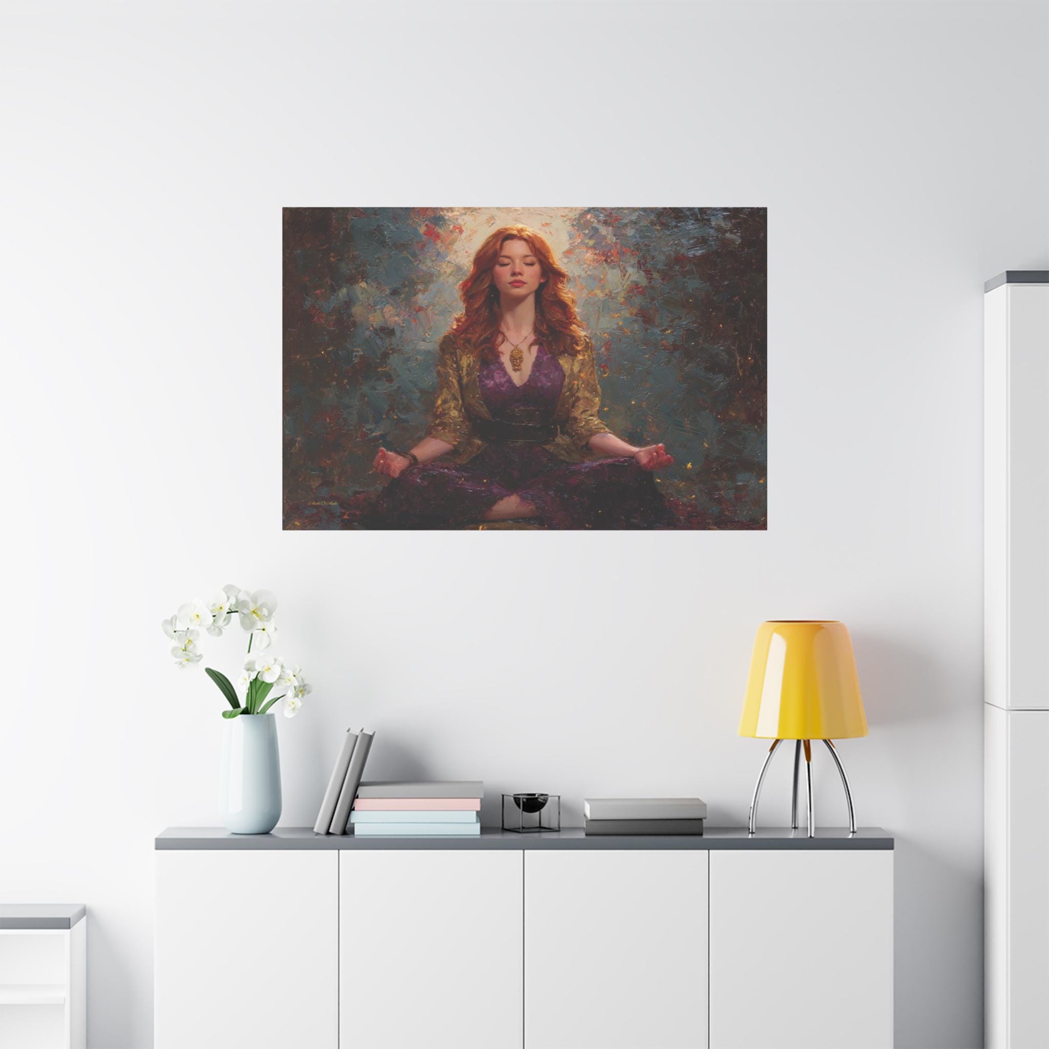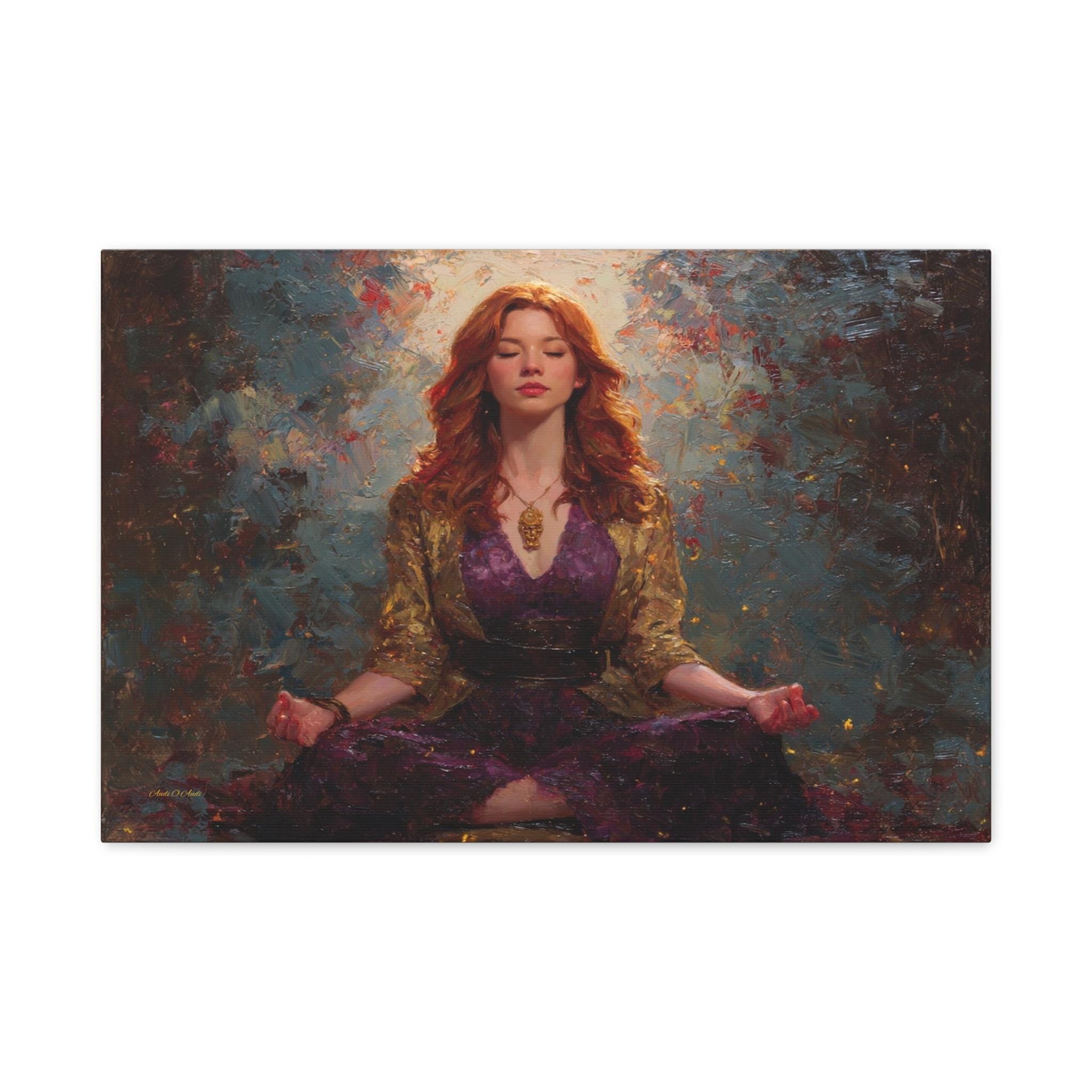 Immerse yourself in the calm intensity of this stunning canvas print. Featuring a serene woman in deep meditation, this piece captures the essence of the "Divine Feminine." Adorned in flowing robes of split-tone violet and shimmering gold, and framed by vibrant red hair, she represents the perfect balance of power and peace.