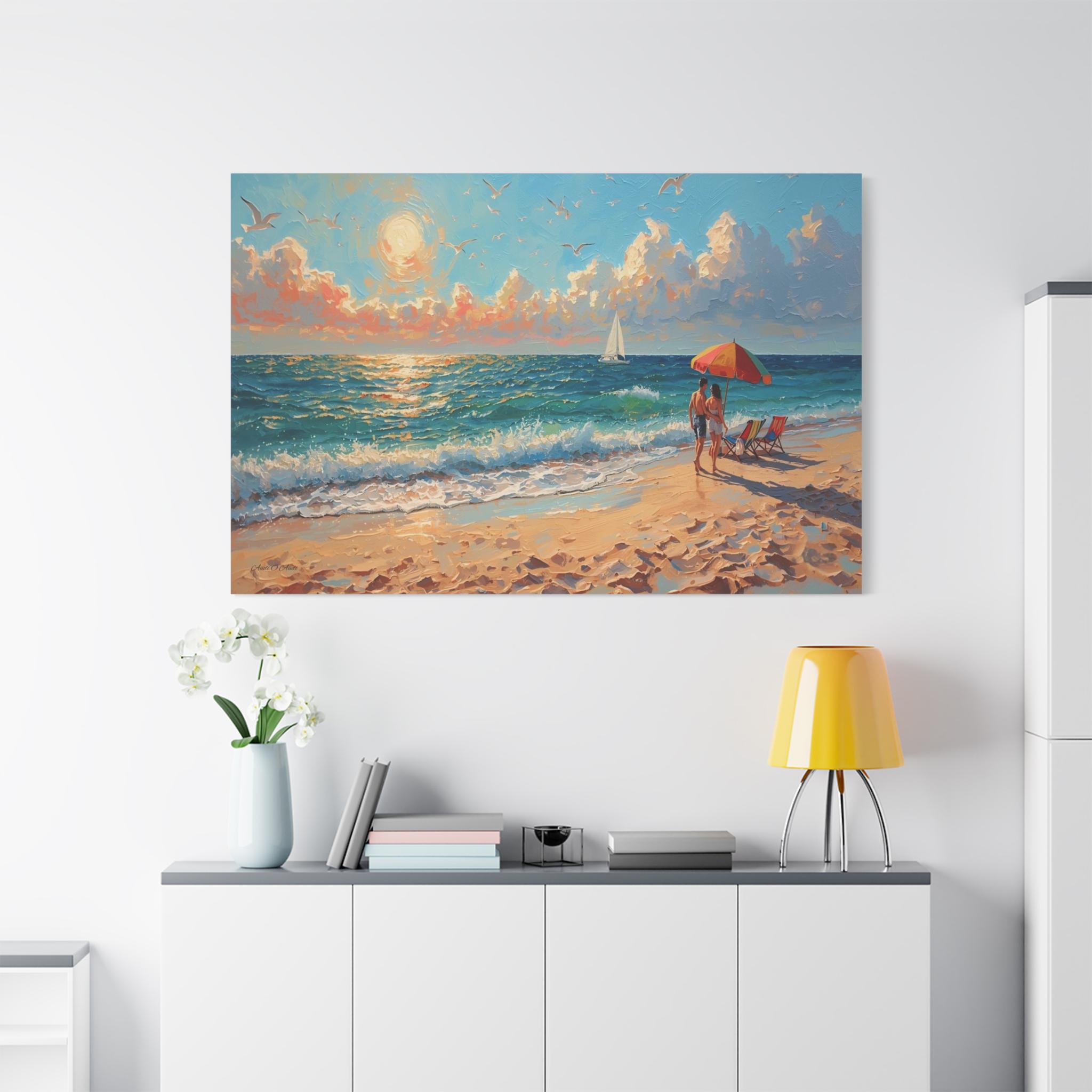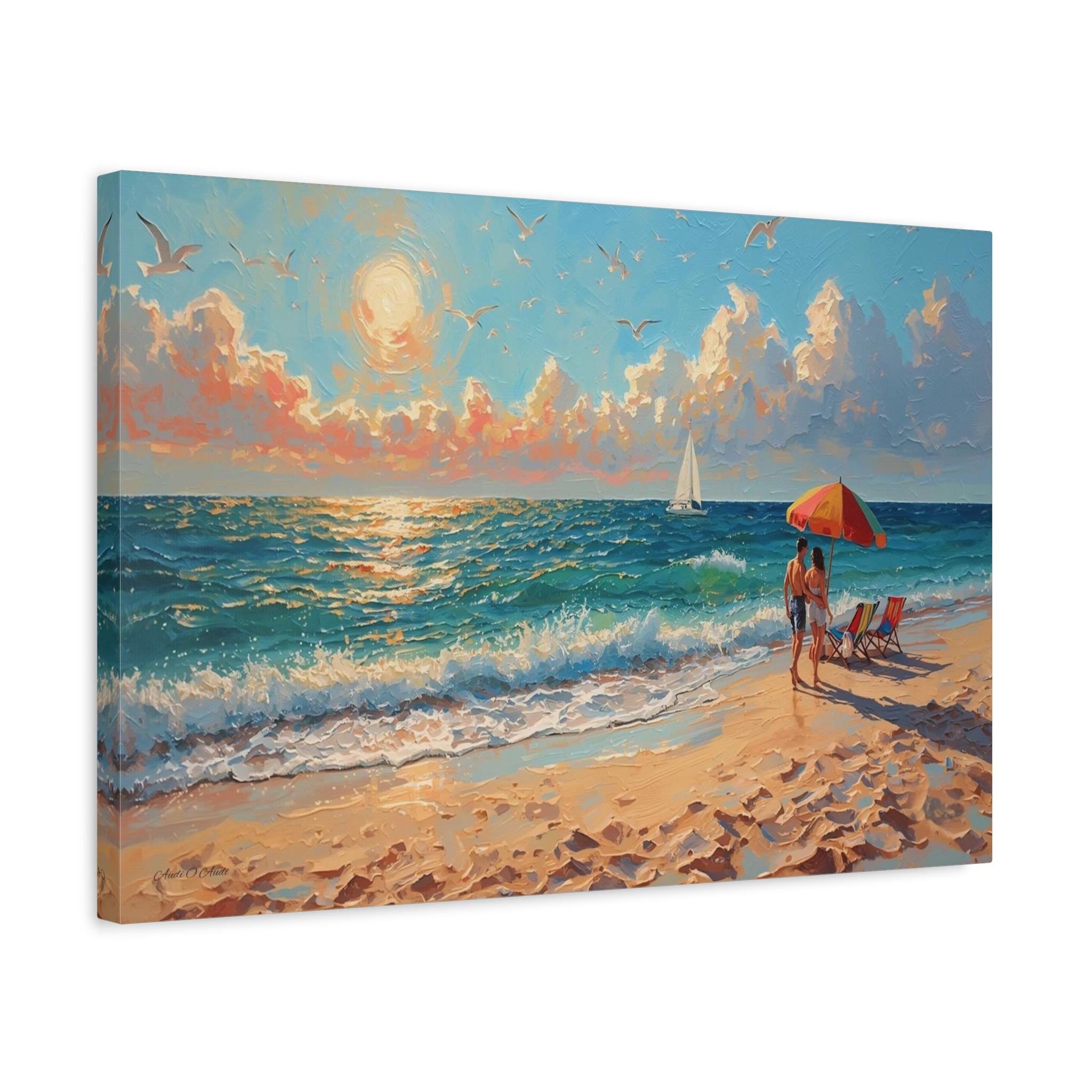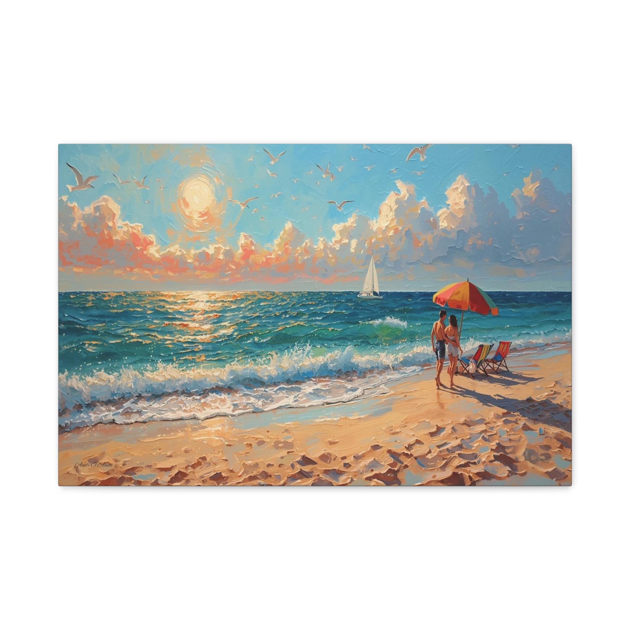 Bring the eternal warmth of summer into your home with "Golden Summer." This vibrant canvas print captures the perfect beach day, featuring a couple enjoying a peaceful stroll along the shore while a sailboat drifts lazily in the distance.