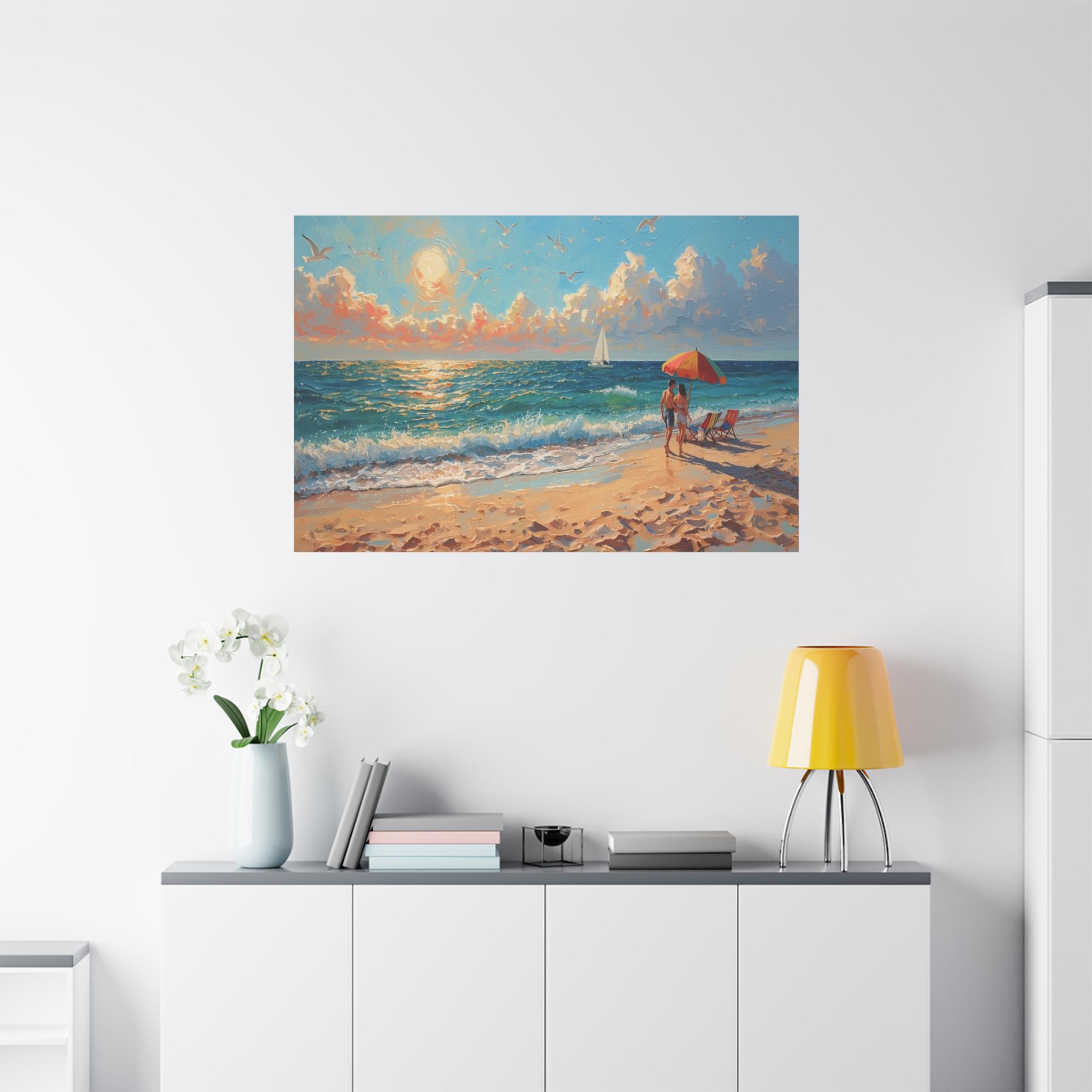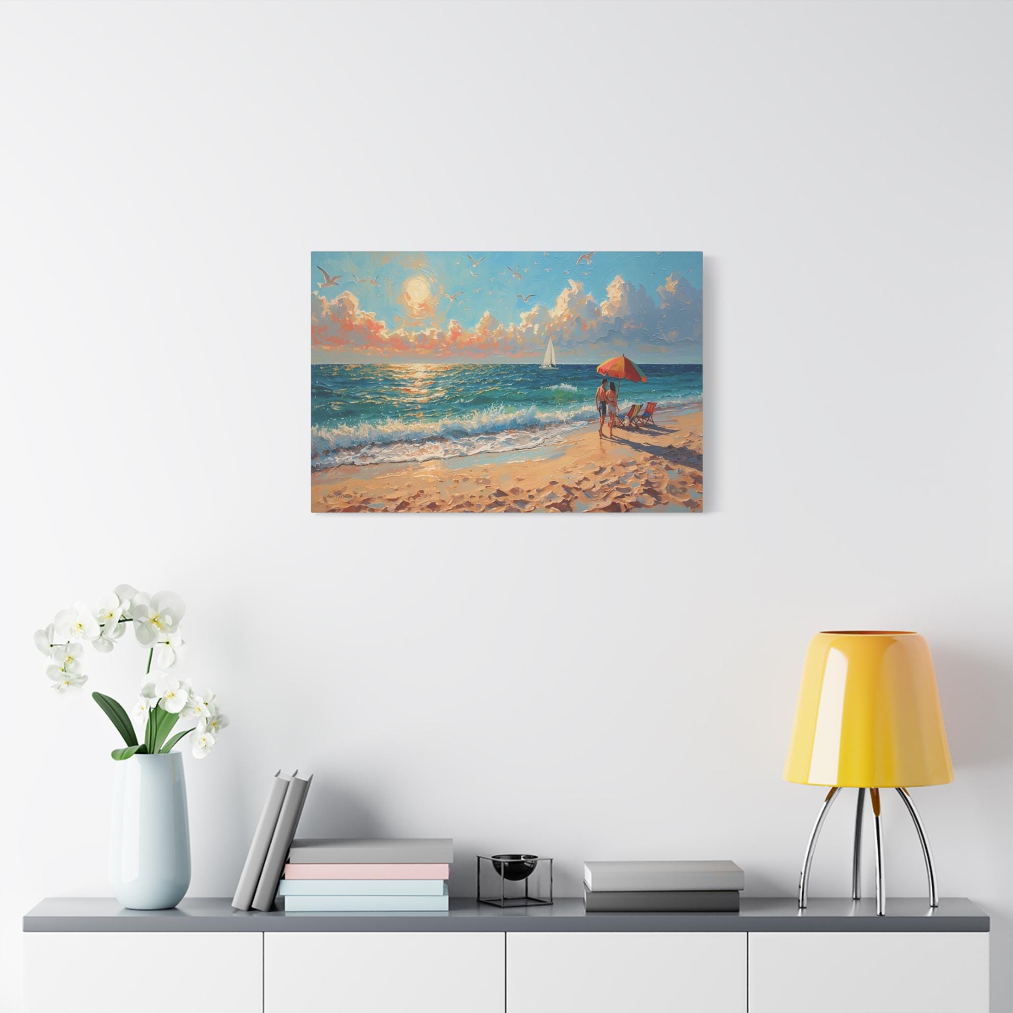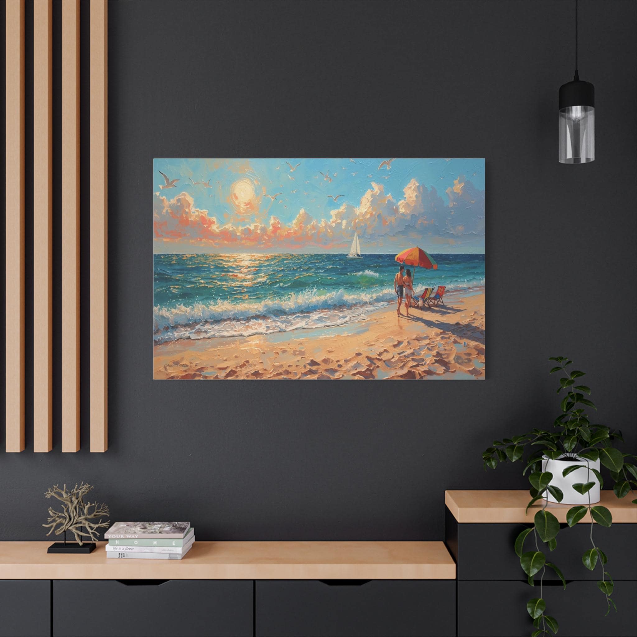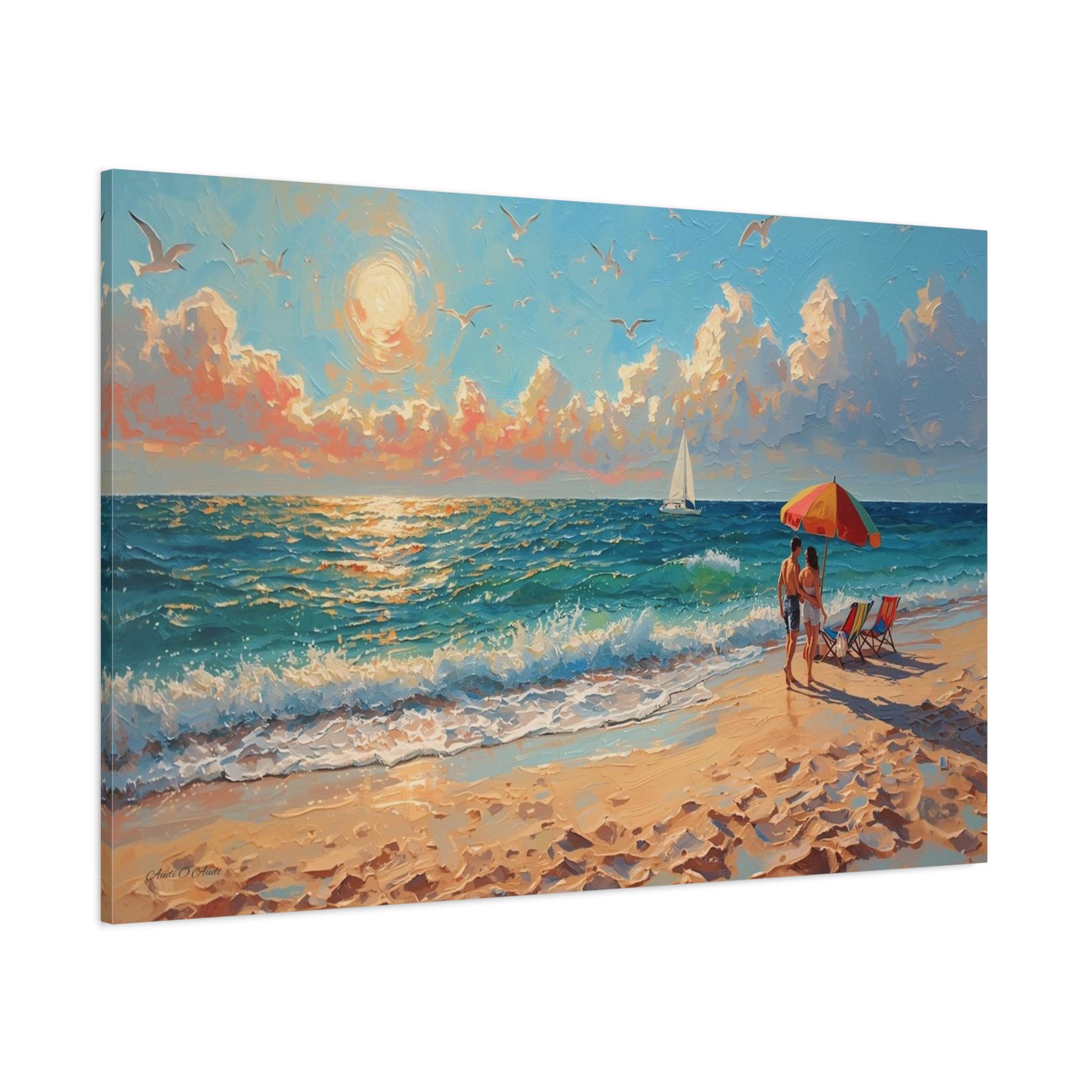 Bring the eternal warmth of summer into your home with "Golden Summer." This vibrant canvas print captures the perfect beach day, featuring a couple enjoying a peaceful stroll along the shore while a sailboat drifts lazily in the distance.